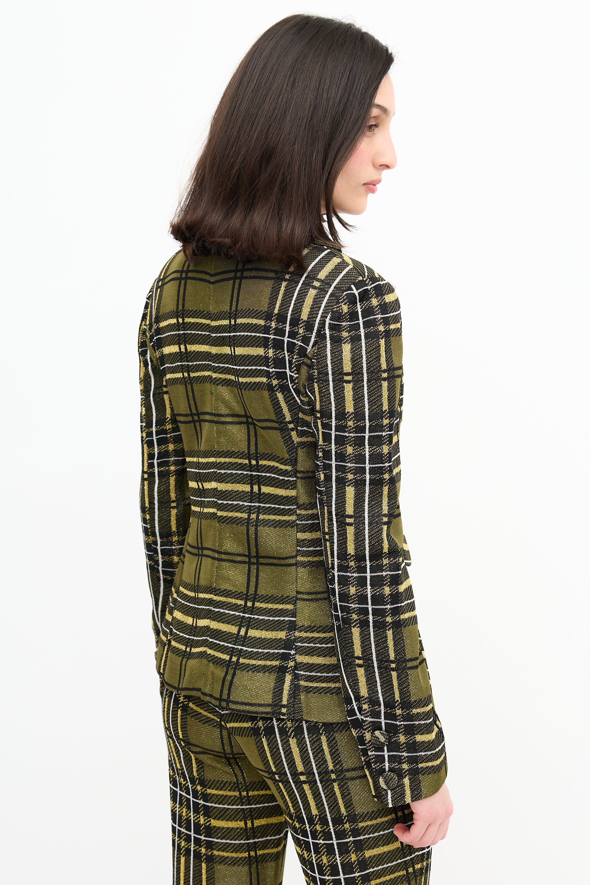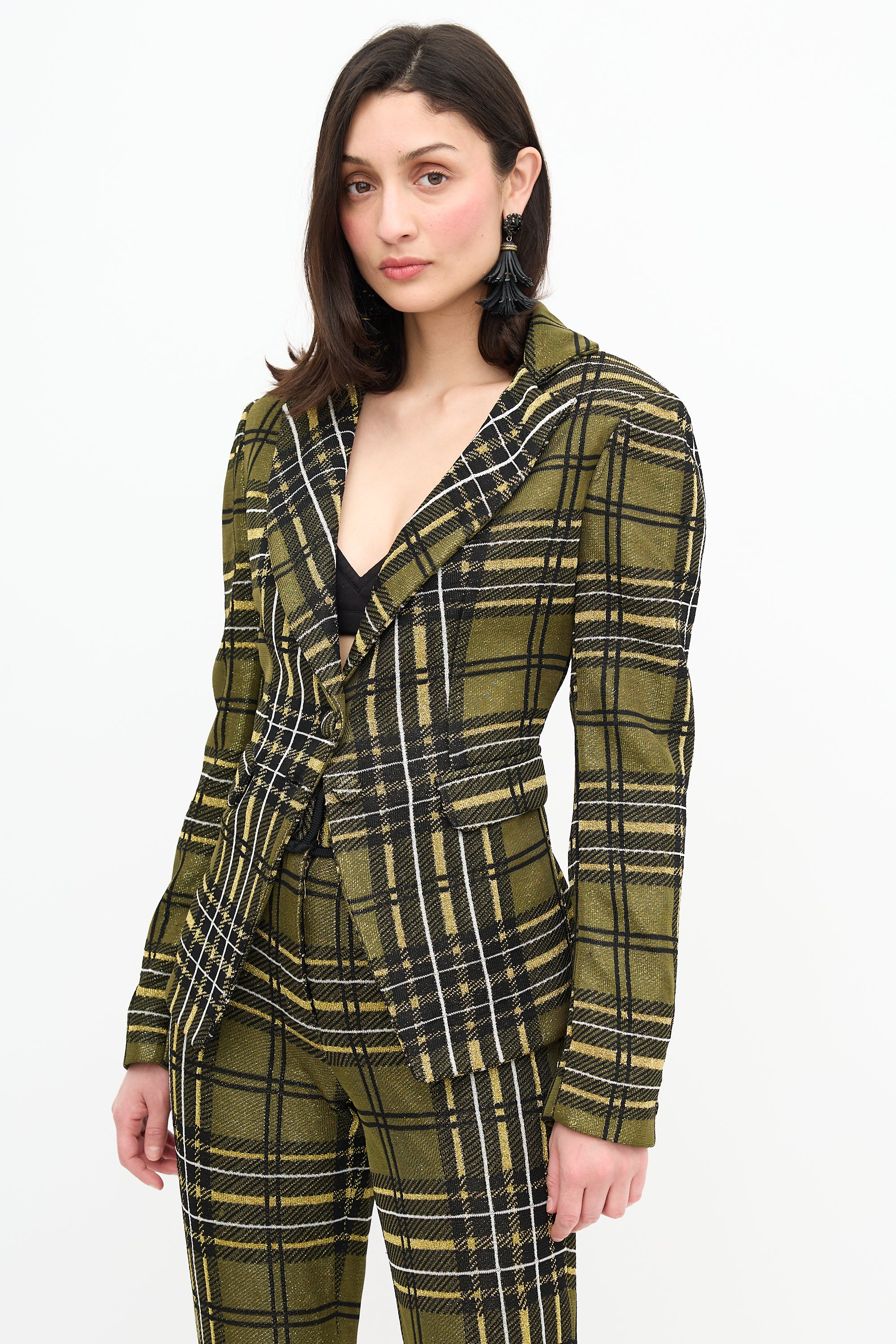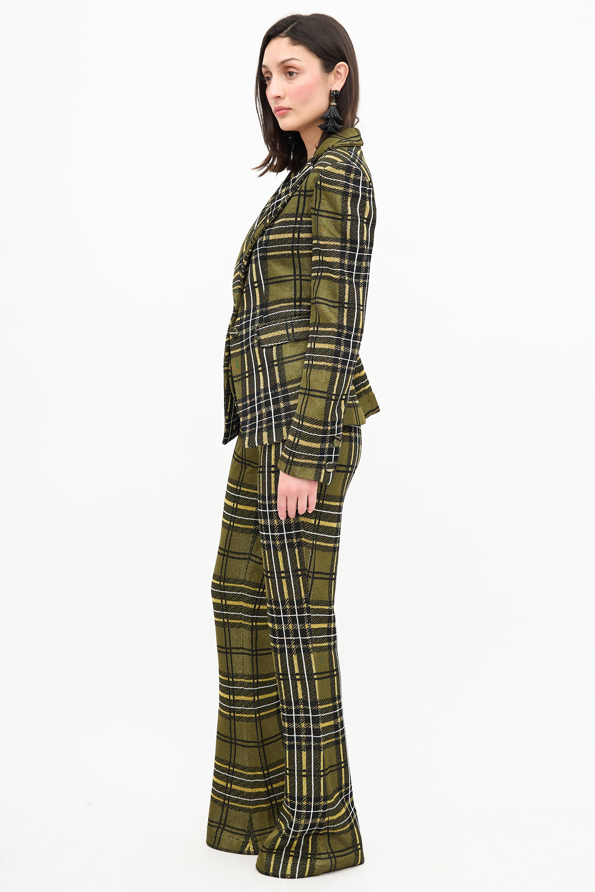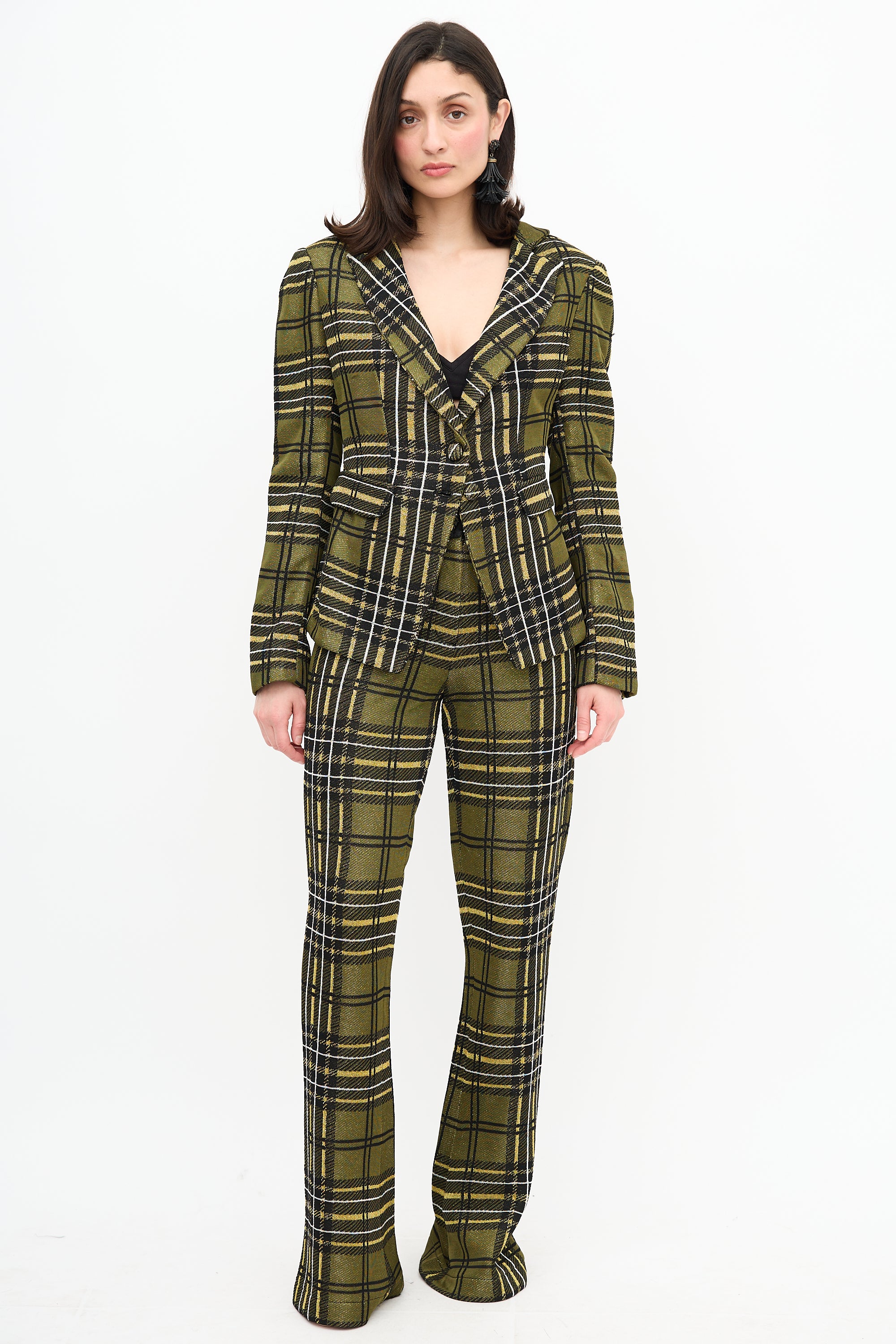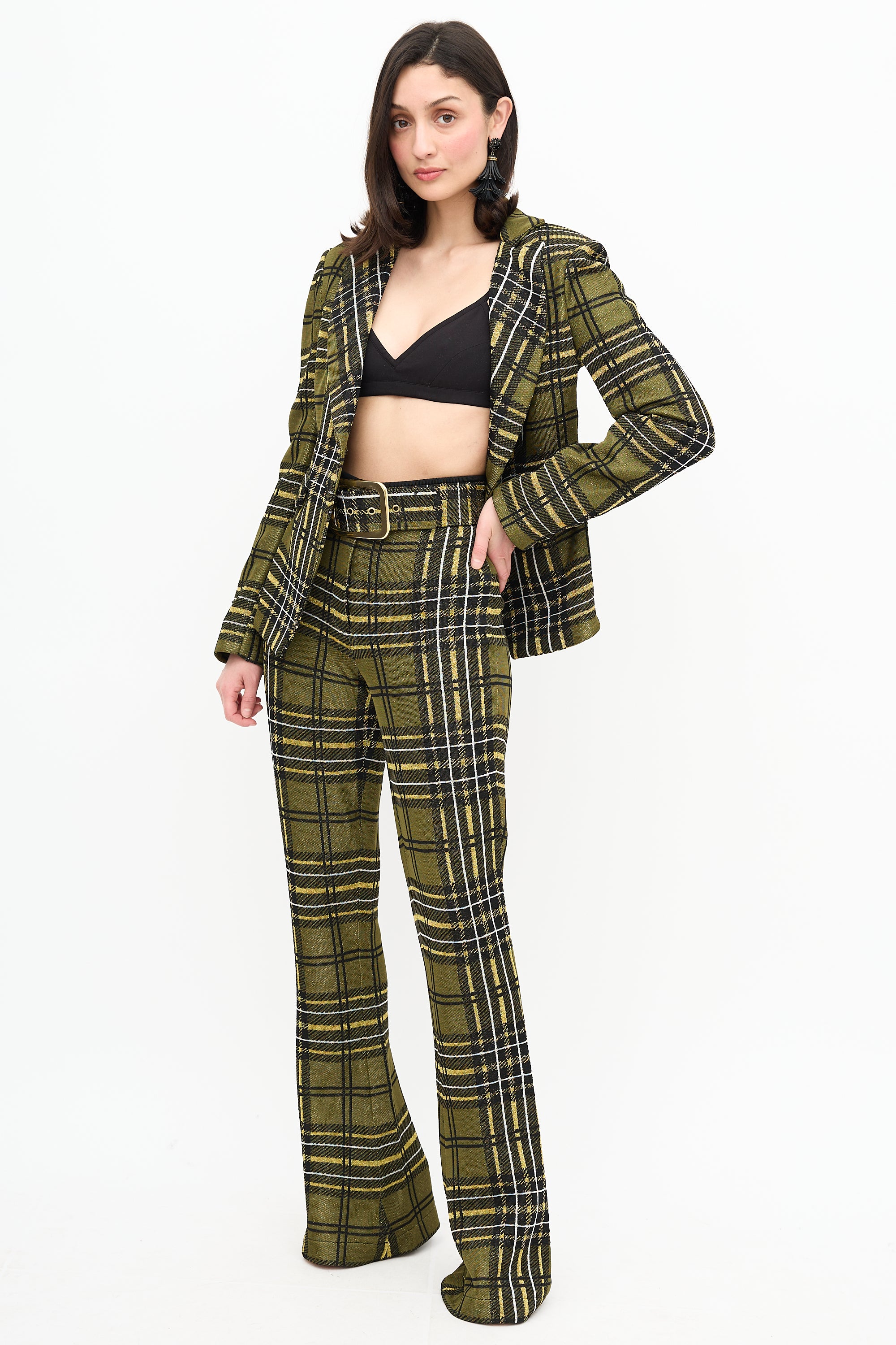 Pre-owned Skazi green knit blazer featuring multicolour metallic plaid, peak lapels, button front, and adjustable belt. Matching pant features high rise, zip fly, and flared leg. Unlined.
