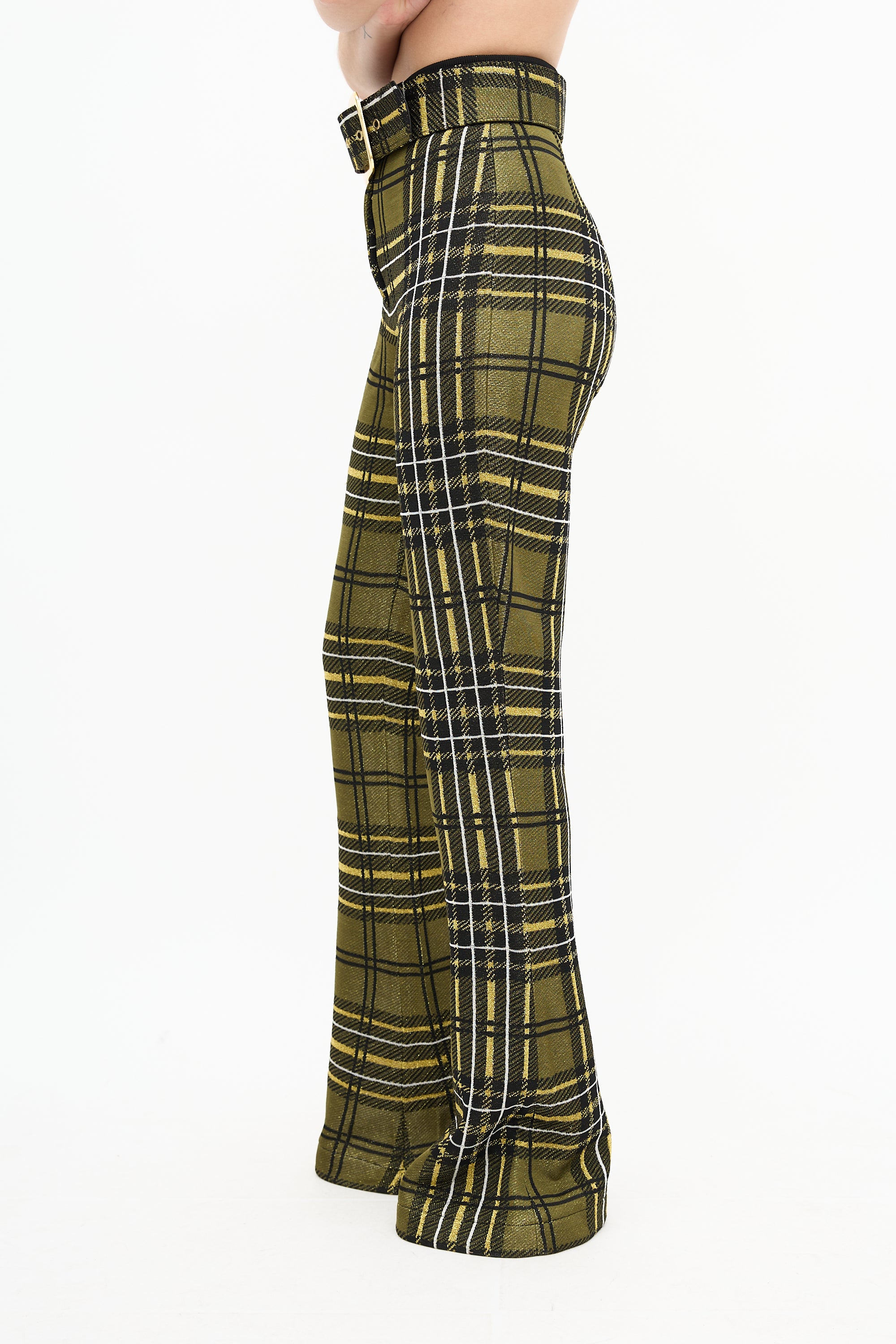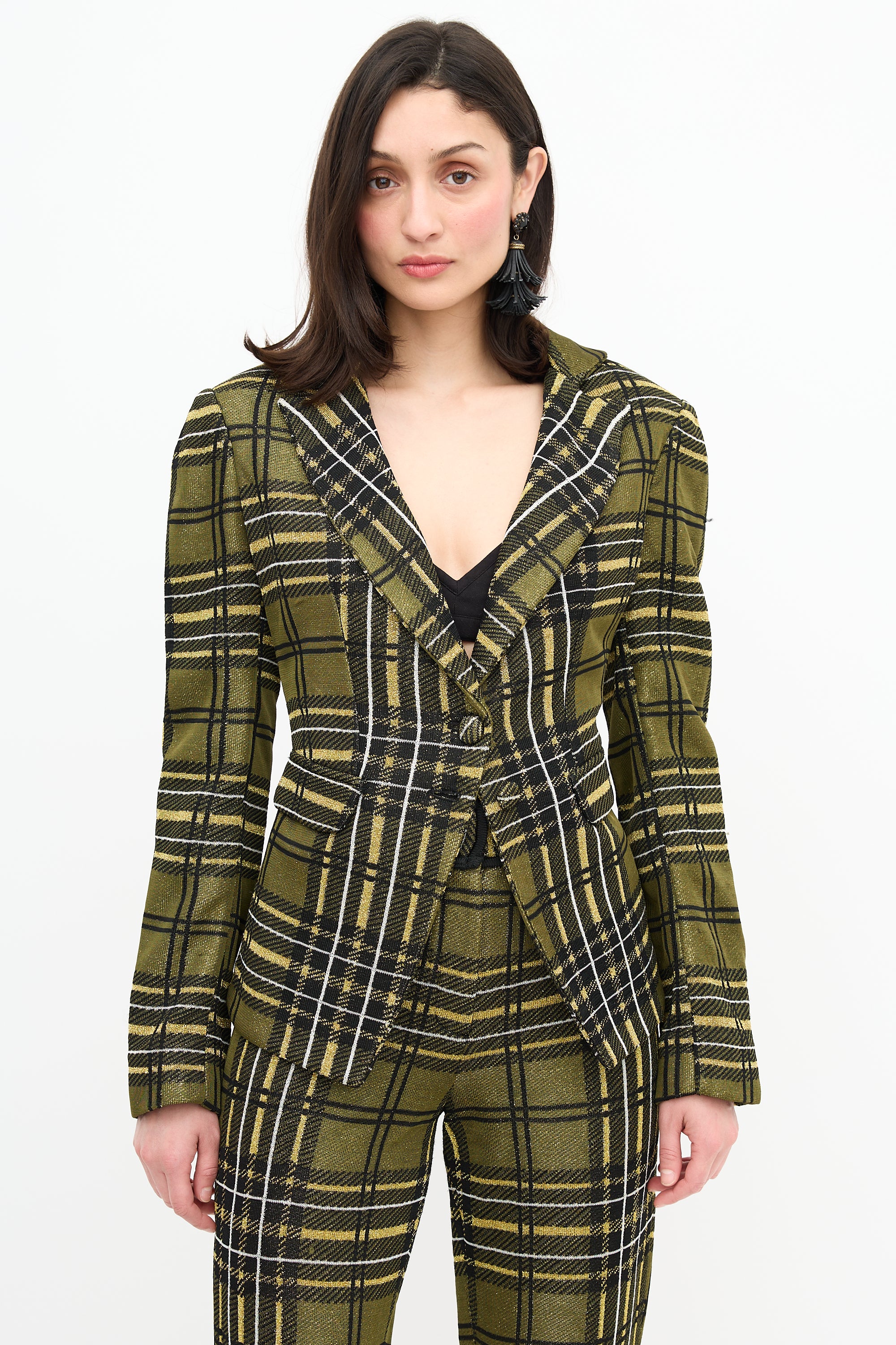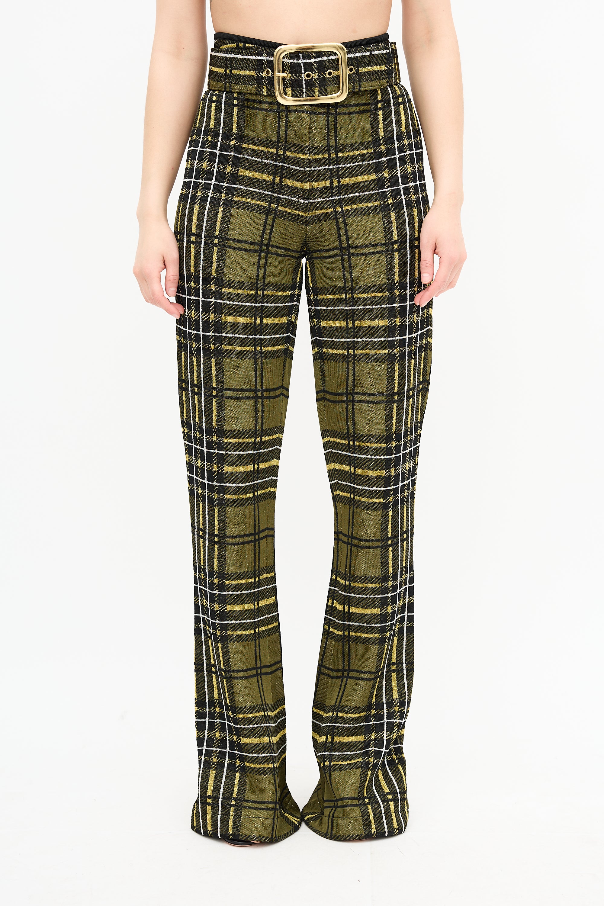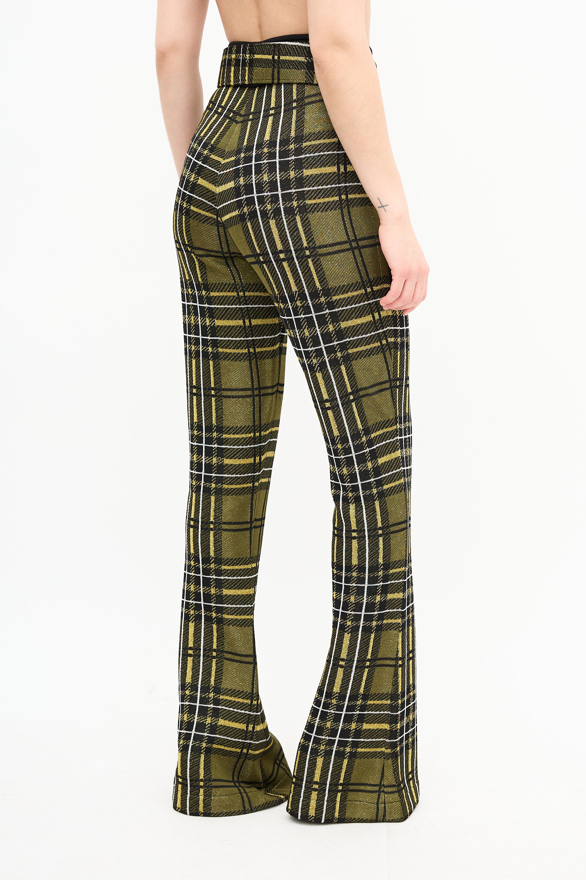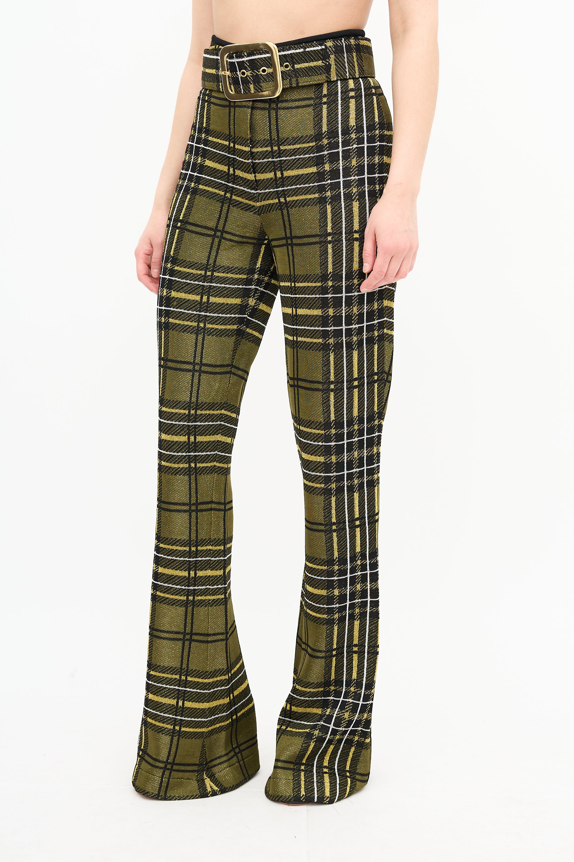 Pre-owned Skazi green knit blazer featuring multicolour metallic plaid, peak lapels, button front, and adjustable belt. Matching pant features high rise, zip fly, and flared leg. Unlined.