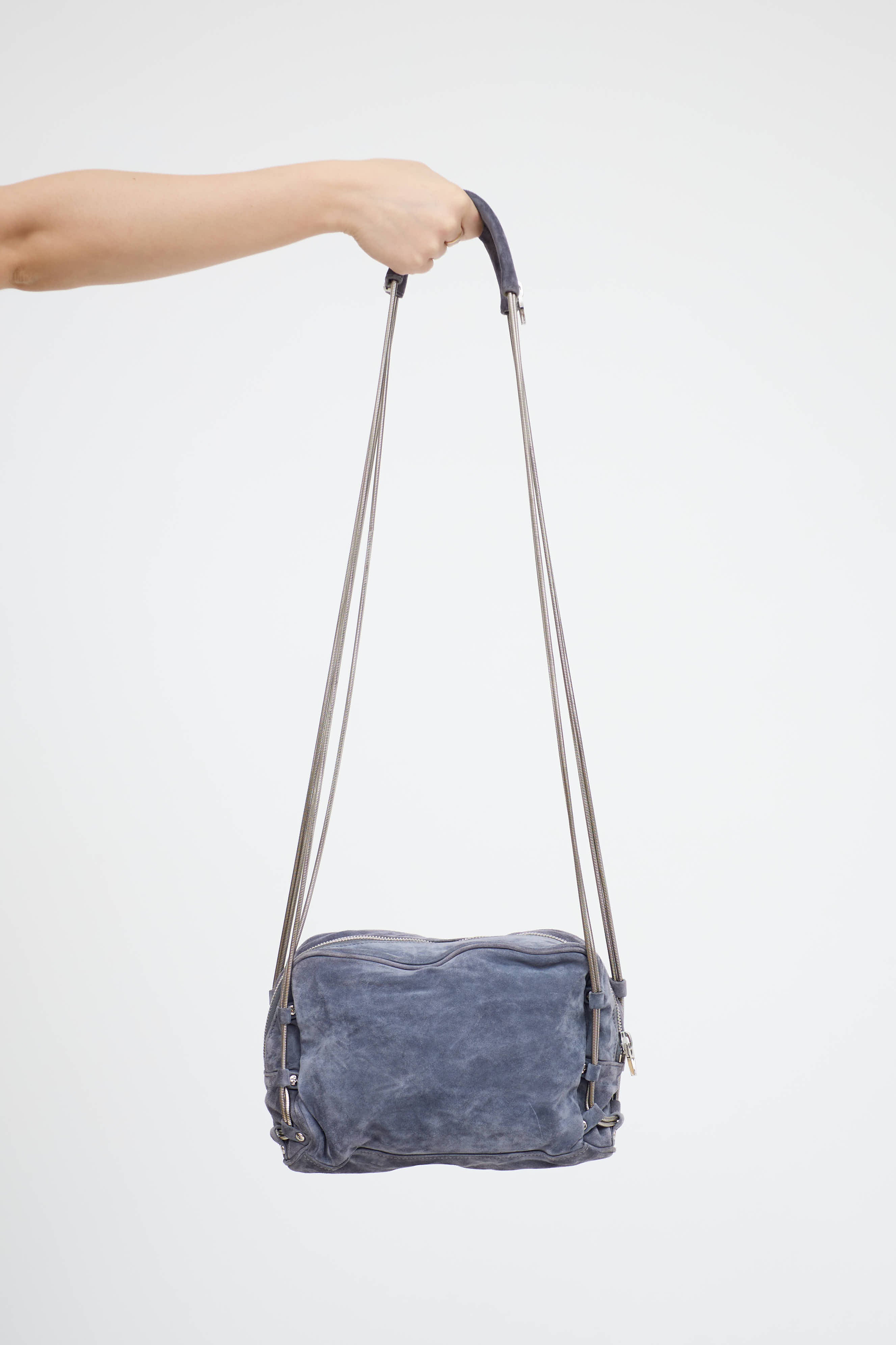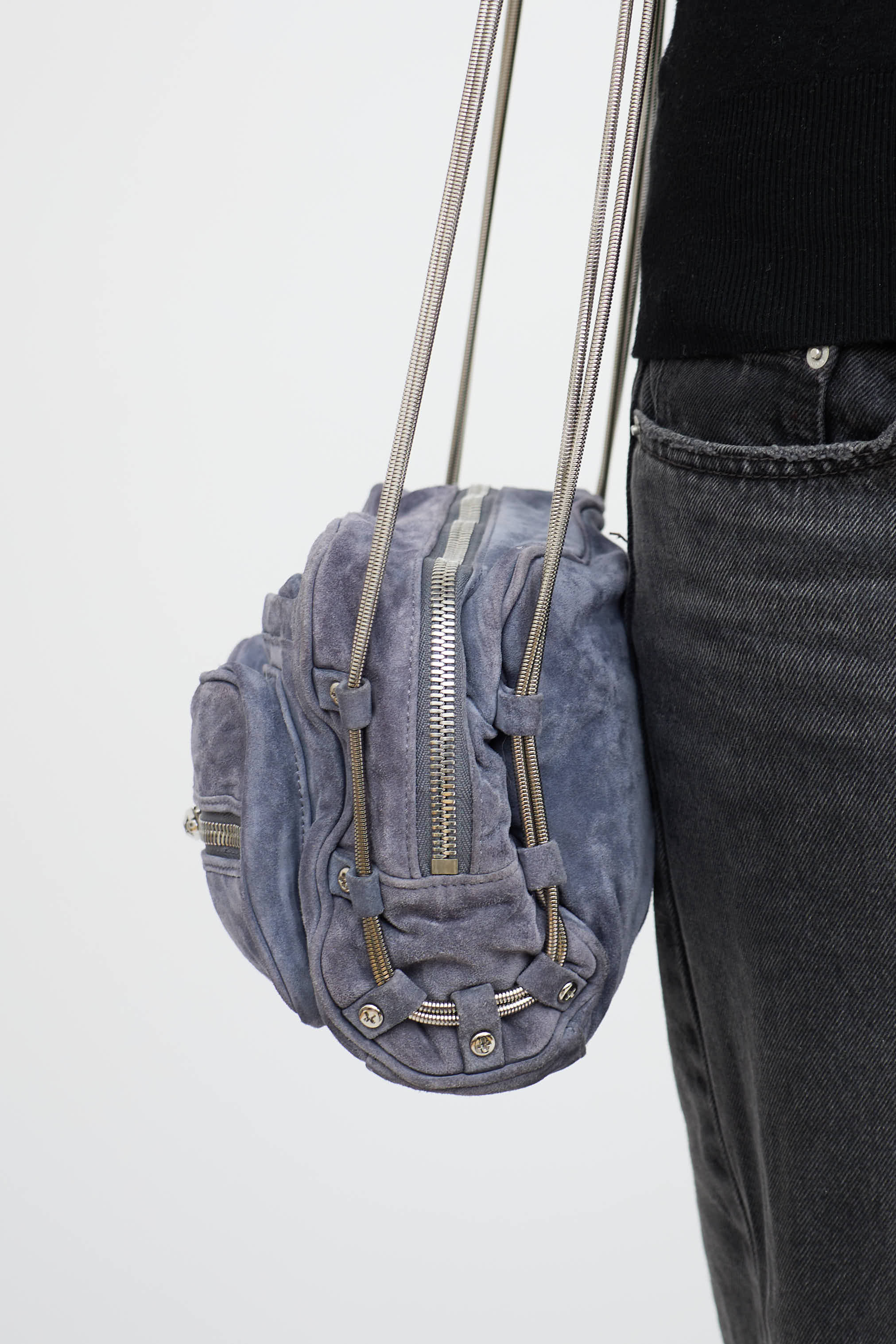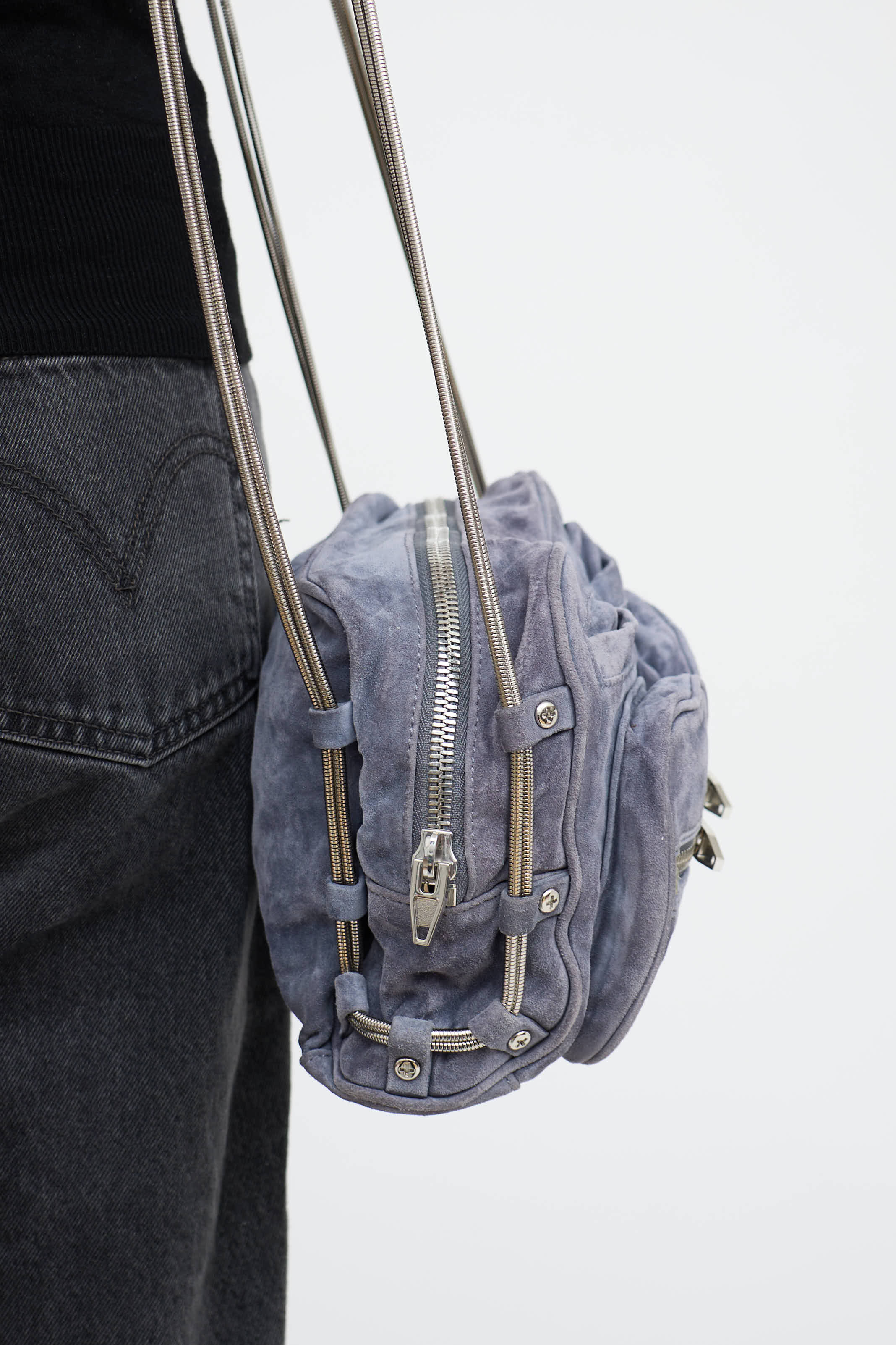 Pre-owned Alexander Wang purple suede Brenda bag featuring two zip and slip pockets at front, silver tone hardware, cable straps with zipped leather shoulder pad, top zip closure, one main compartment, and one zip pocket.