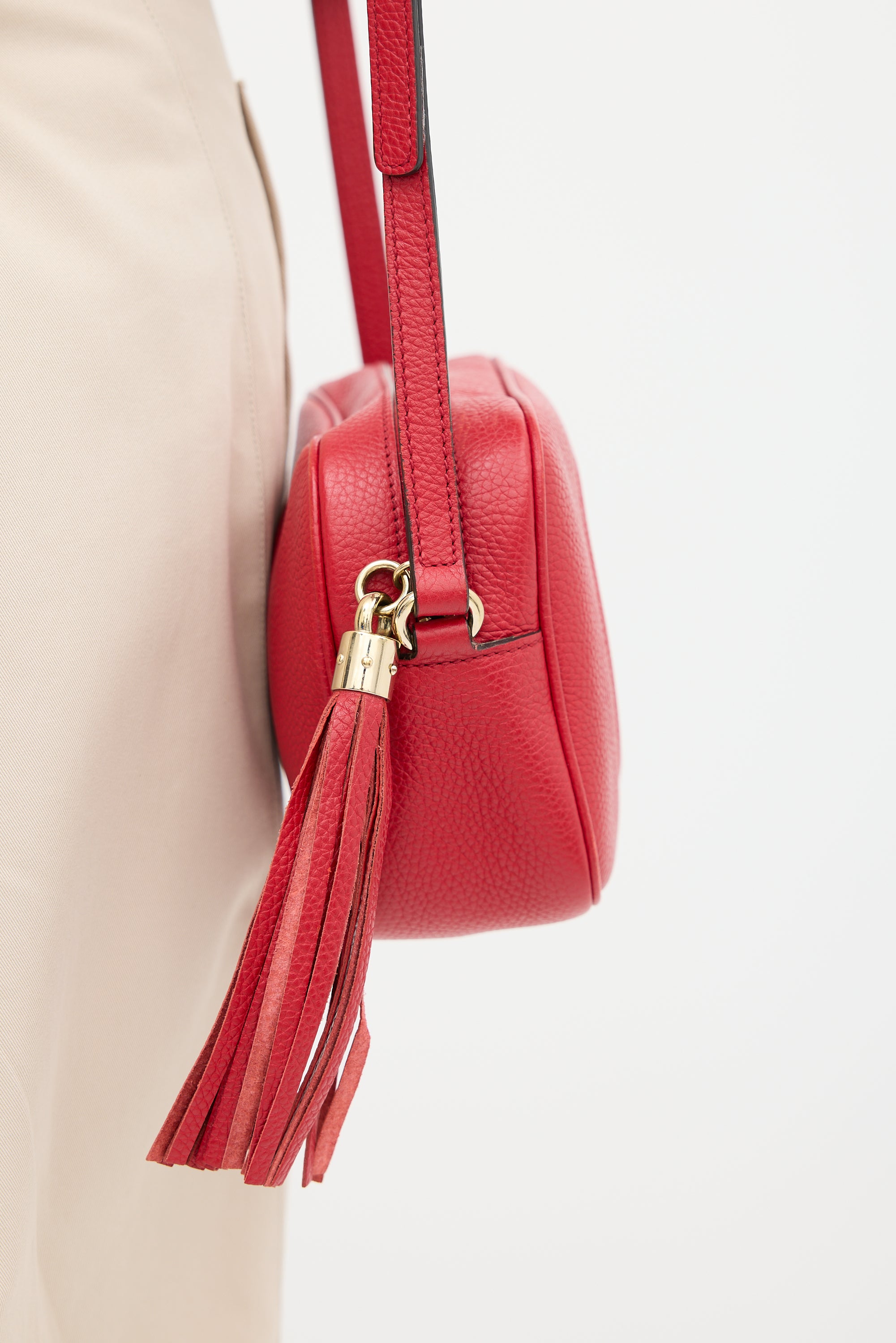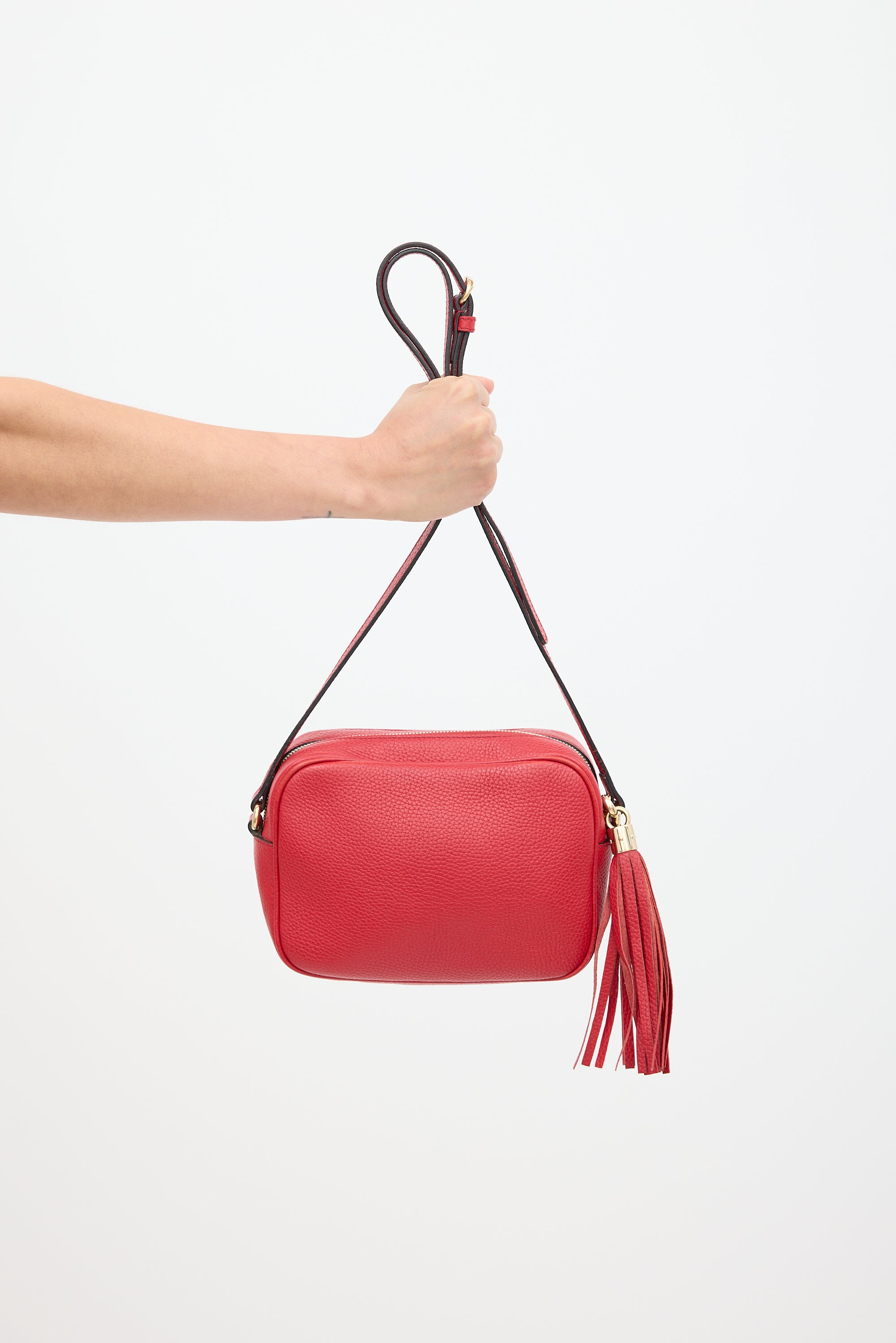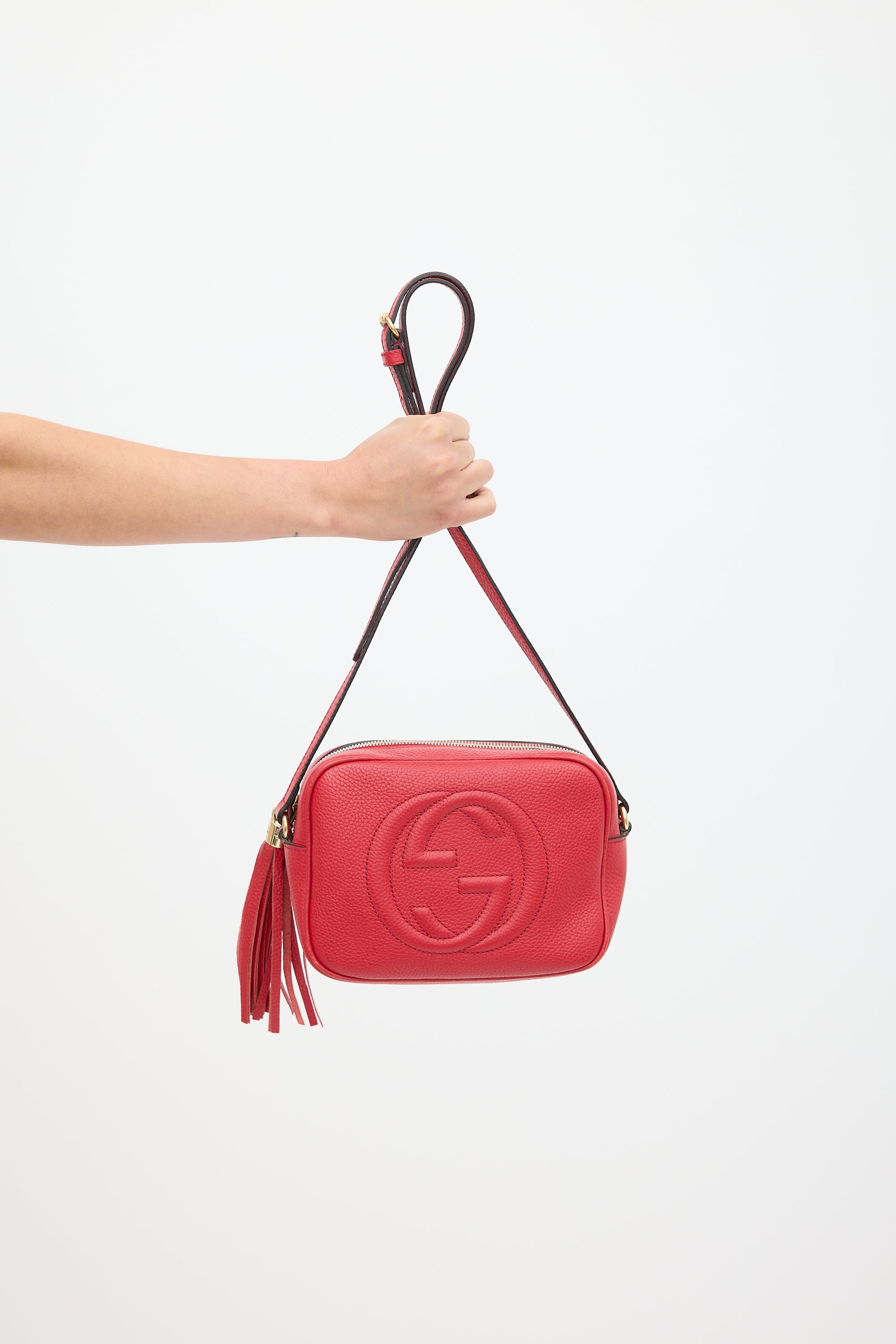Pre-owned Gucci red Soho Disco crossbody leather bag featuring debossed GG logo at face, one main compartment with two slip pockets, adjustable shoulder strap, and top zip closure with tassel pull tab. Comes with original dust bag.