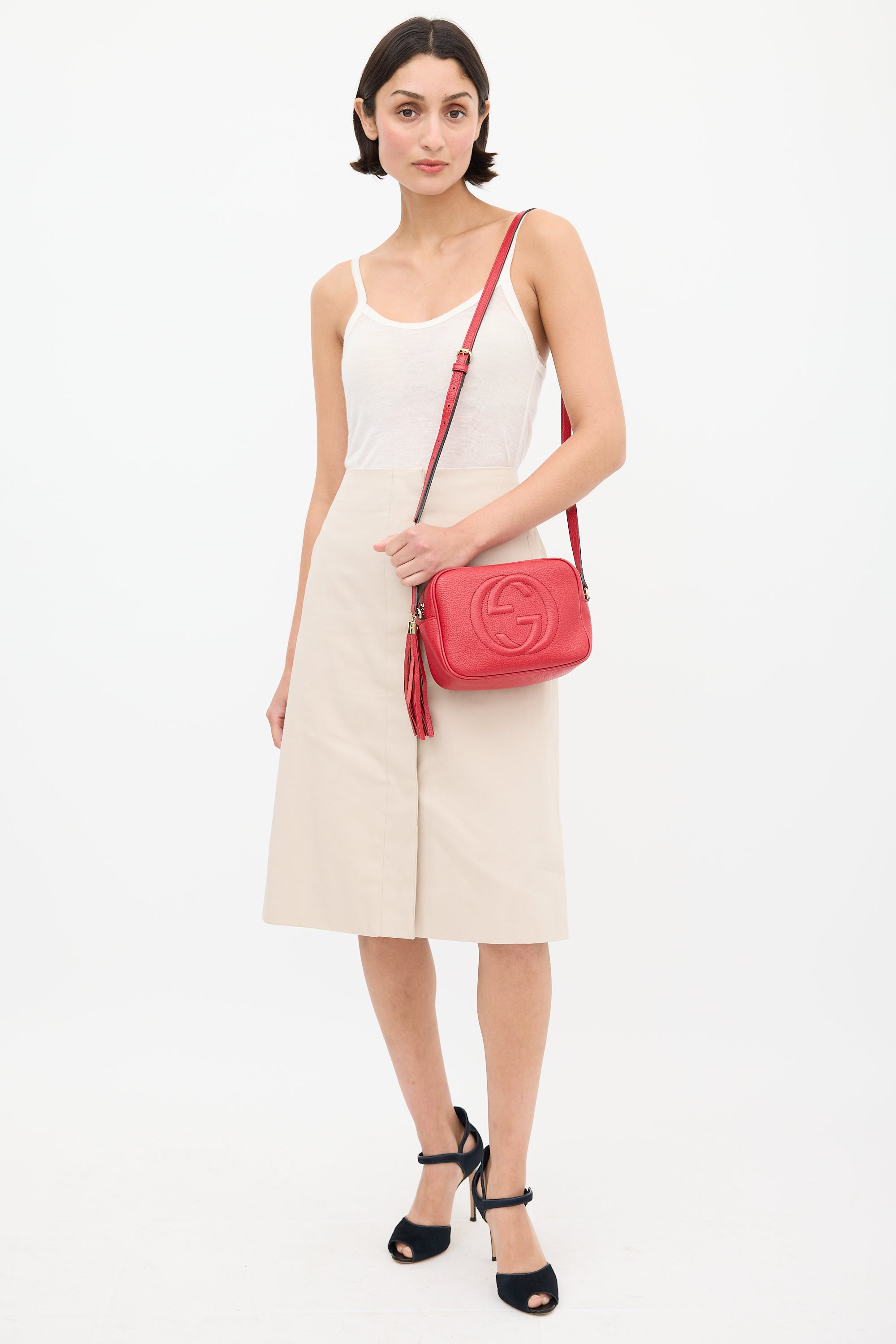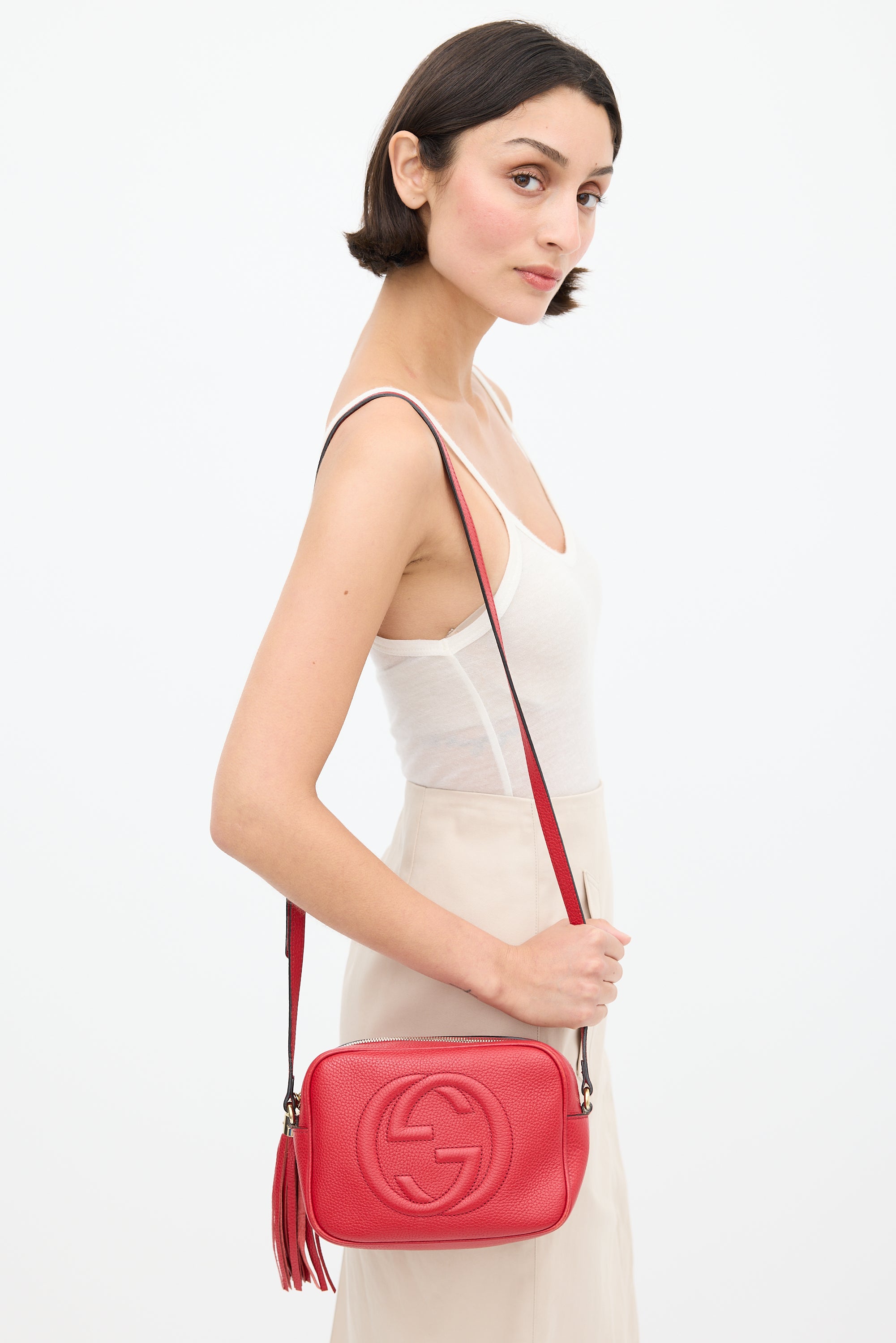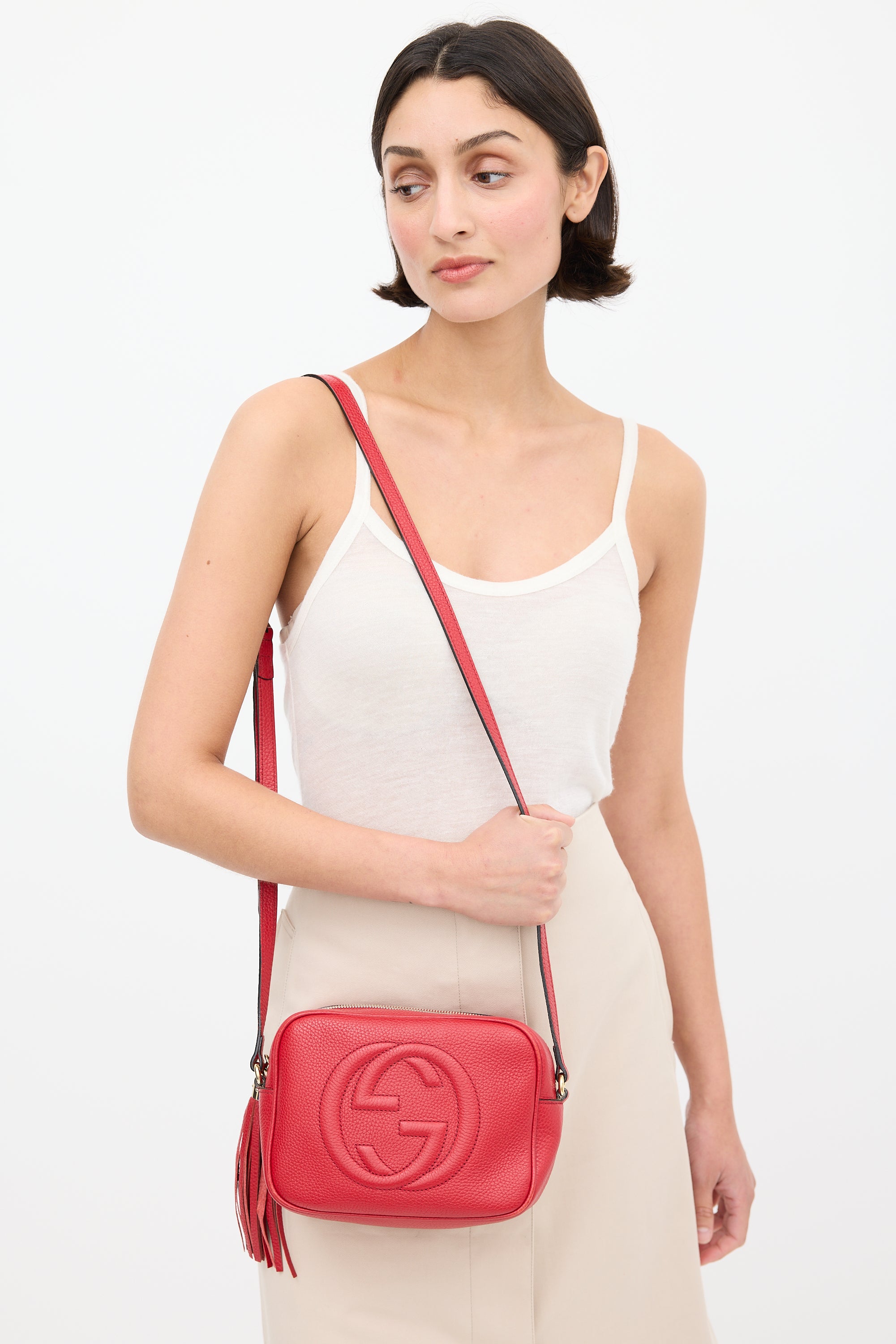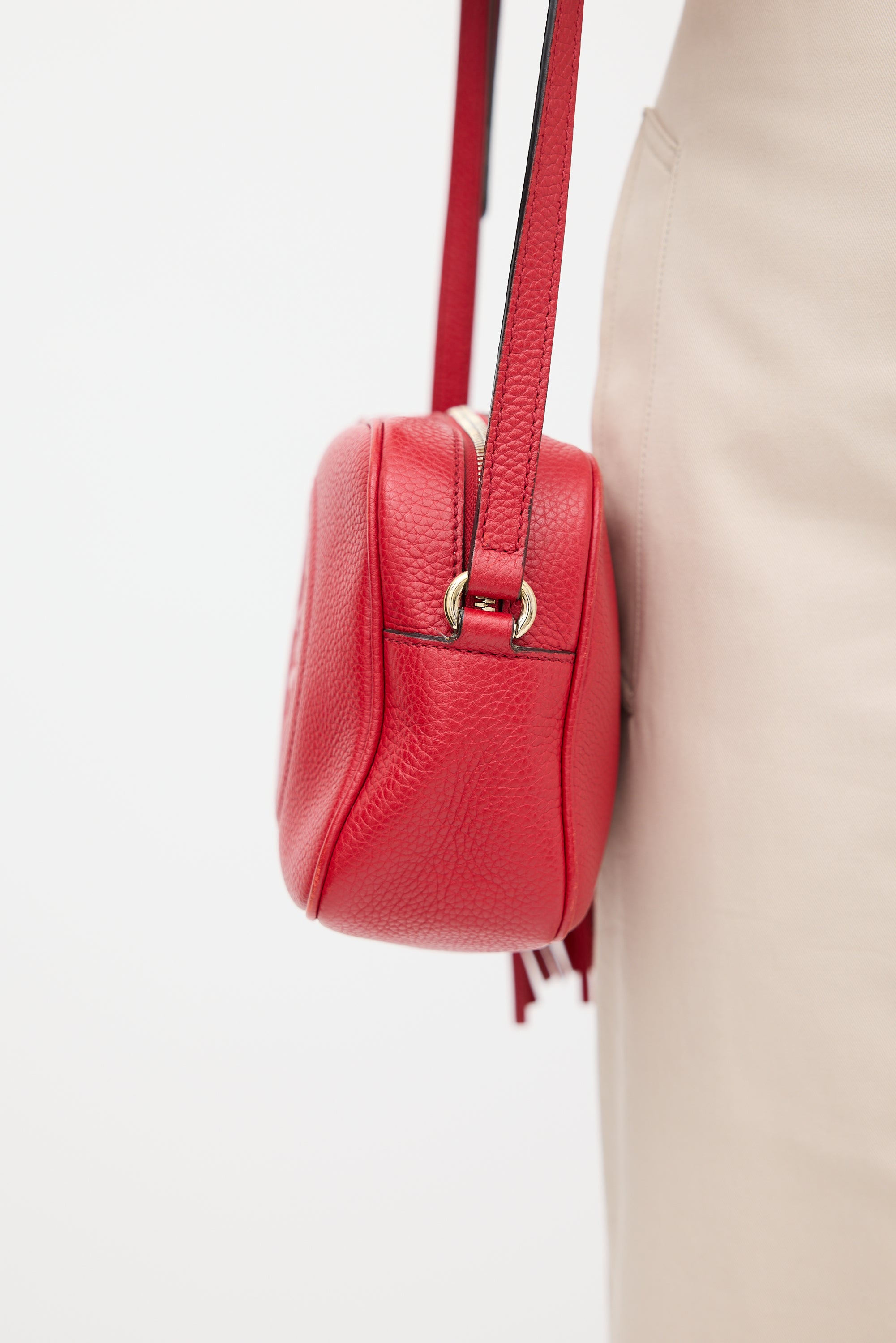 Pre-owned Gucci red Soho Disco crossbody leather bag featuring debossed GG logo at face, one main compartment with two slip pockets, adjustable shoulder strap, and top zip closure with tassel pull tab. Comes with original dust bag.