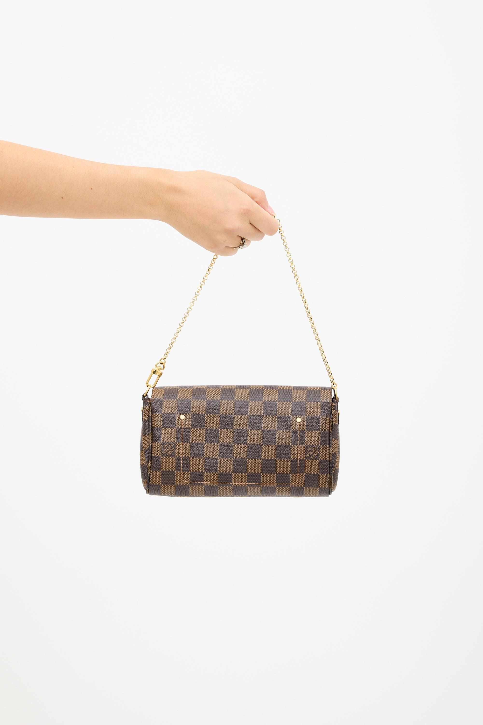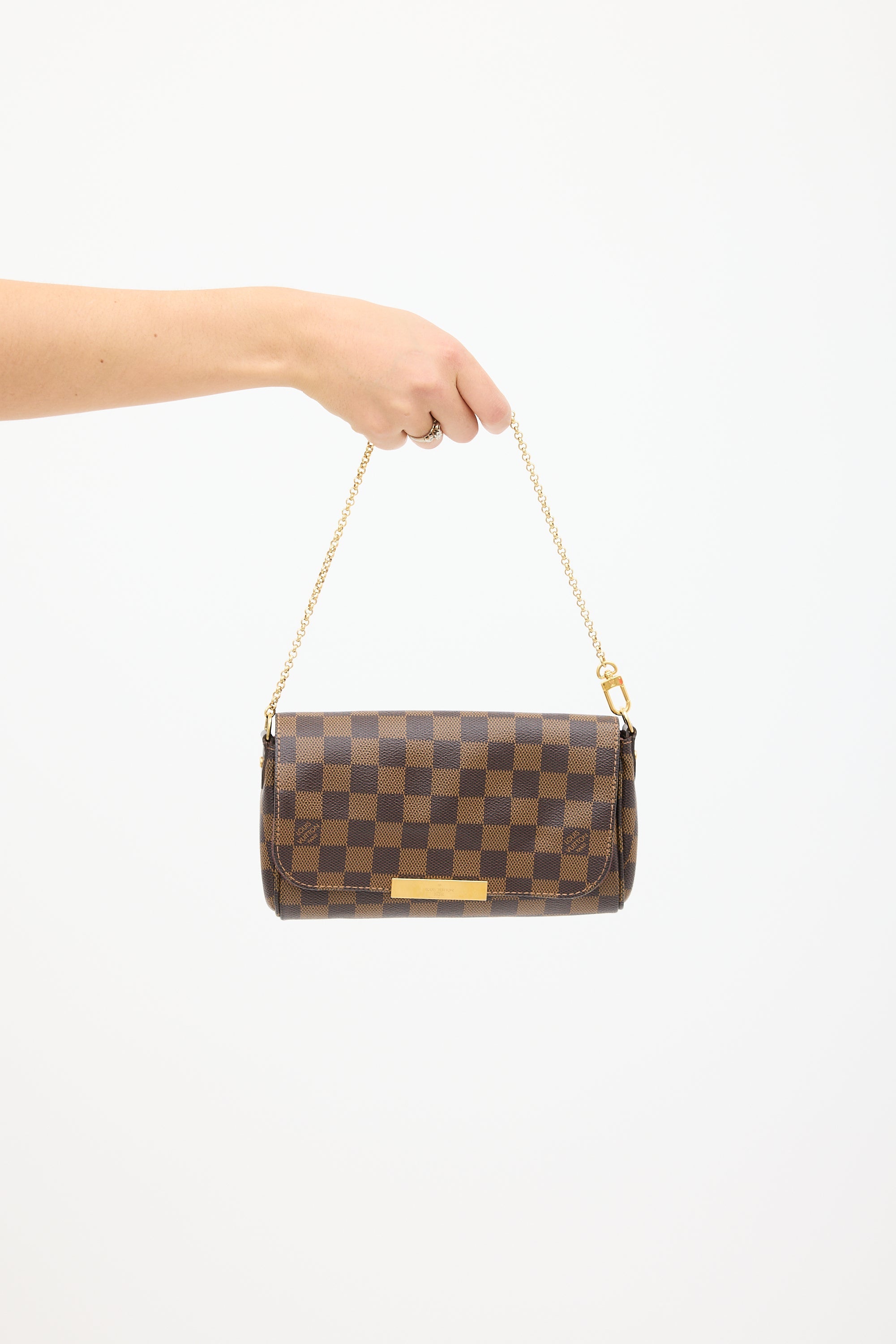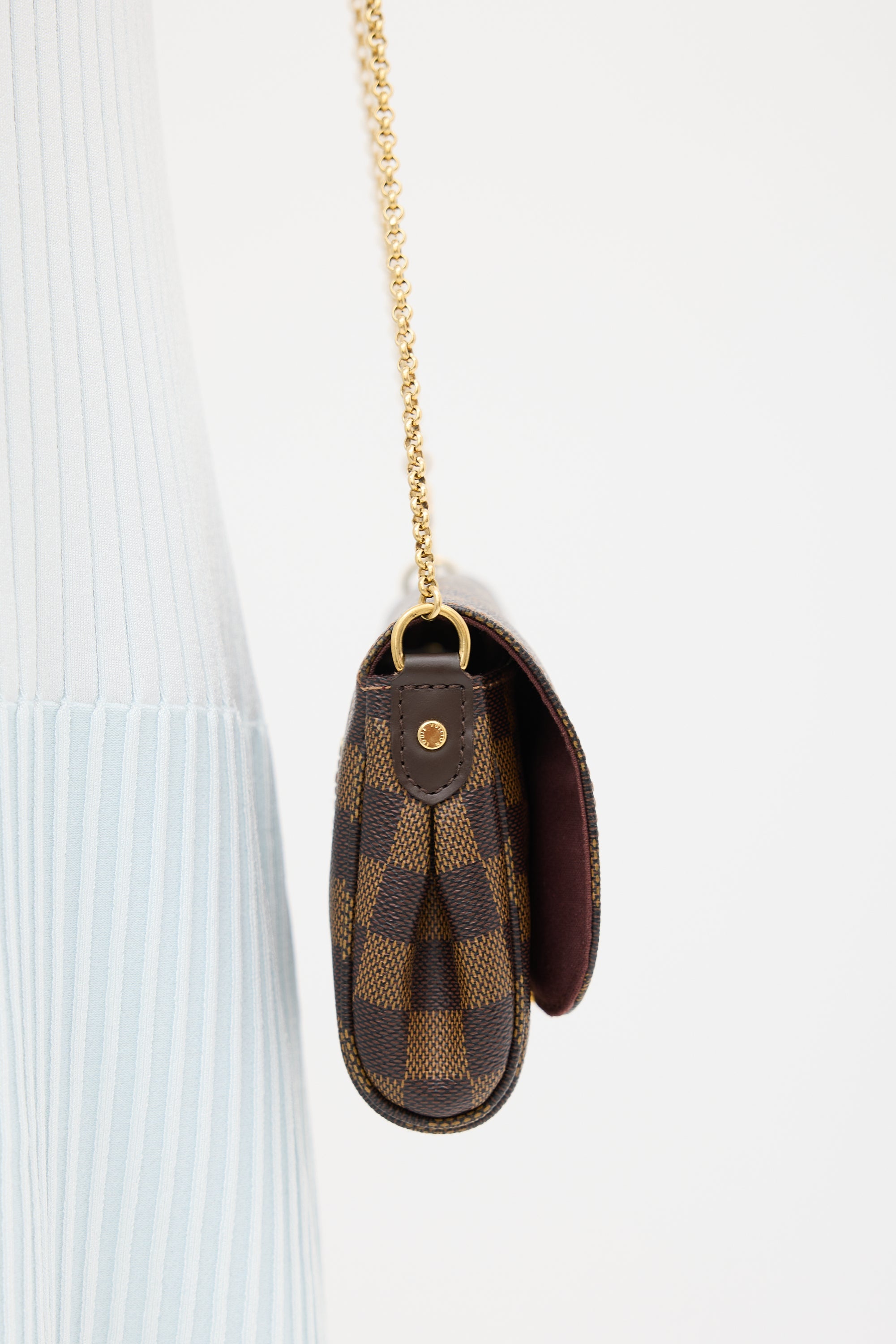 Pre-owned Louis Vuitton 2014 brown Favourite PM bag featuring Damier Ebene coated canvas, gold tone hardware, detachable and fixed chain and leather shoulder strap, engraved logo at front plaque, canvas lined main compartment, and one card slot inside.
