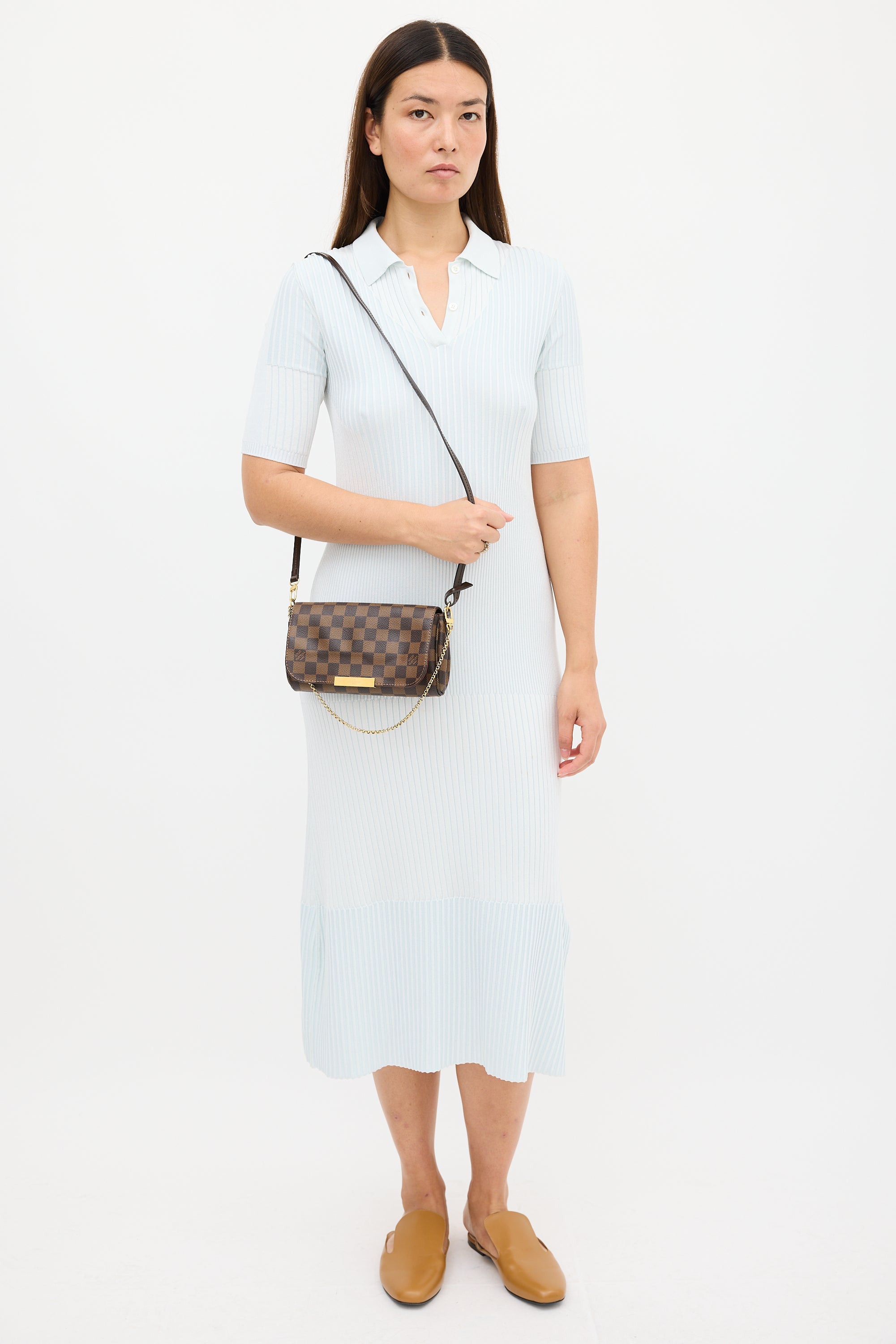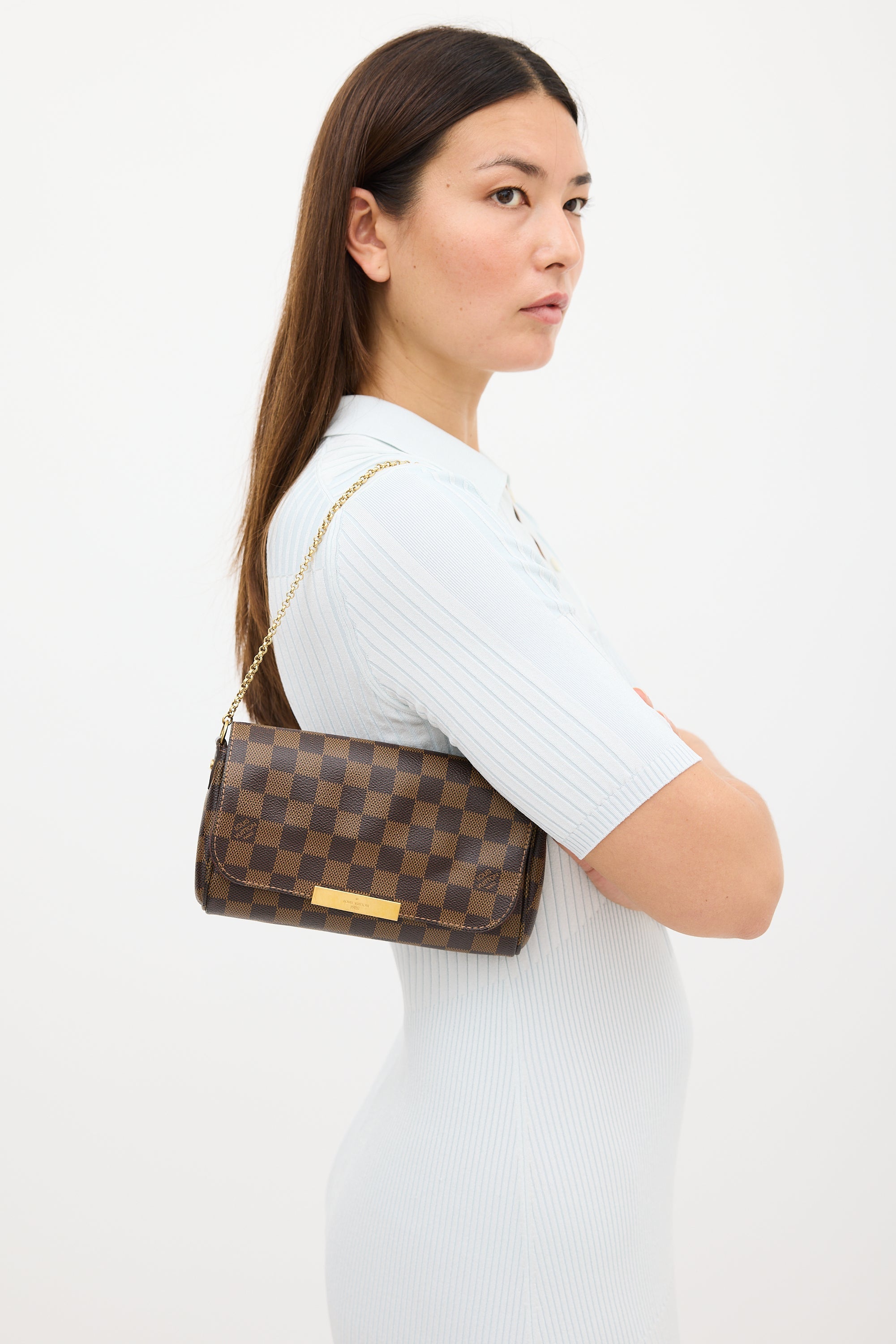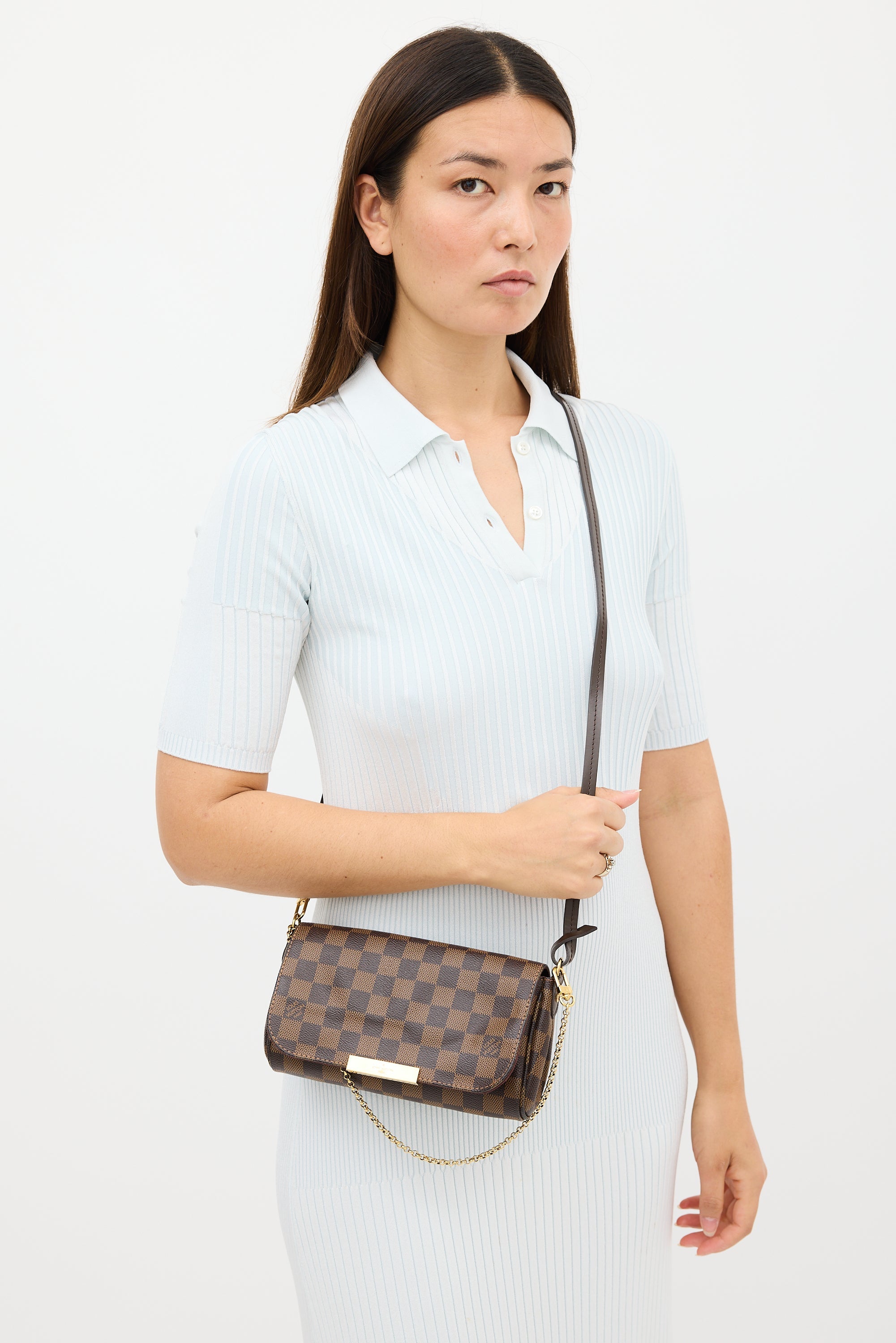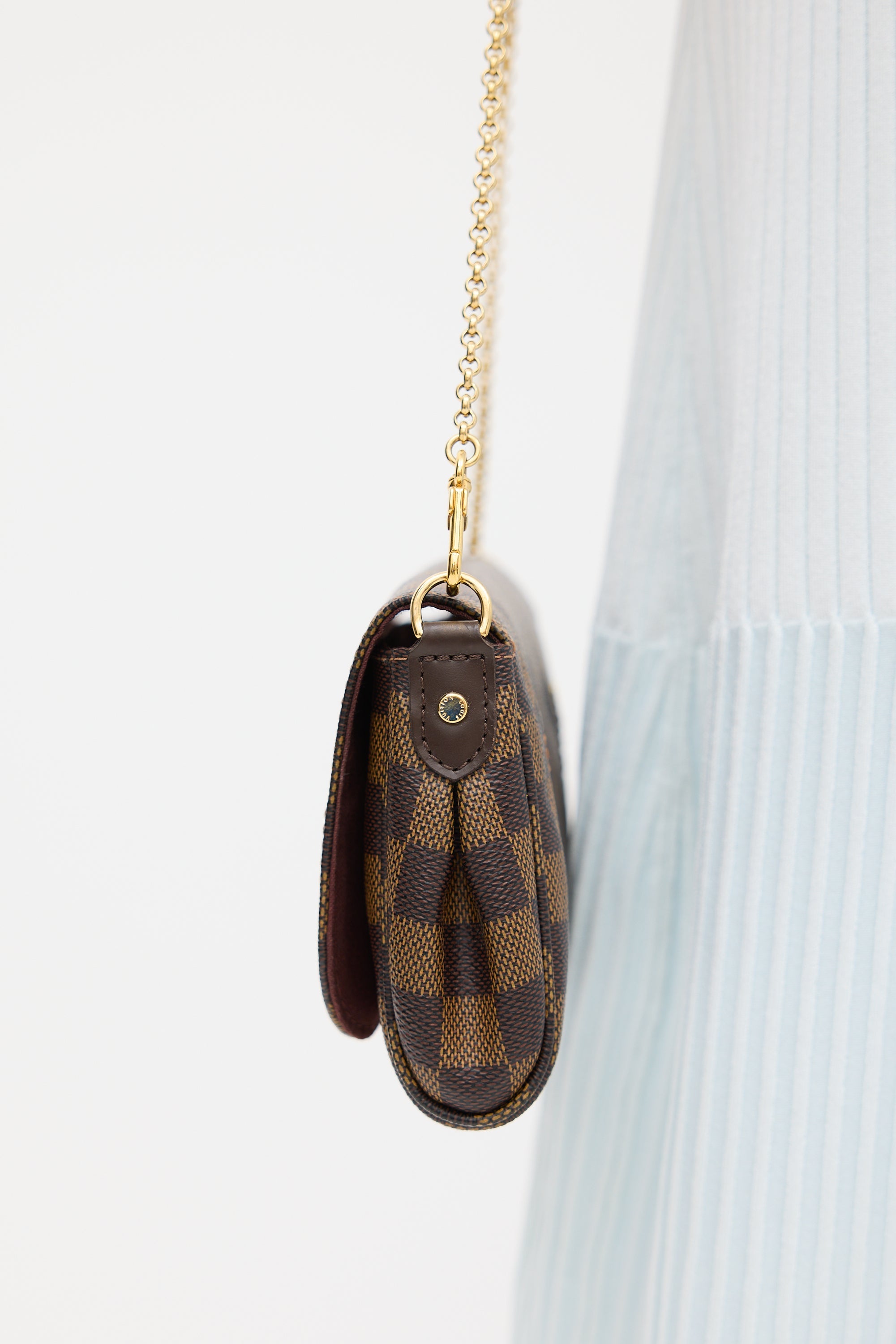 Pre-owned Louis Vuitton 2014 brown Favourite PM bag featuring Damier Ebene coated canvas, gold tone hardware, detachable and fixed chain and leather shoulder strap, engraved logo at front plaque, canvas lined main compartment, and one card slot inside.