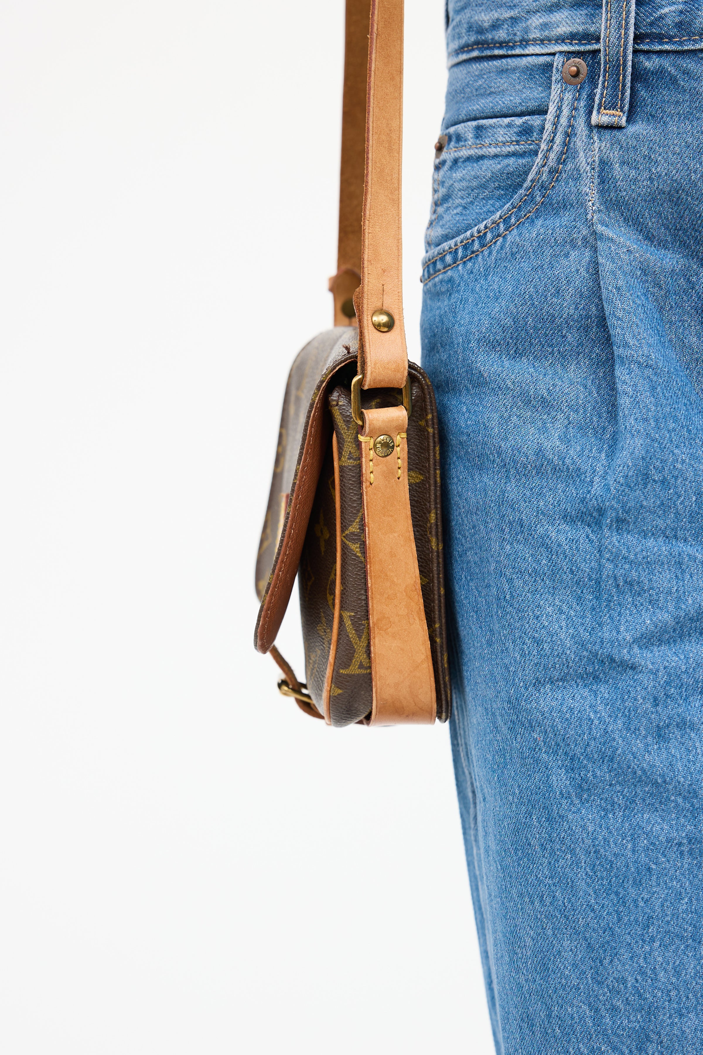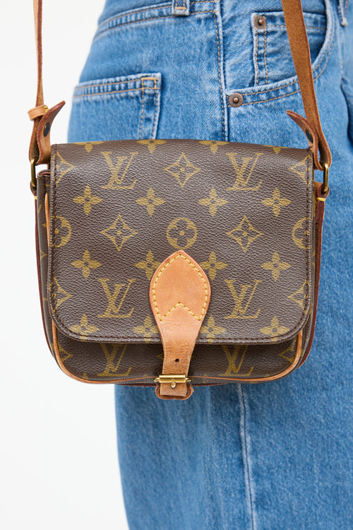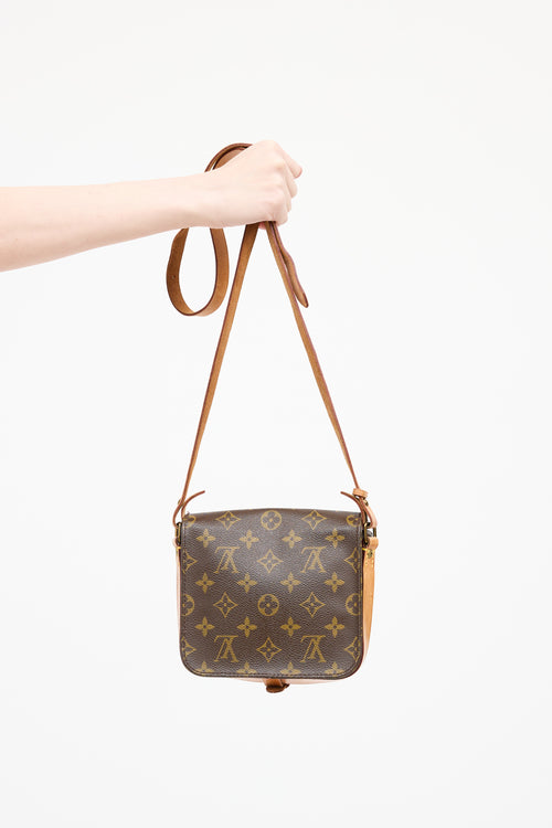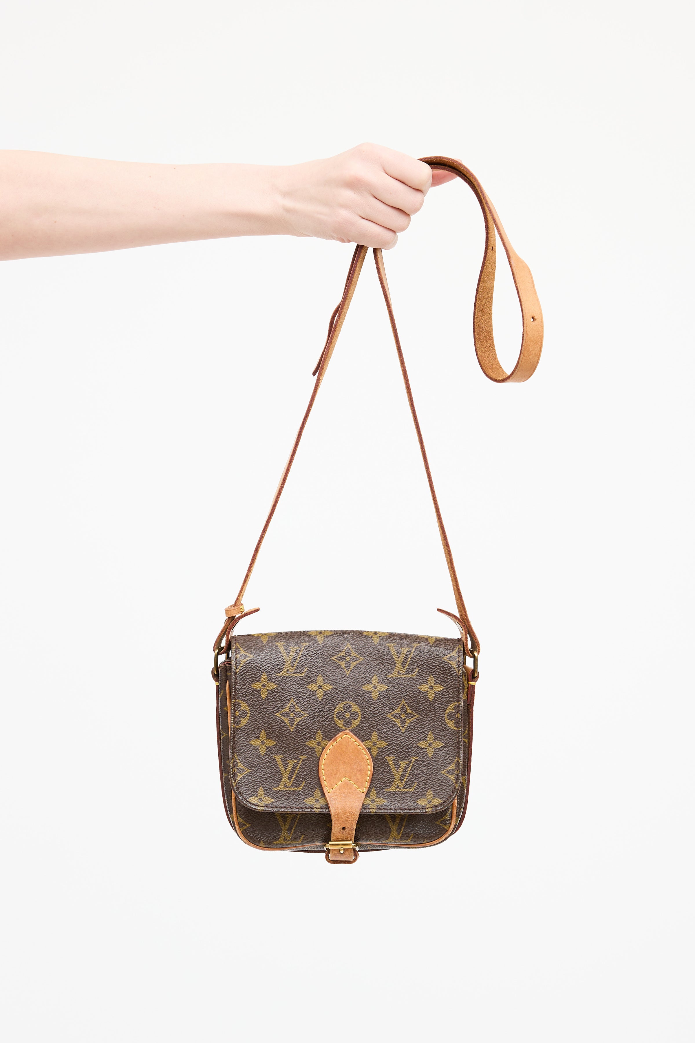 Pre-owned Louis Vuitton brown Cartouchiere crossbody bag featuring single patina leather adjustable crossbody strap, gold tone hardware, coated canvas monogram and top flap with three hole strap closure. Leather lined main compartment.