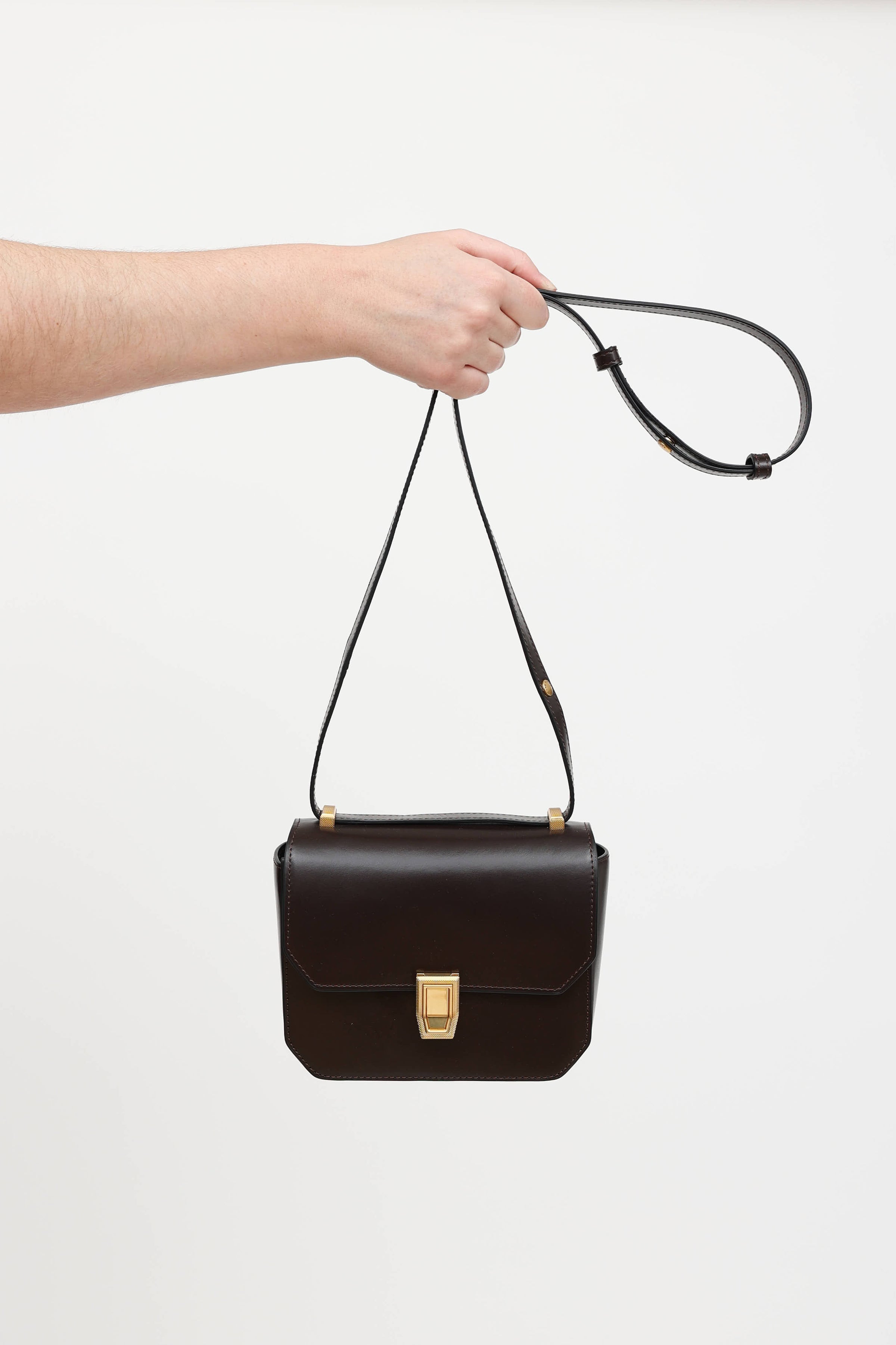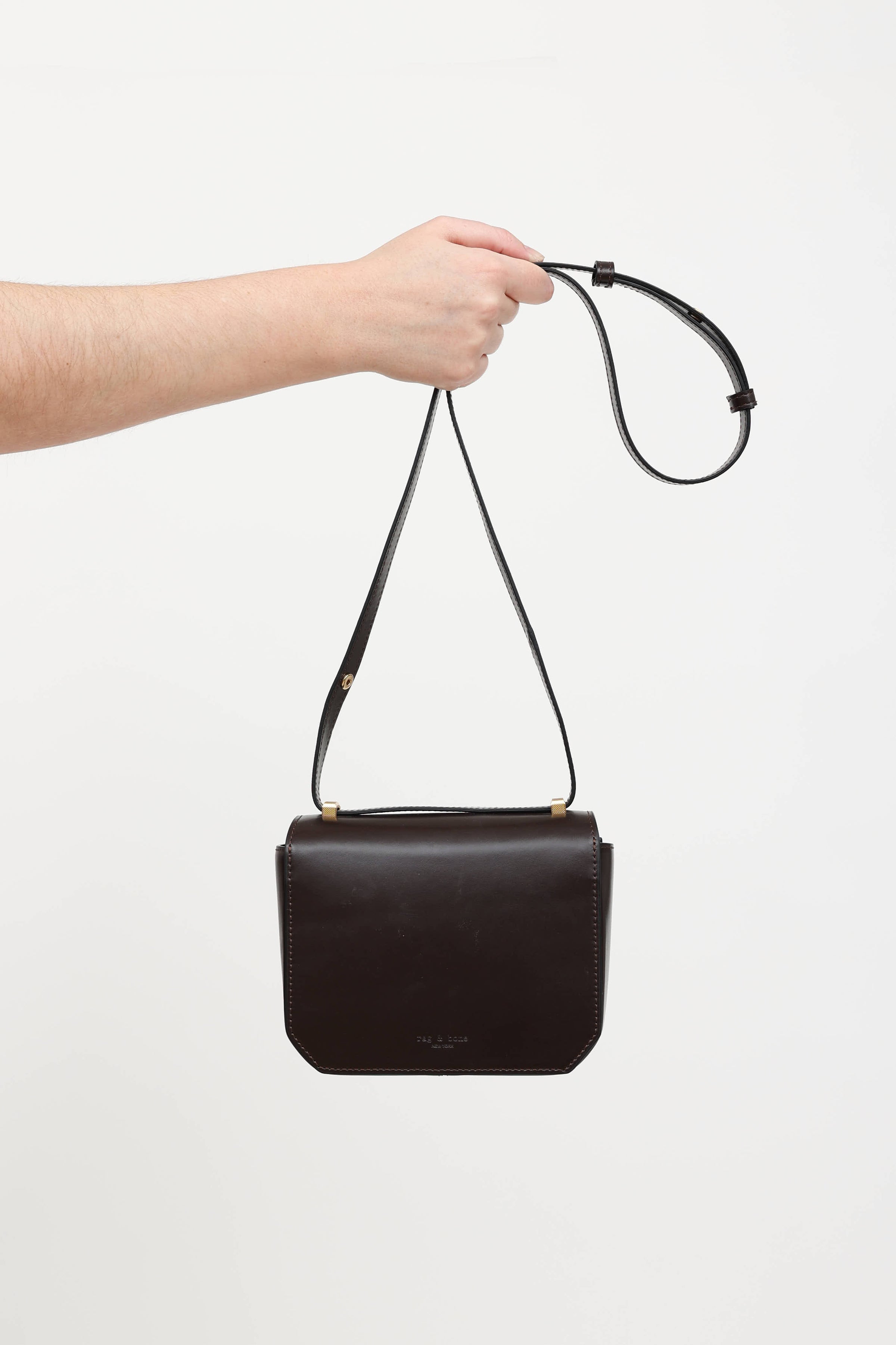 Pre-owned Rag & Bone brown leather Max crossbody bag featuring adjustable shoulder strap, gold tone hardware, top flap with magnetic hinge lock closure, slip pocket at front face, one main compartment, and three card slots.