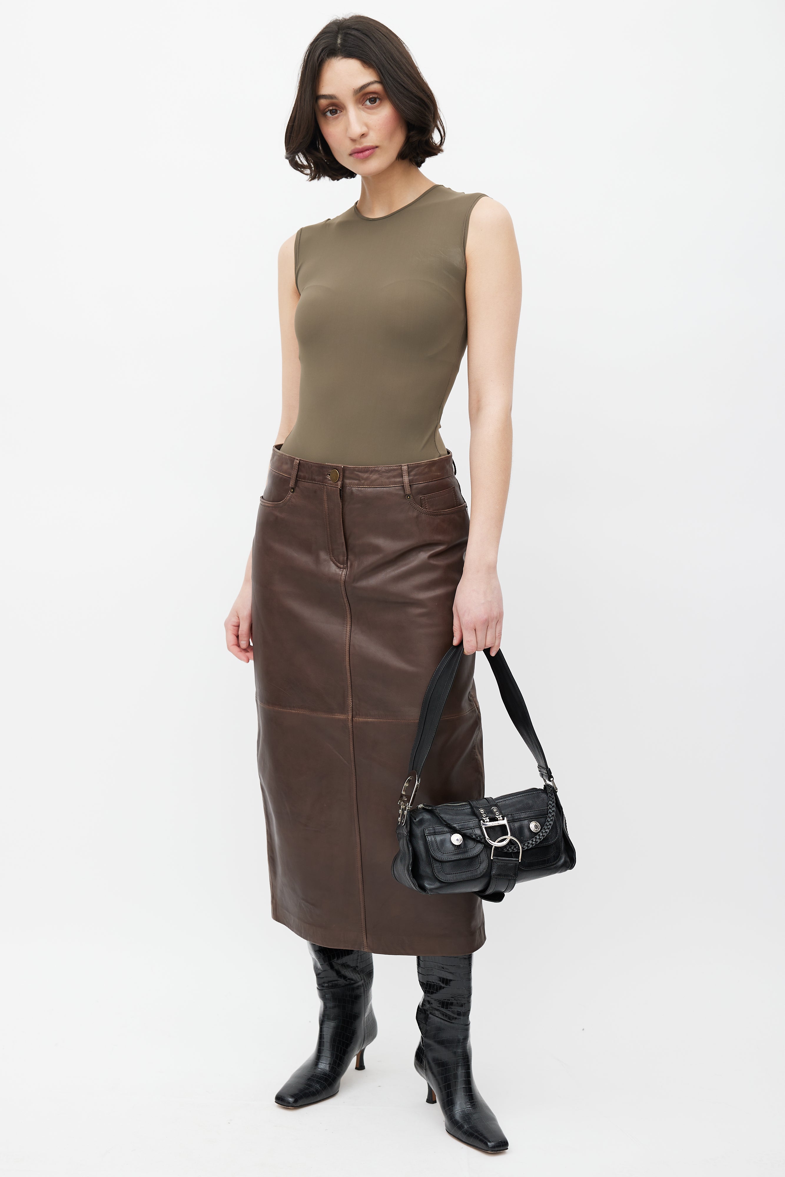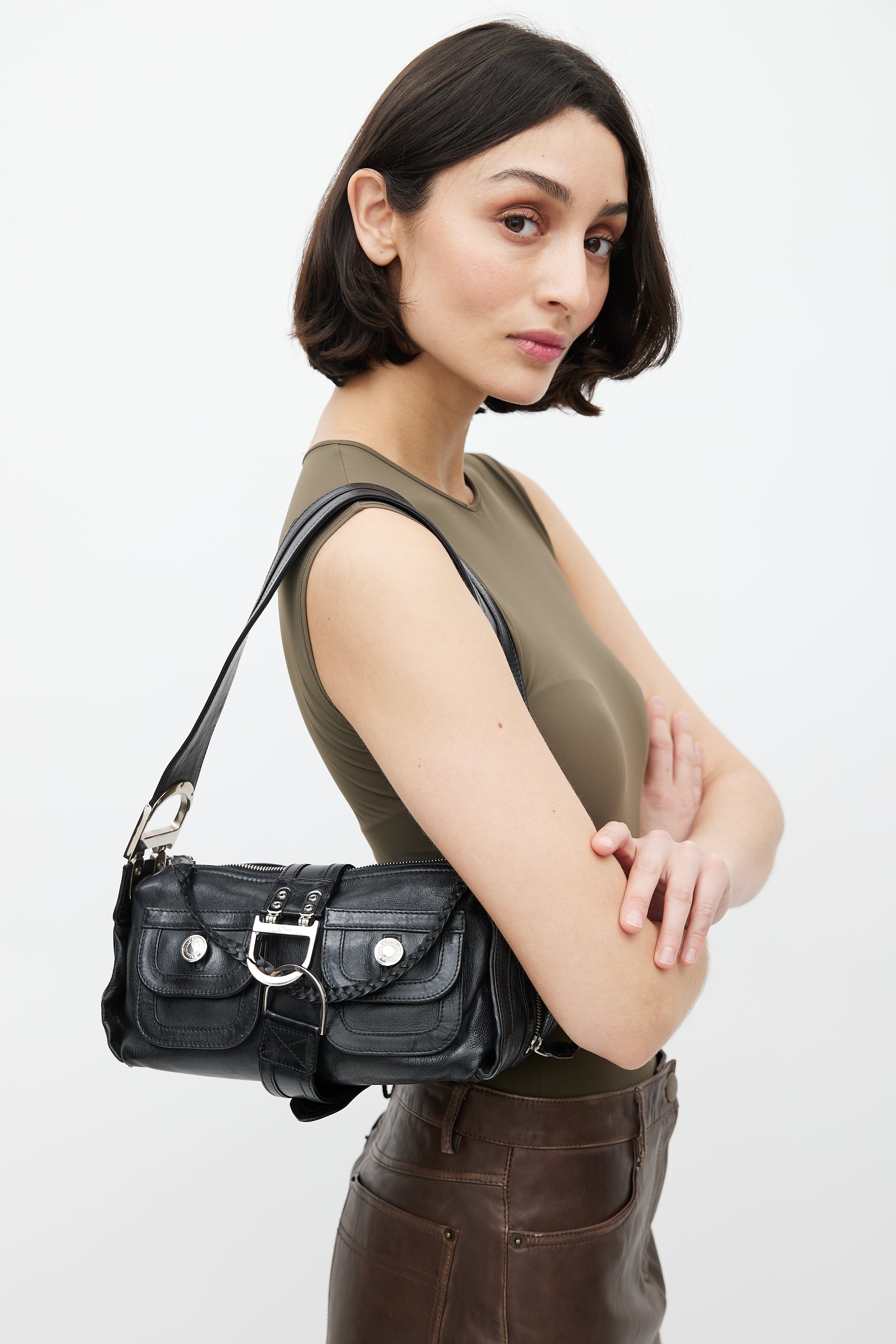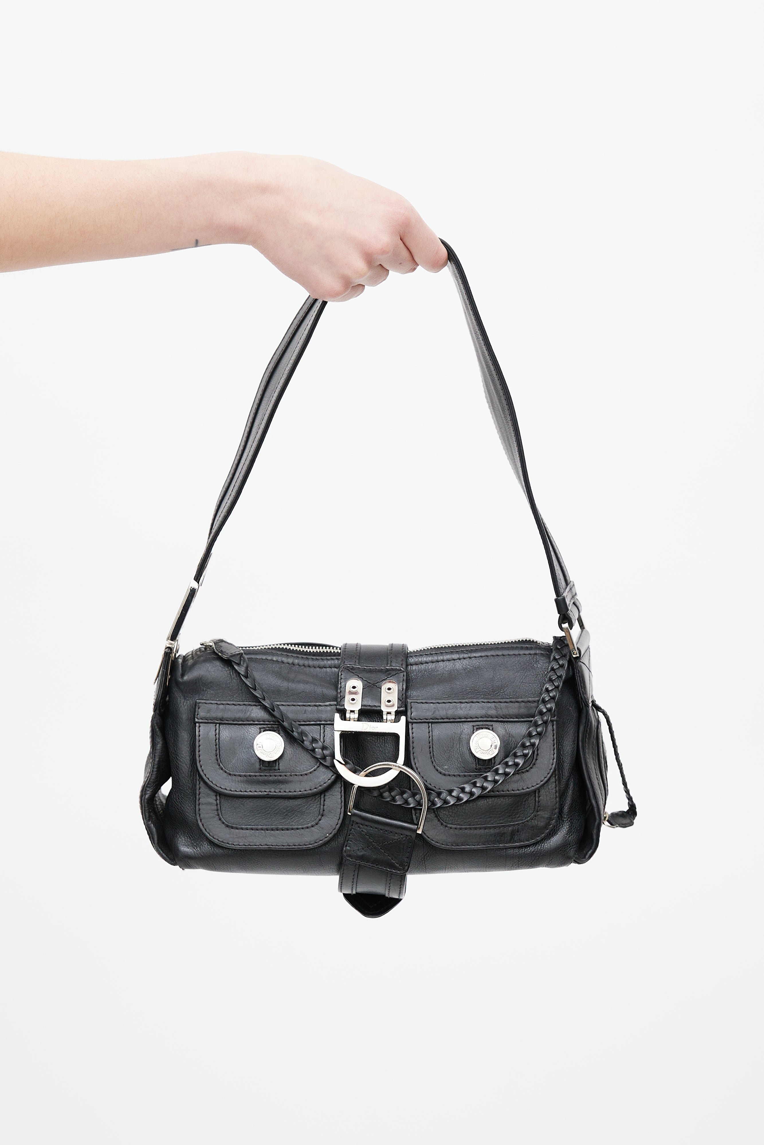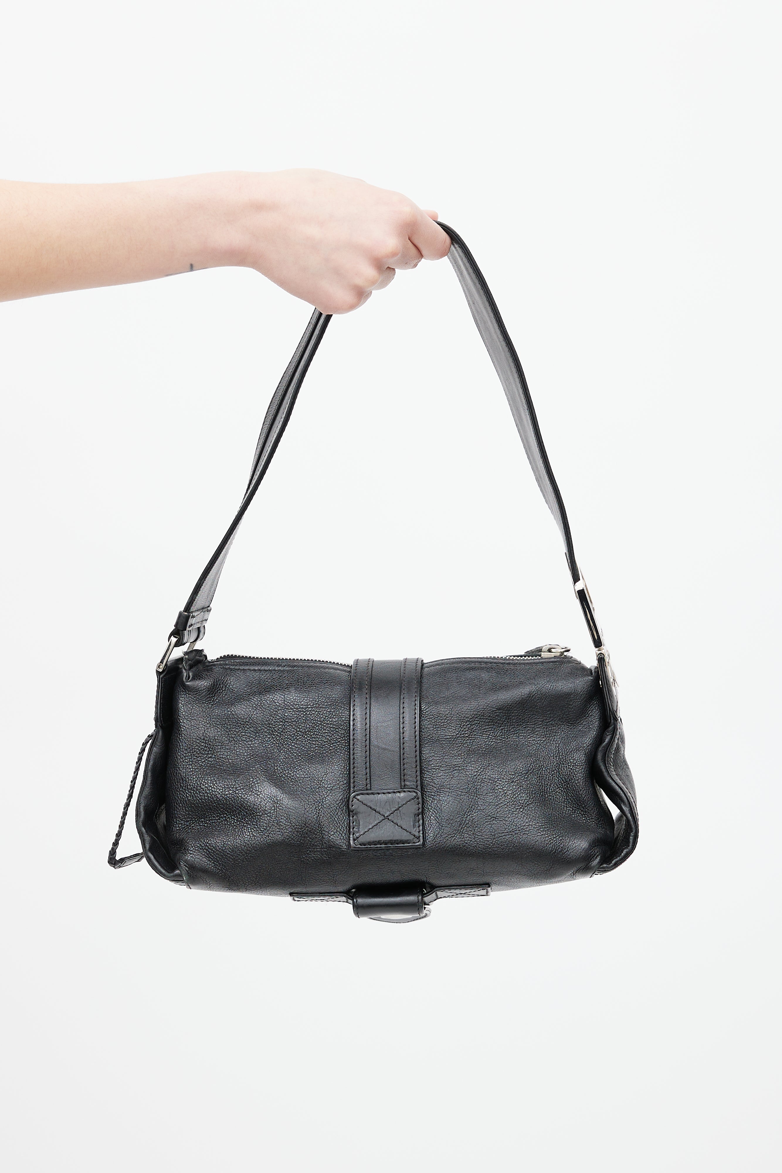 Pre-owned Dior 2005 black leather Flight Baguette bag featuring fixed shoulder strap, zip closure with black leather braided zip pull, two flap pockets at front with branded magnetic button closure, leather strap closure with interlocking D clasp, zip at side with braided leather pull tab, and removable belt at base of bag. John Galliano era design.