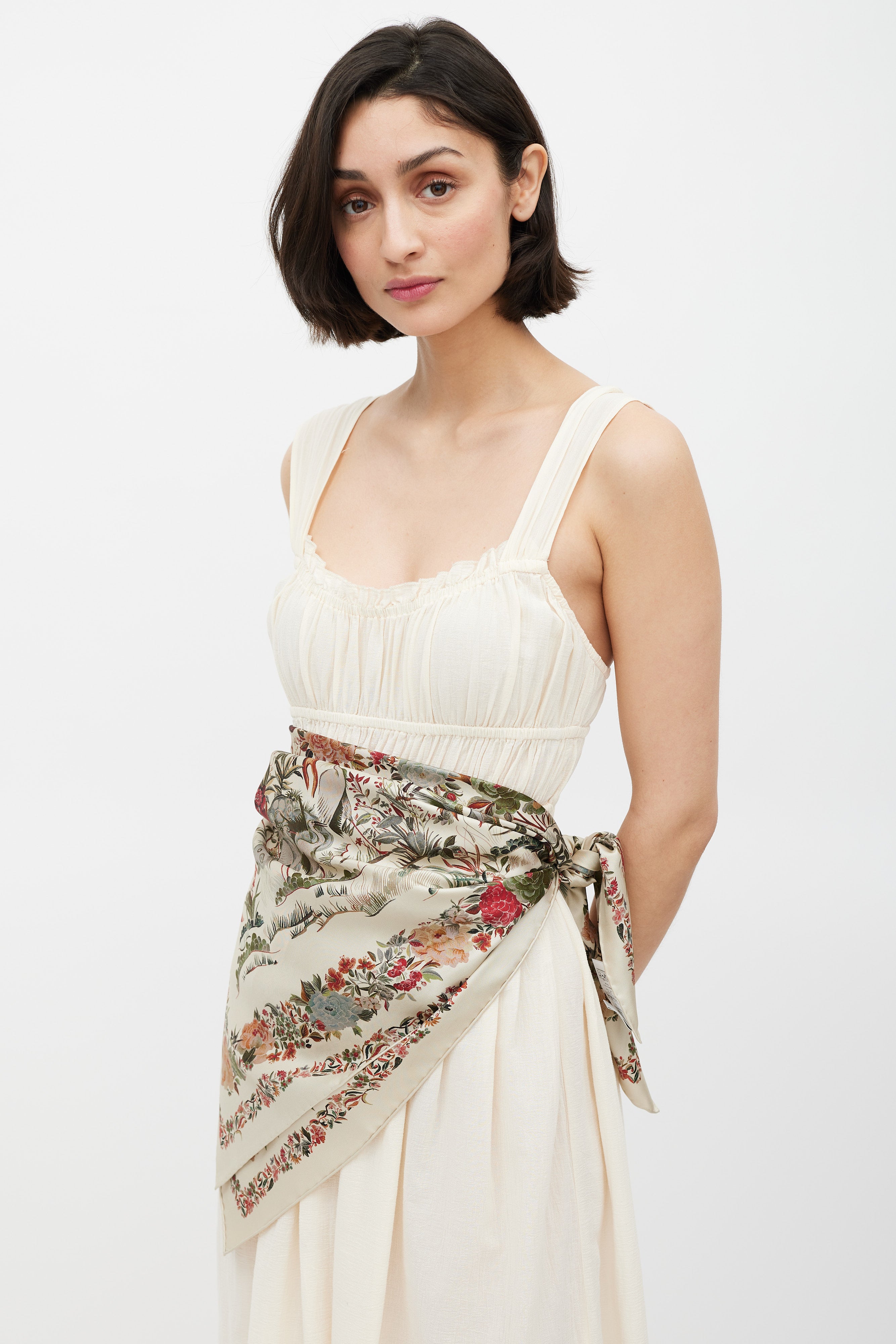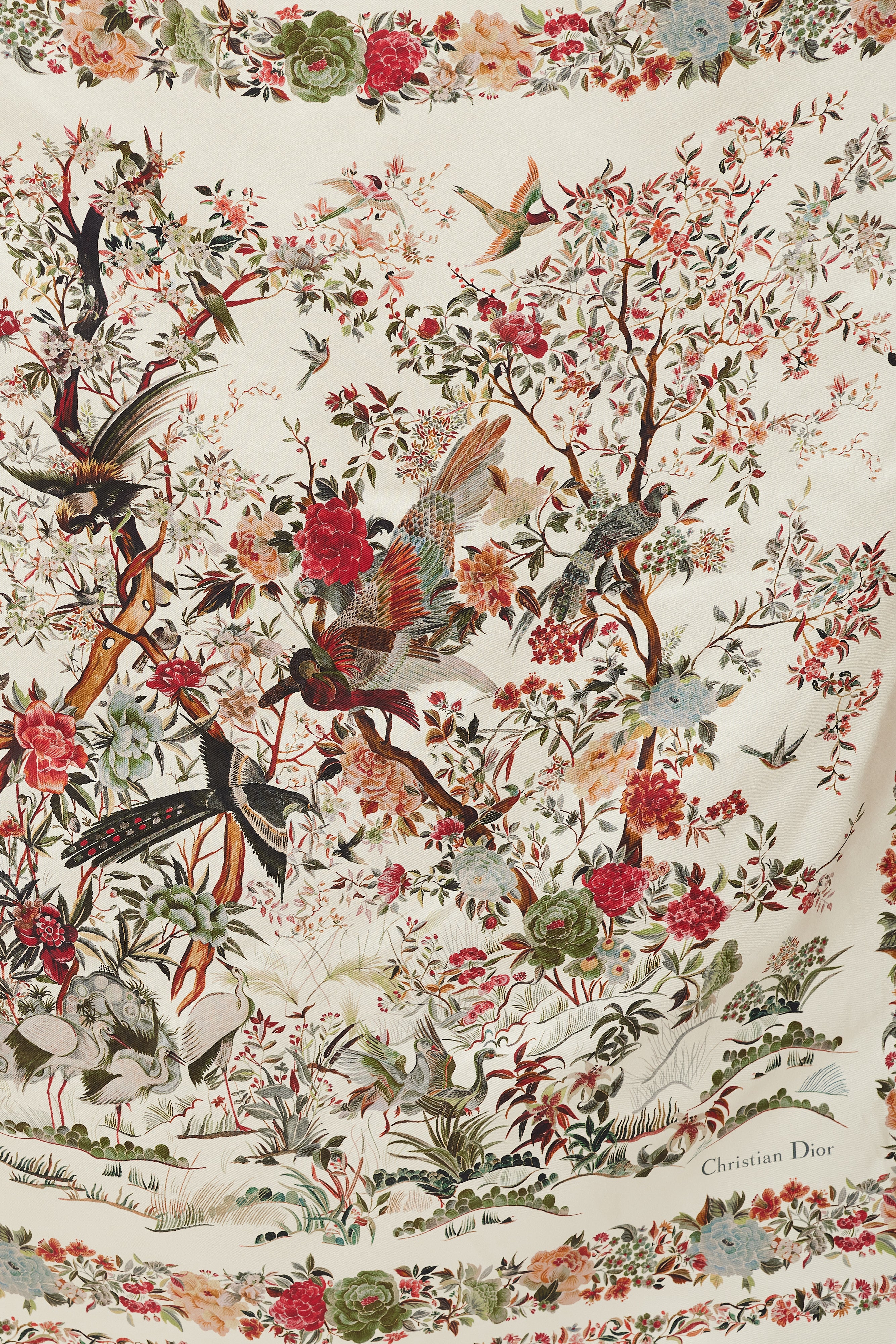 Pre-owned Christian Dior beige scarf featuring a multicolour floral and bird print throughout, logo printed at bottom right corner, and hand rolled trim edges. Comes with original box.