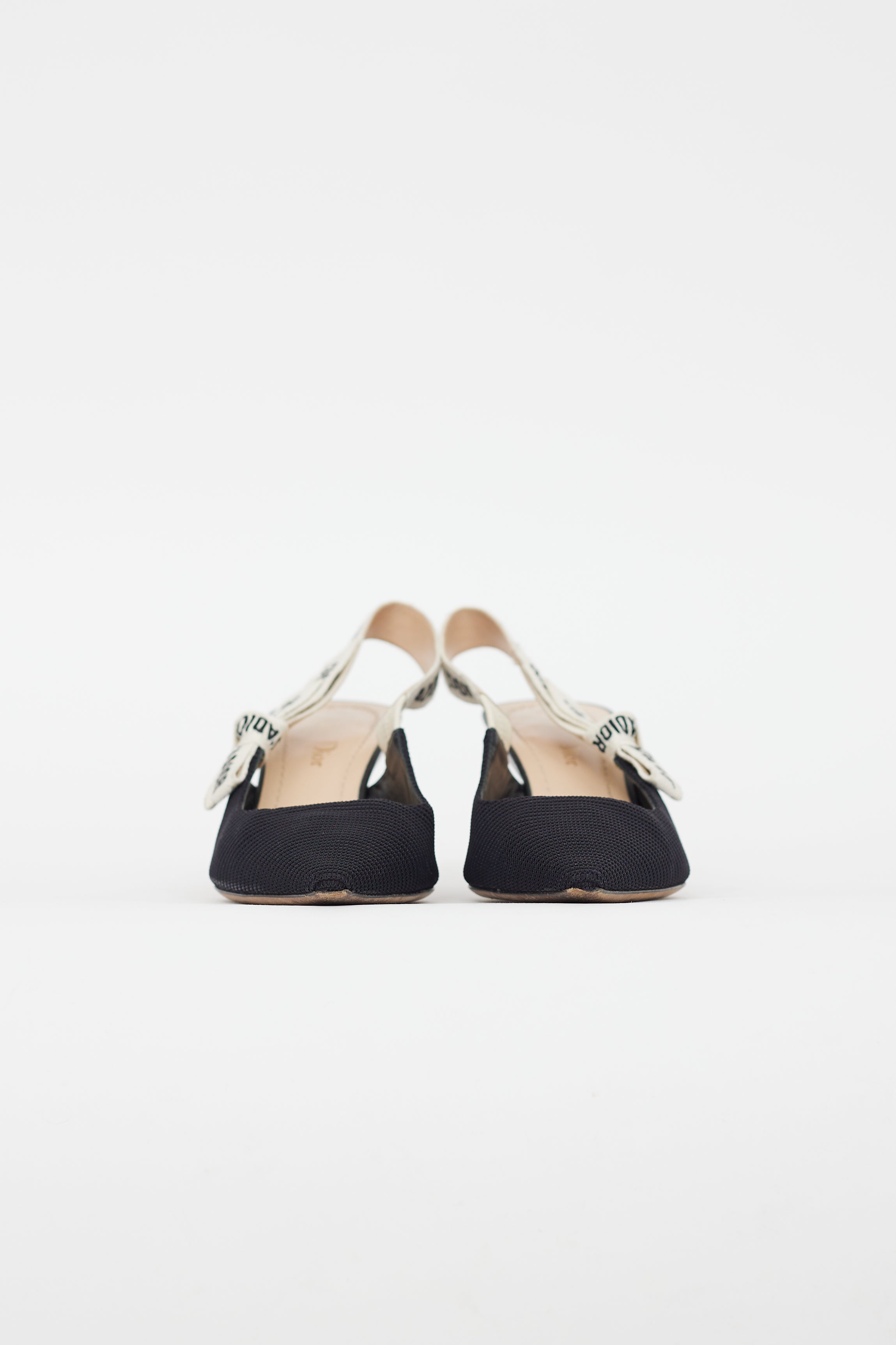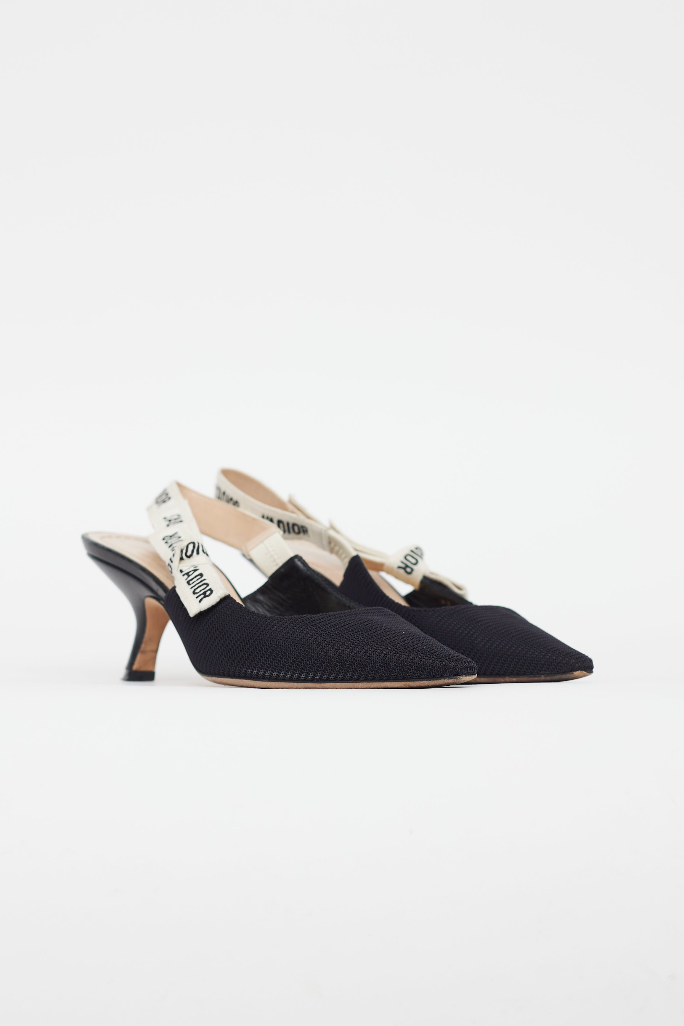 Pre-owned Dior black J'Adior slingback heels featuring flat bow at ankle strap, J'ADIOR two-tone embroidered cotton ribbon, pointed toe, black leather kitten heel, Dior lucky star symbol at outsole, and leather insoles. Comes with original dust bags.