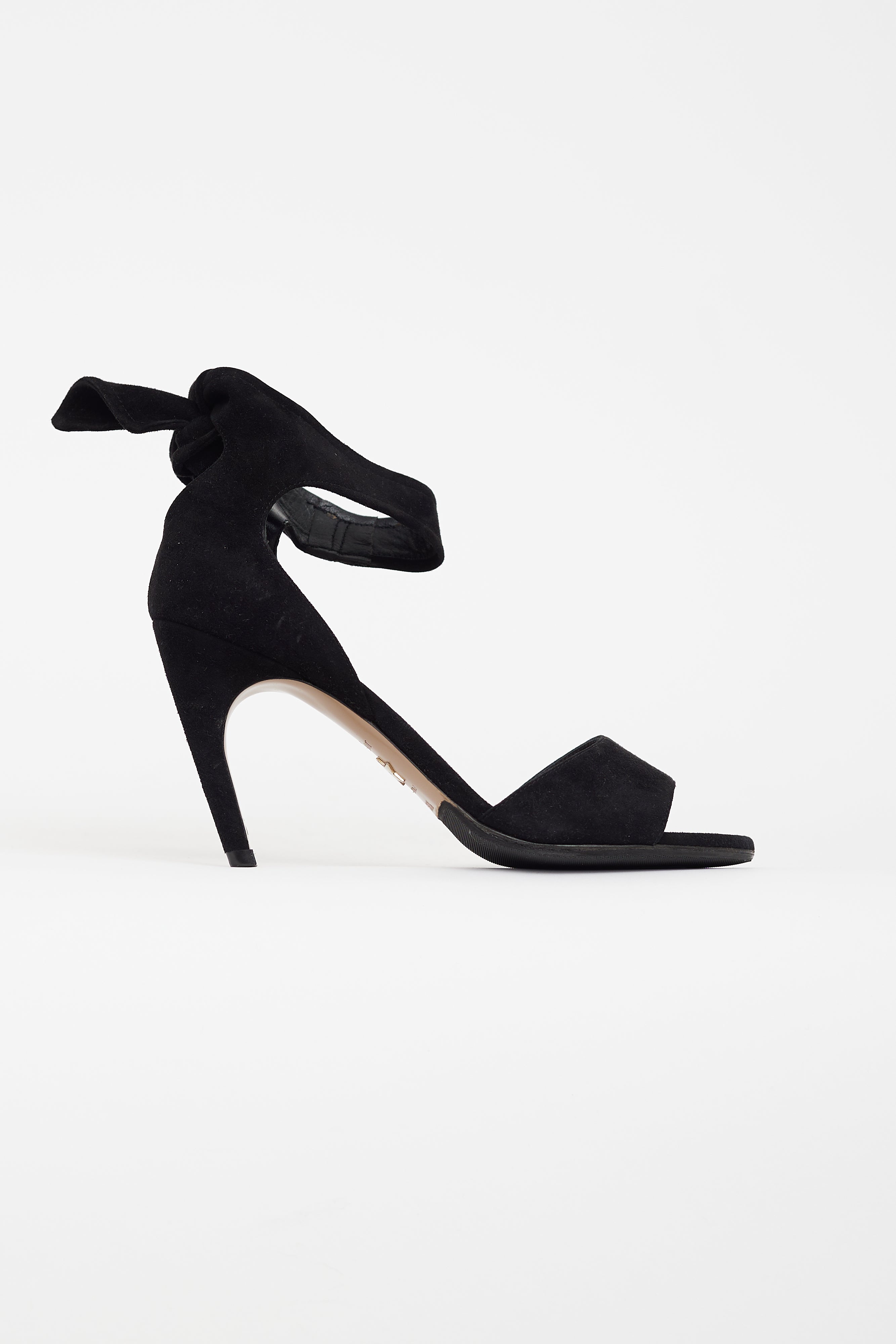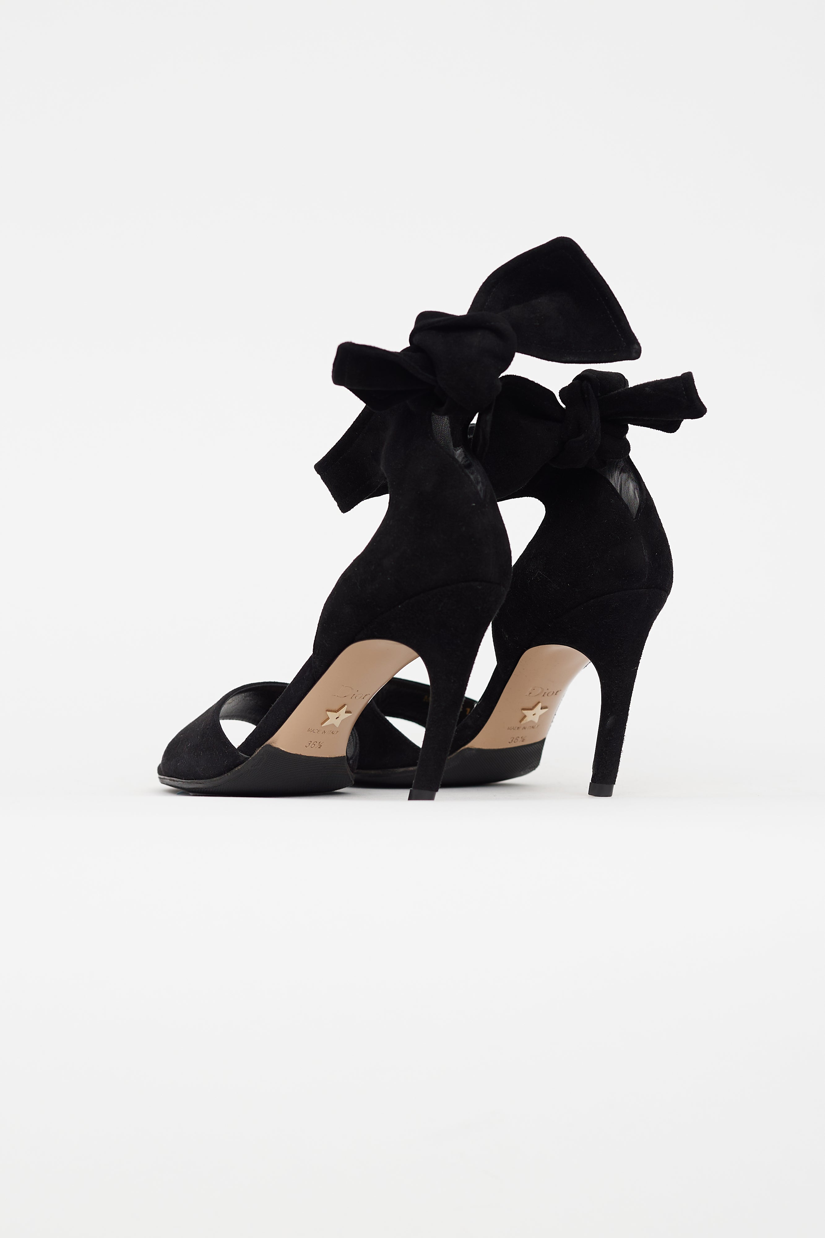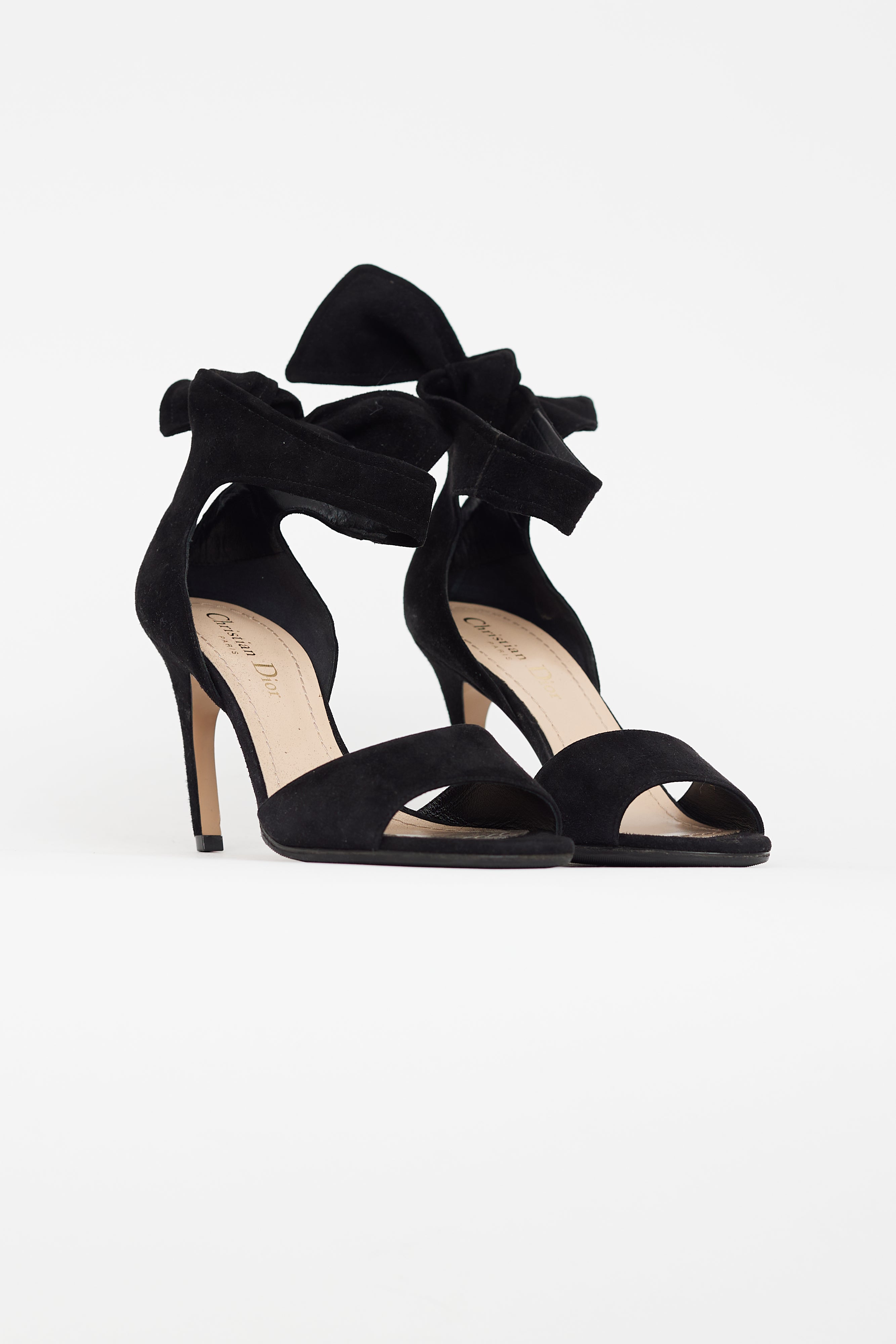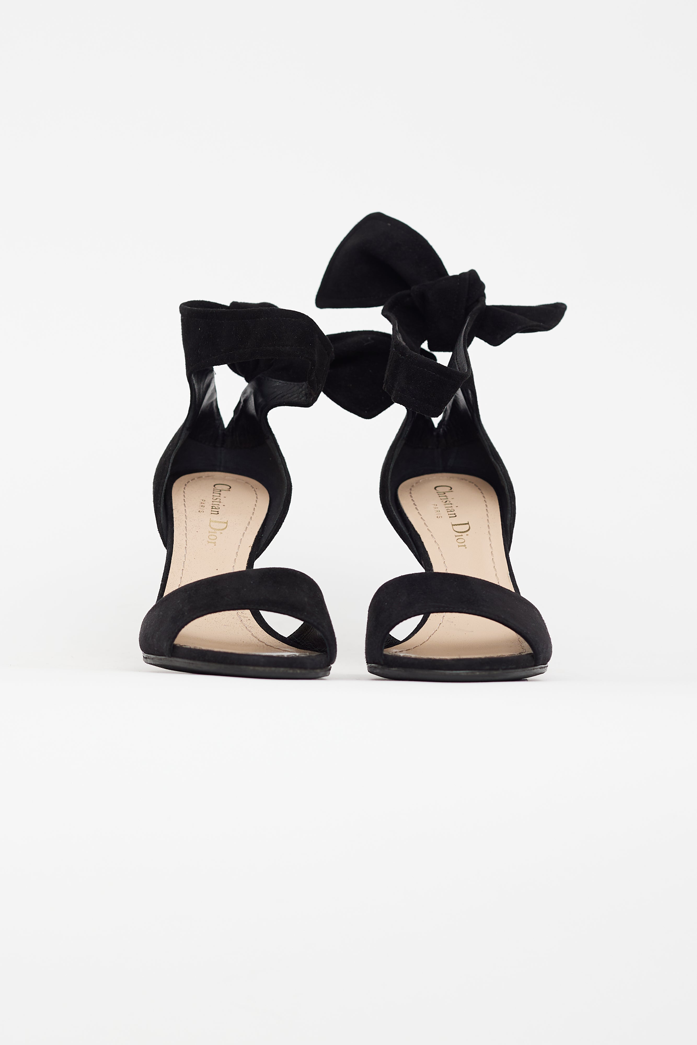 Pre-owned Dior black suede sandals featuring an open round toe, strap at vamp, wrapped horn heel, and tie bow detail at ankle.