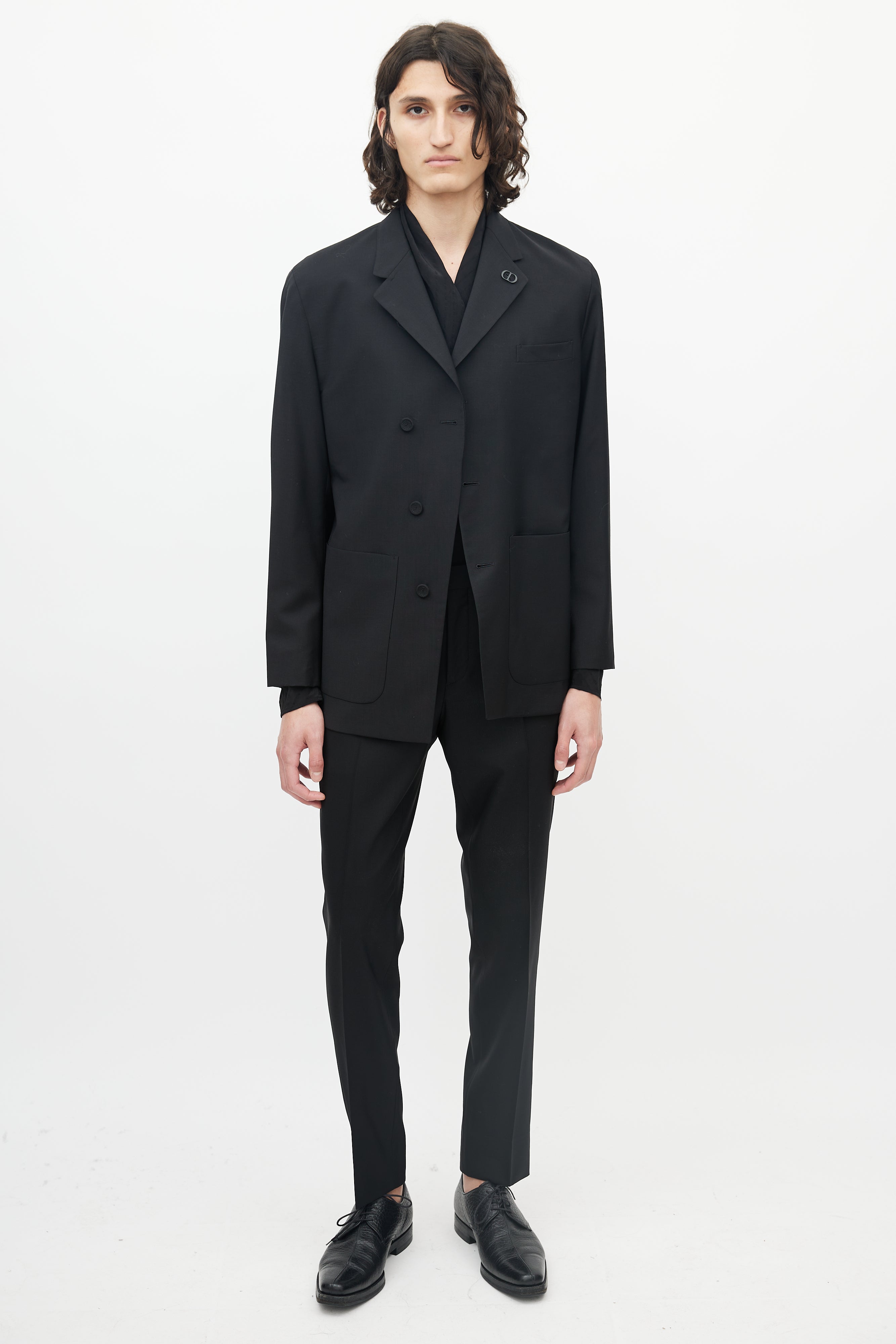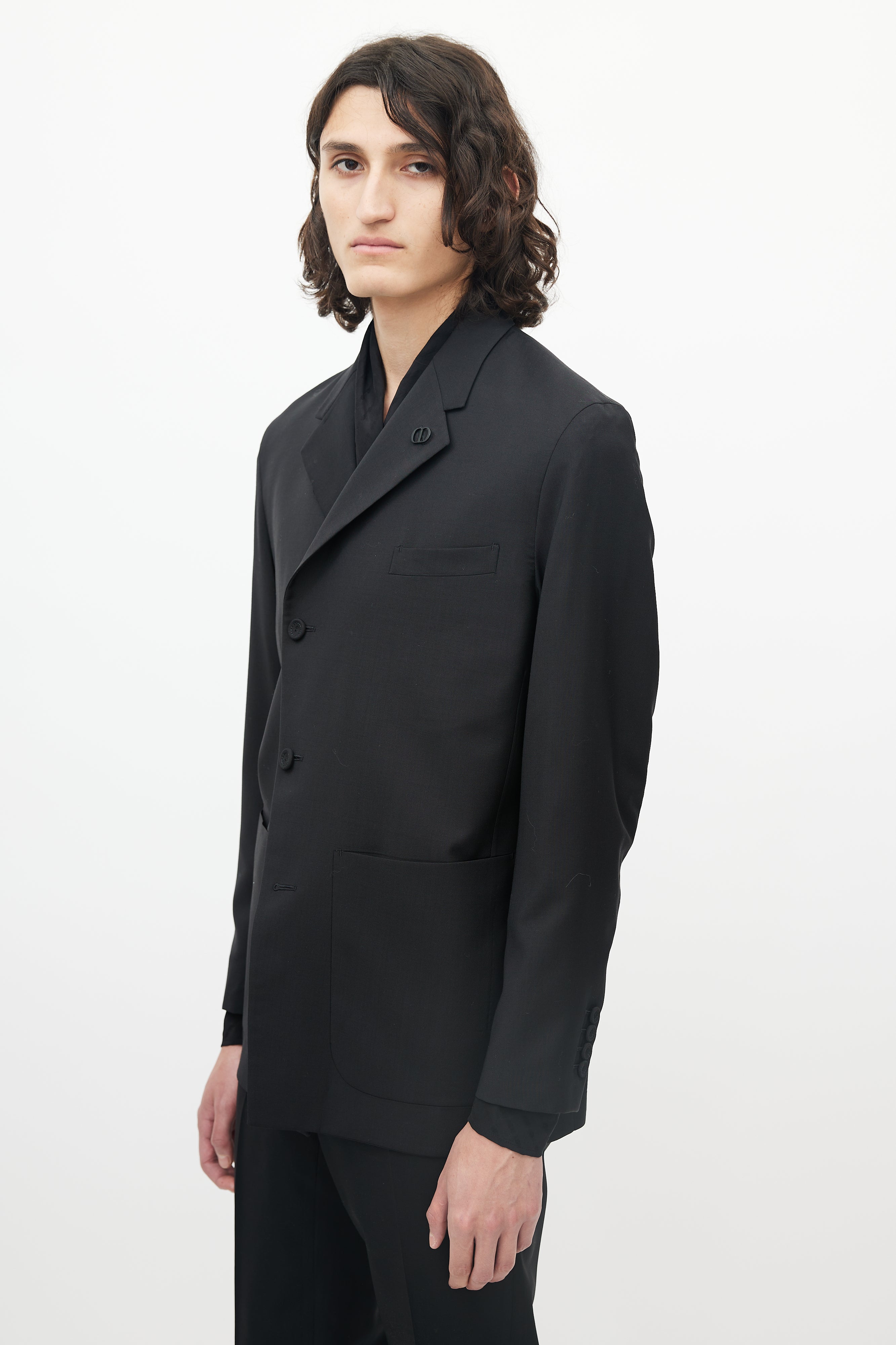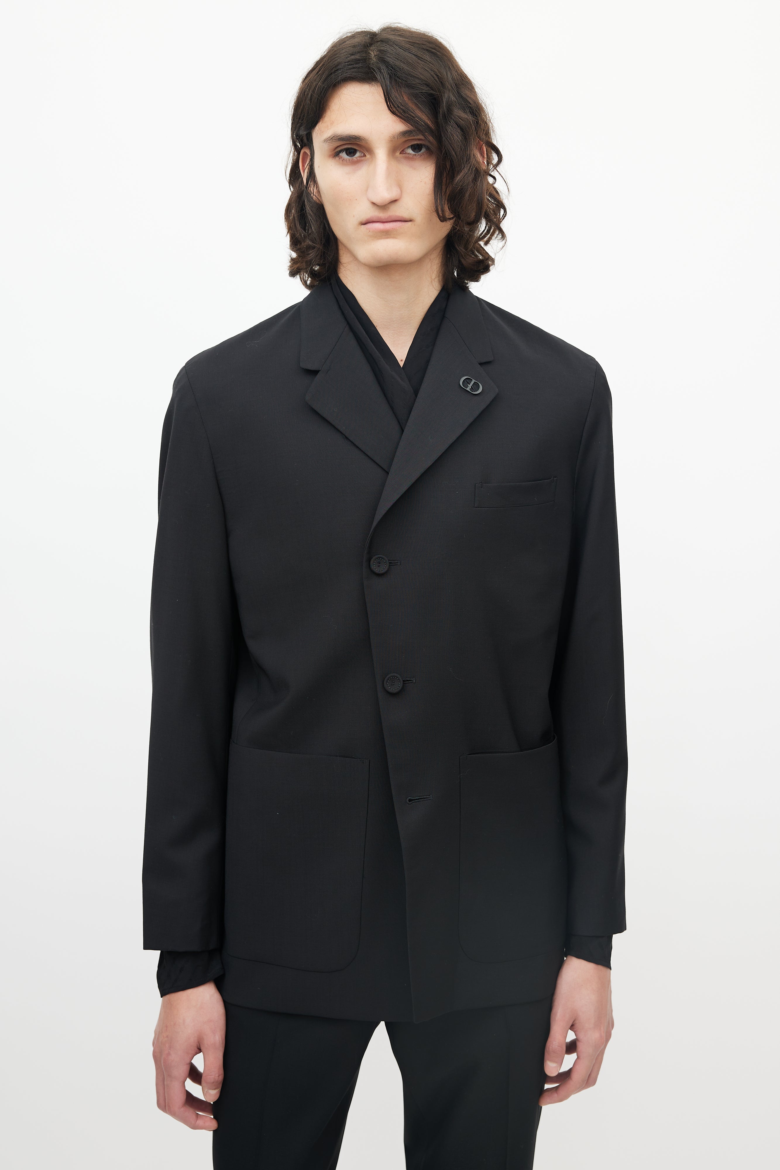 Pre-owned Dior black blazer featuring two patch pockets at waist, slip pocket at left chest, logo button at lapel, three button closure, four button cuffs and vent at back. Lined sleeves.