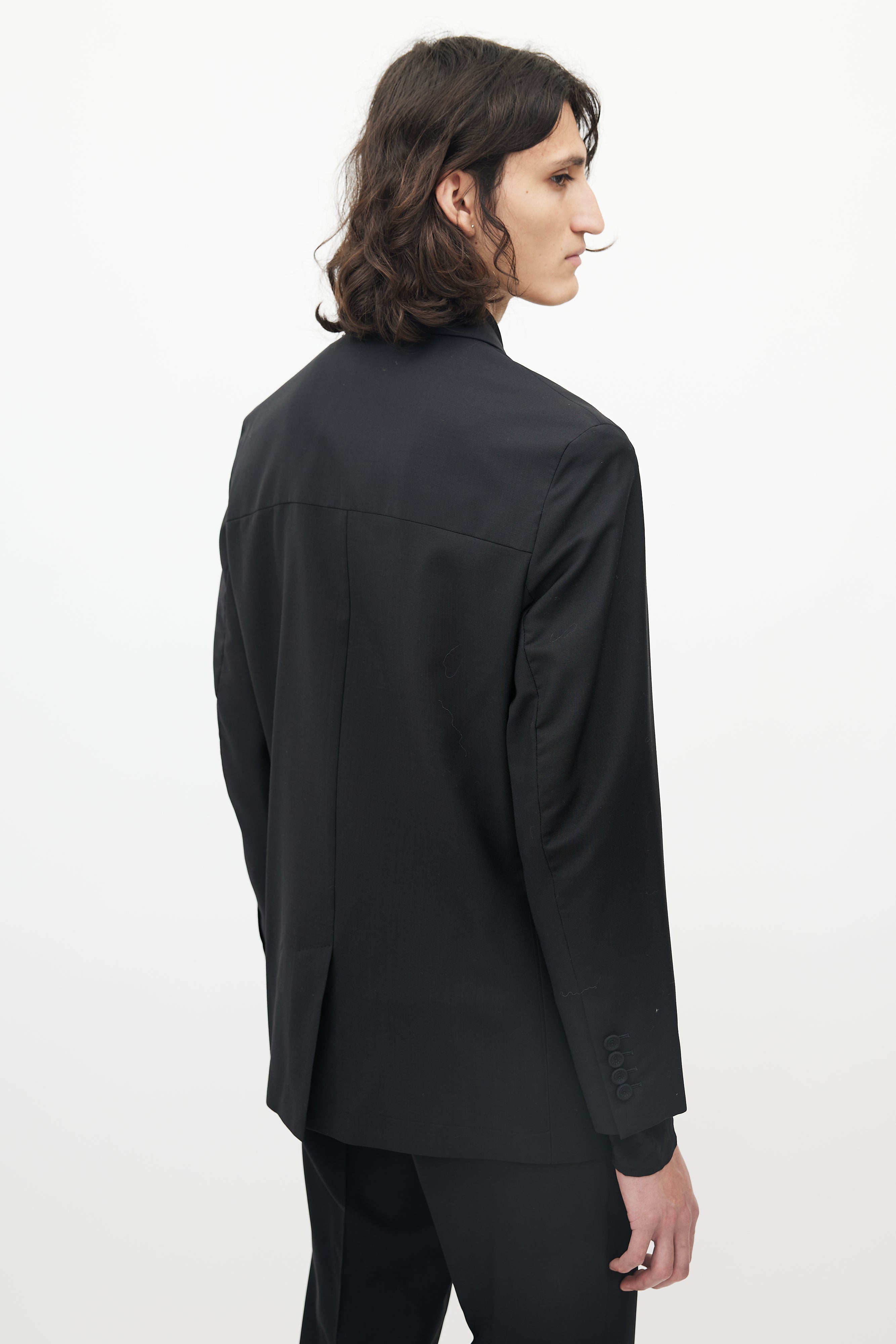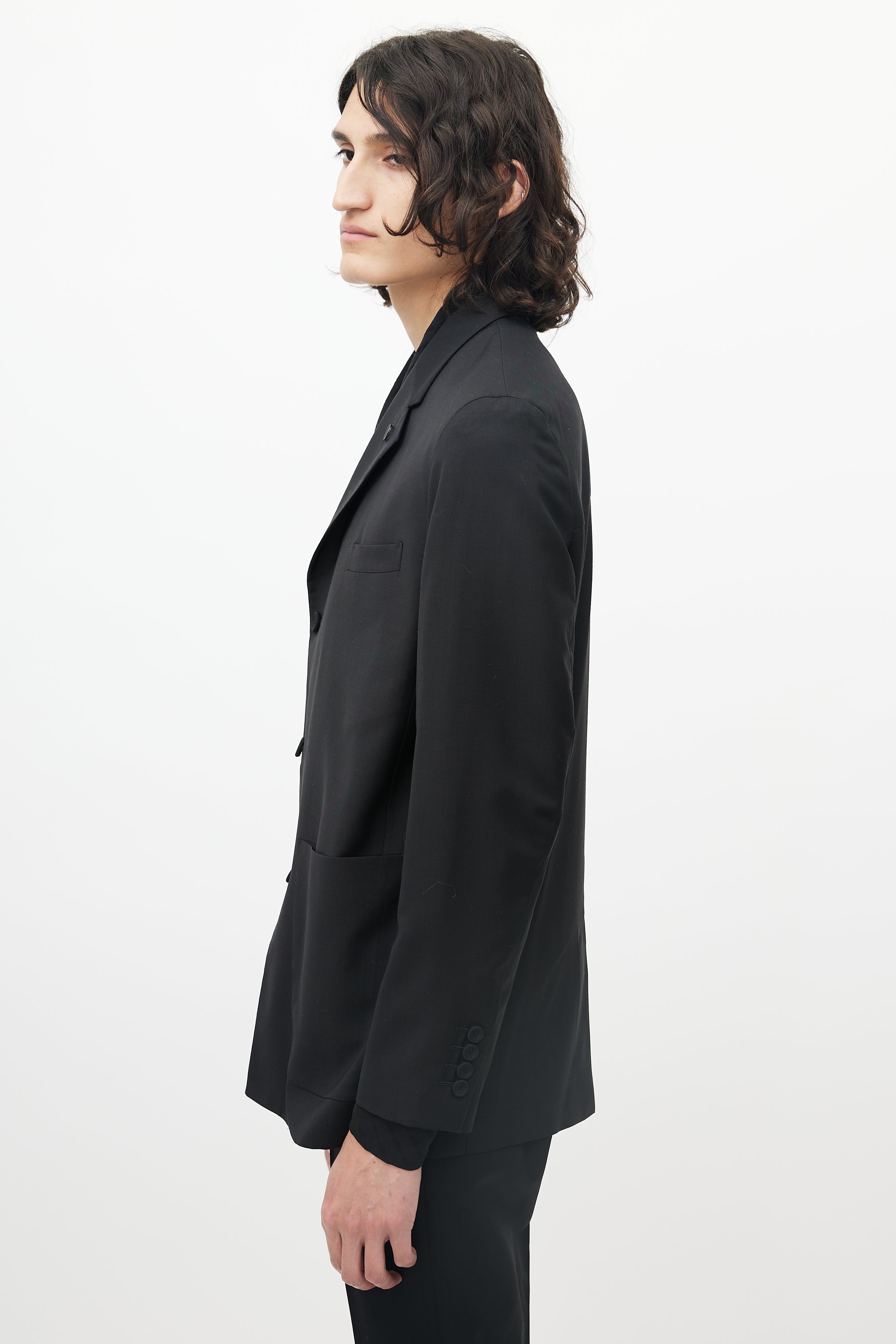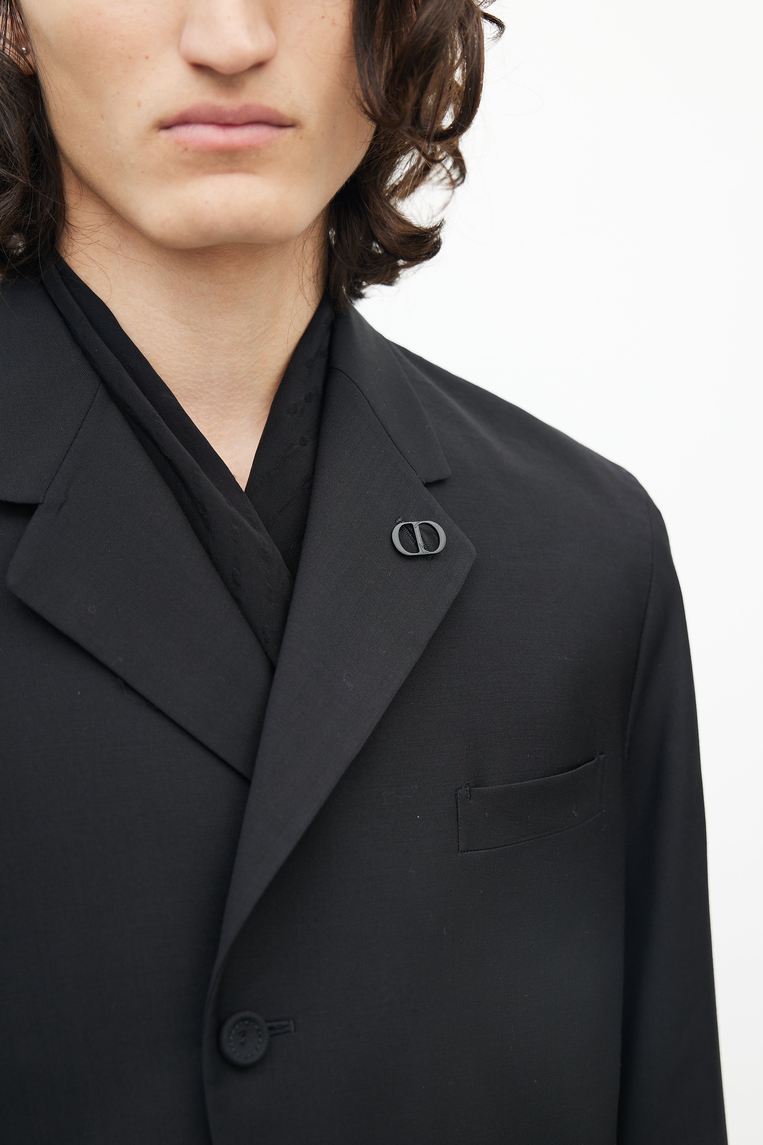 Pre-owned Dior black blazer featuring two patch pockets at waist, slip pocket at left chest, logo button at lapel, three button closure, four button cuffs and vent at back. Lined sleeves.