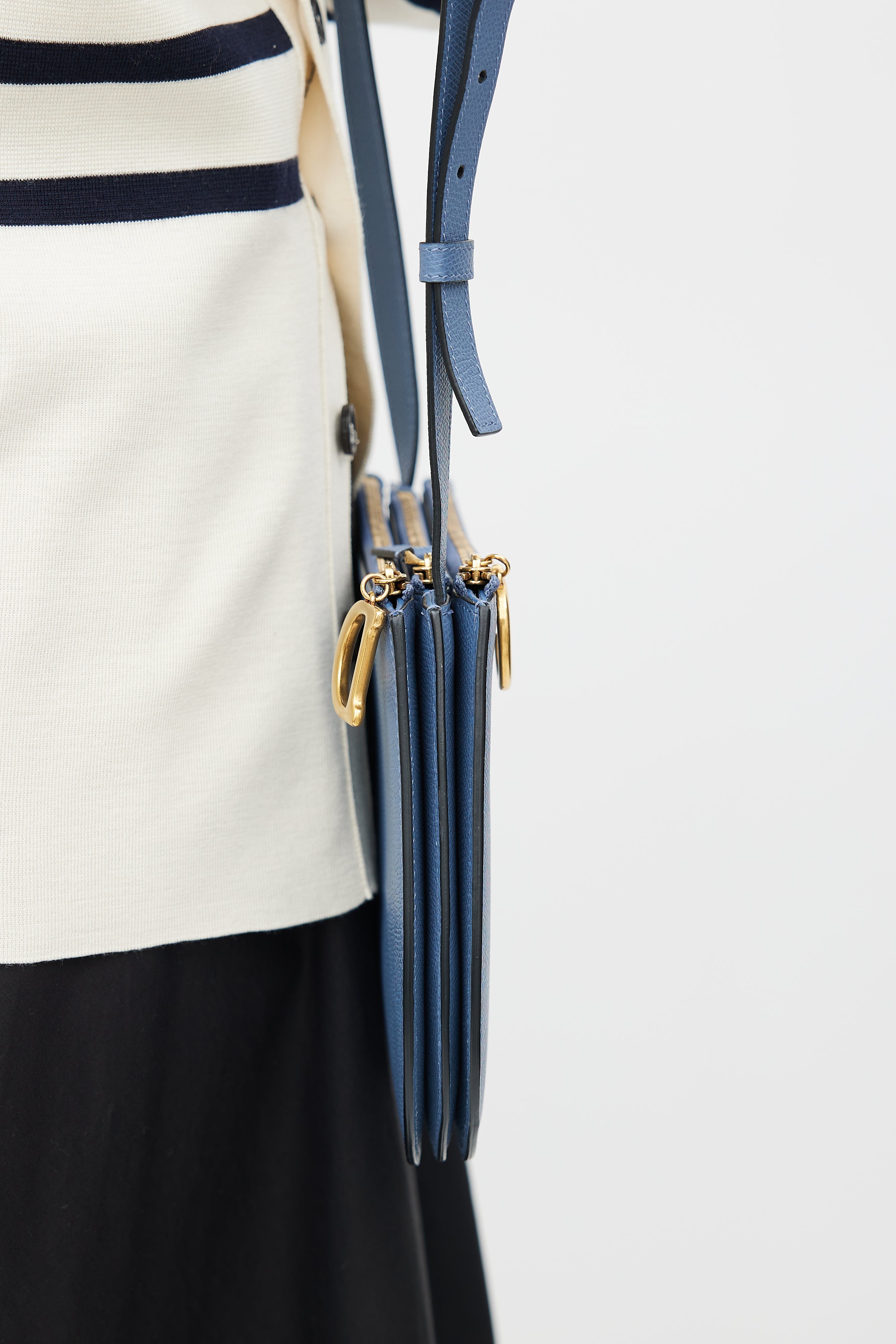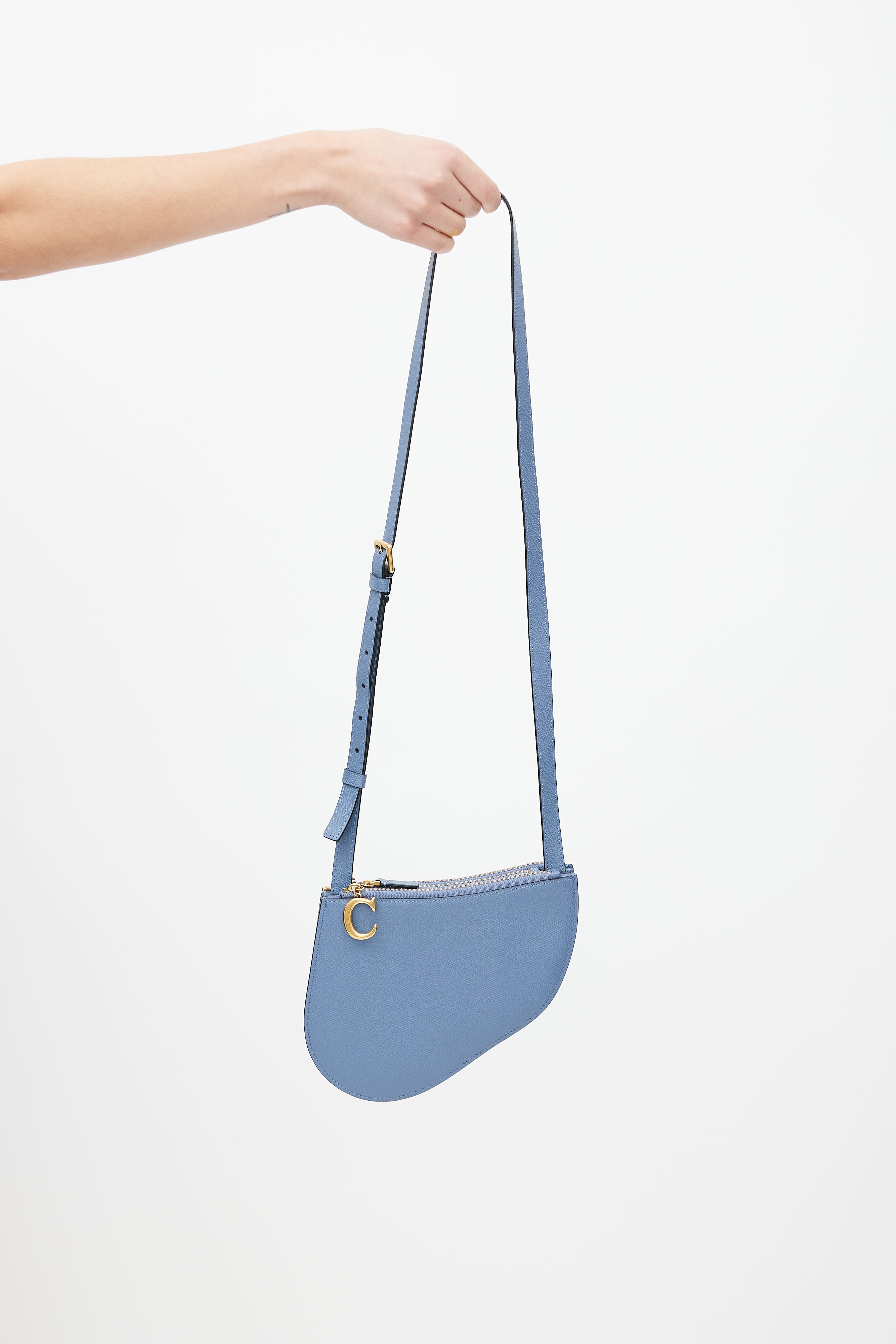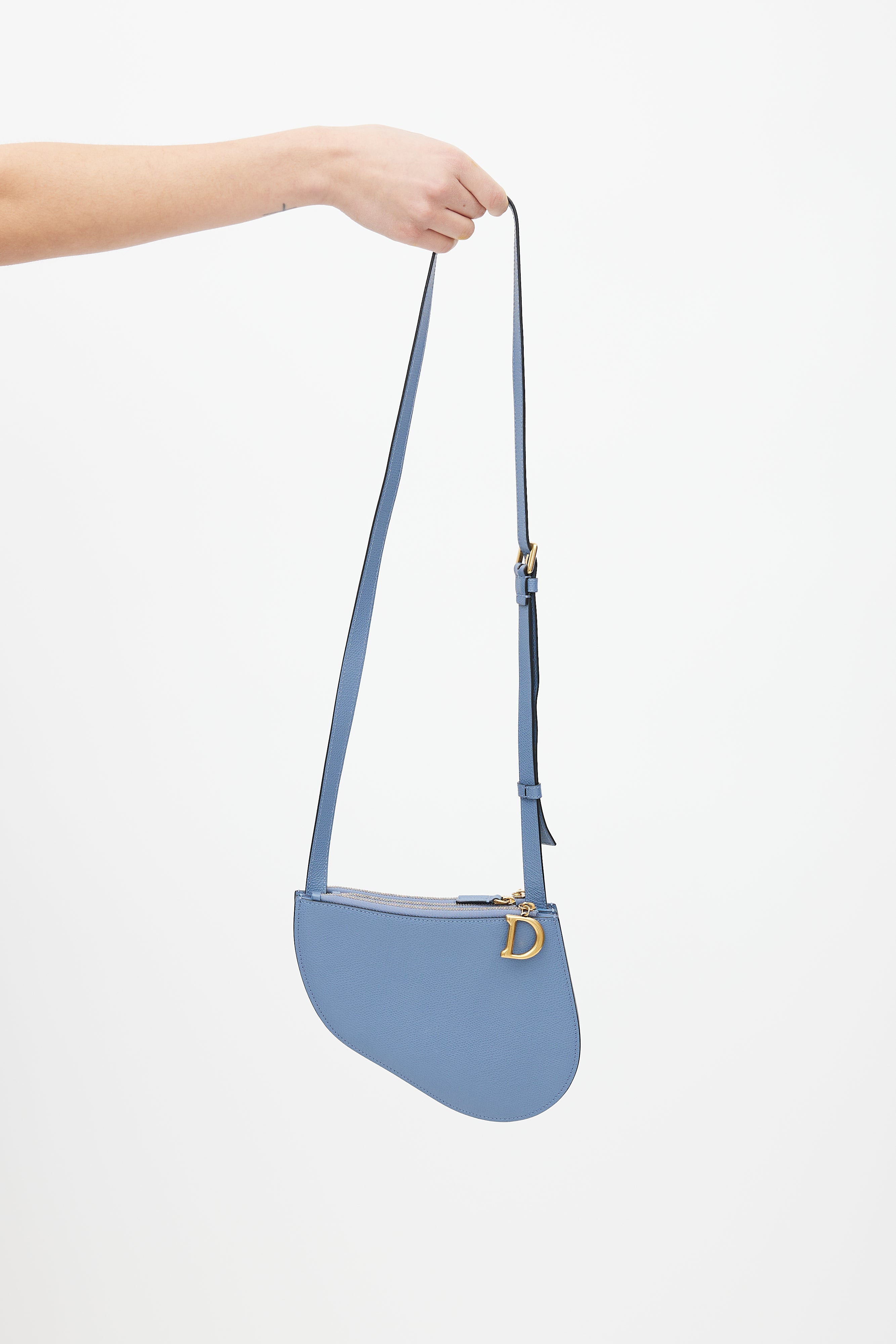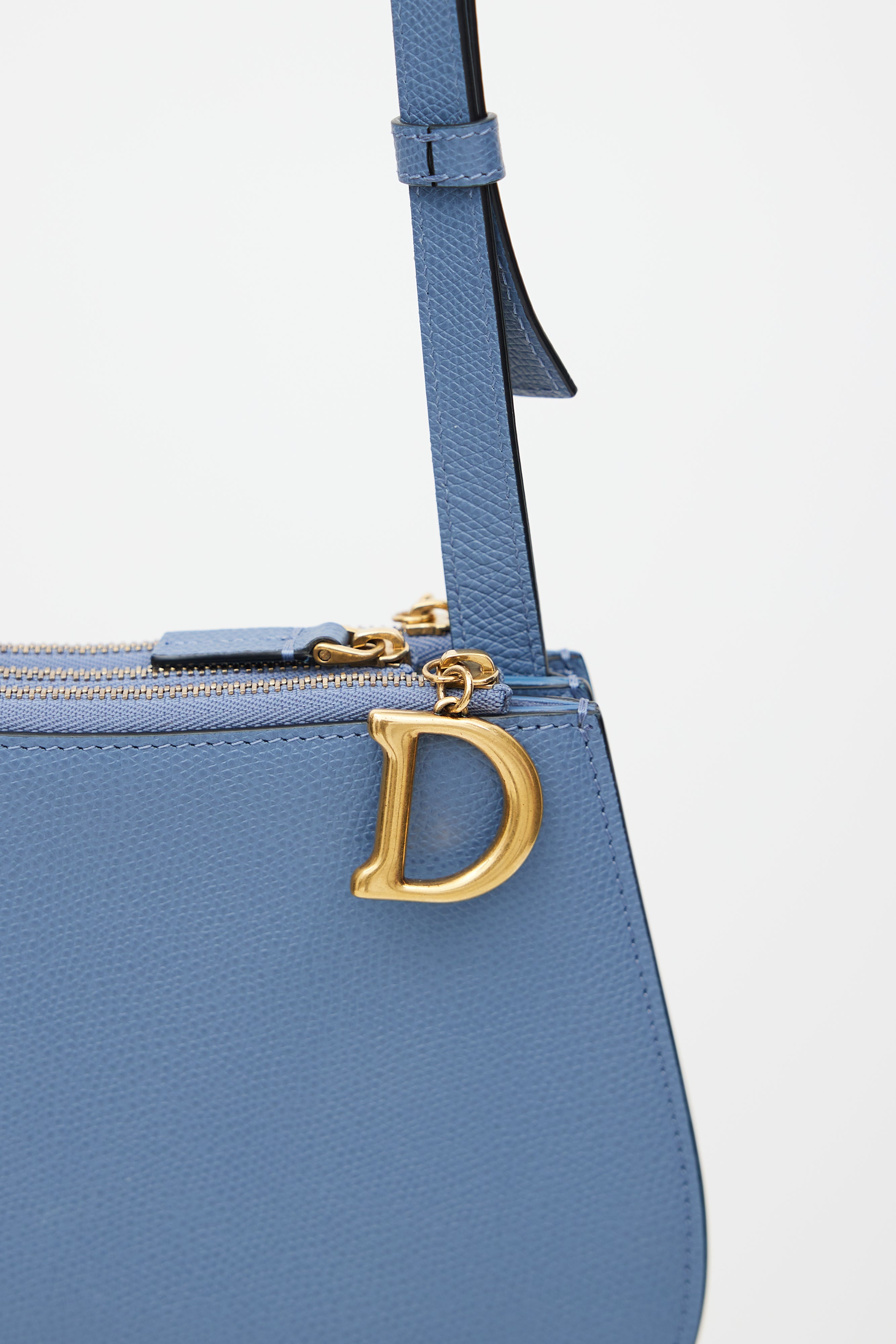 Pre-owned Dior blue Saddle Triple crossbody bag featuring saddle design, three zip compartments, "C" and "D" zipper charm, and adjustable shoulder strap.