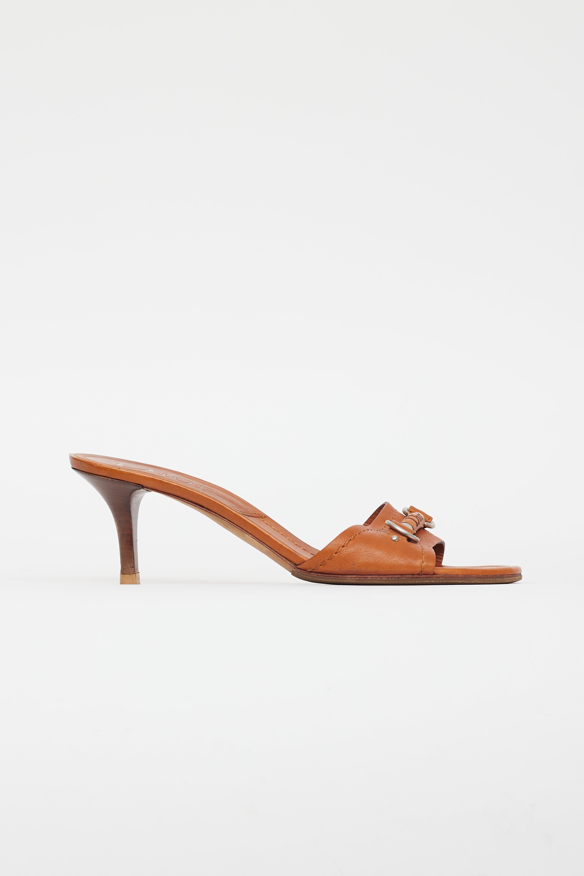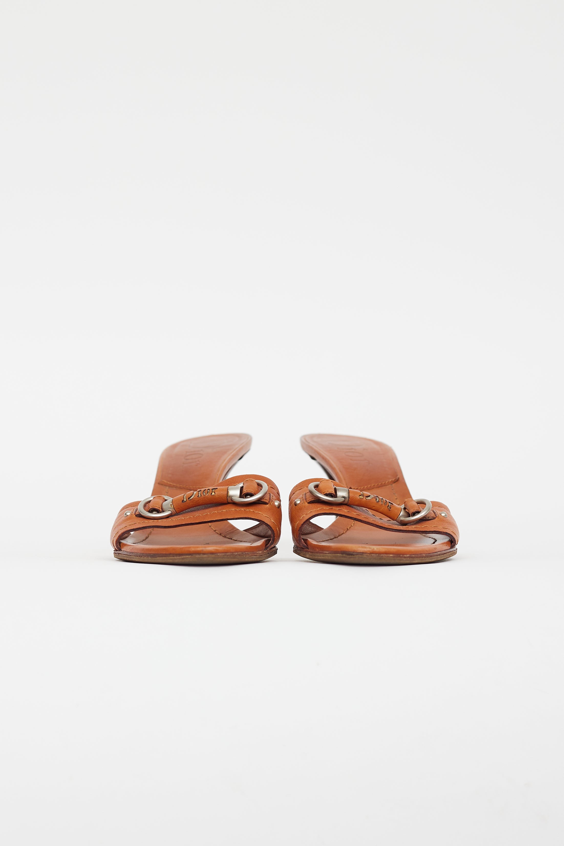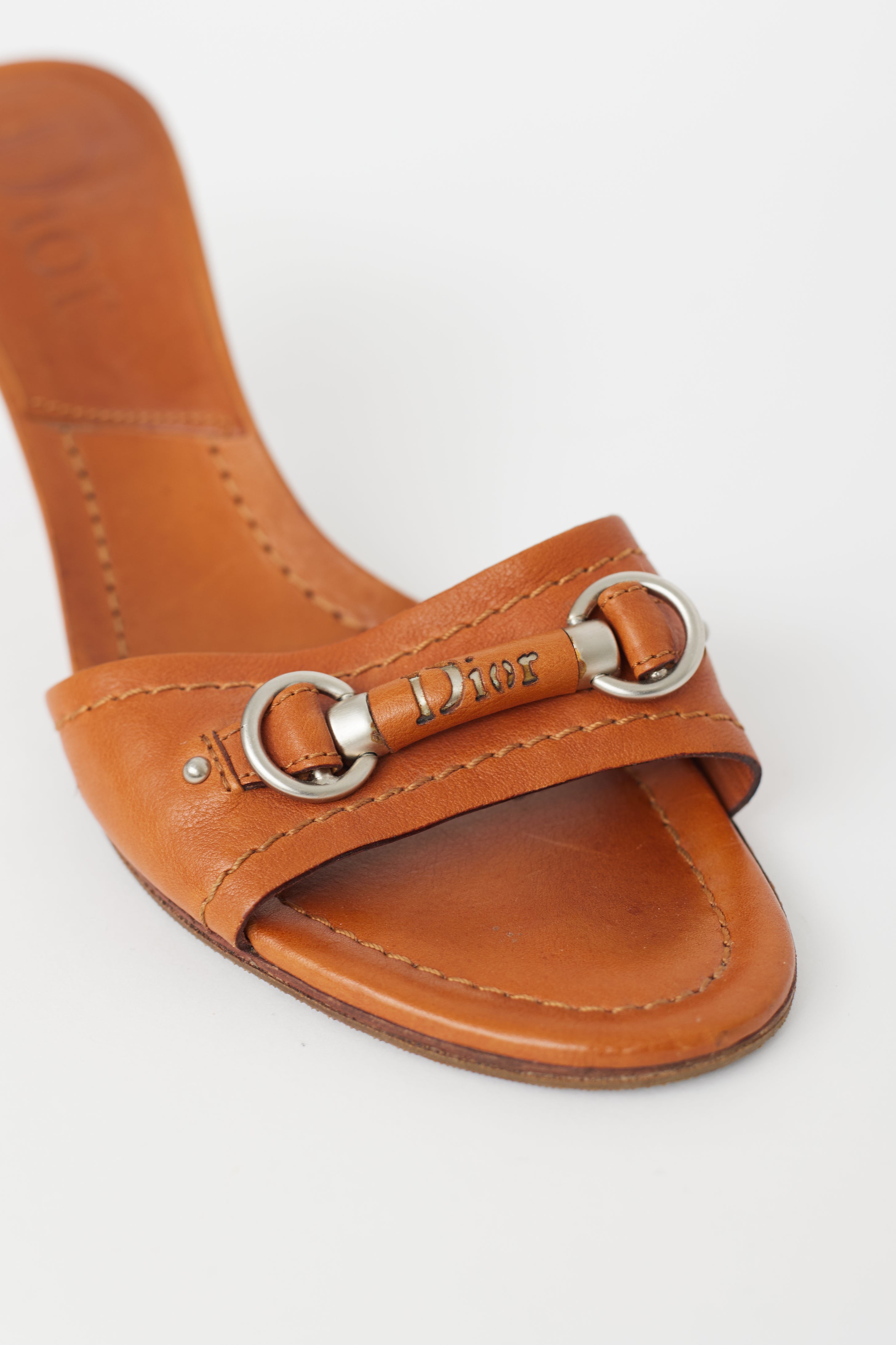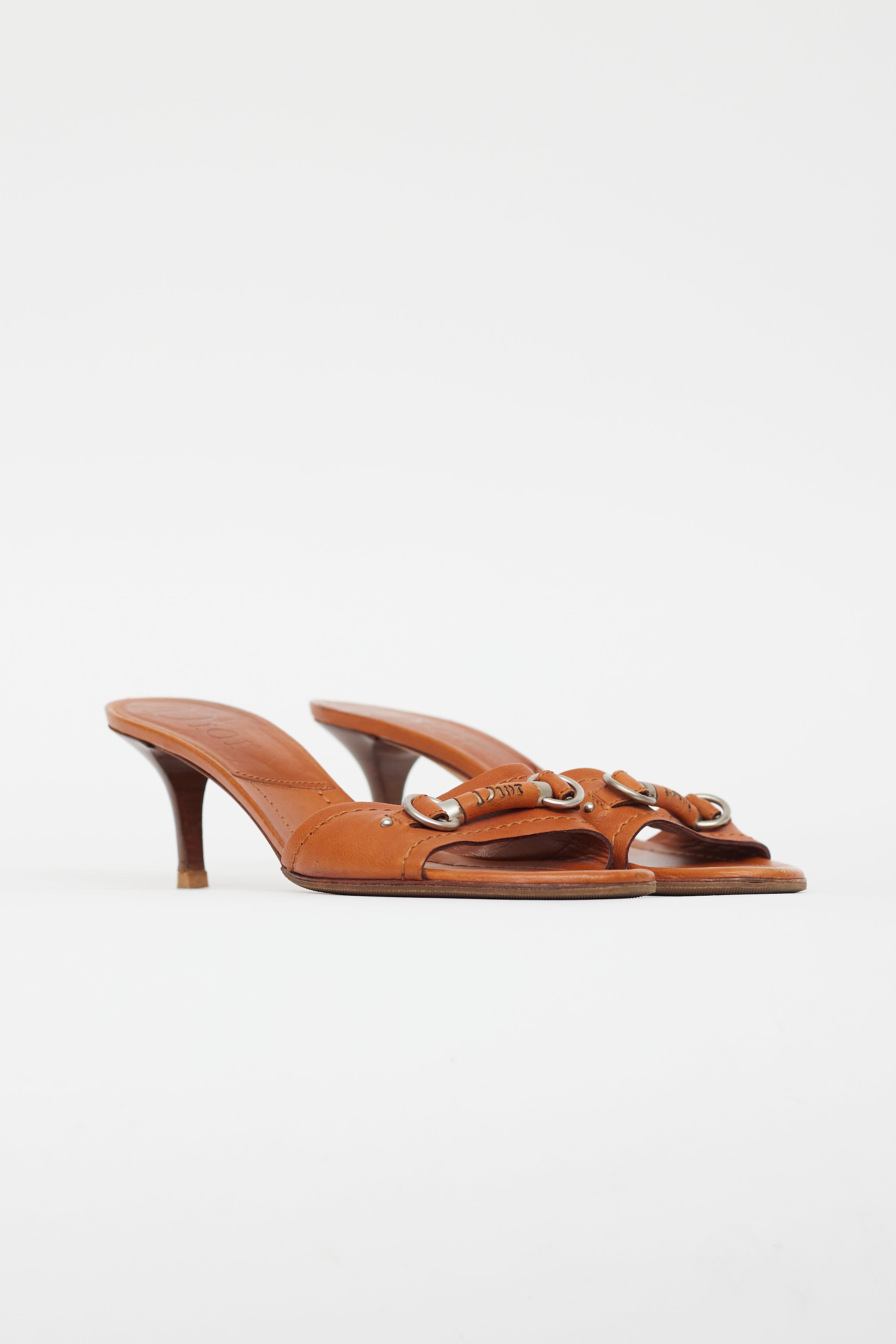 Pre-owned Dior brown leather heeled sandals featuring silver tone hardware, logo horsebit hardware at toe box, round toe, brown wooden stacked slim heel, and leather insoles.