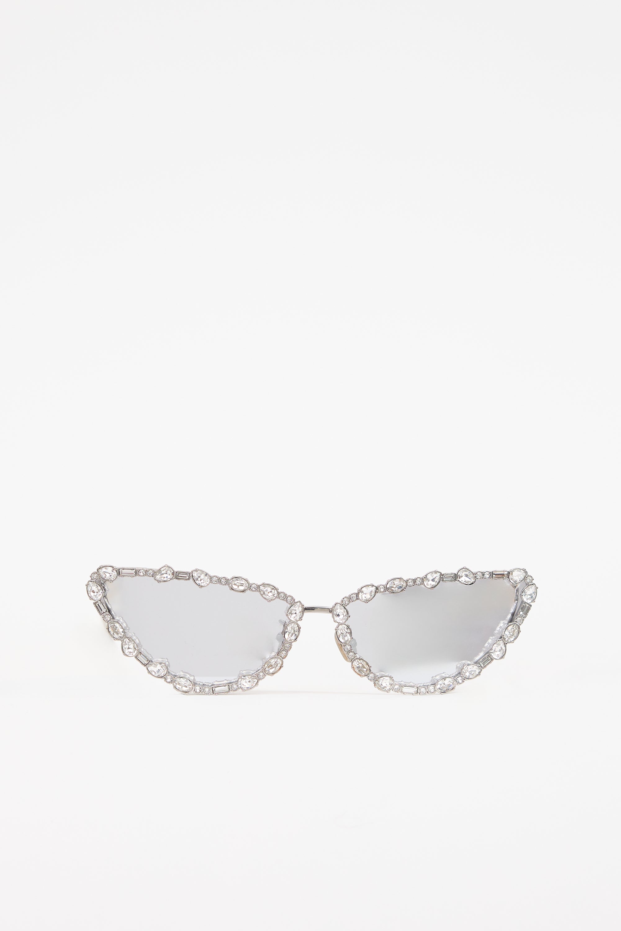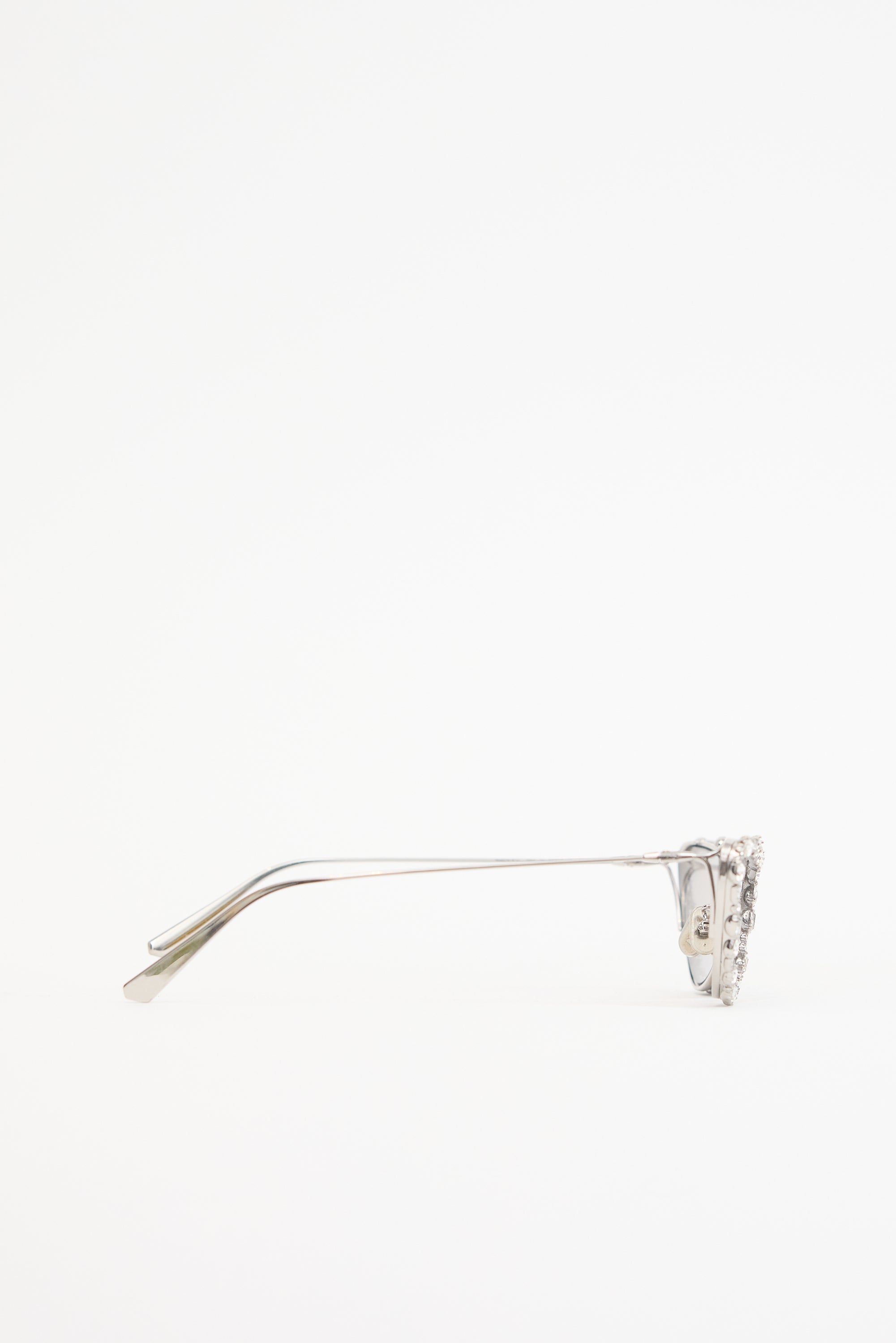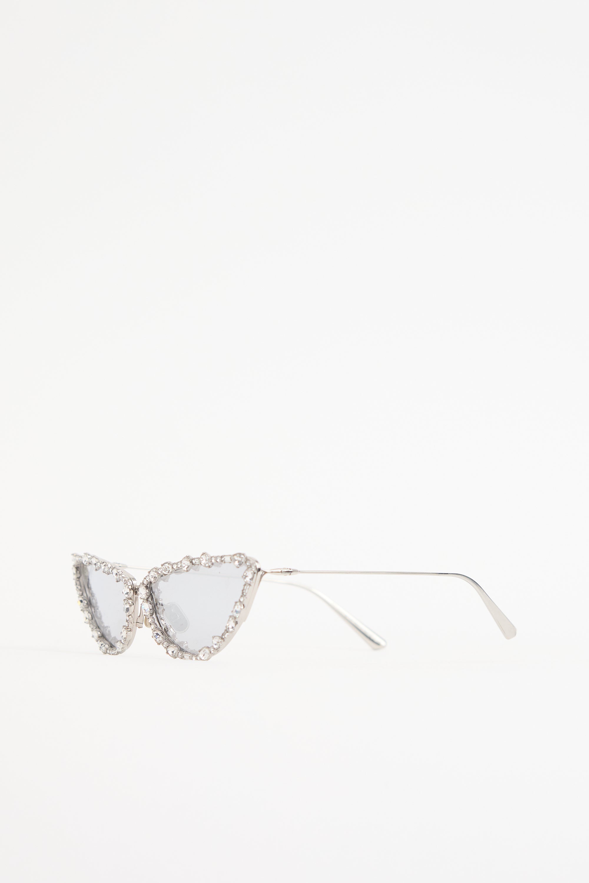 Pre-owned Dior MissDior B1U sunglasses featuring mirrored lens, crystal embellished silver metal cat eye frame, and nose pads. Comes with original case and box.