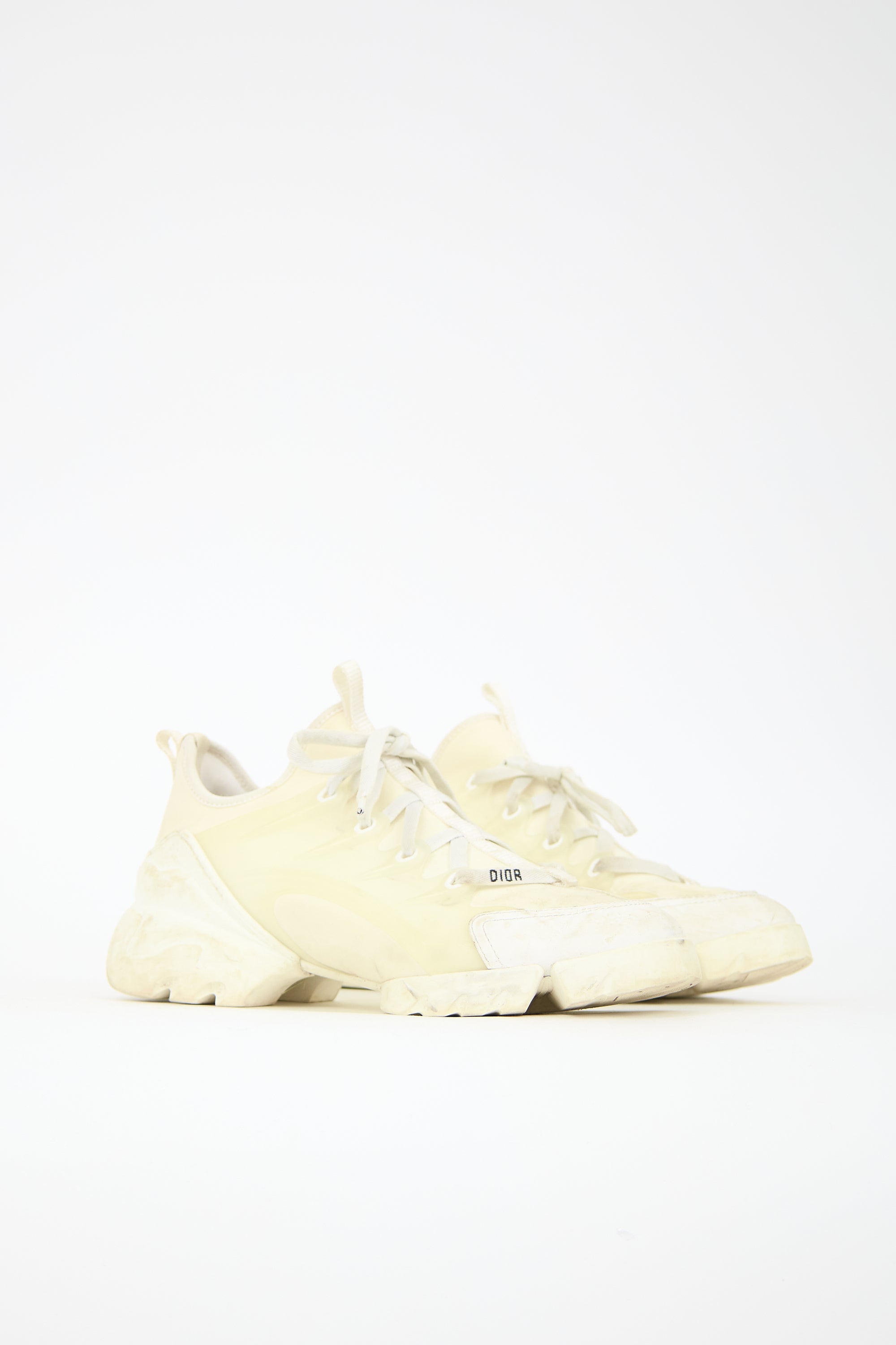 Pre-owned Dior cream D-Connect sneakers featuring rounded toe, lace up vamp with embroidered logo, rubber panels, pull tabs at front and back collar, embossed logo at heel, and tonal rubber split sole.