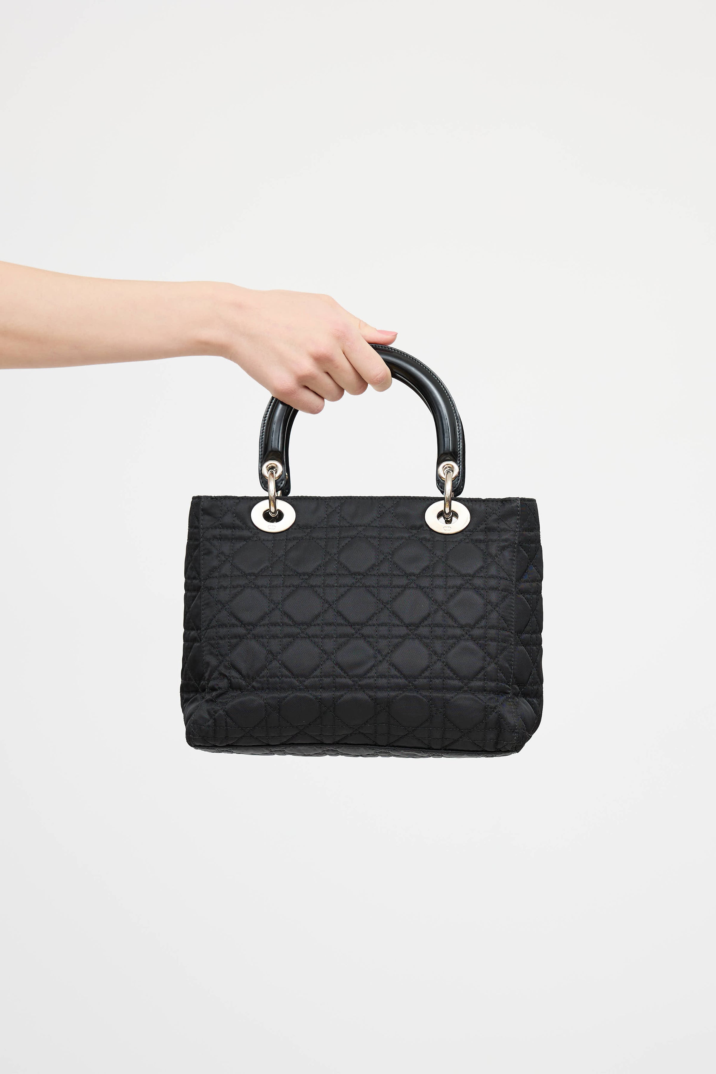 Pre-owned Dior black Lady Dior bag in Cannage quilted nylon featuring two flat top handles, silver tone logo charm at front, one main compartment with one zip pocket, and top zip closure.