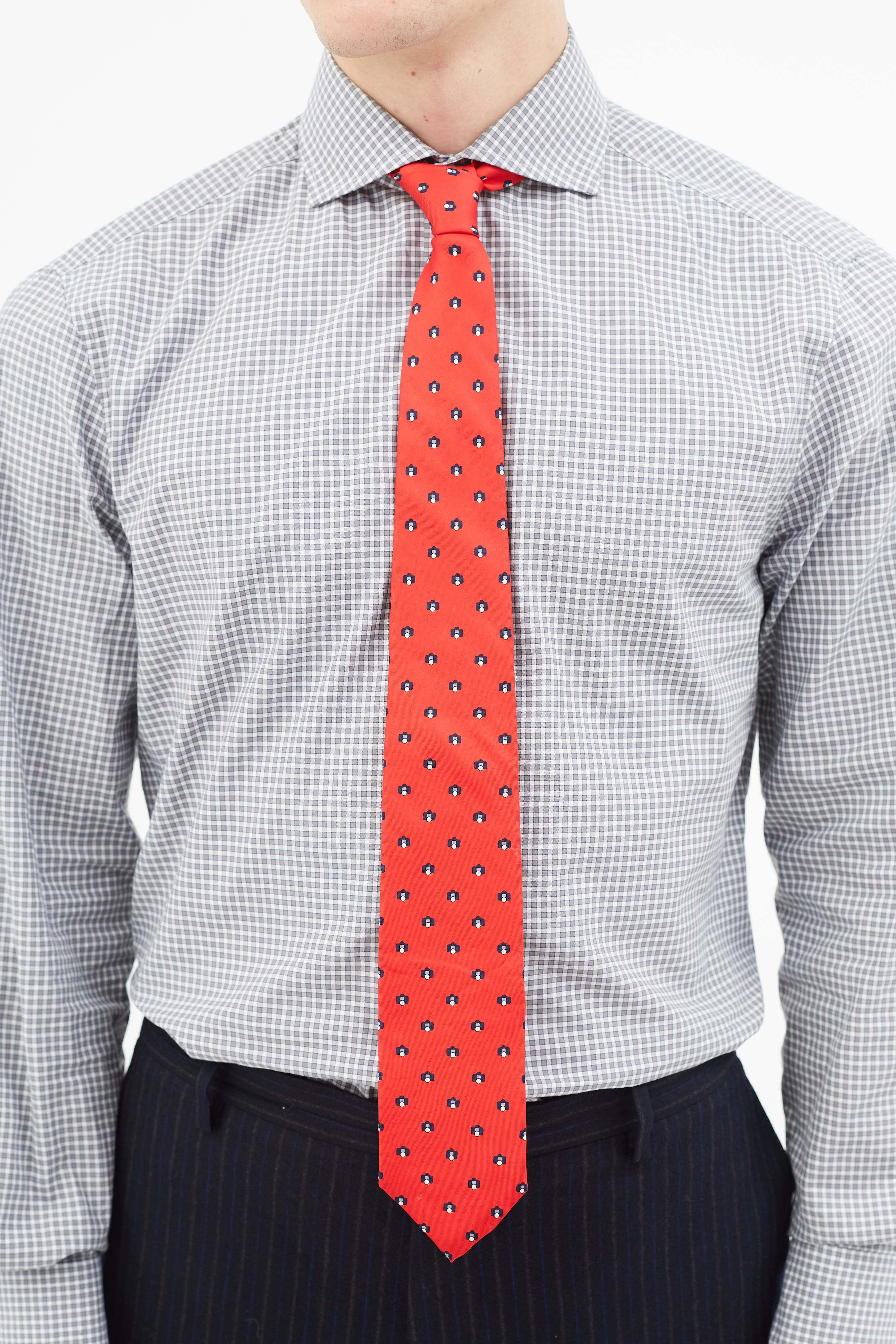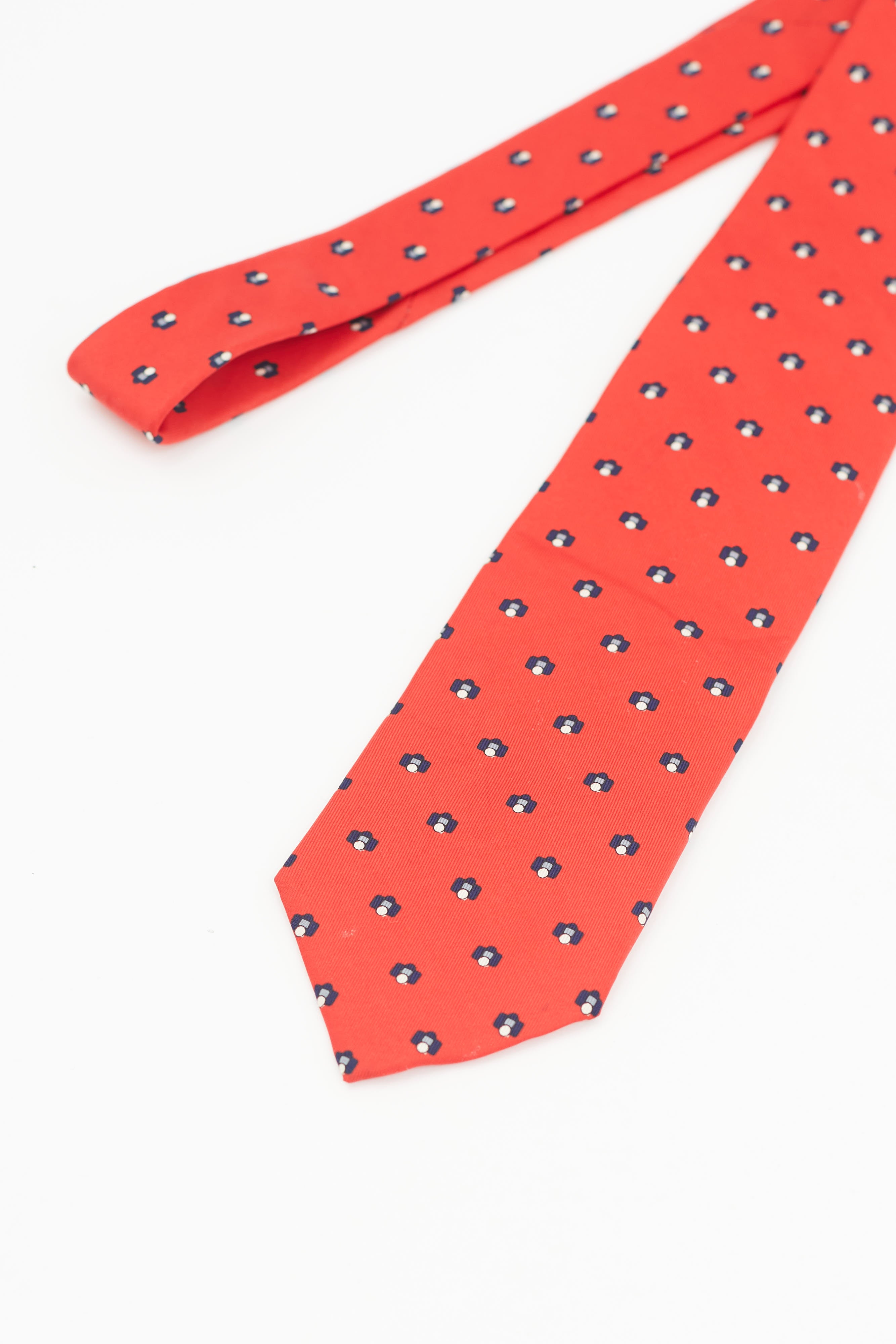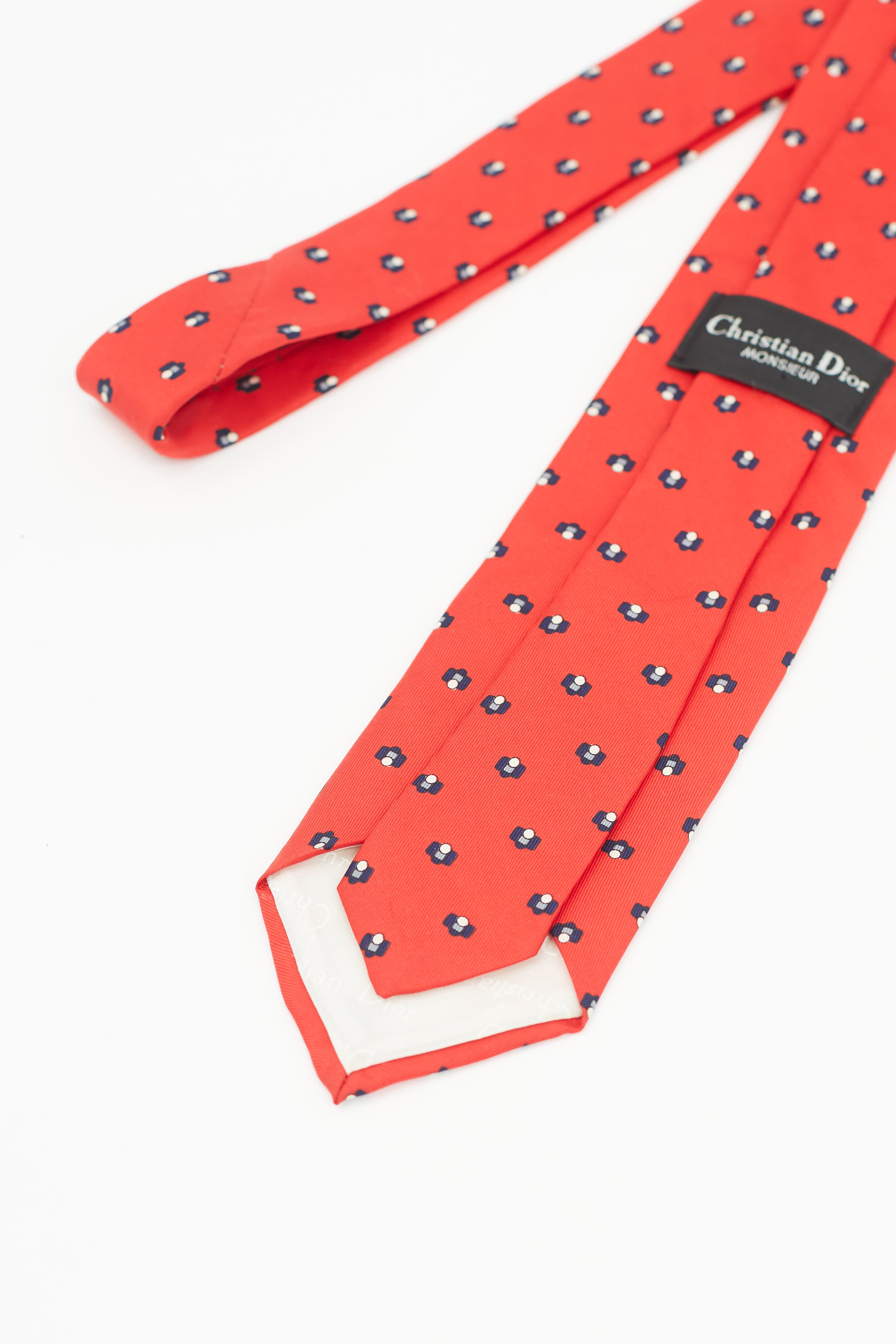 Pre-owned Christian Dior red tie featuring navy geometric print and logo tab at reverse.