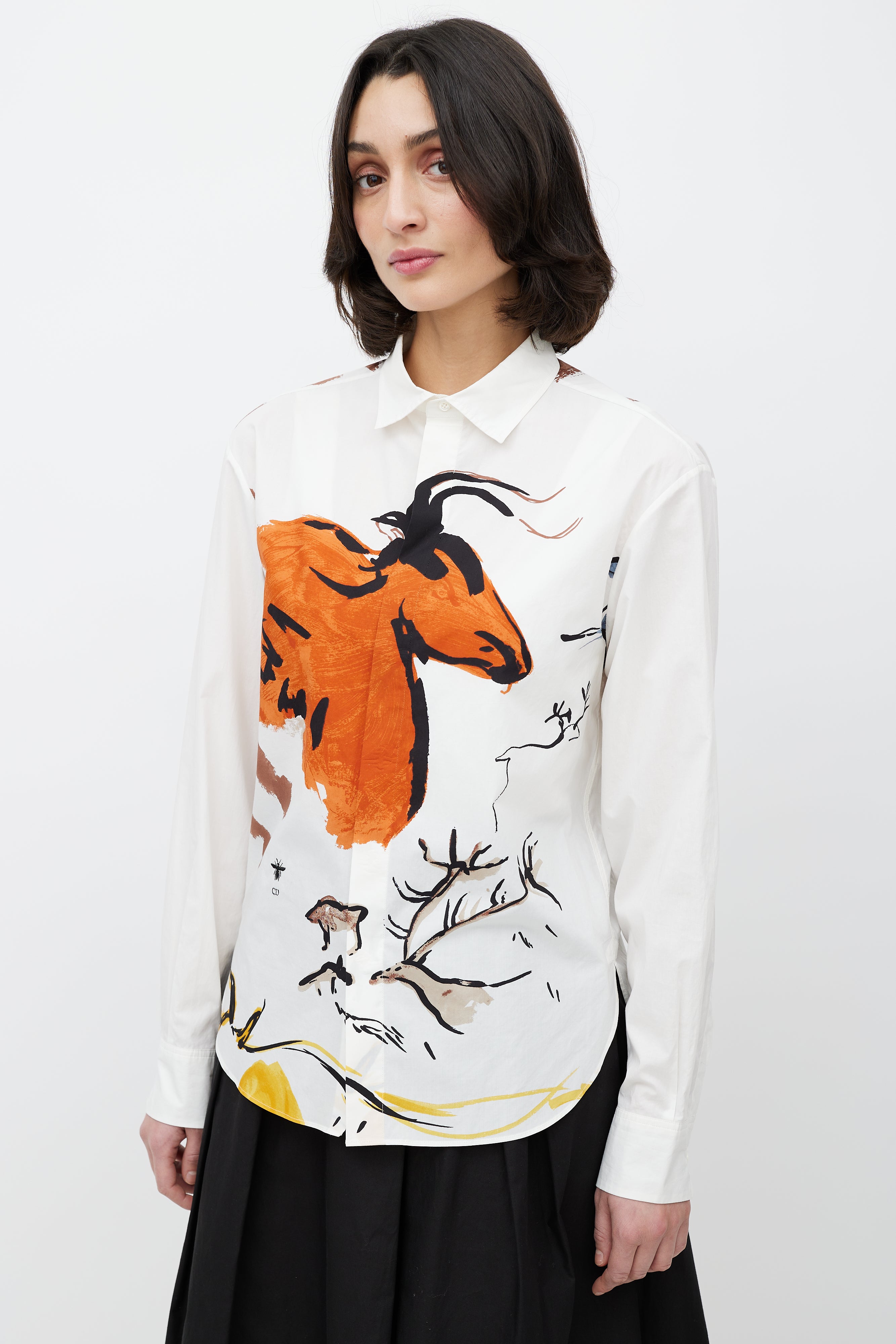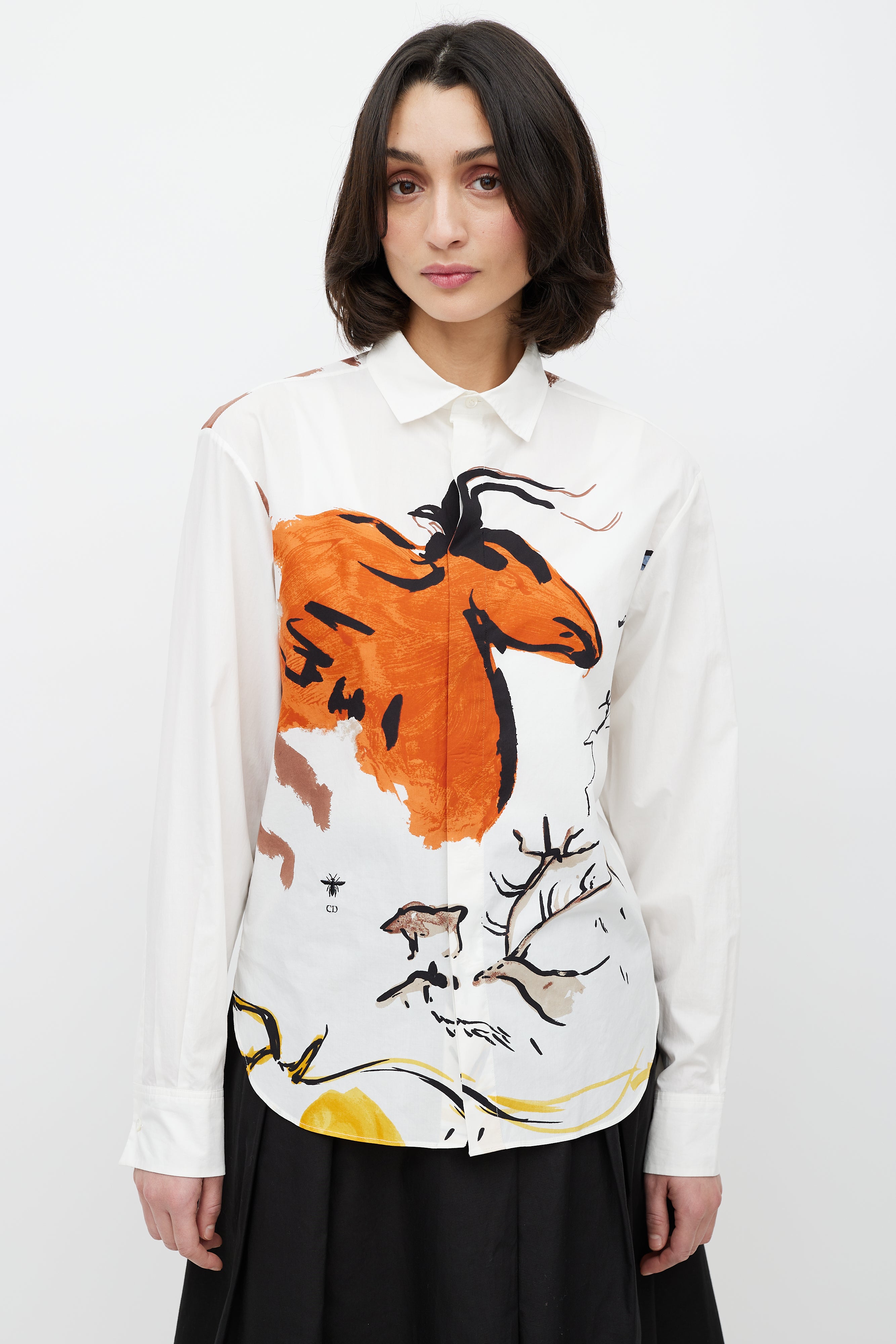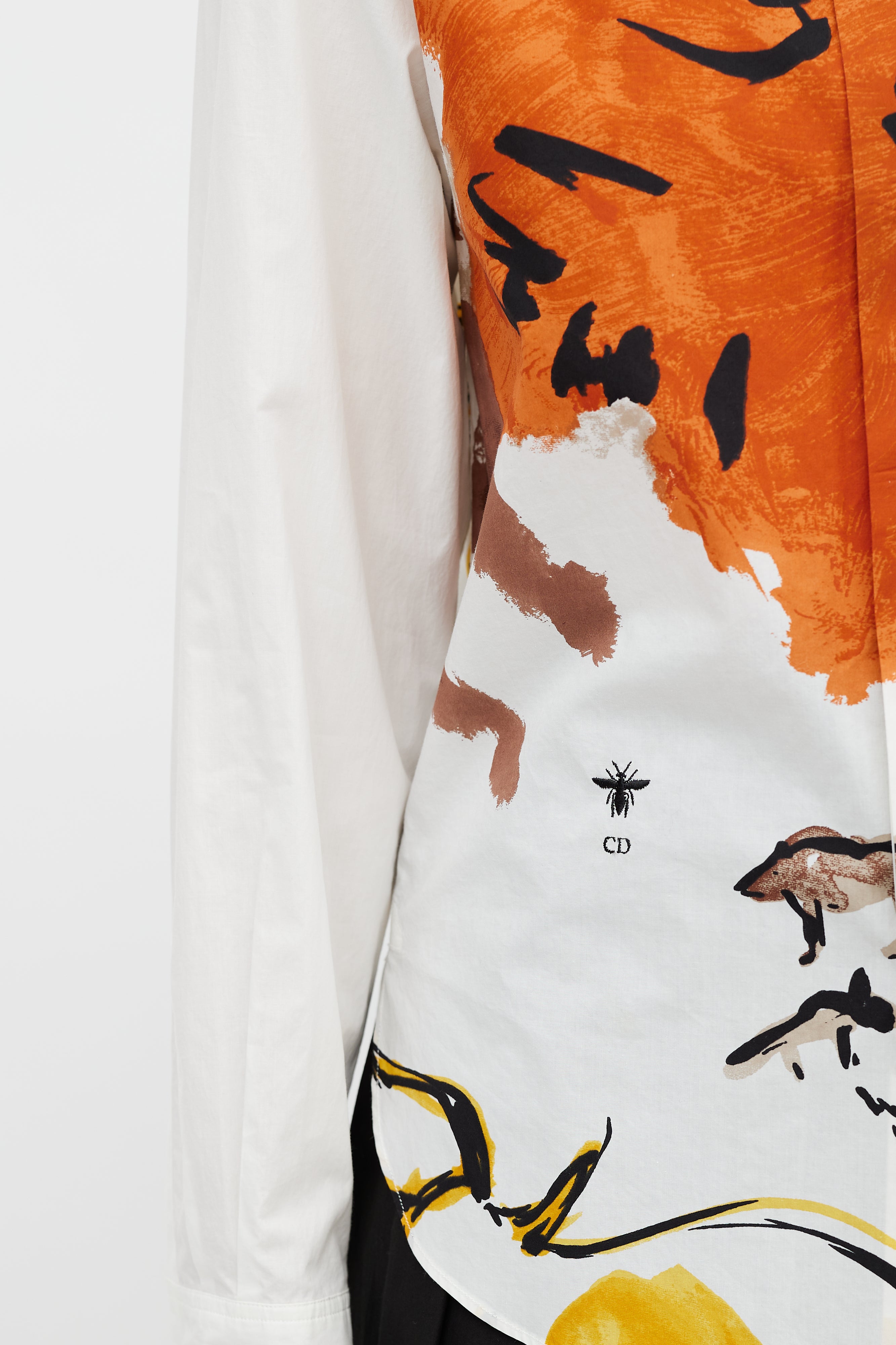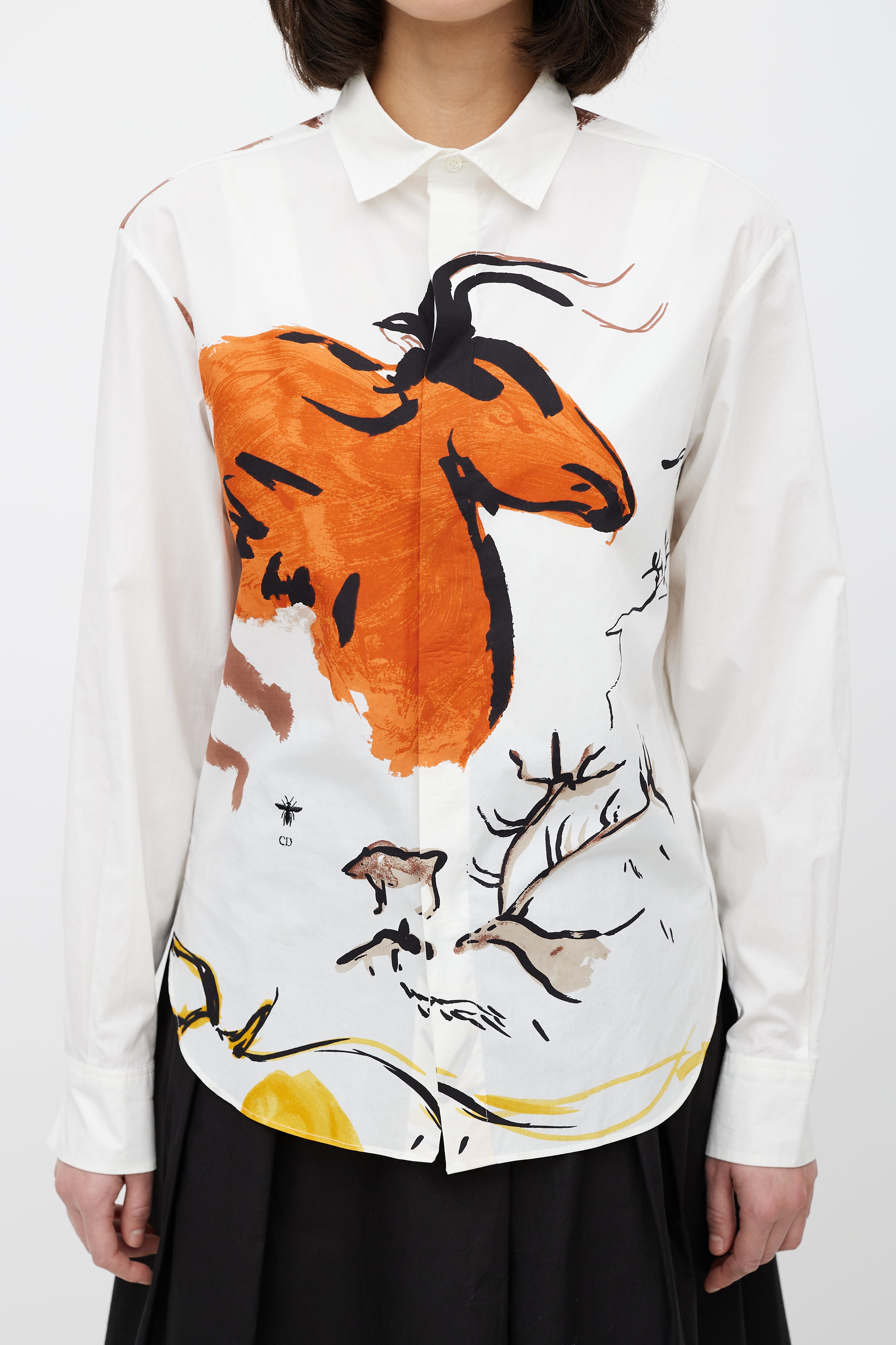 Pre-owned Christian Dior white shirt featuring a multicolour animal print throughout, pointed collar, long sleeves with buttoned cuffs, bee embroidery at left corner, and button up closure.