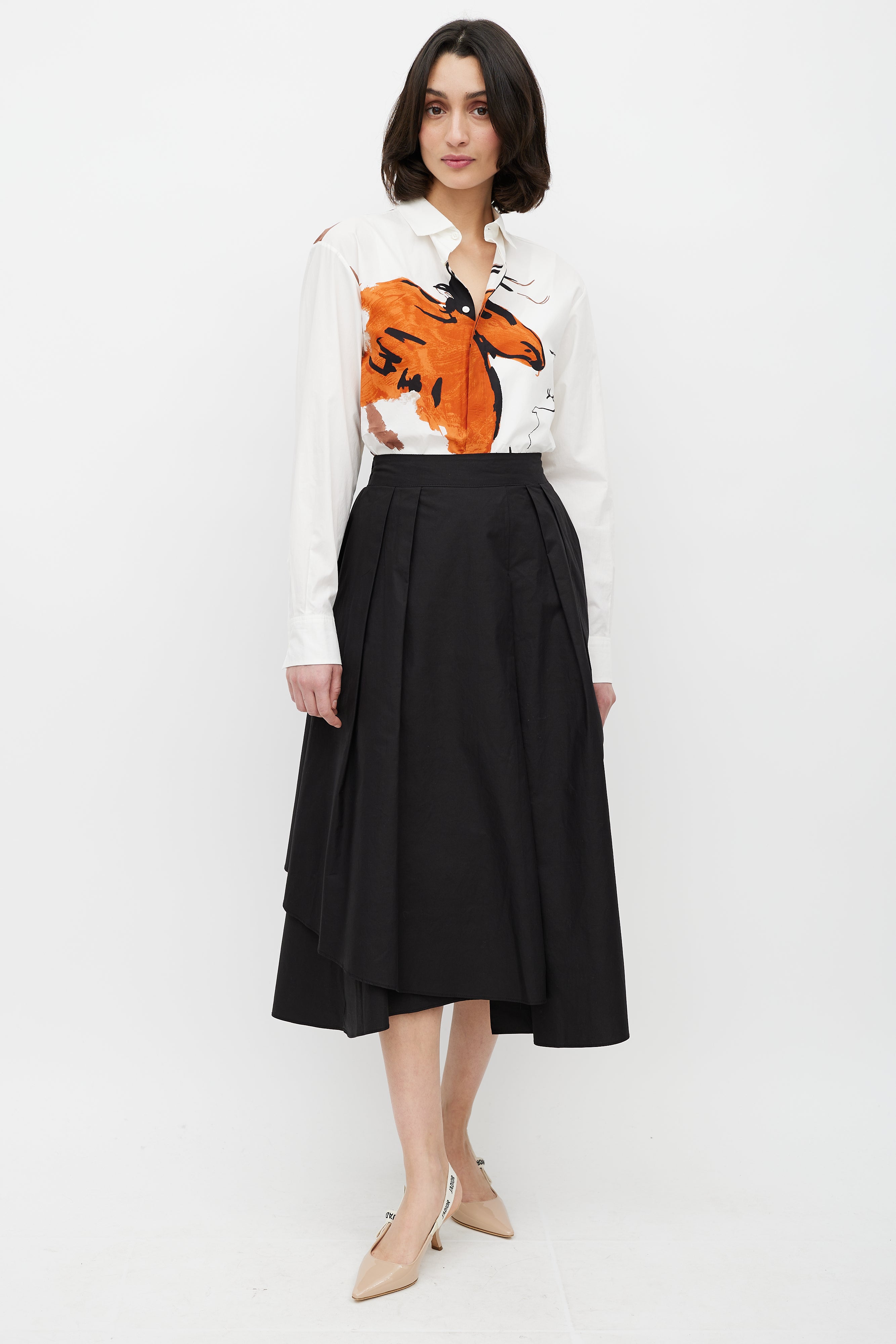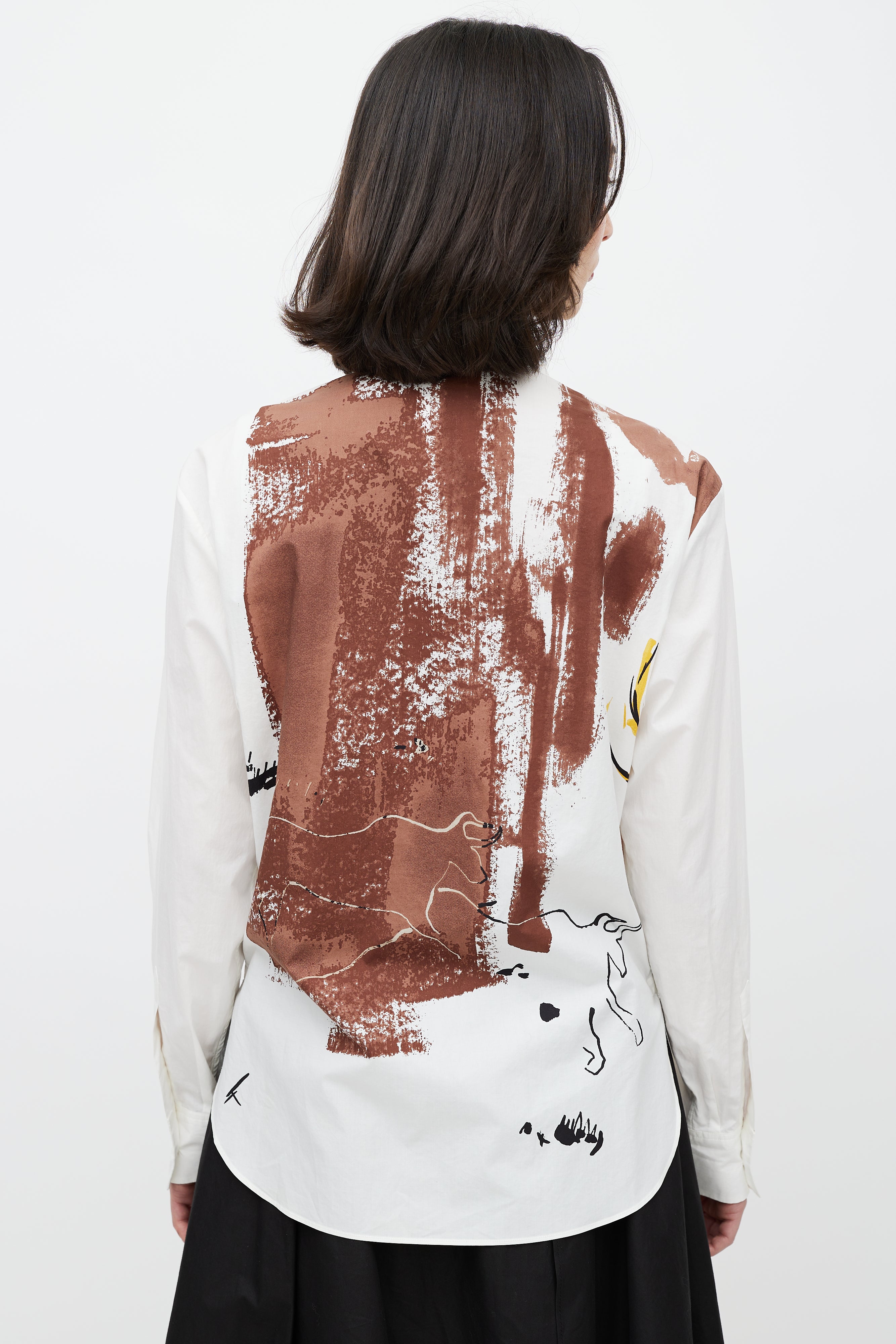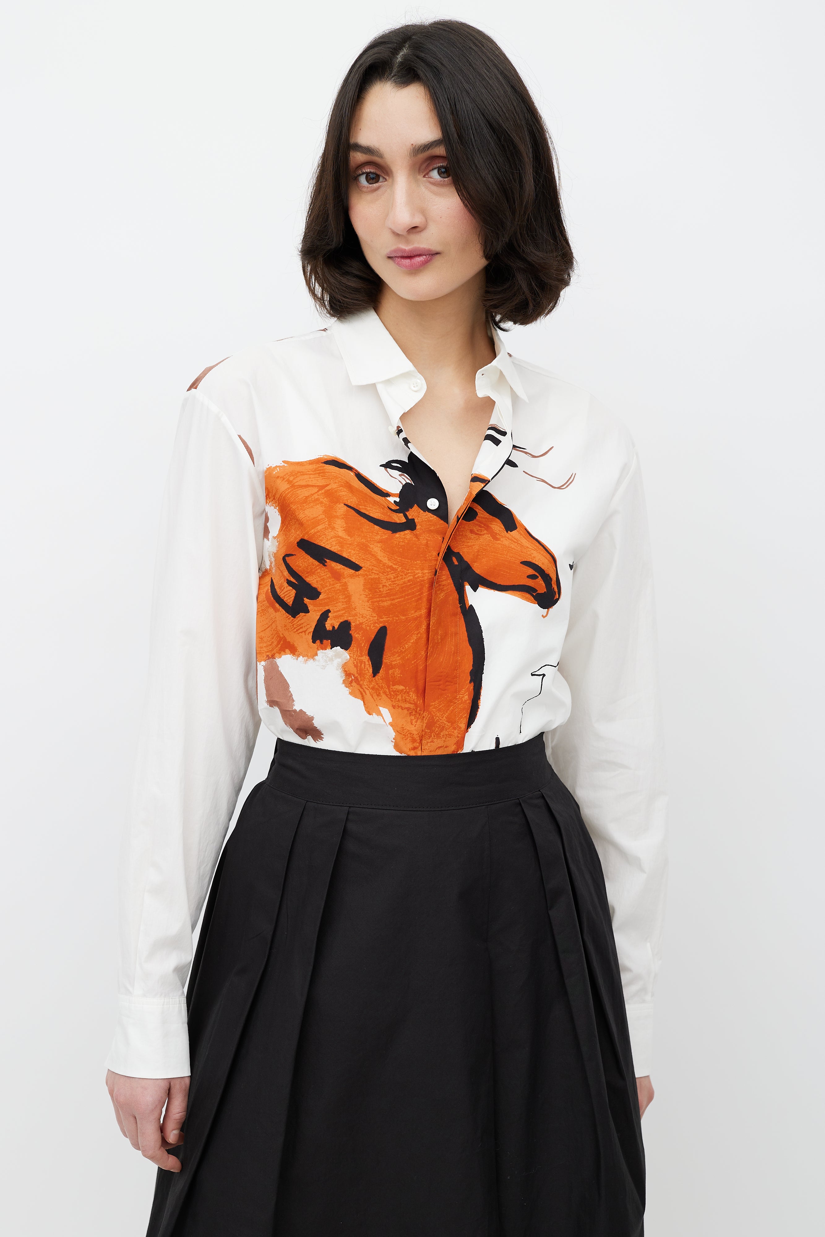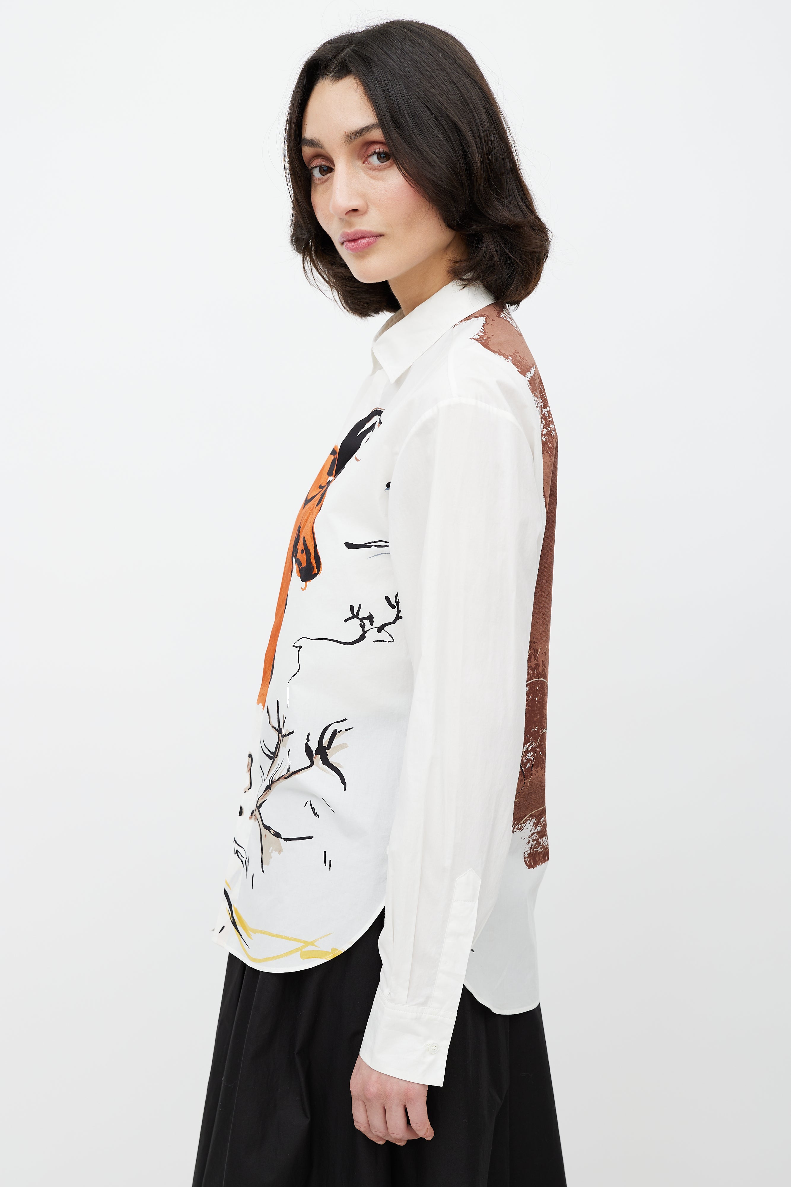 Pre-owned Christian Dior white shirt featuring a multicolour animal print throughout, pointed collar, long sleeves with buttoned cuffs, bee embroidery at left corner, and button up closure.
