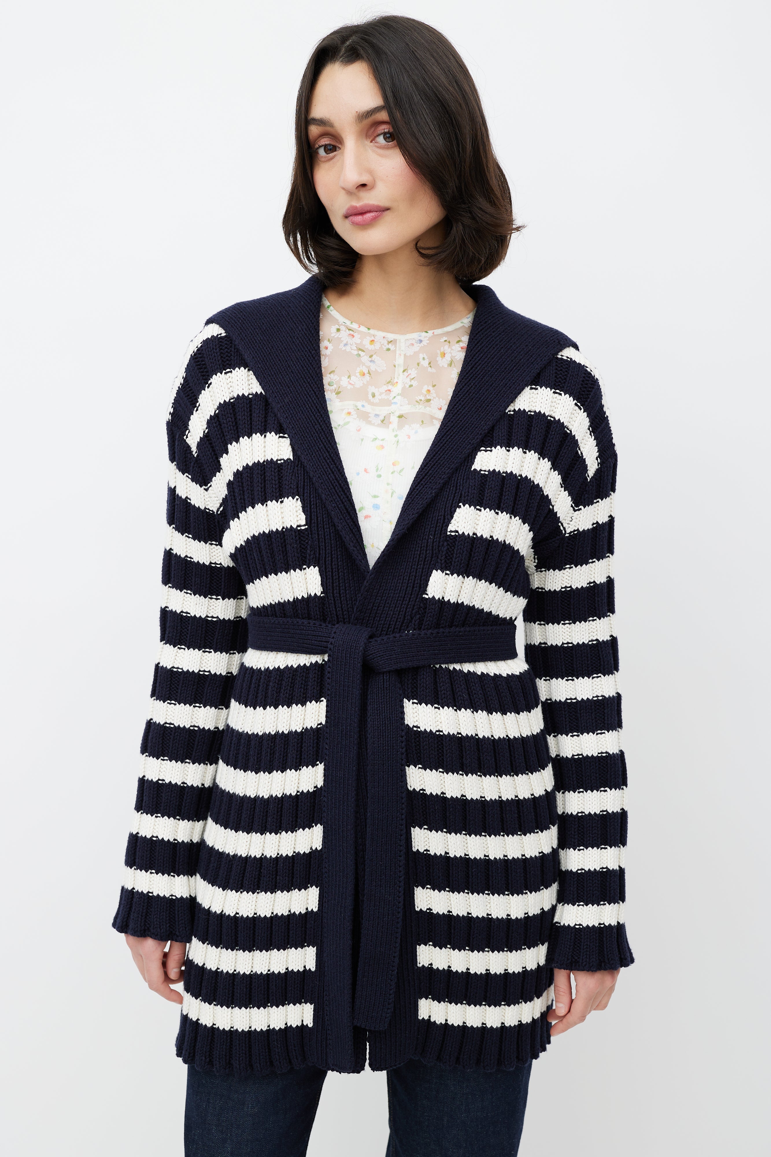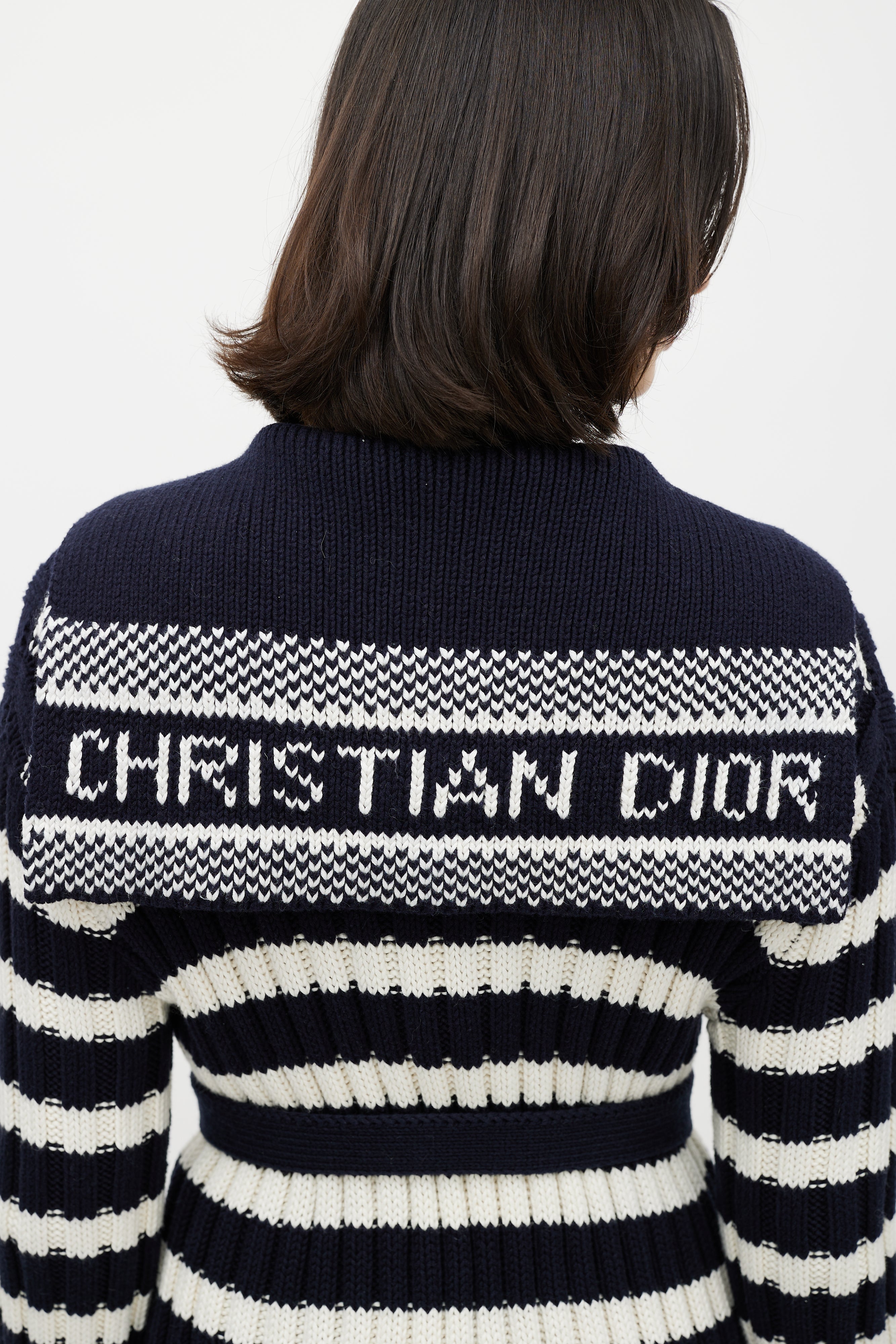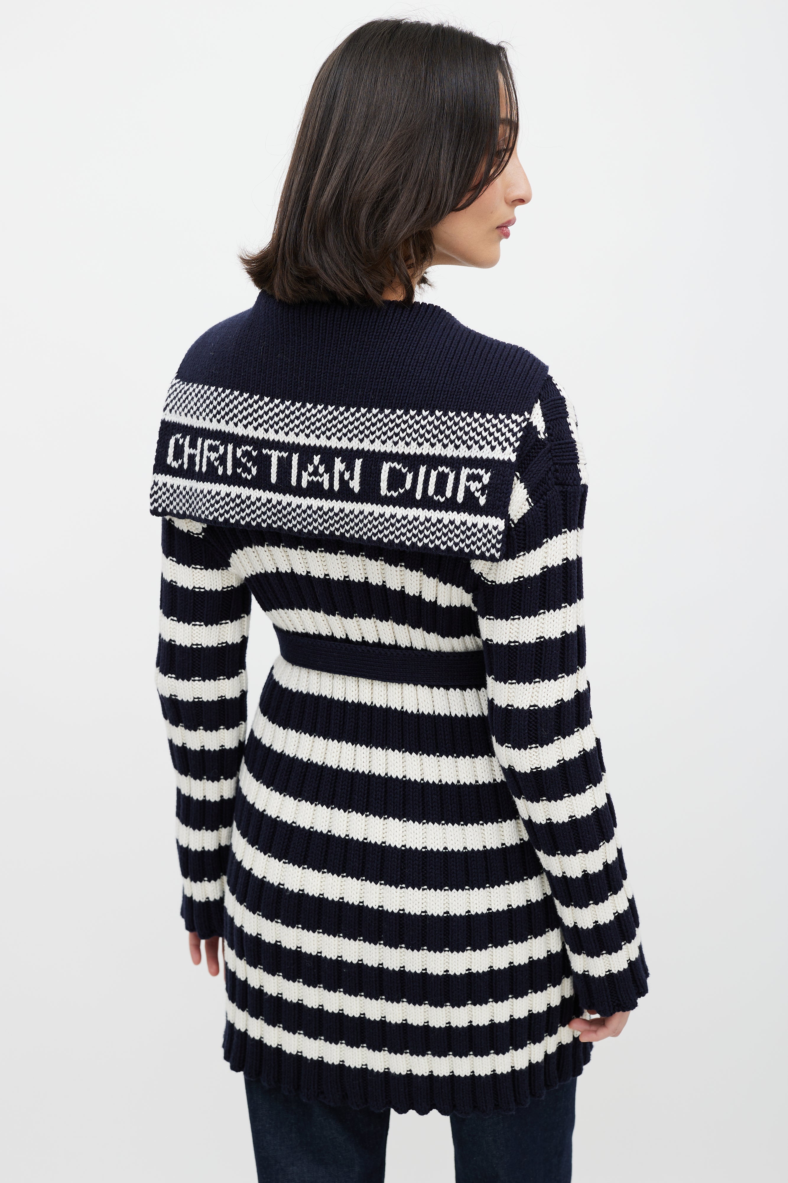 Pre-owned Christian Dior white knit cardigan featuring navy striped pattern throughout, pointed collar with intarsia knit logo, long sleeves, tie belt at waist, and open front.