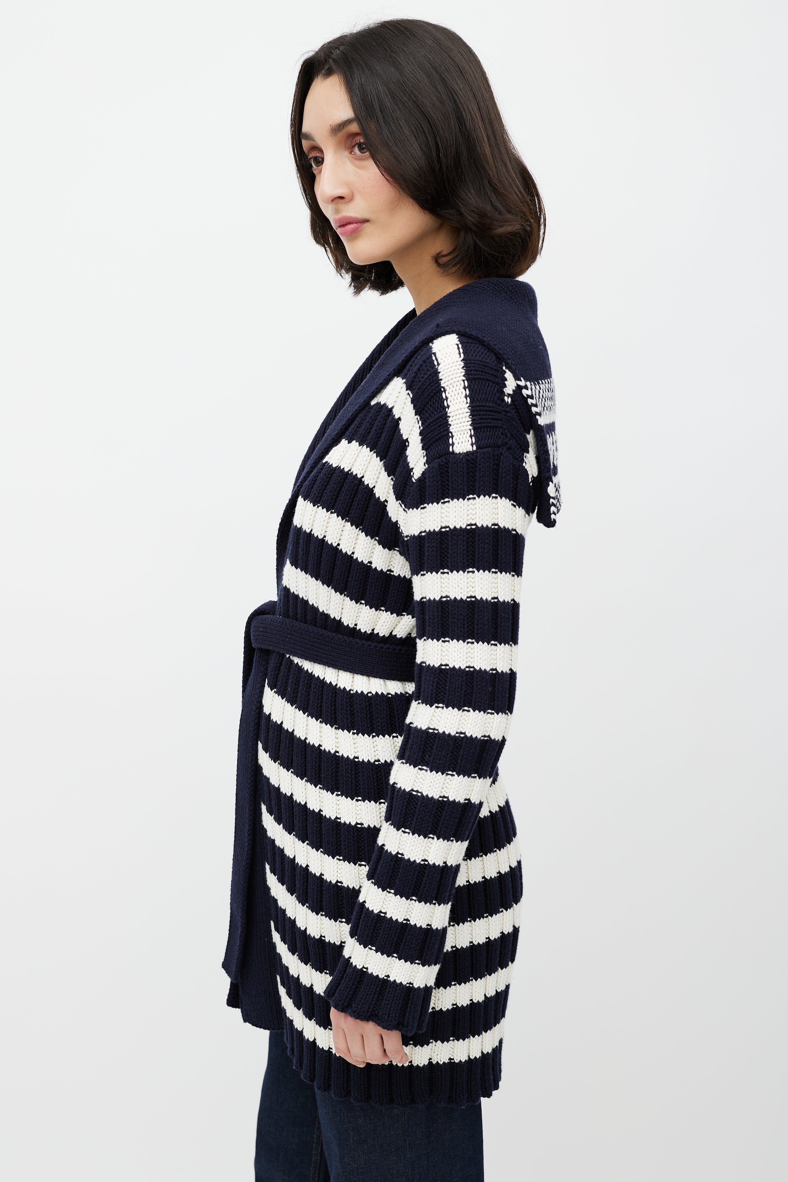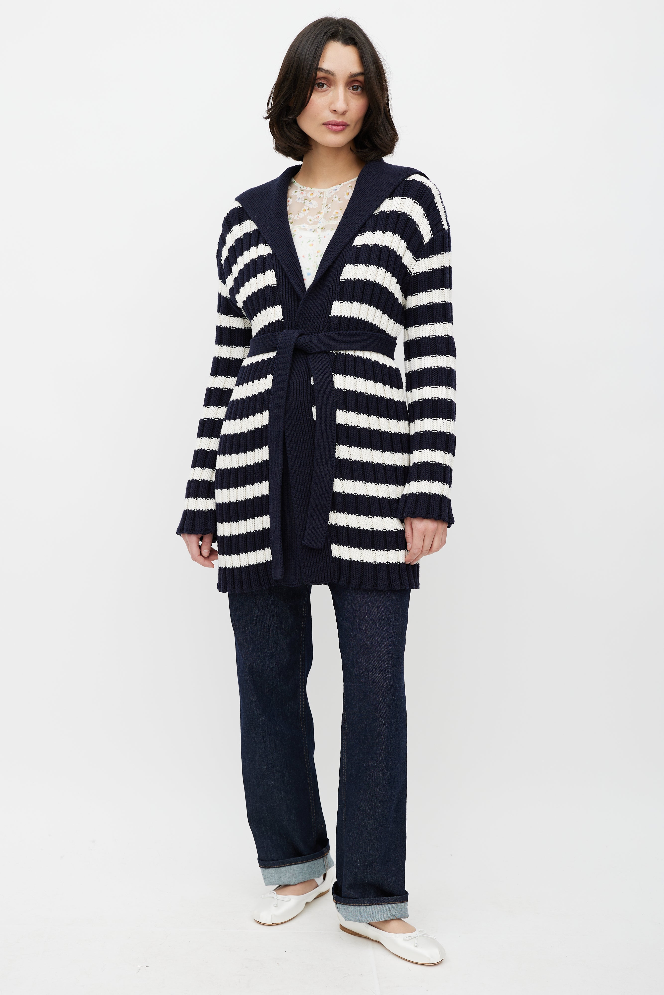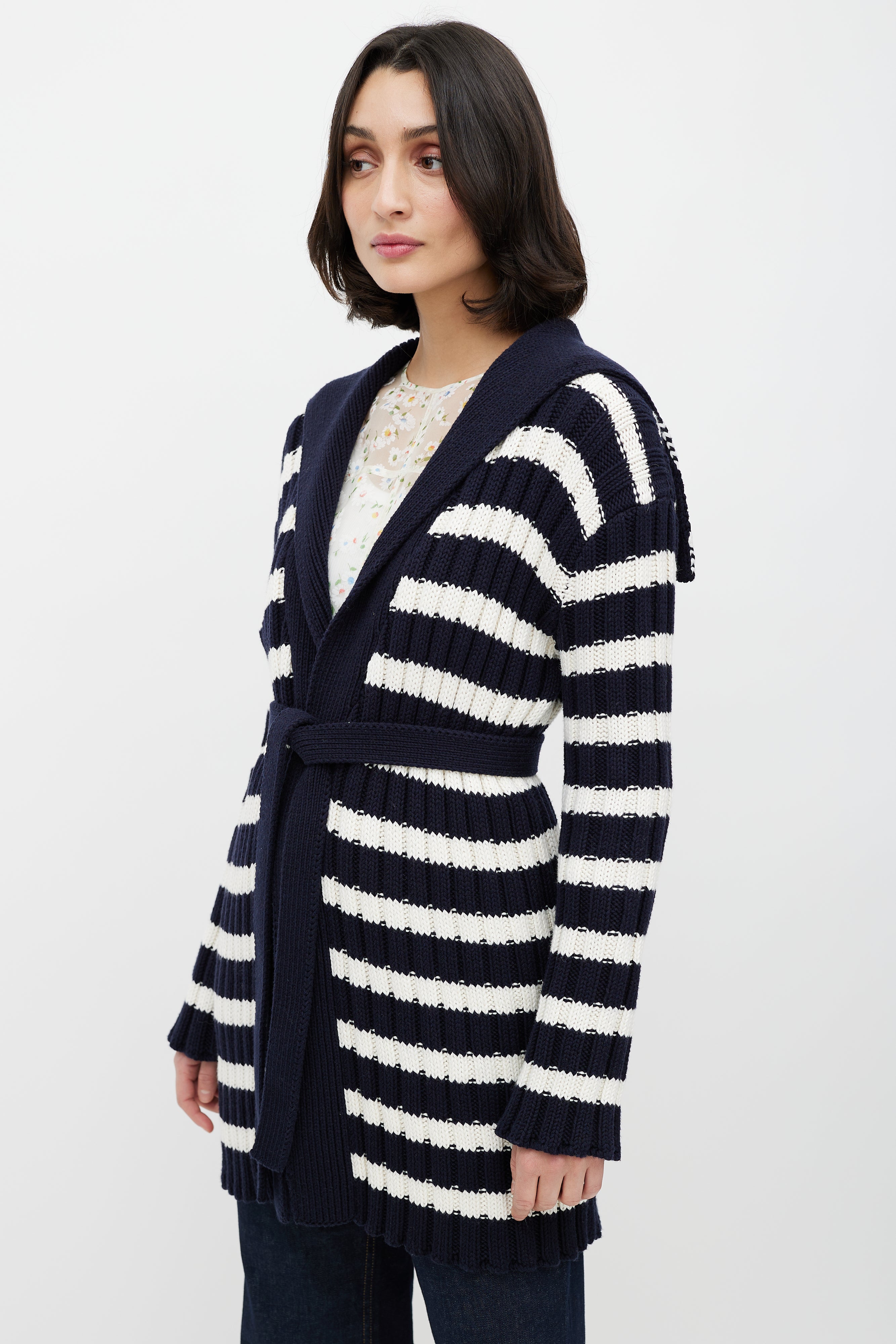 Pre-owned Christian Dior white knit cardigan featuring navy striped pattern throughout, pointed collar with intarsia knit logo, long sleeves, tie belt at waist, and open front.