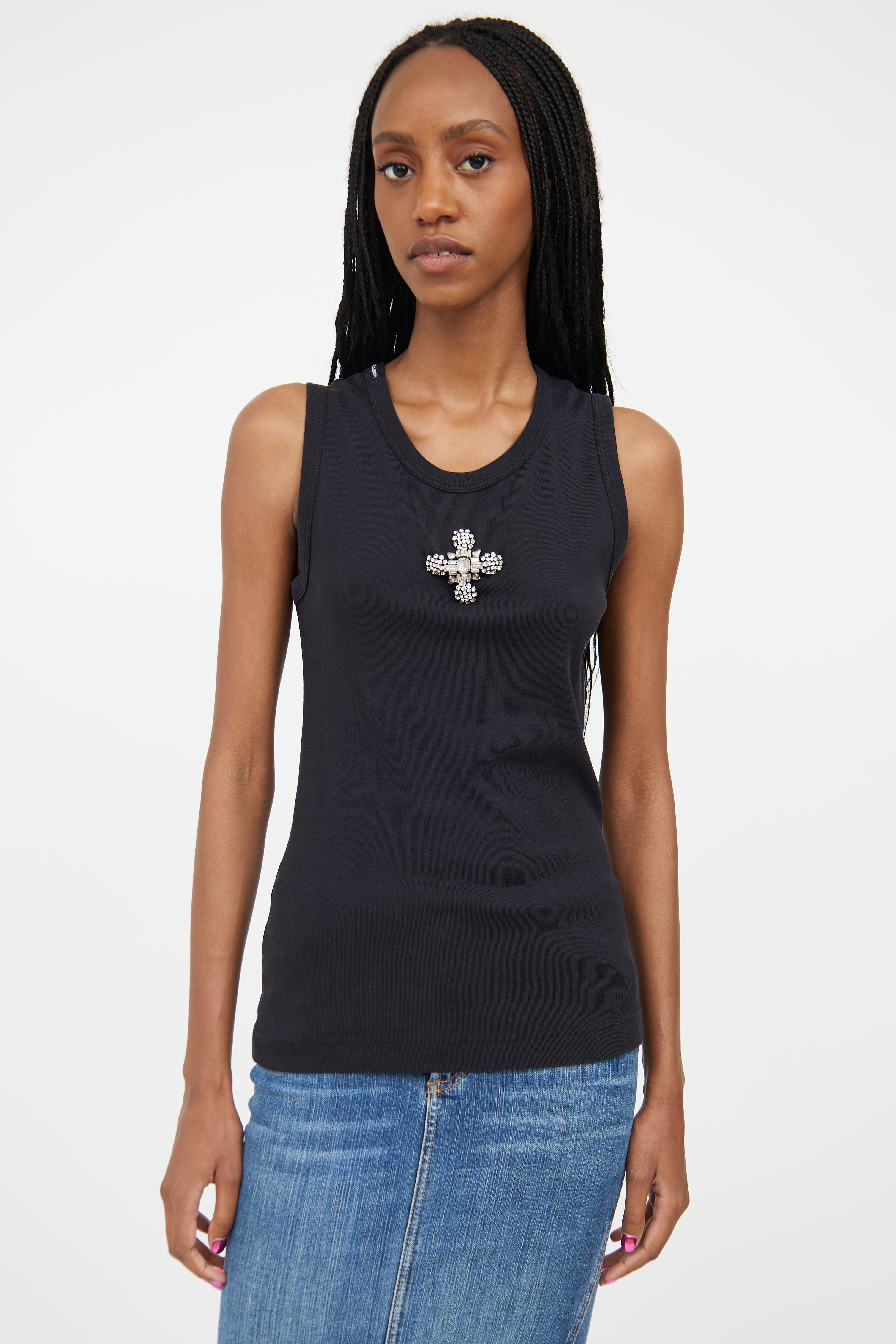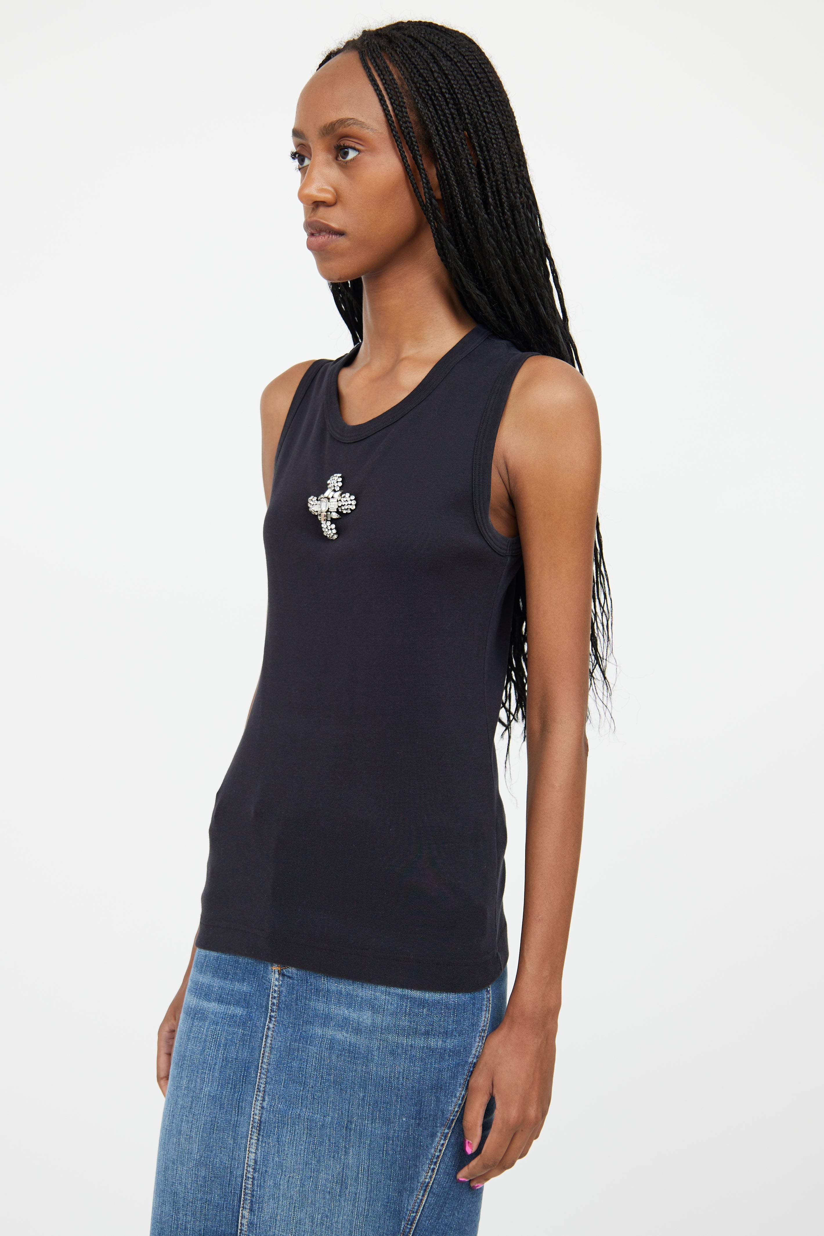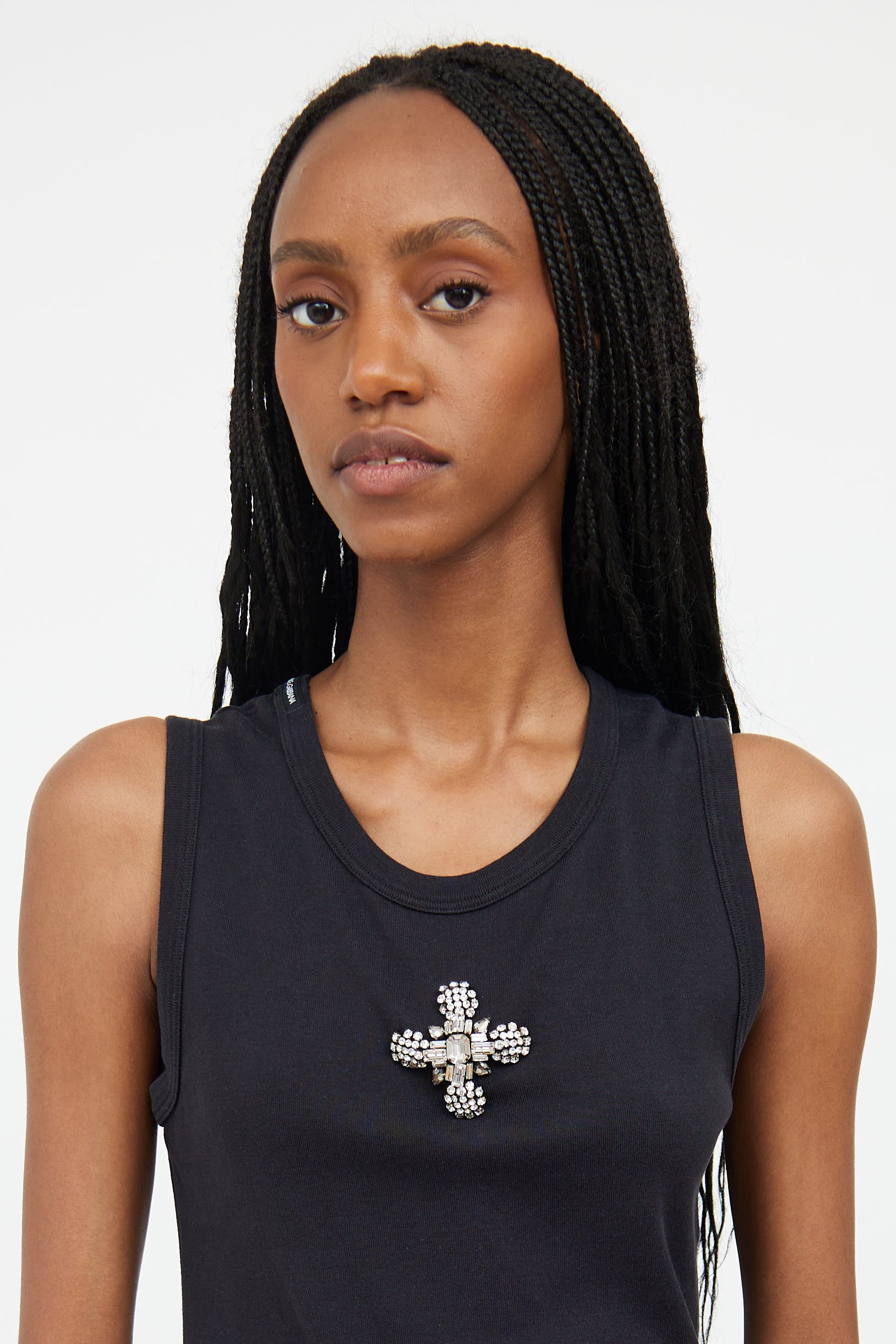 Pre-owned Dolce & Gabbana black tank top featuring a scoop neckline, sleeveless styling, silver crystal embellished cross at chest, and logo patch at shoulder.