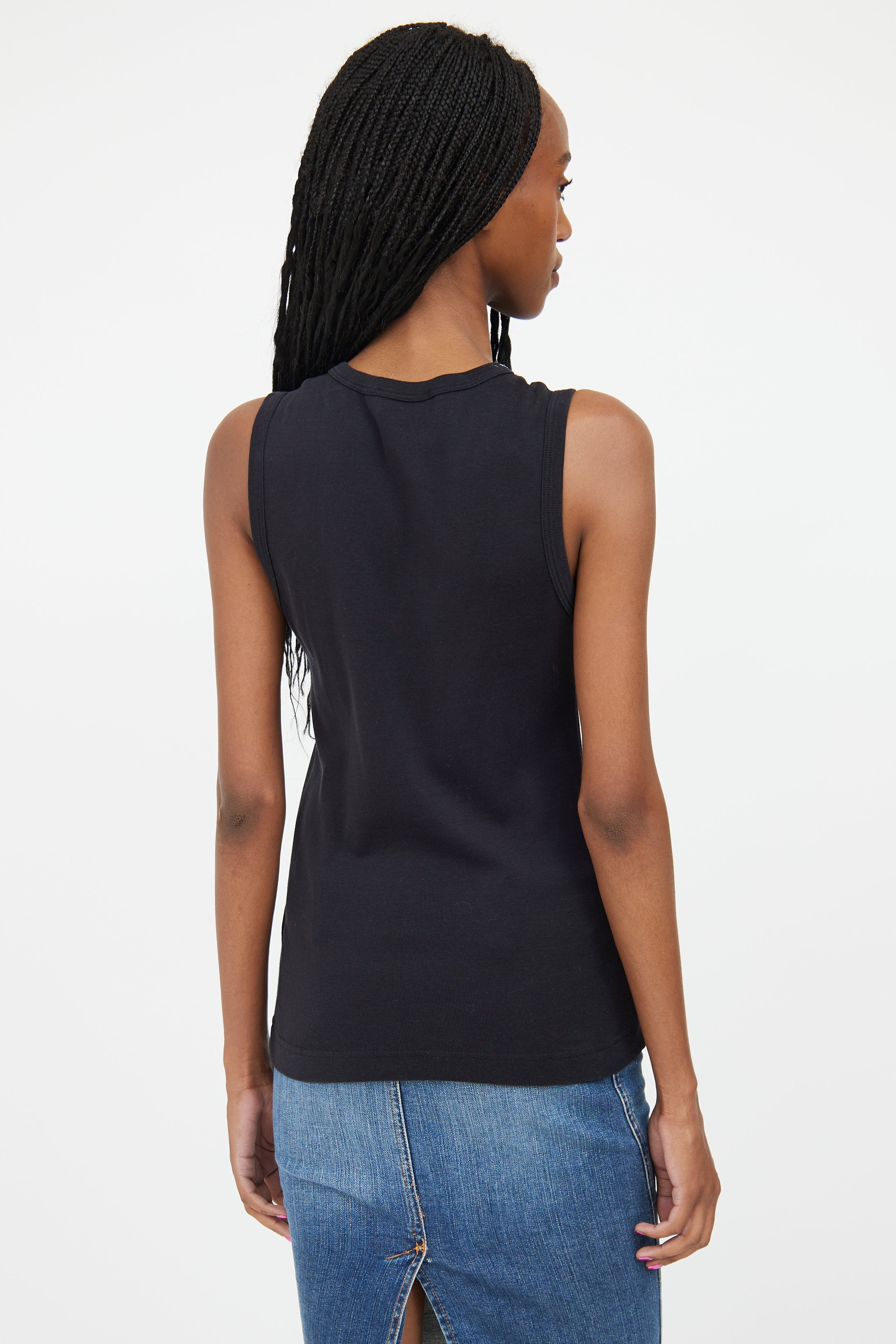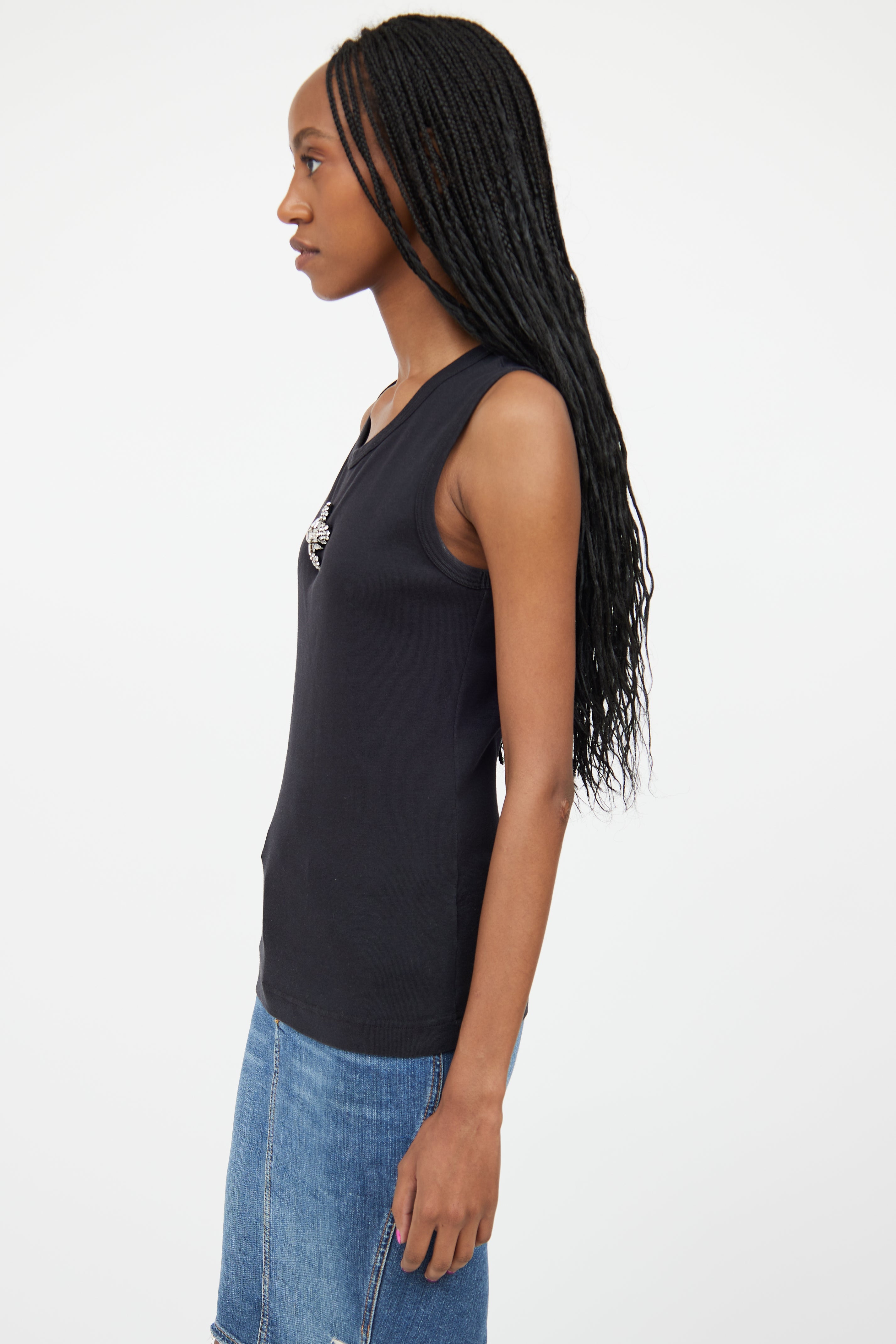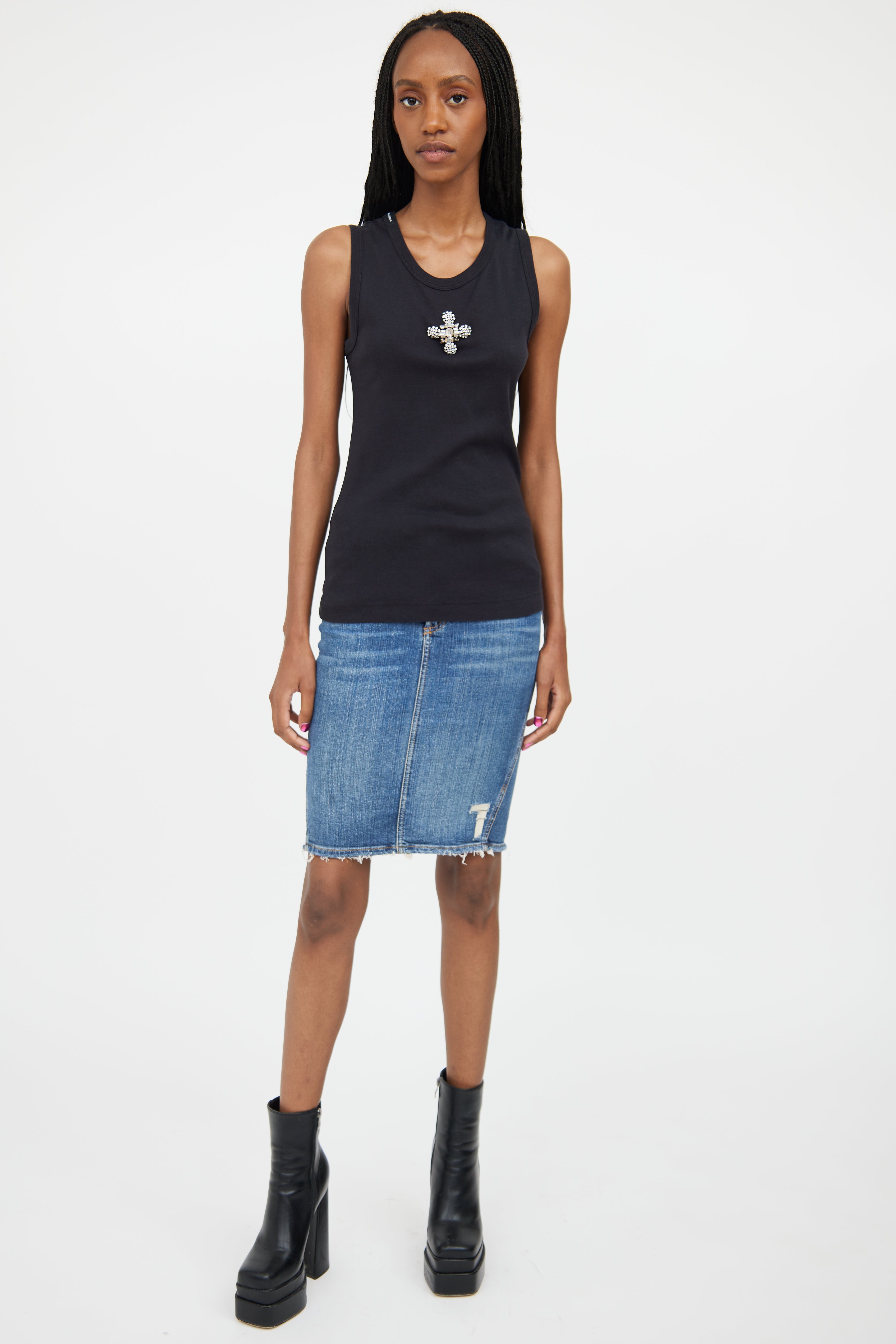 Pre-owned Dolce & Gabbana black tank top featuring a scoop neckline, sleeveless styling, silver crystal embellished cross at chest, and logo patch at shoulder.