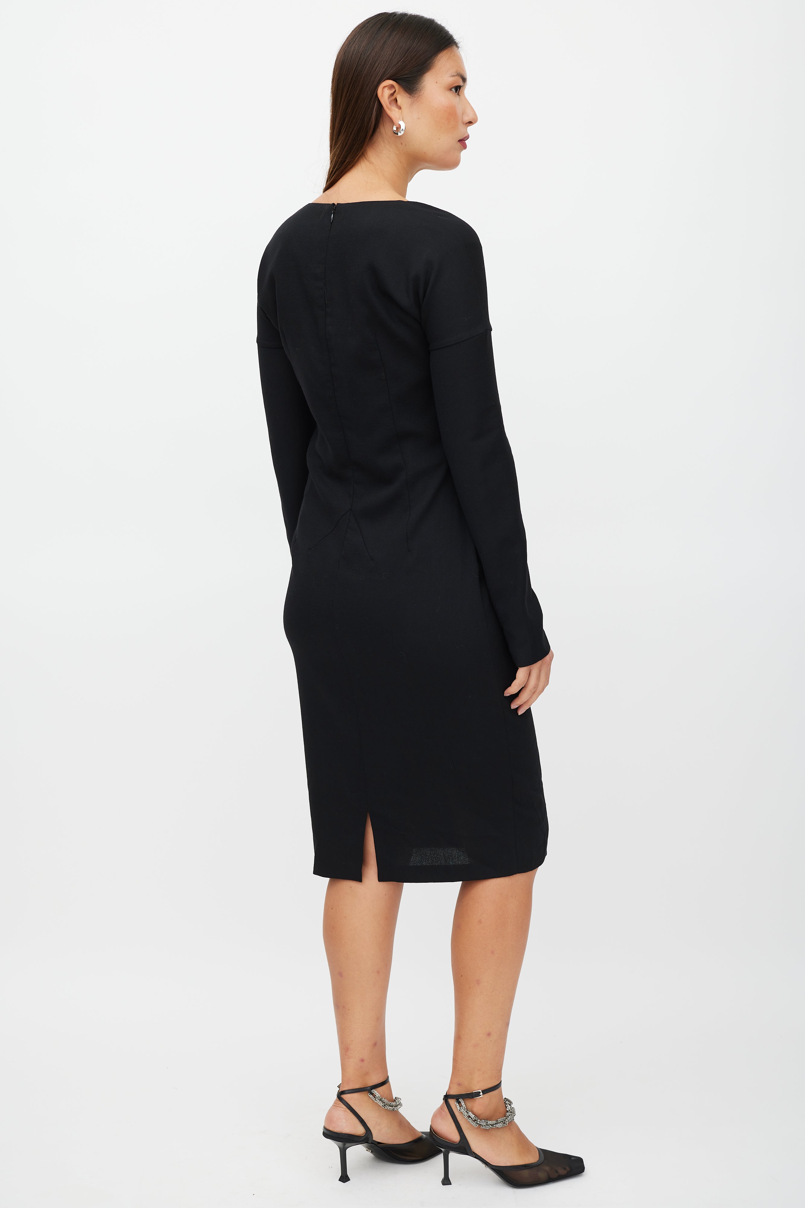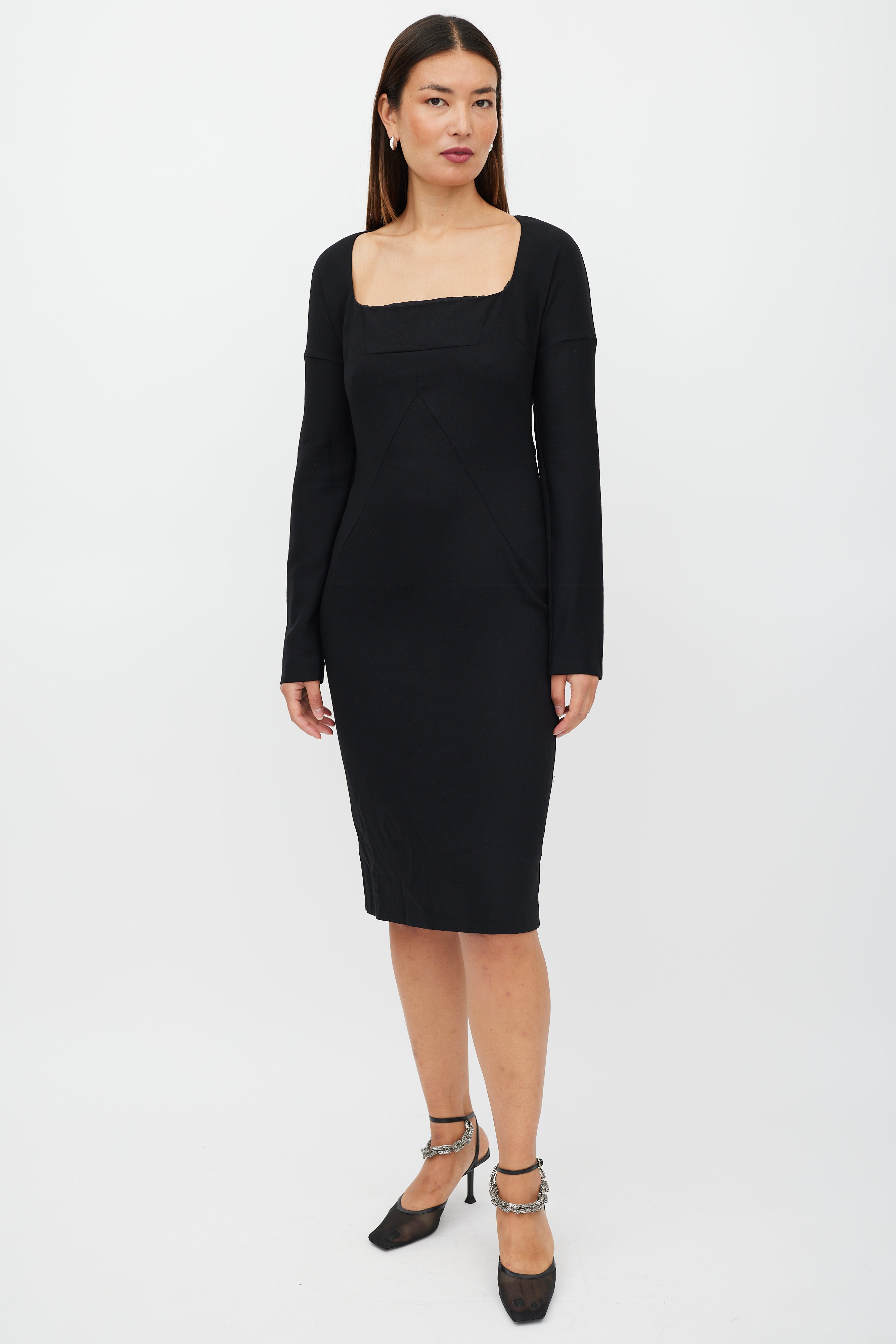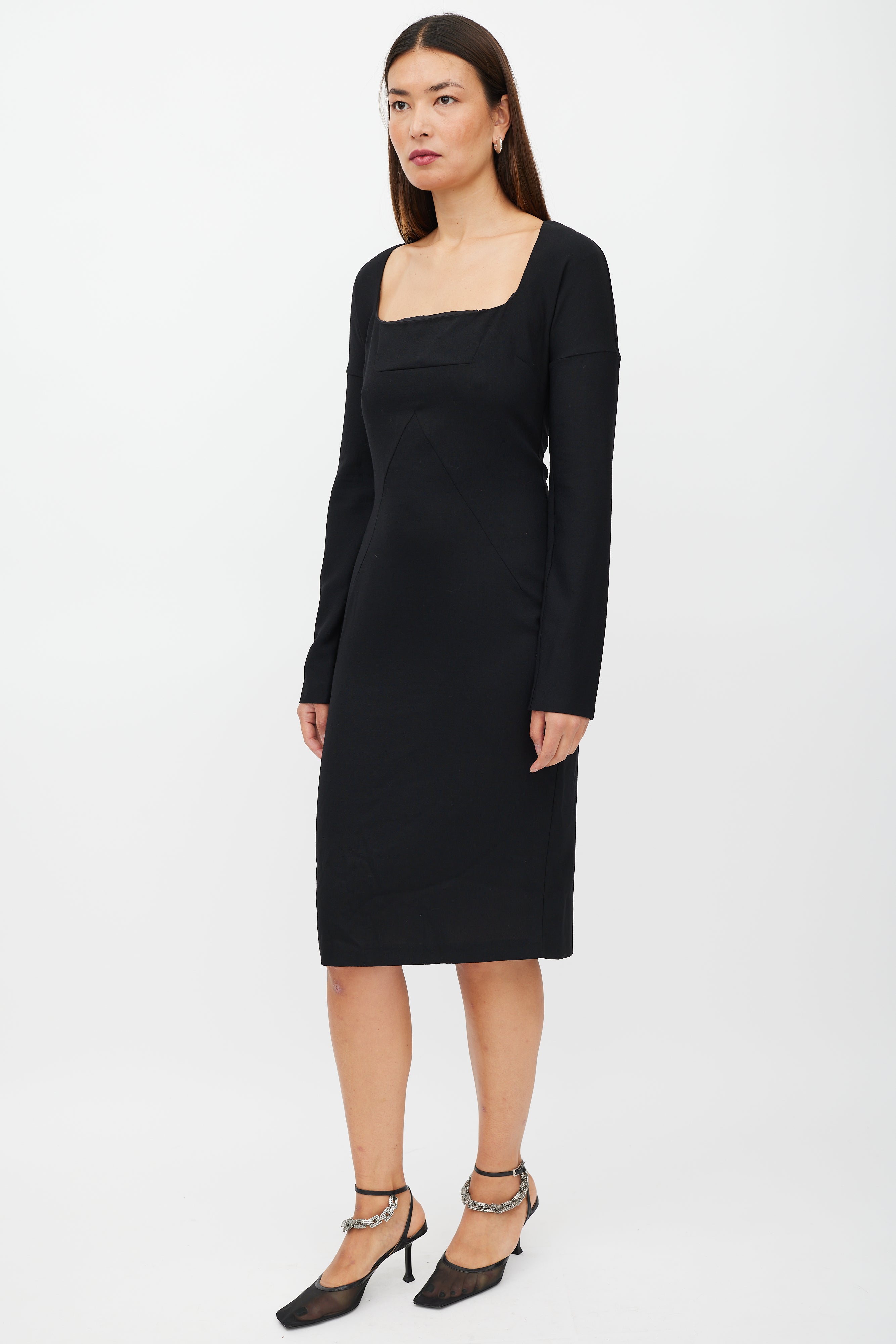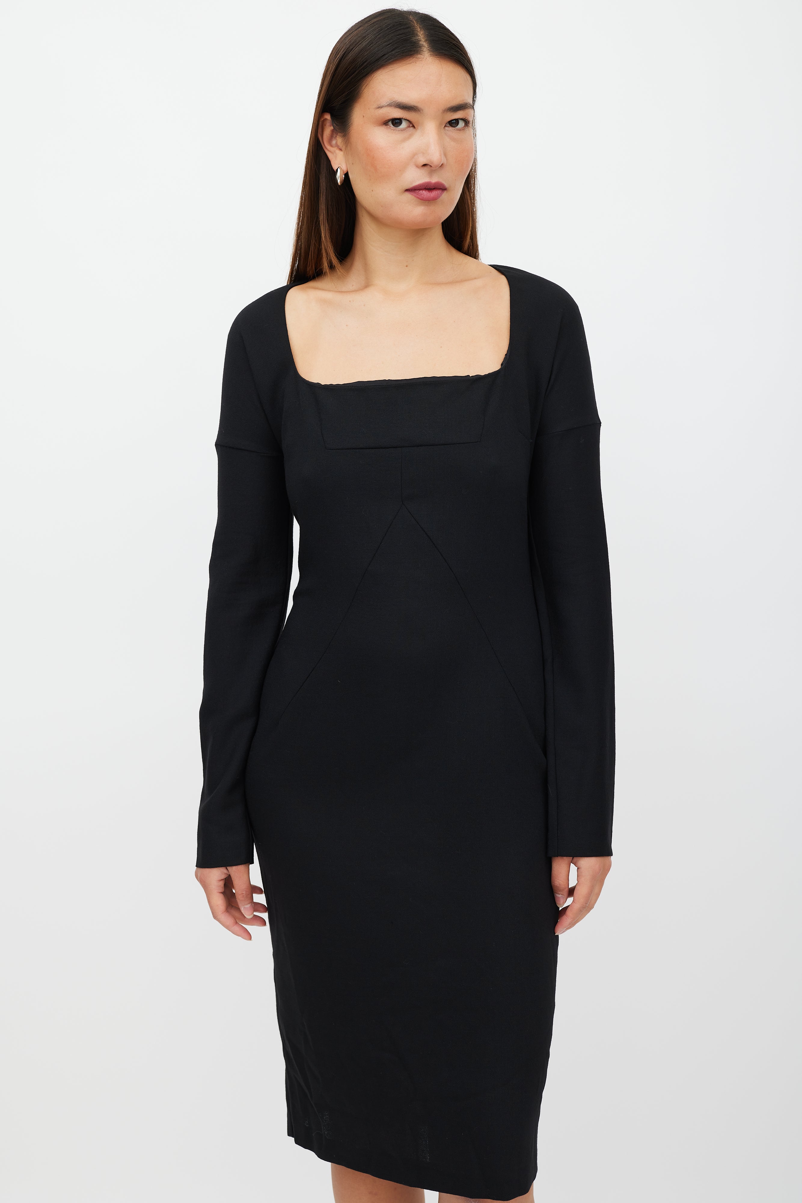 Pre-owned D&G black wool dress featuring a square neckline, long sleeves with drop shoulder, panelled front, and zip at back with hook and eye closure. Lined.
