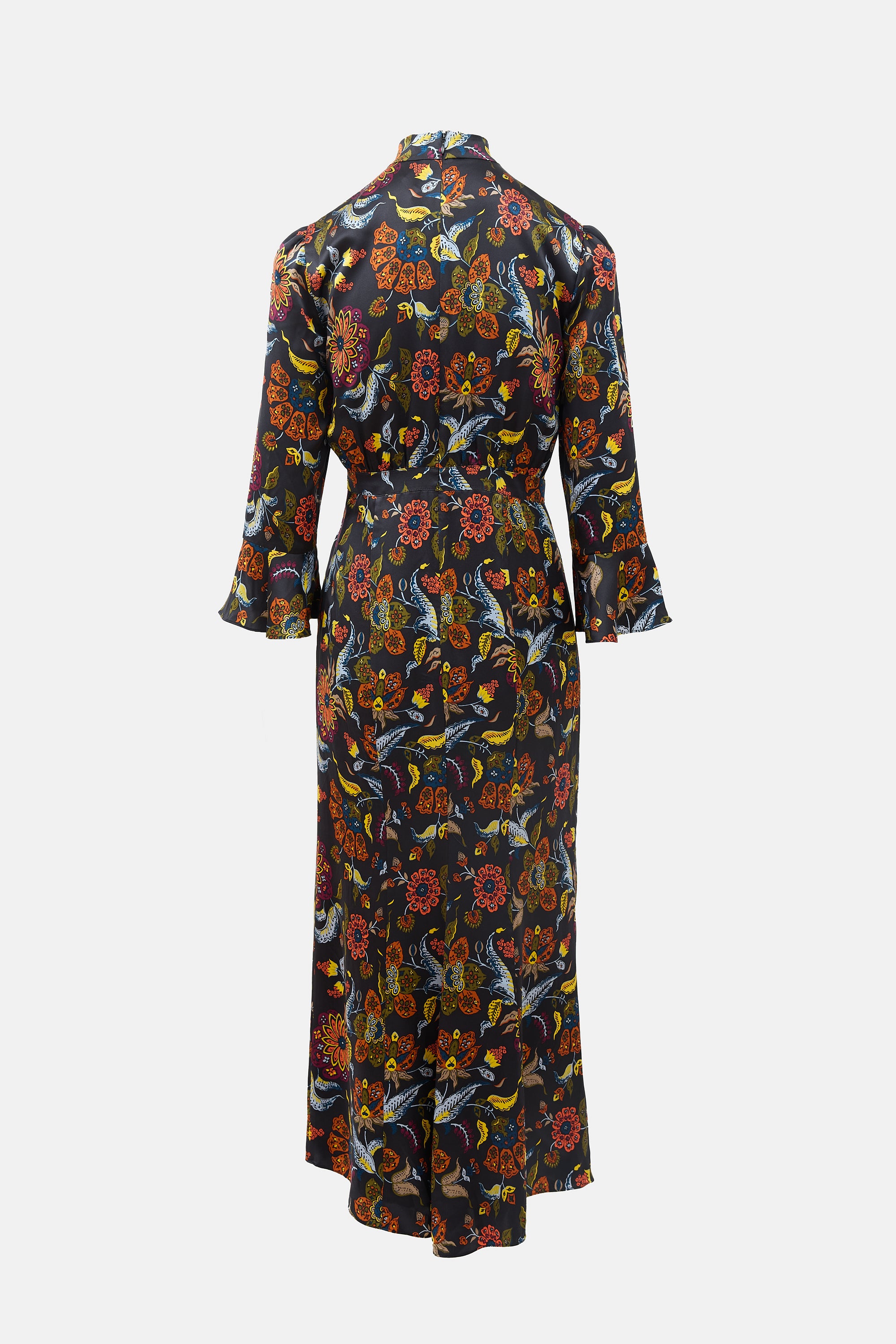 Pre-owned Cinq à Sept black and multicolour floral silk Juliana midi dress featuring a mock neck, back zip closure, puff sleeves with flounce cuffs, knot detail at front waist with ruffle trim at skirt, and side slit. Lined.