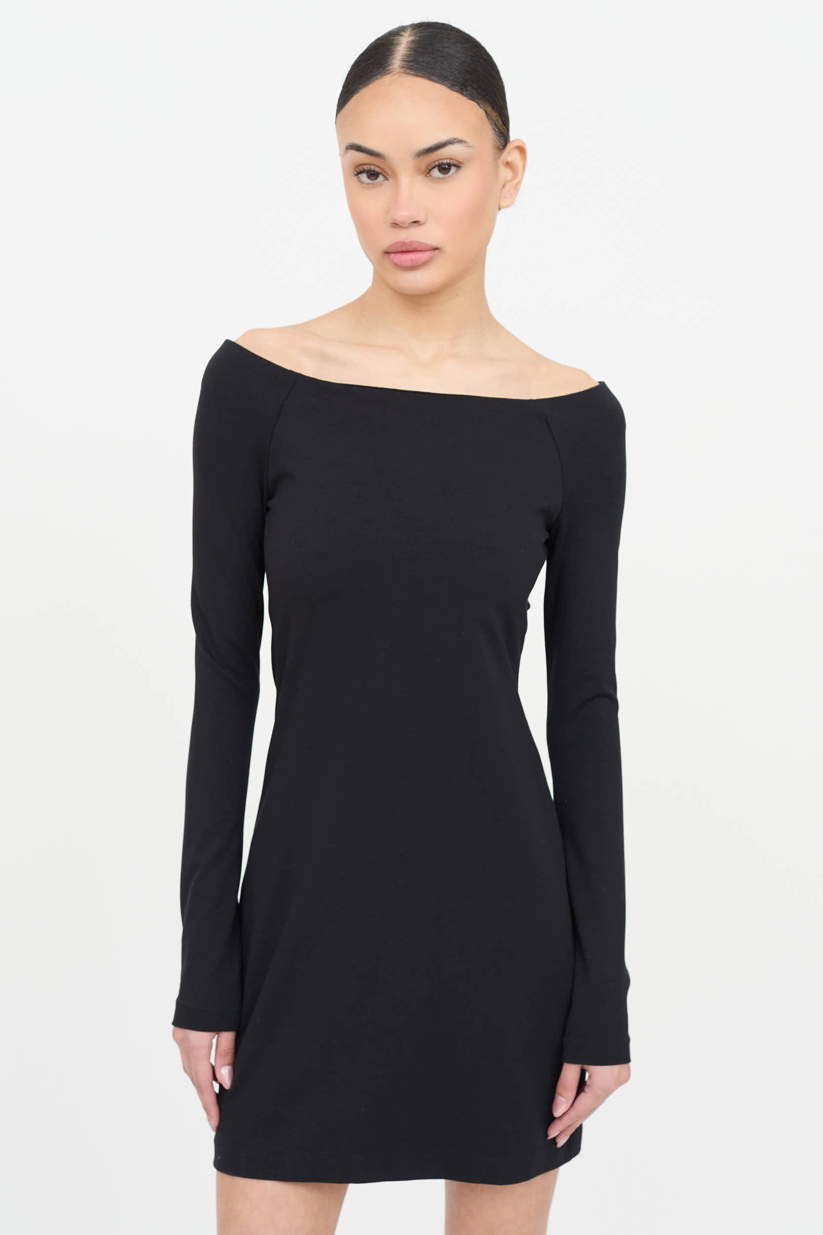 Pre-owned The Row black dress featuring a bateau neckline, long raglan sleeves, and off the shoulder styling.