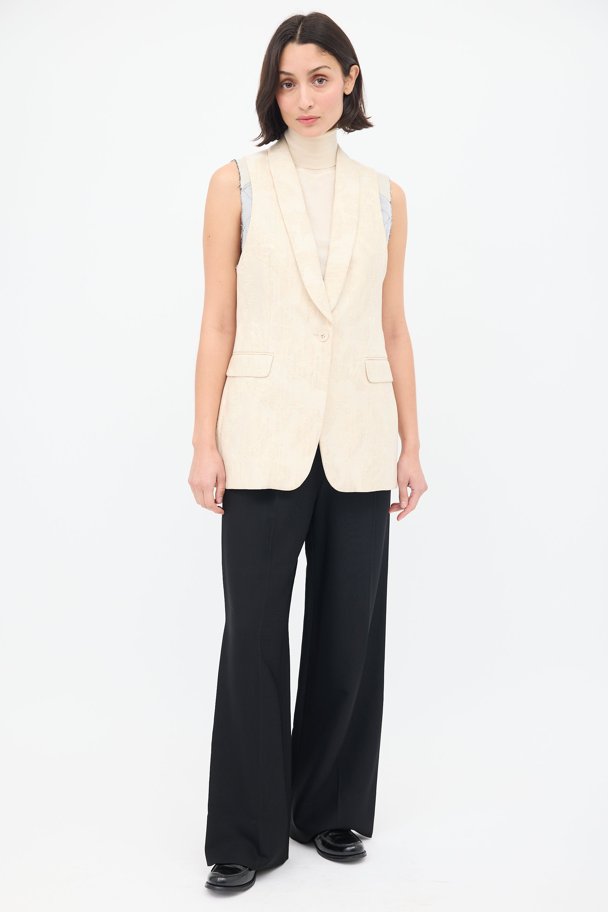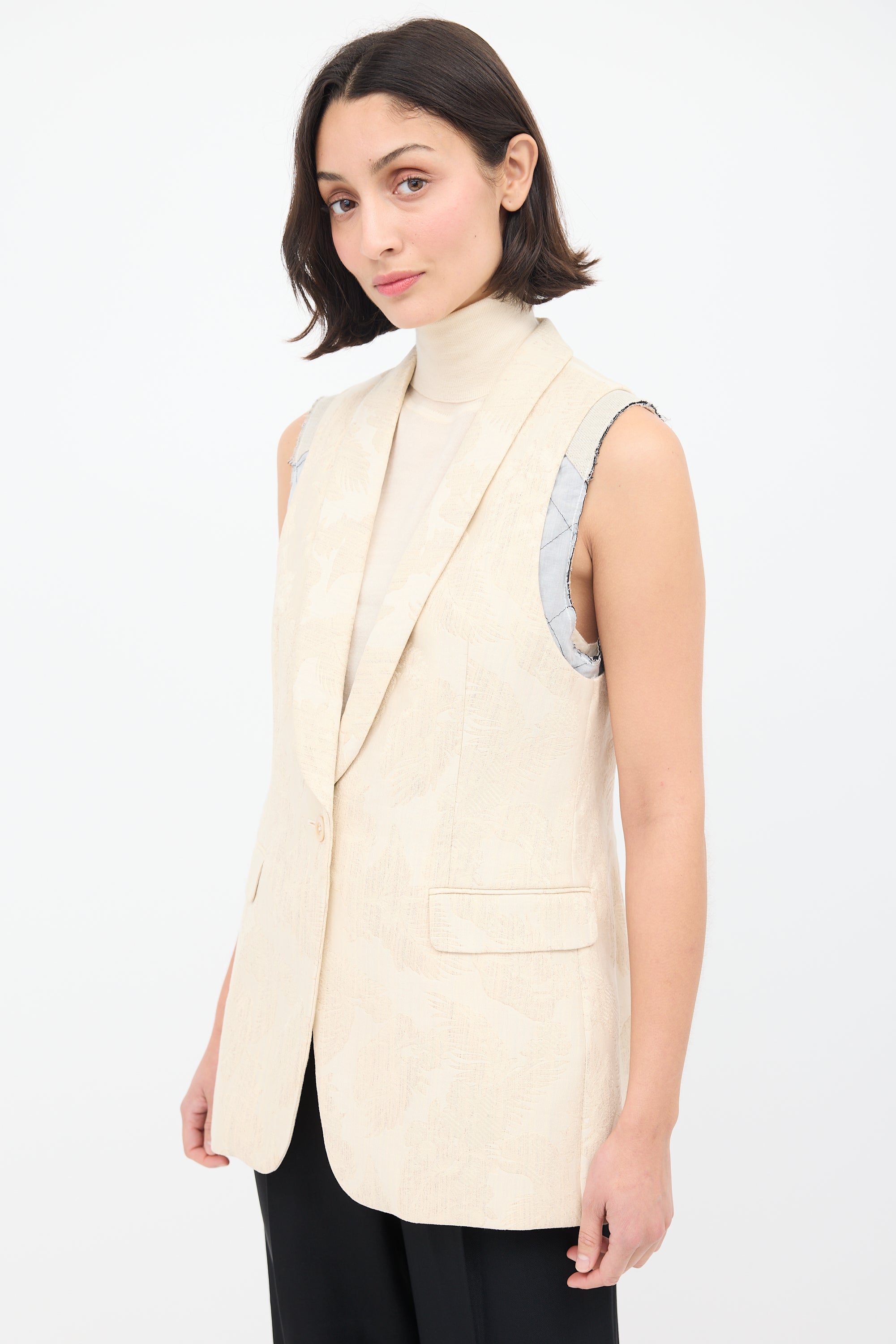 Pre-owned Dries Van Noten beige cotton blend vest featuring a shawl collar, single front button, two flap welt pockets at front waist, back vent, and layered insert at armholes with deconstructed styling. Lined.