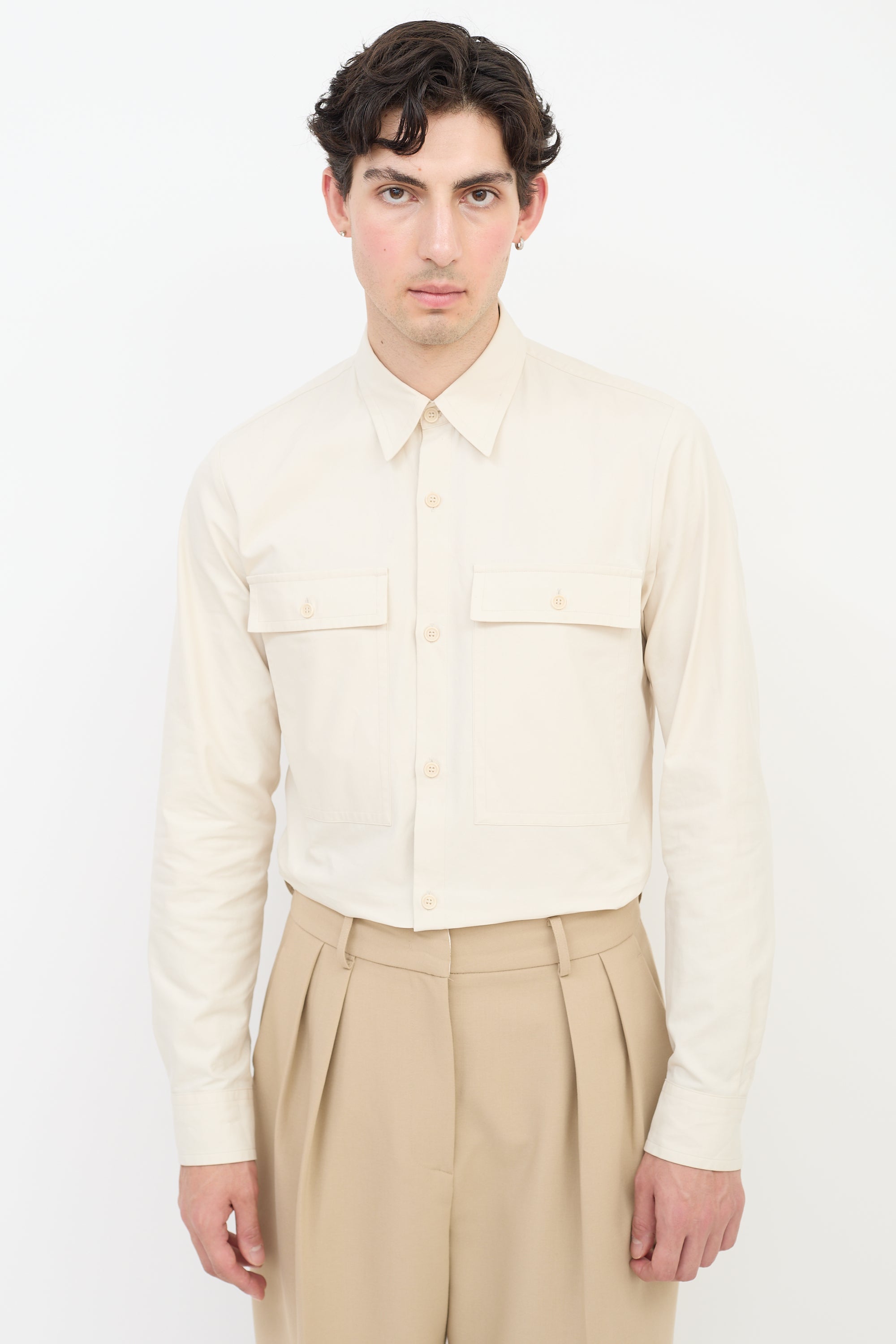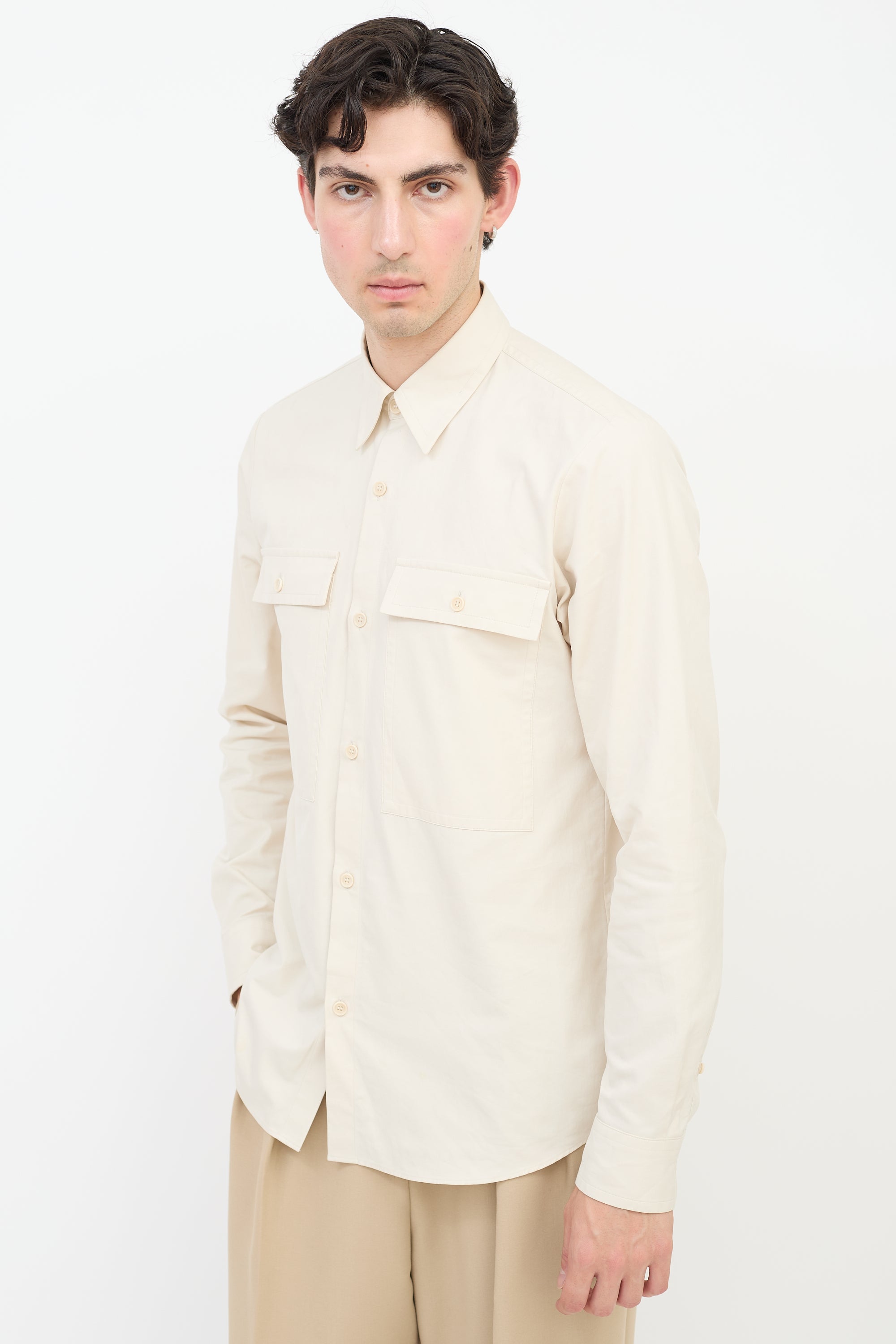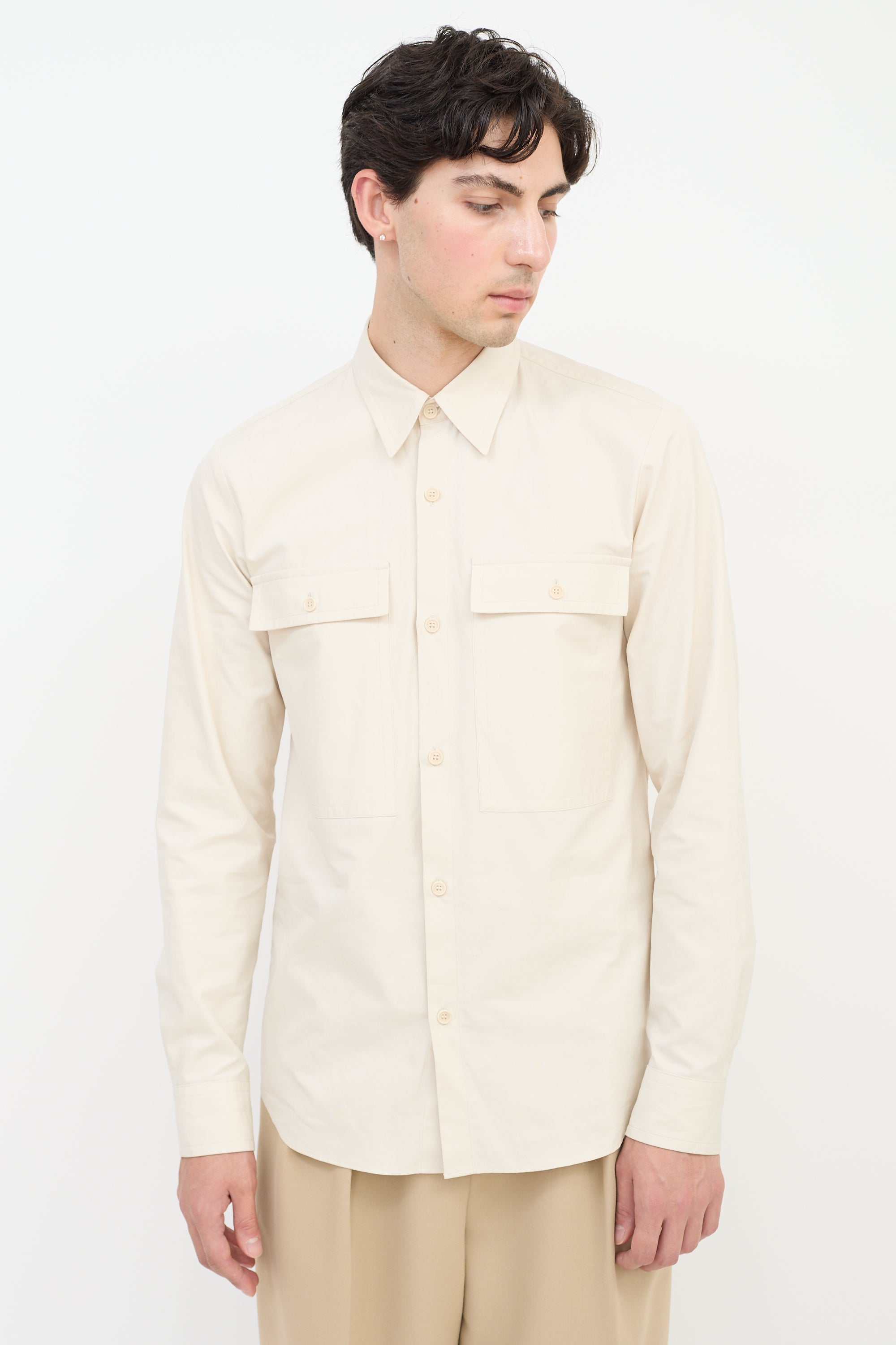 Pre-owned Dries Van Noten beige cotton shirt featuring a point collar, button up front, two buttoned flap pockets at chest, and long sleeves with pleated and buttoned cuffs.