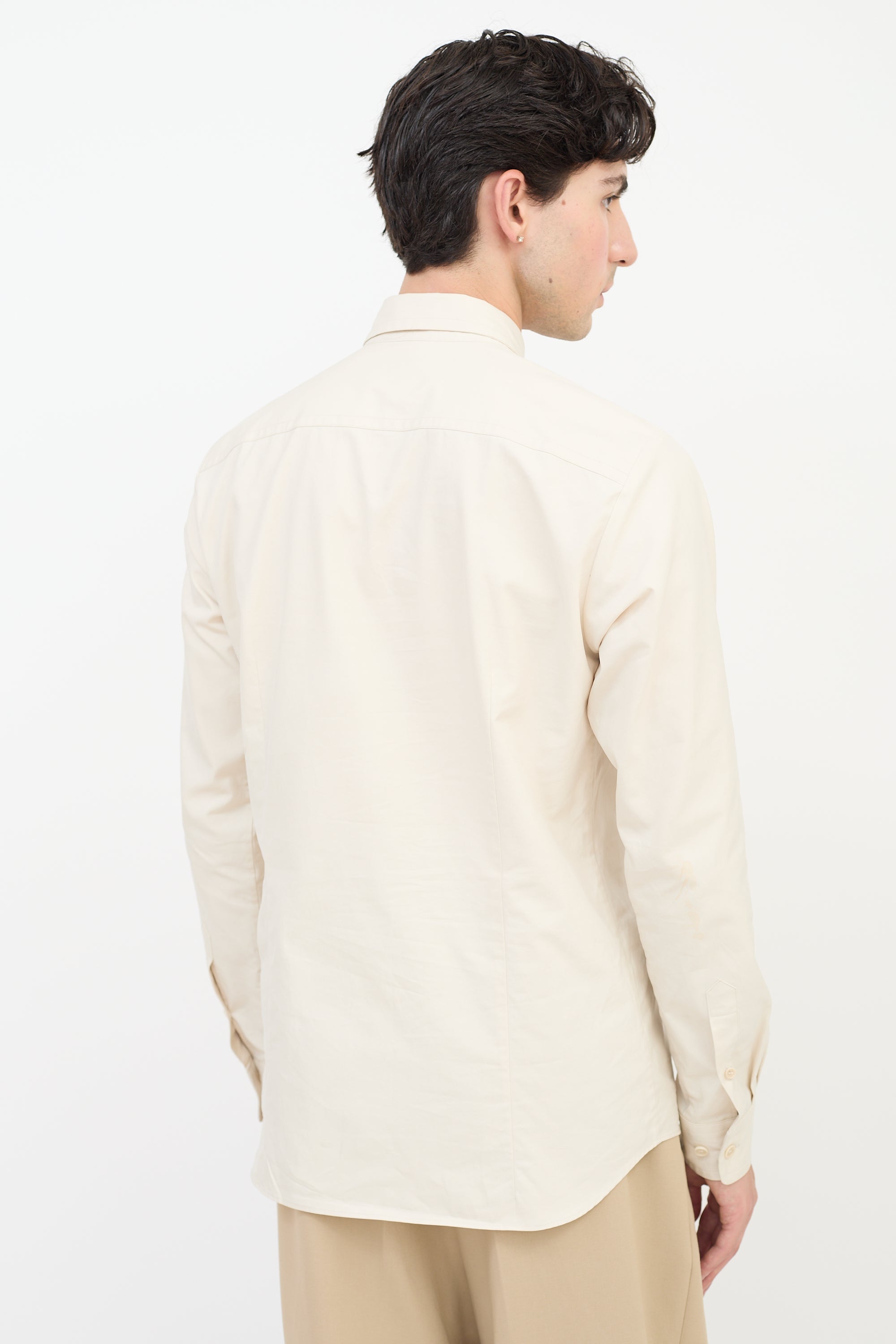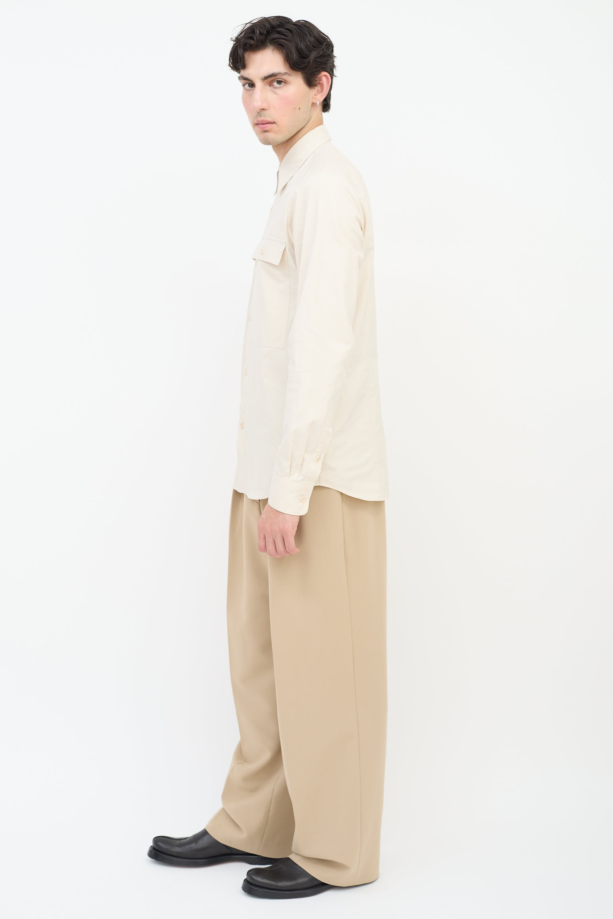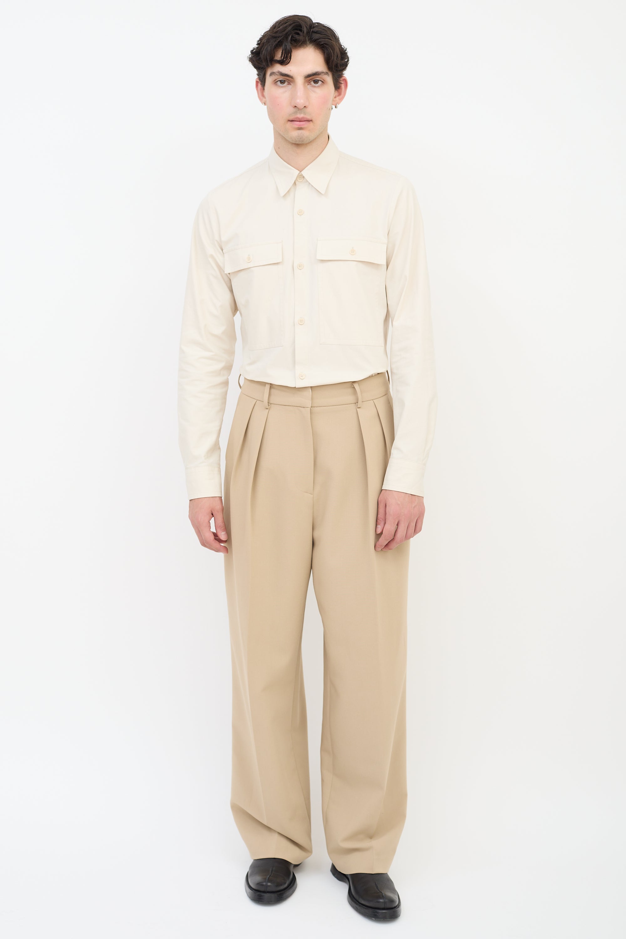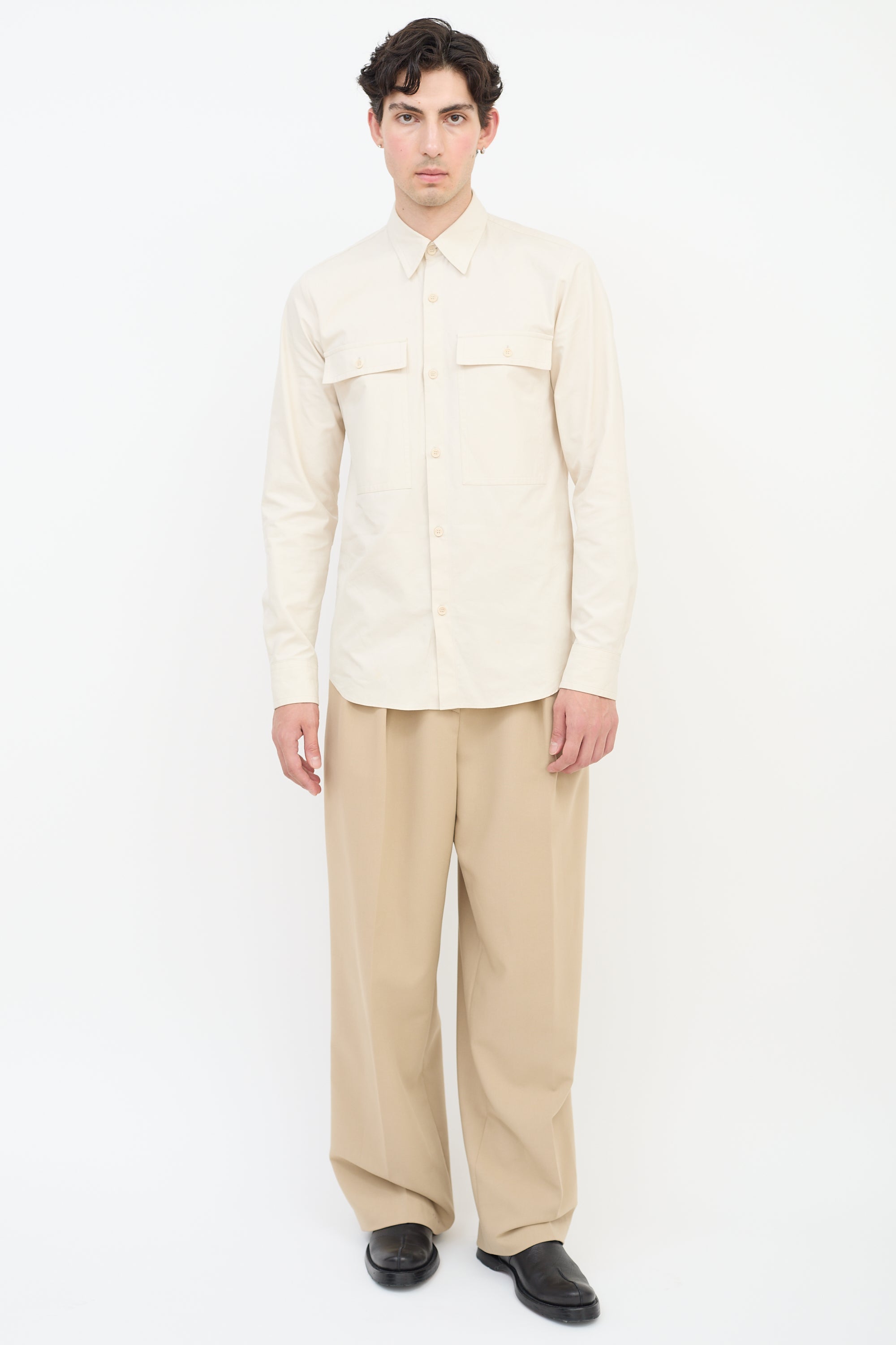 Pre-owned Dries Van Noten beige cotton shirt featuring a point collar, button up front, two buttoned flap pockets at chest, and long sleeves with pleated and buttoned cuffs.