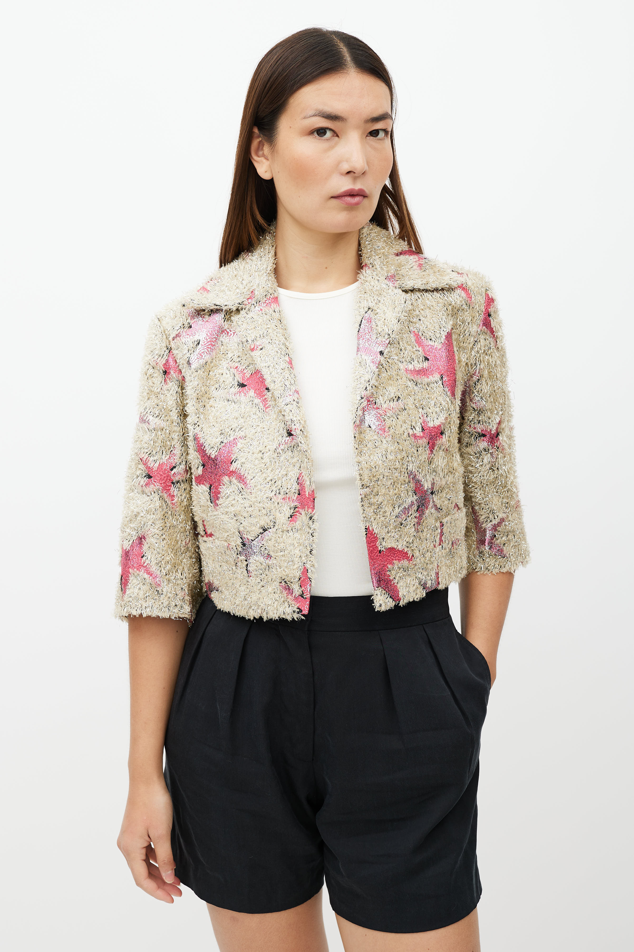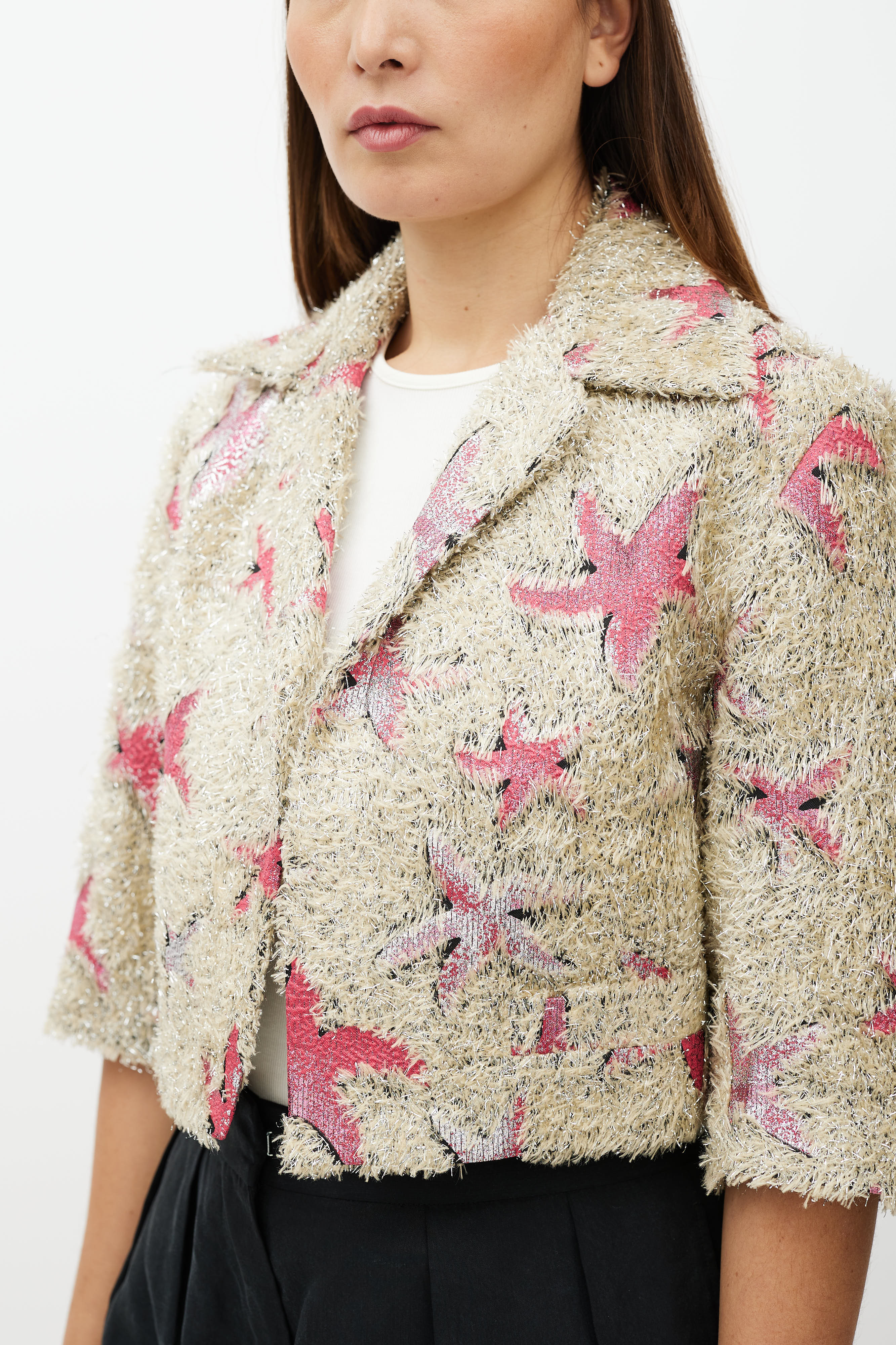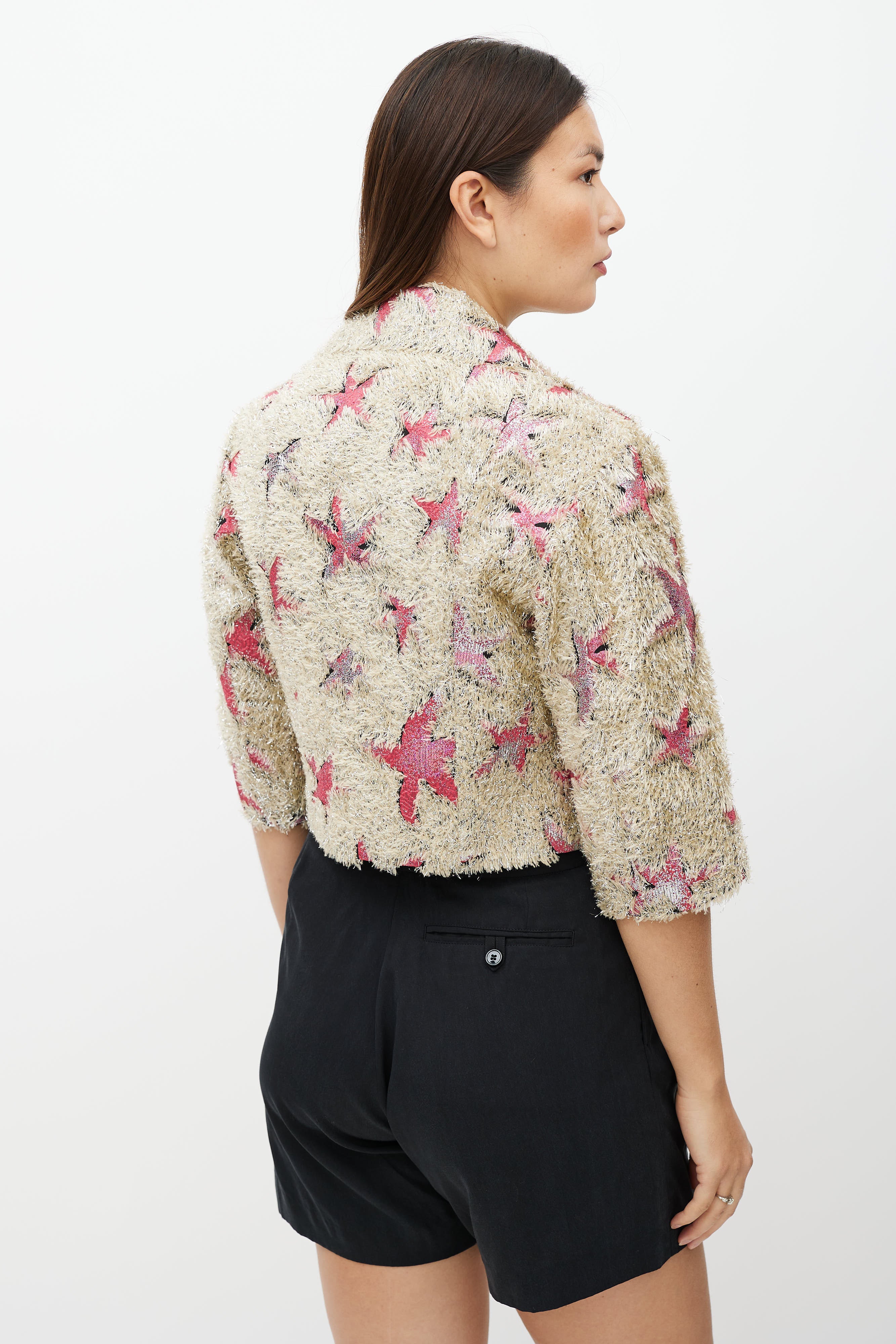 Pre-owned Dries Van Noten Spring Summer 2018 beige jacket featuring a pink and silver star pattern and fringe texture throughout, notch lapel collar, three quarter length sleeves, panelled construction at back, two slip pockets at front waist, and open front. Lined.