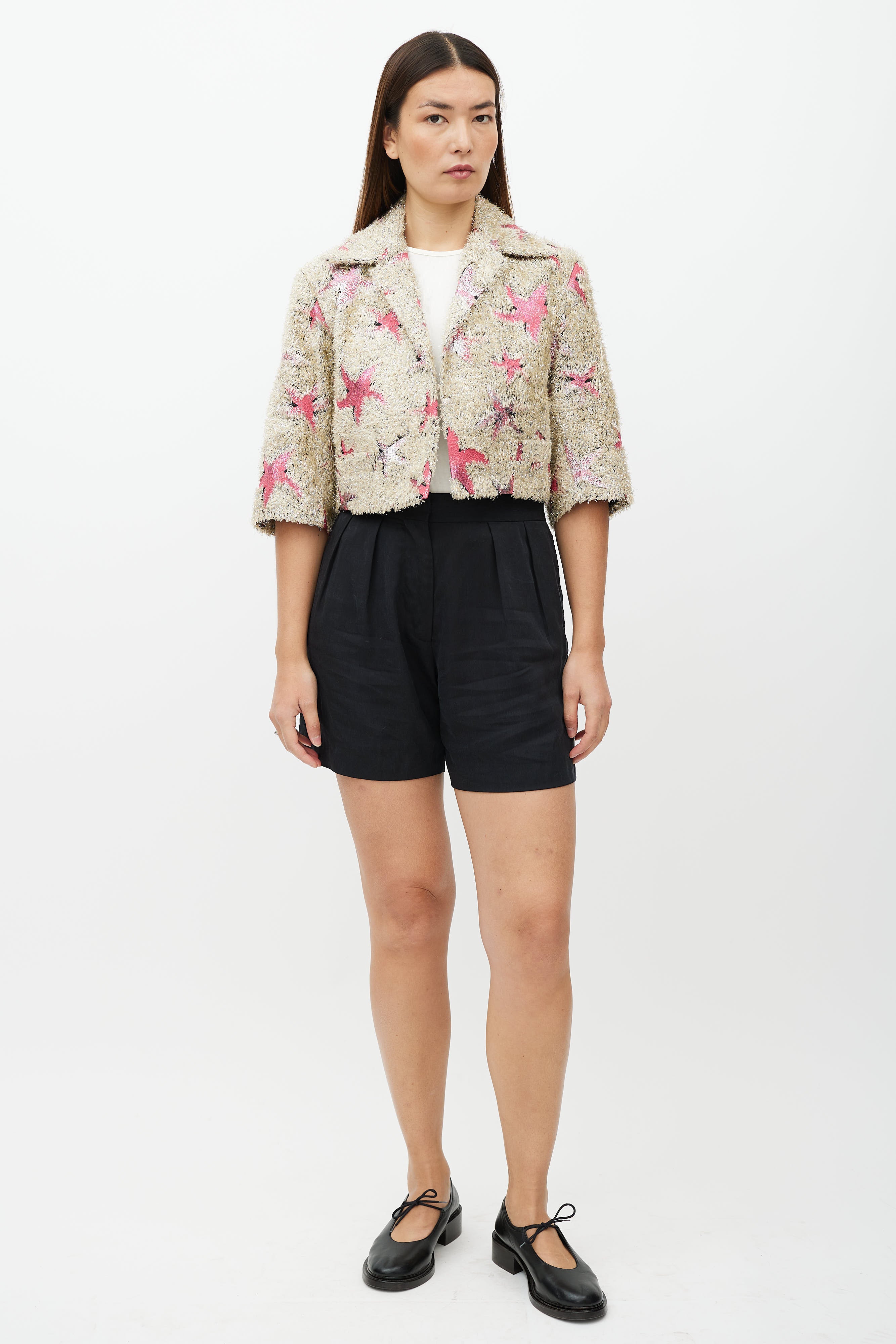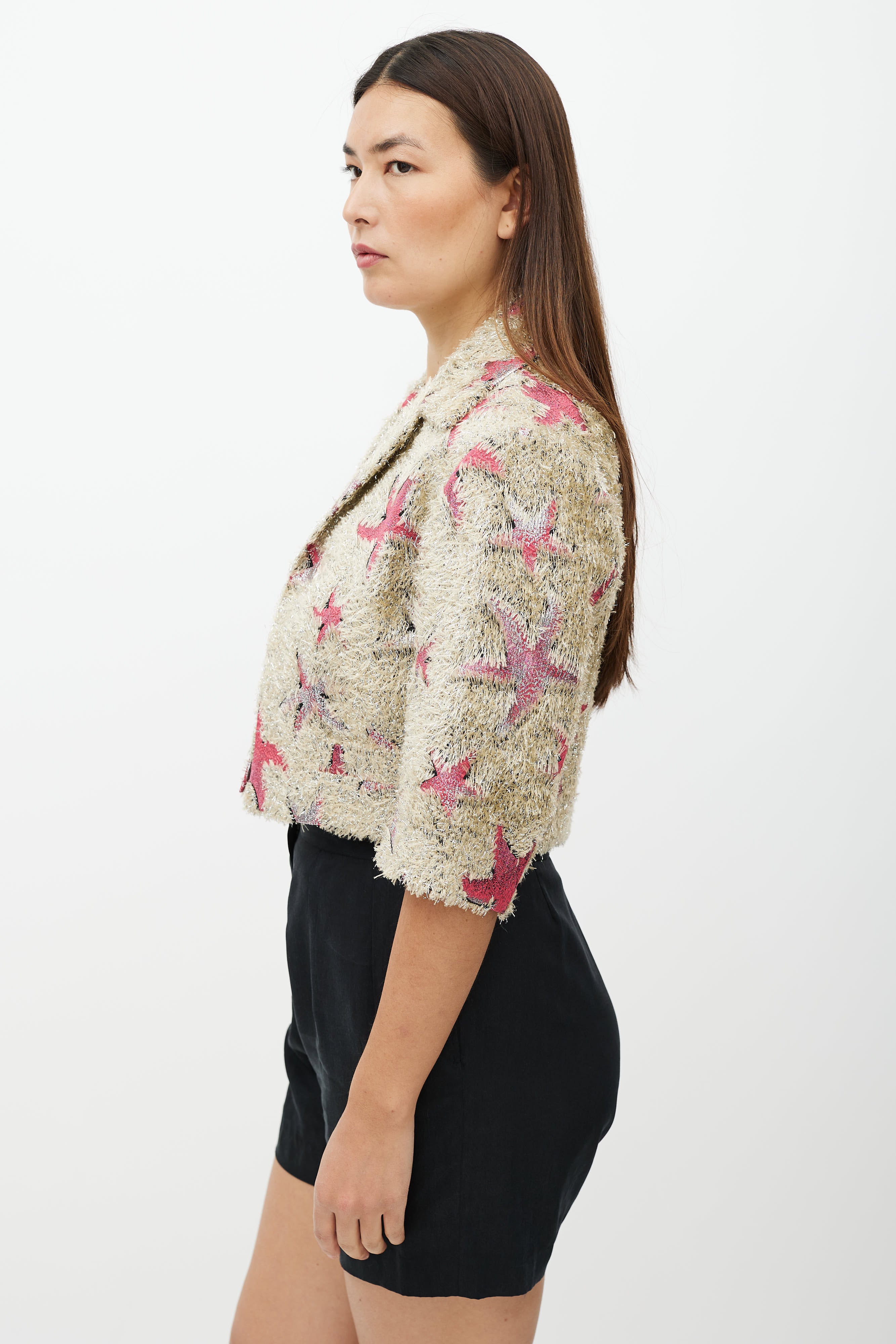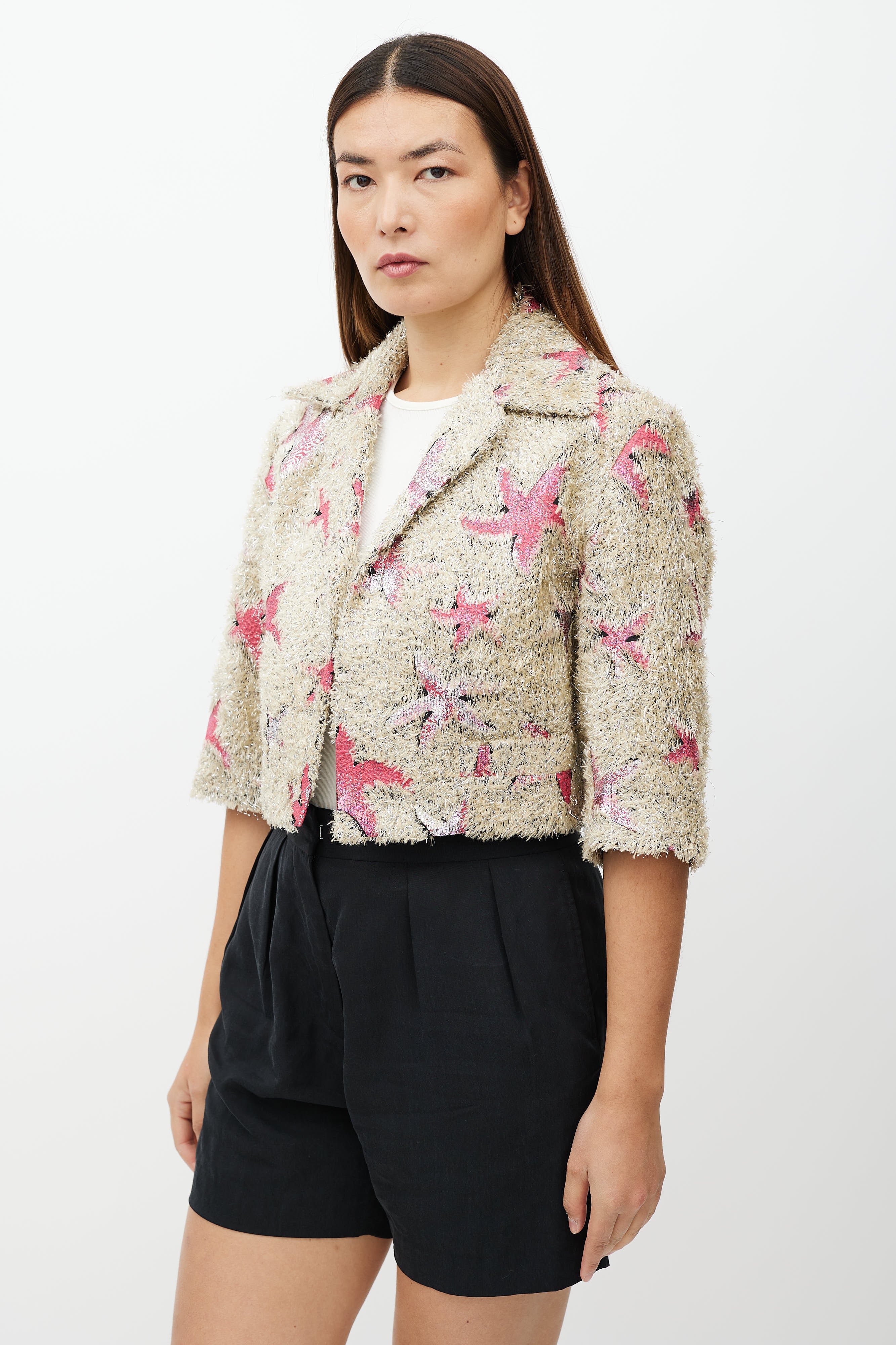 Pre-owned Dries Van Noten Spring Summer 2018 beige jacket featuring a pink and silver star pattern and fringe texture throughout, notch lapel collar, three quarter length sleeves, panelled construction at back, two slip pockets at front waist, and open front. Lined.
