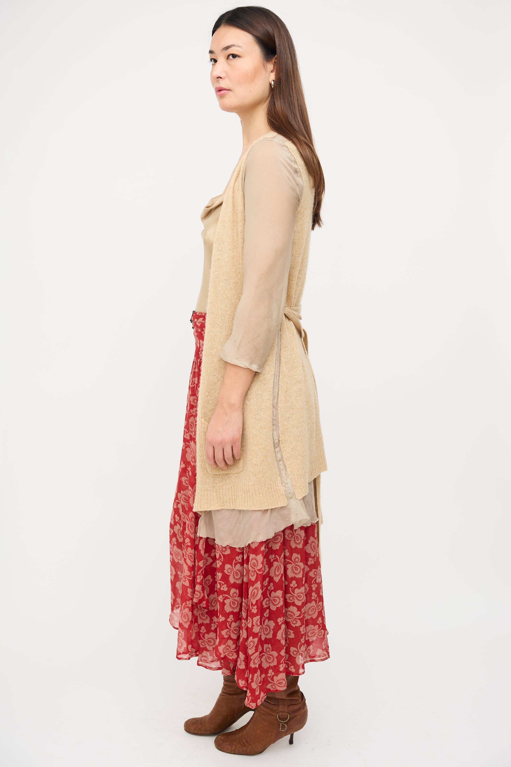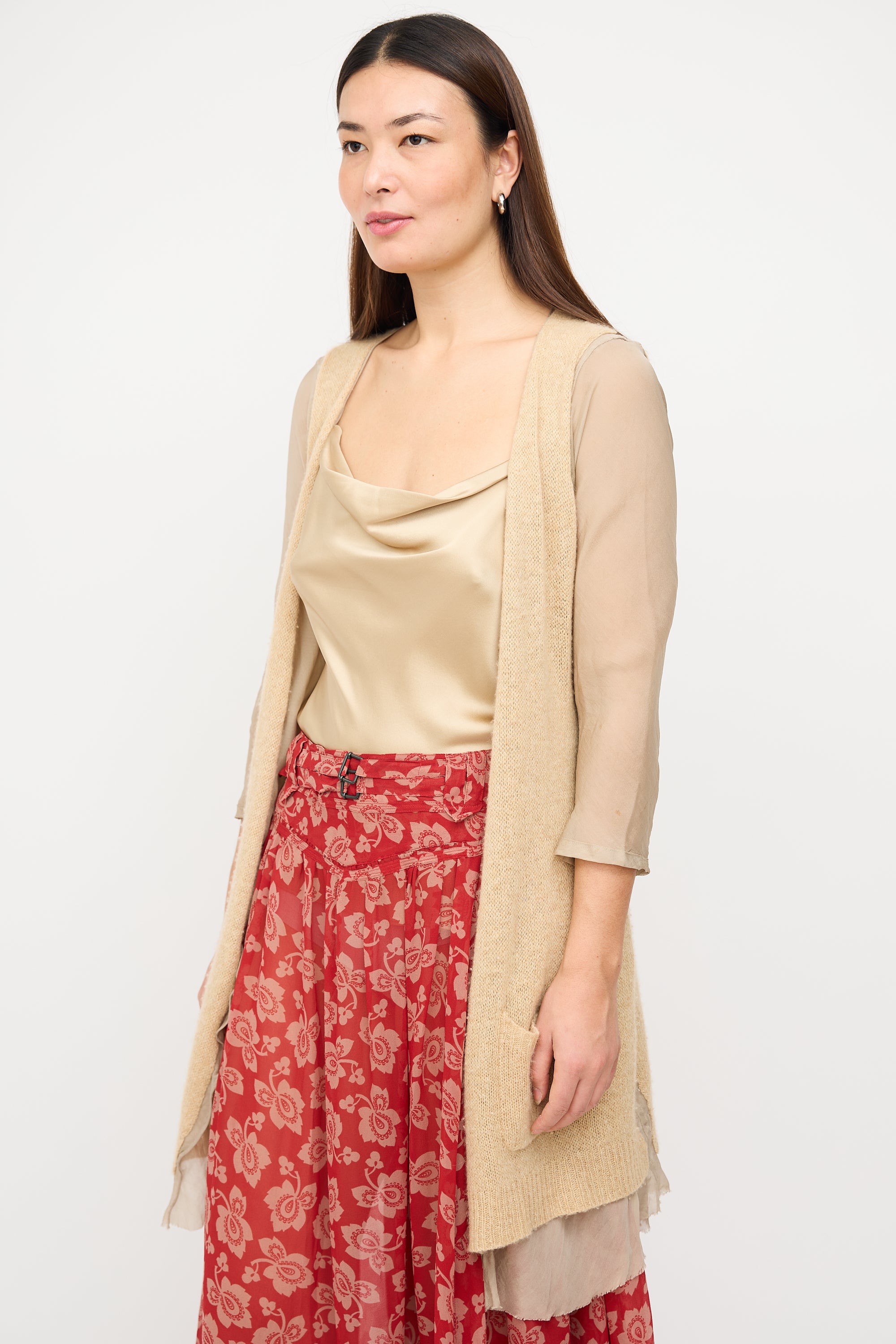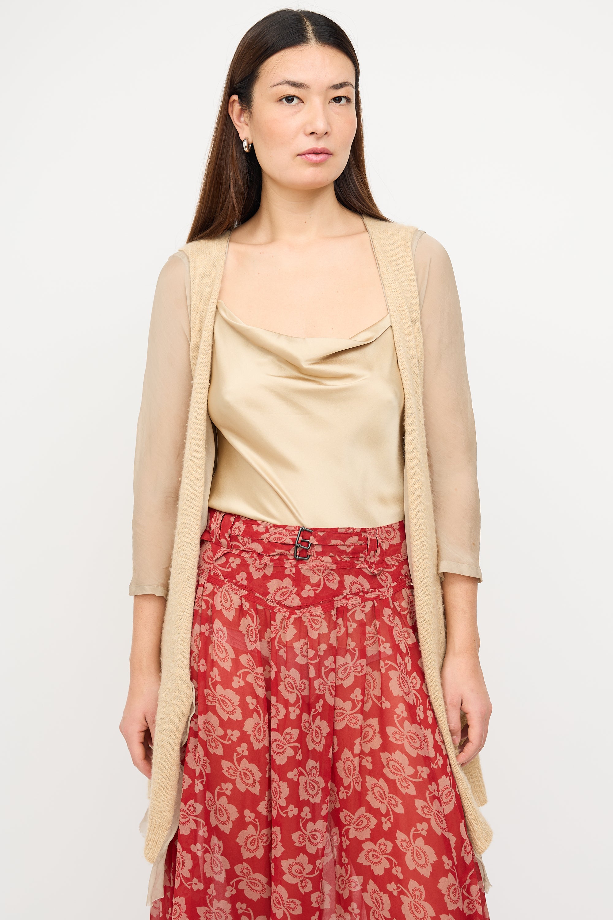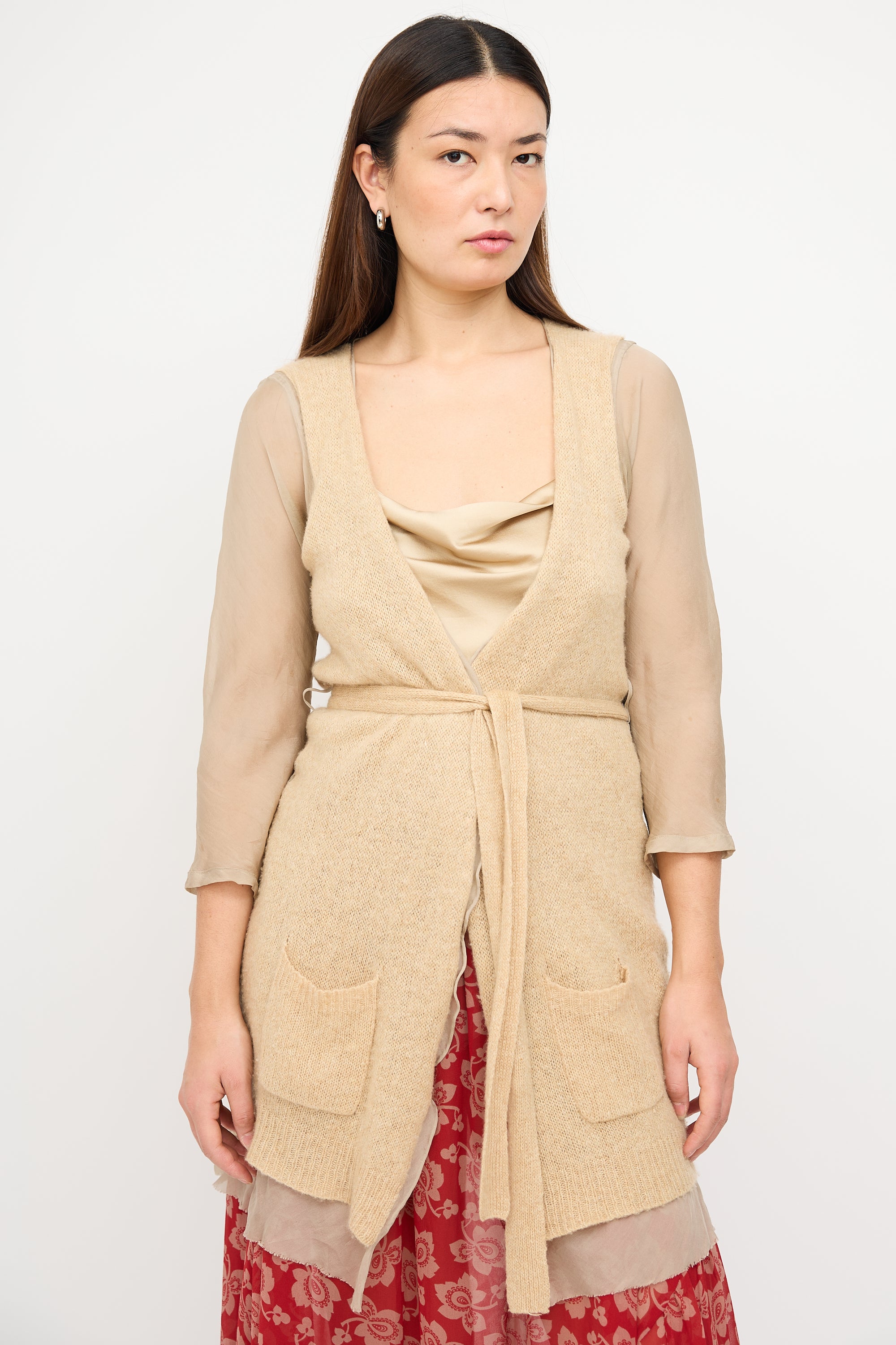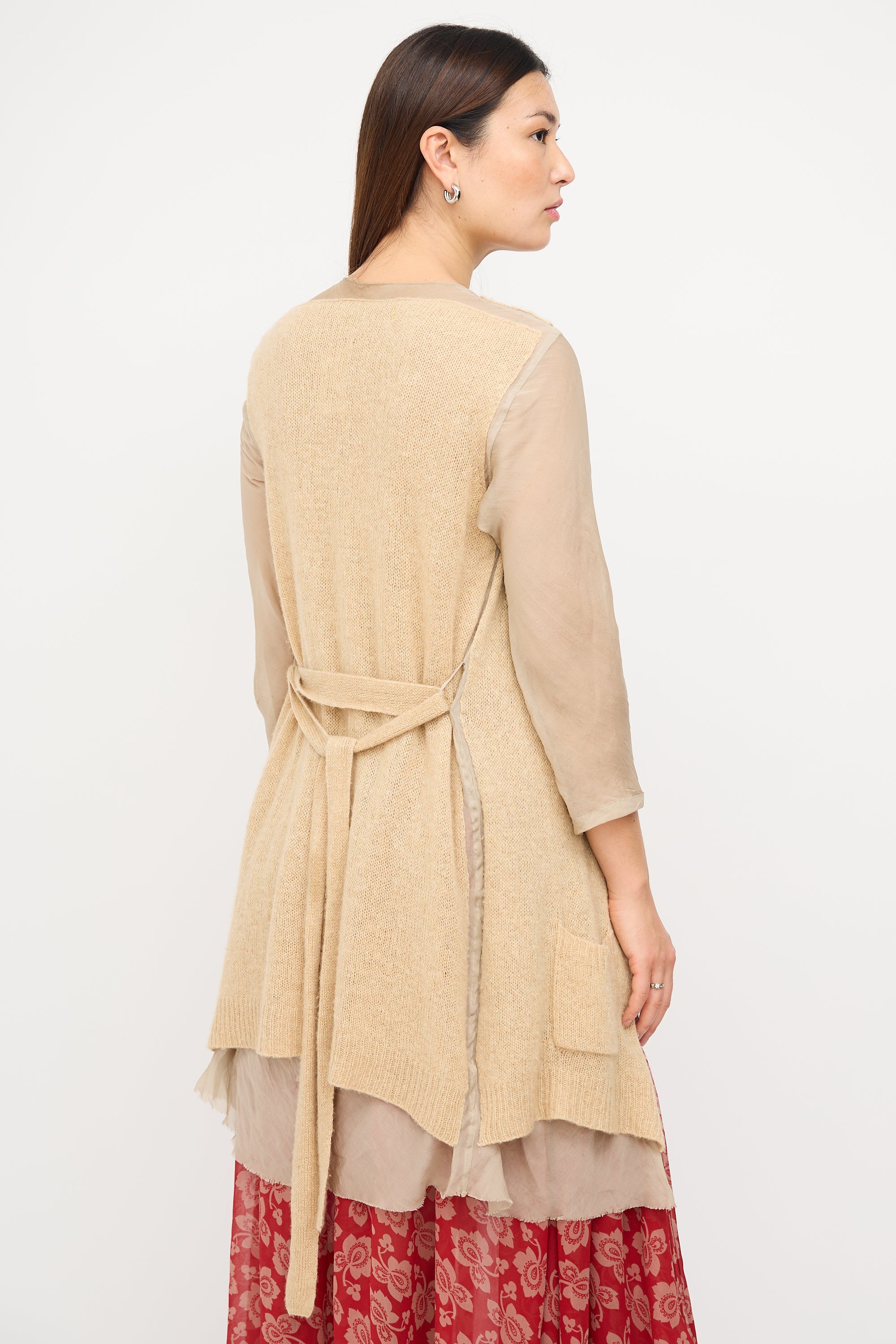 Pre-owned Dries Van Noten beige cardigan featuring silk and cashmere knit layered design, open front, tie belt, two front pockets, and sheer sleeves.