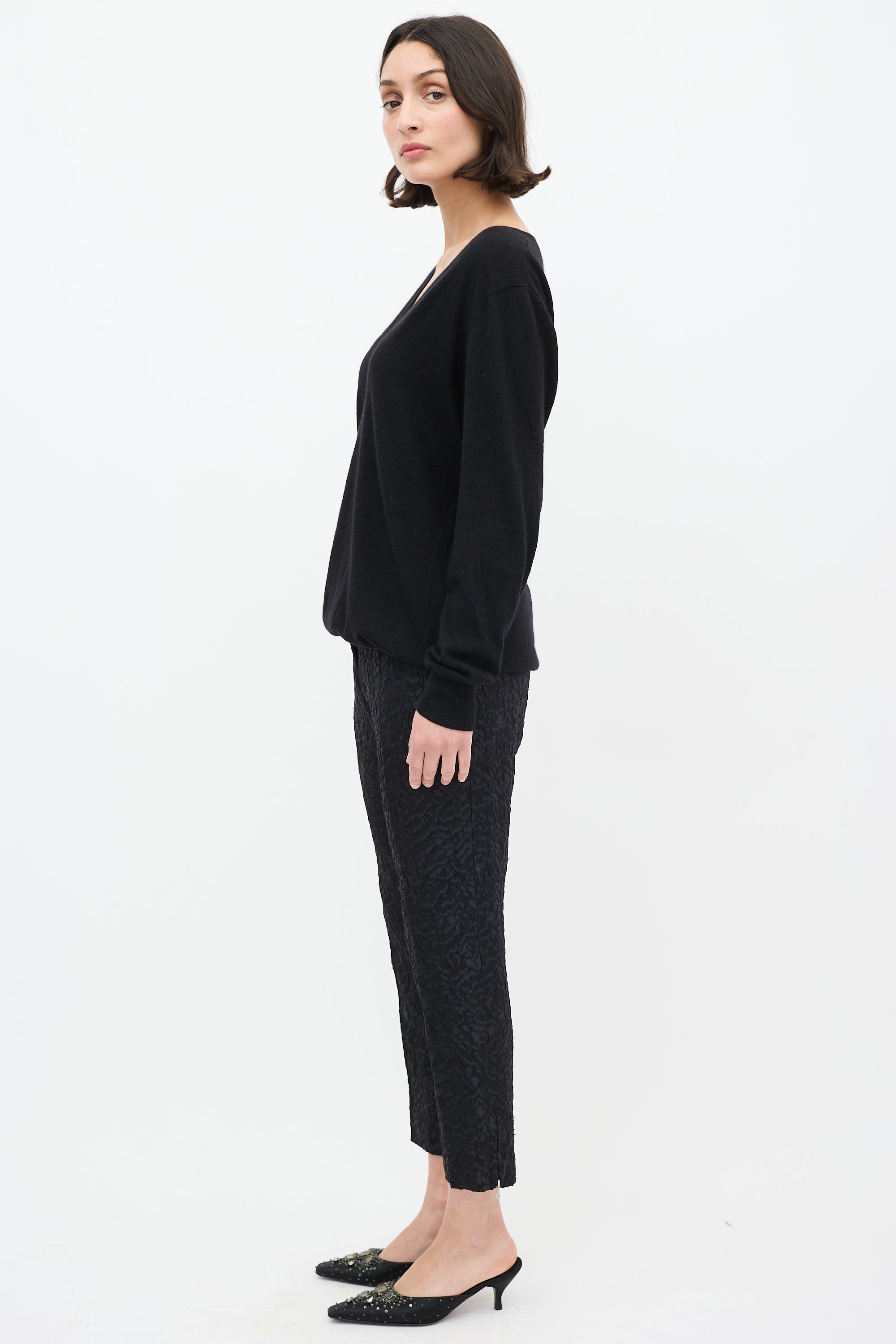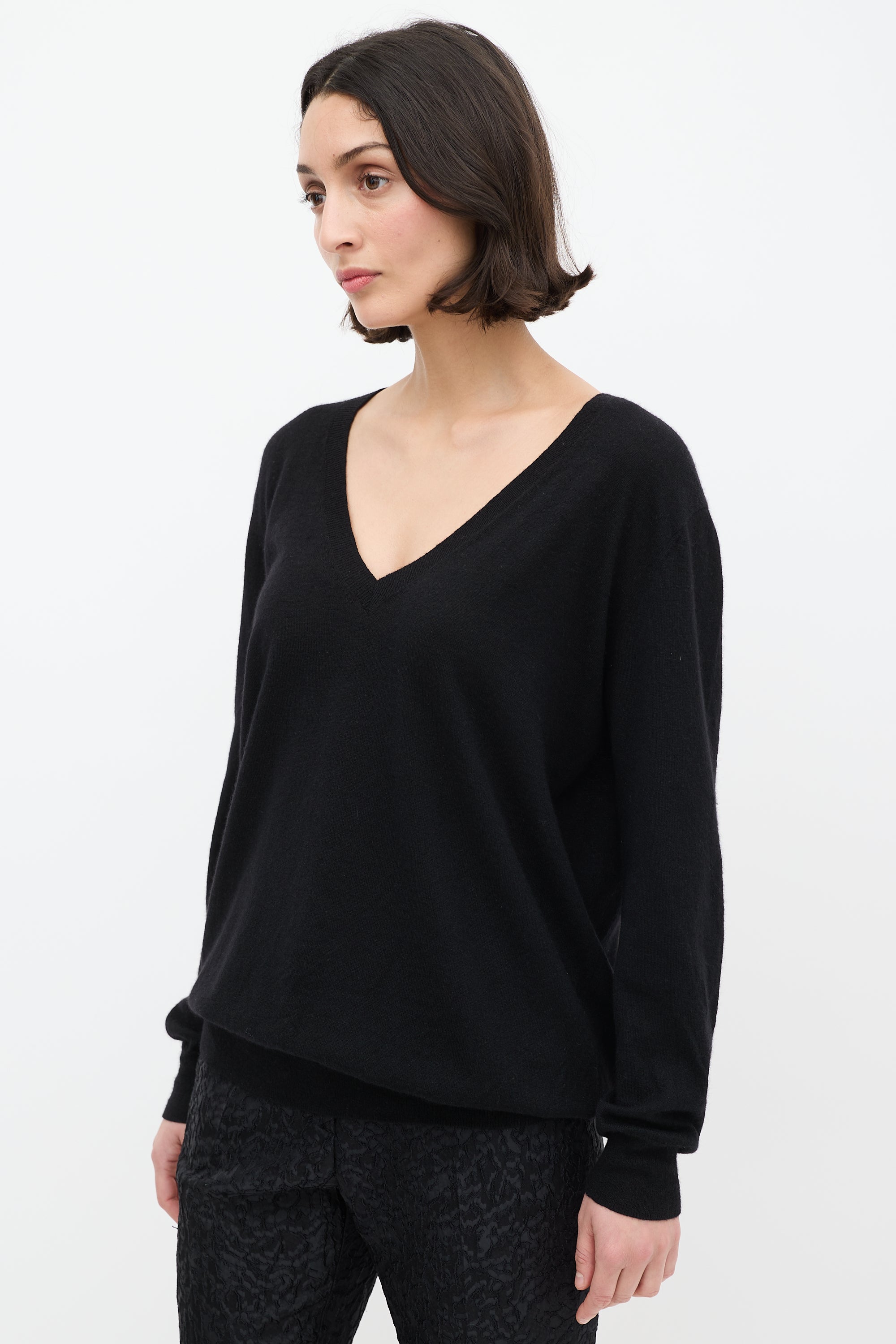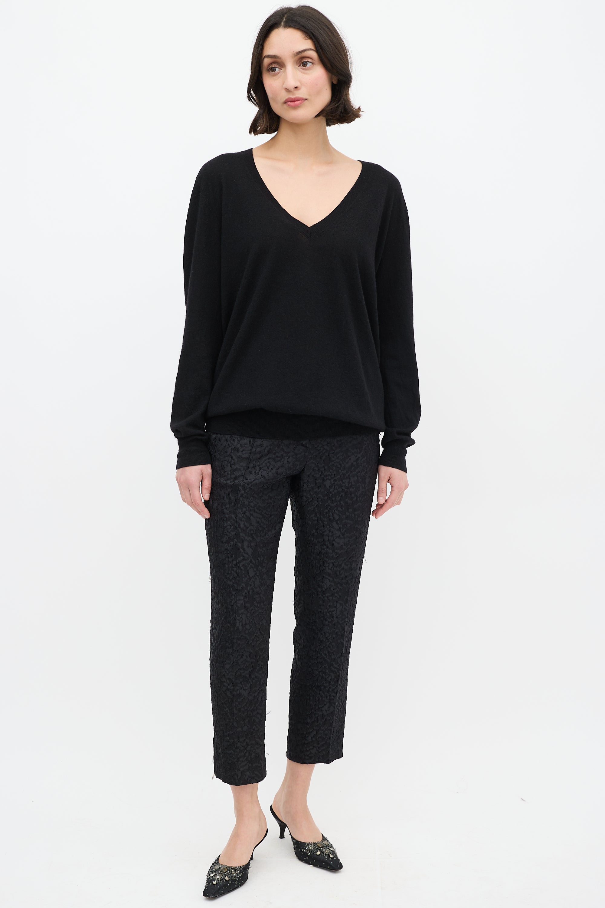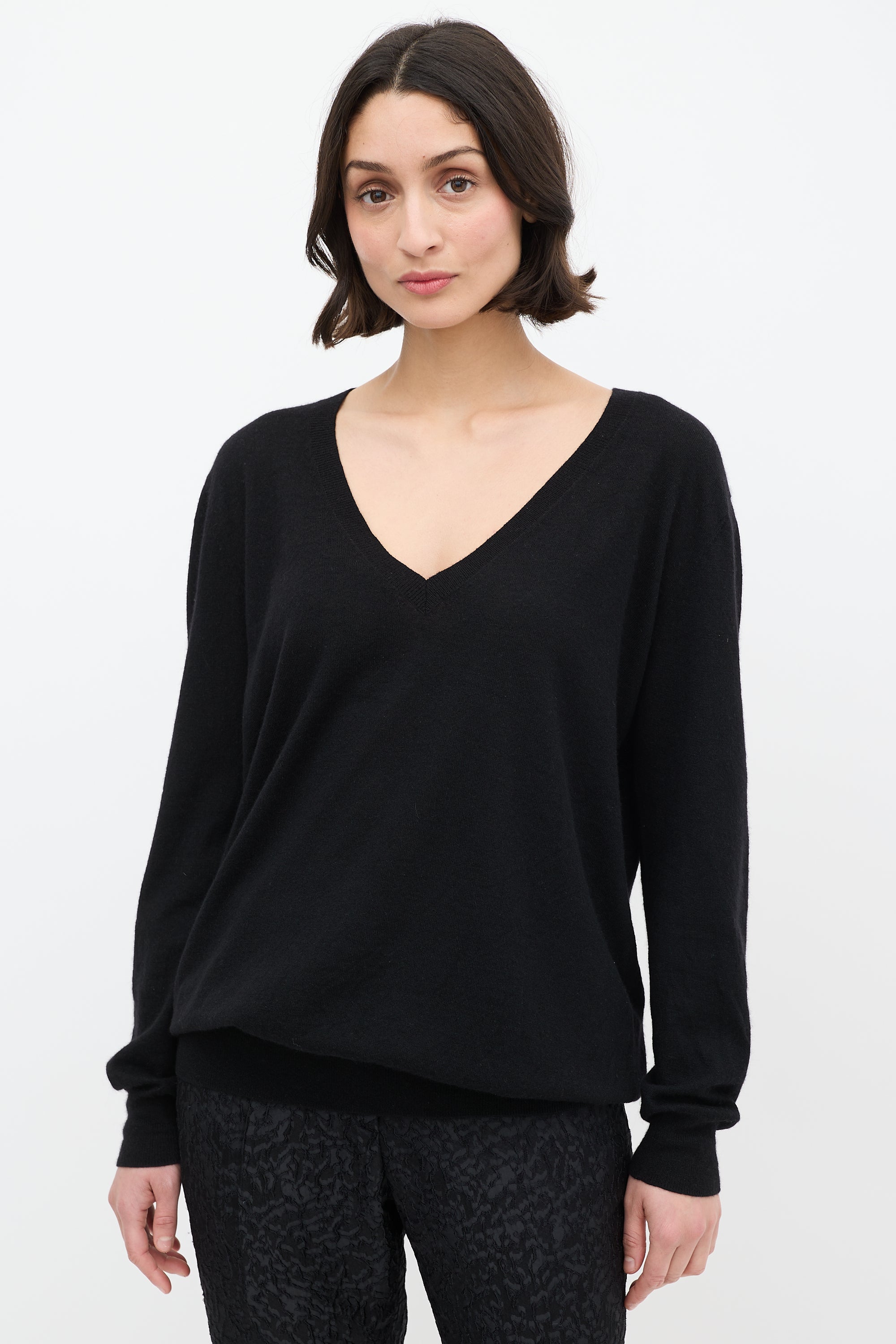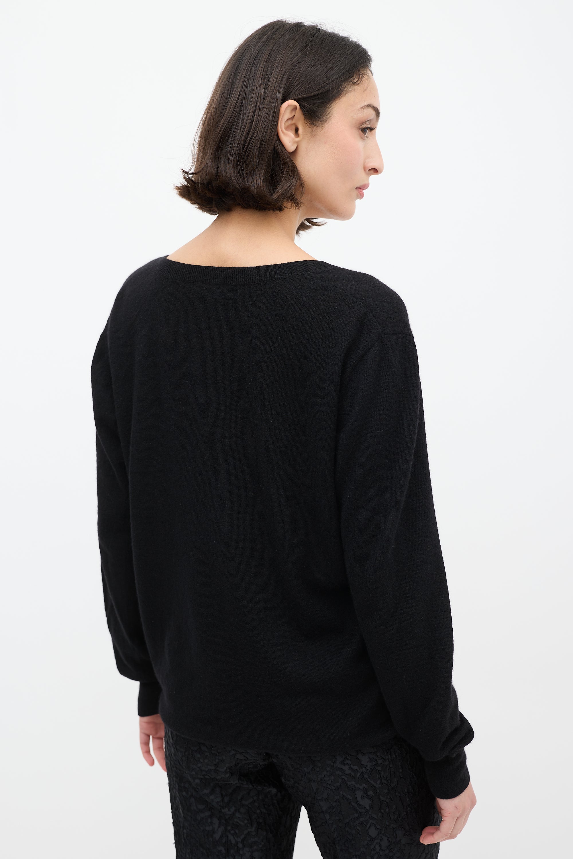 Pre-owned Dries Van Noten black cashmere and silk blend knit sweater featuring a deep V-neck, long sleeves, and ribbed neck, hem, and cuffs.