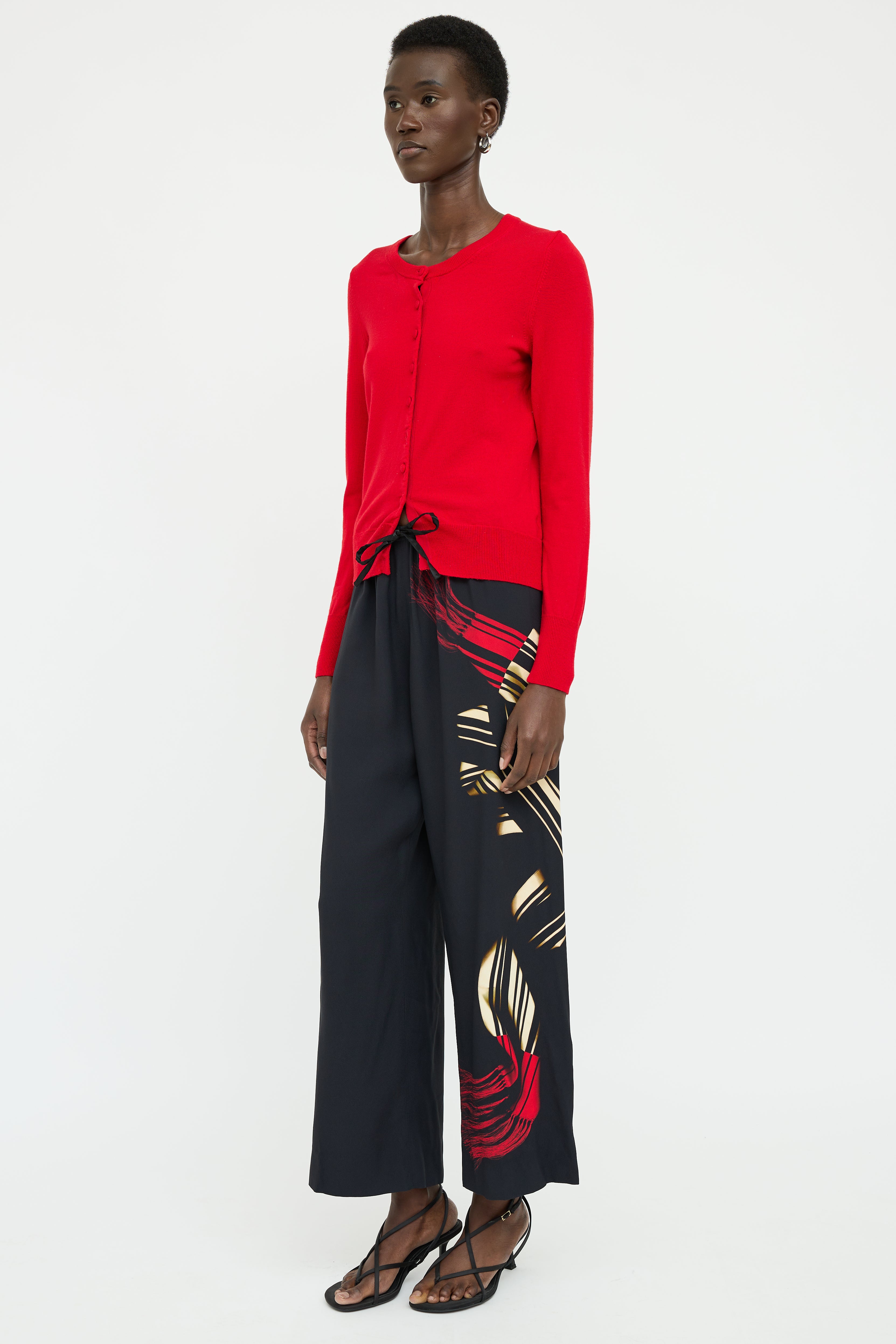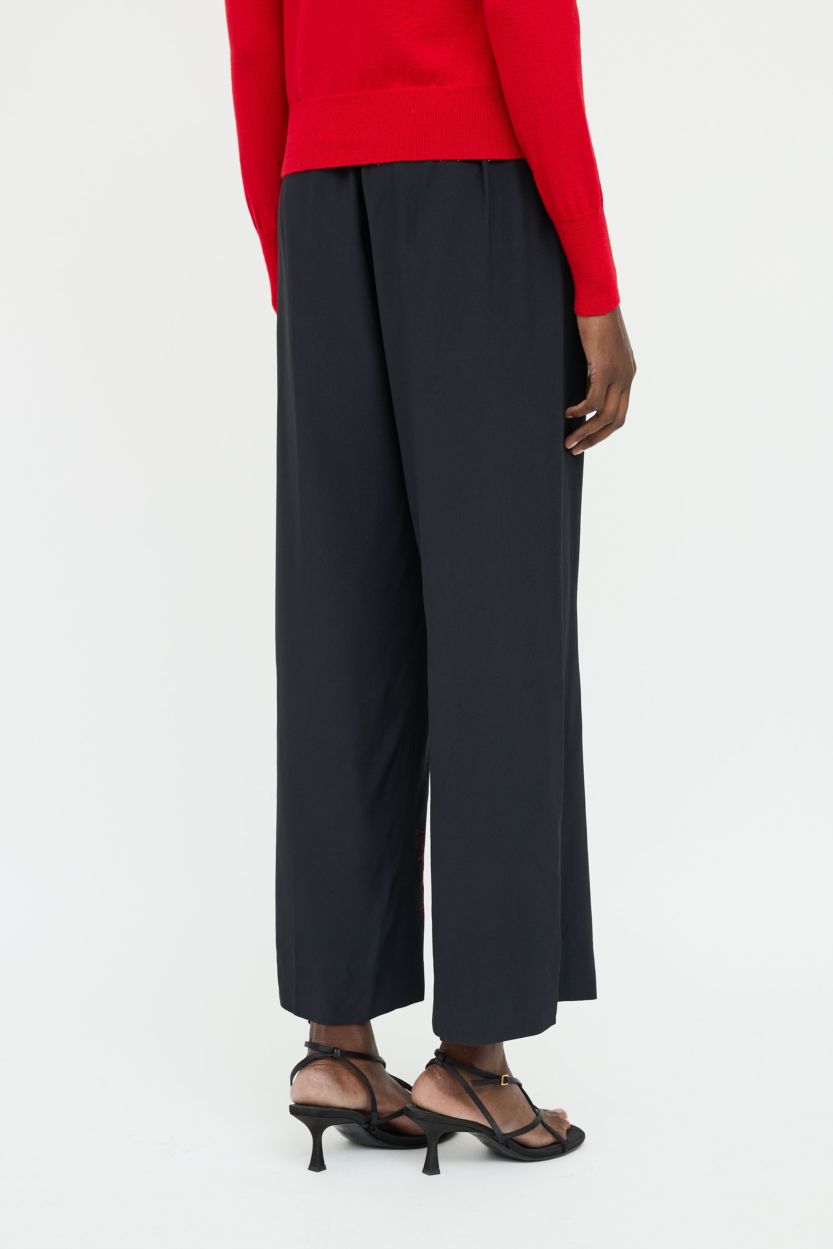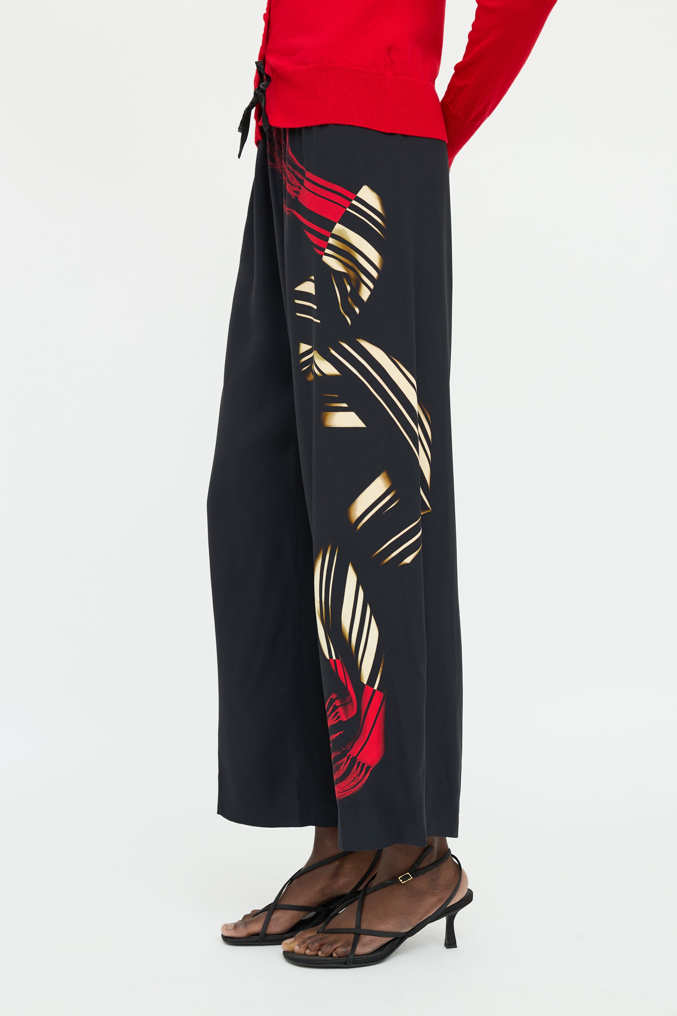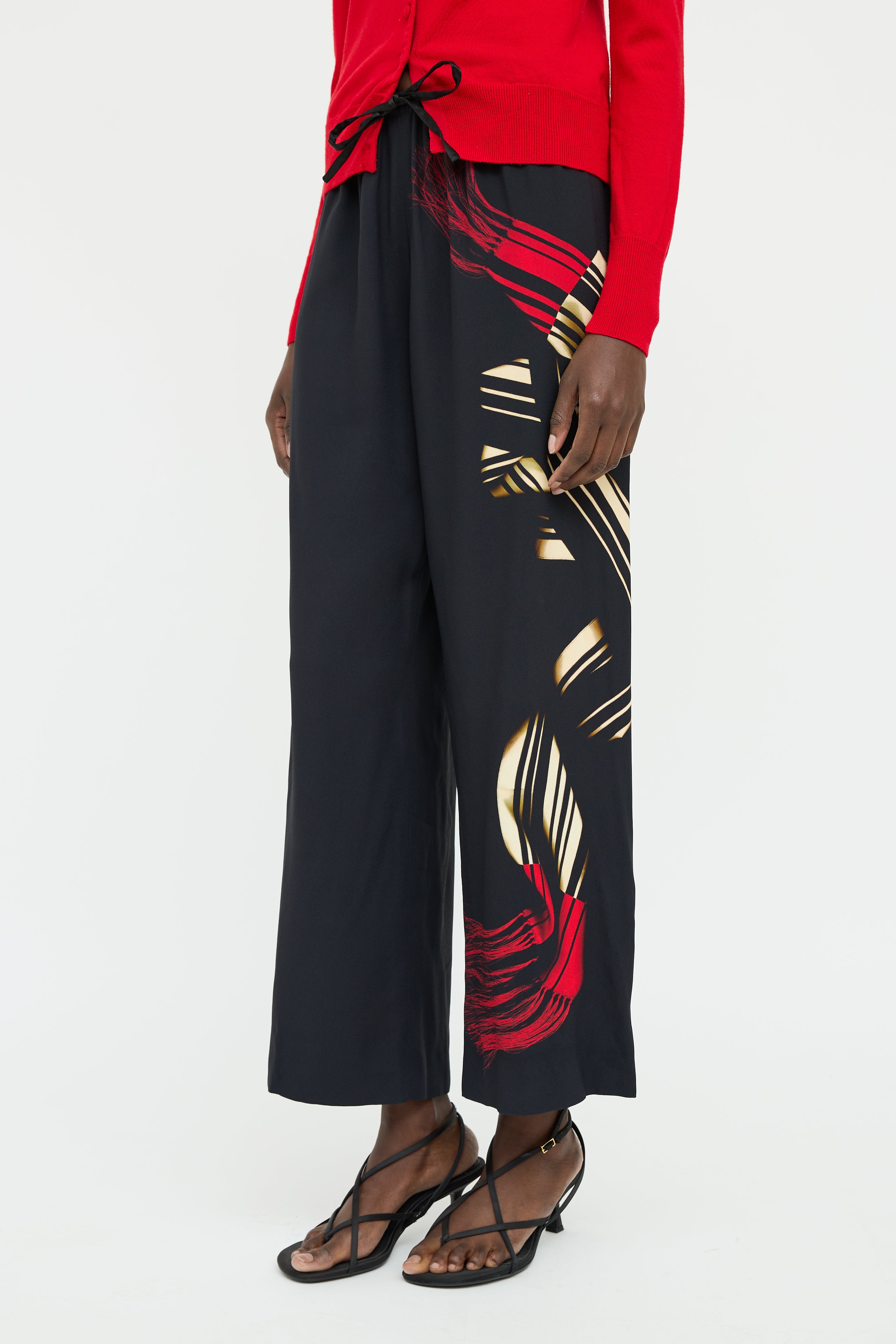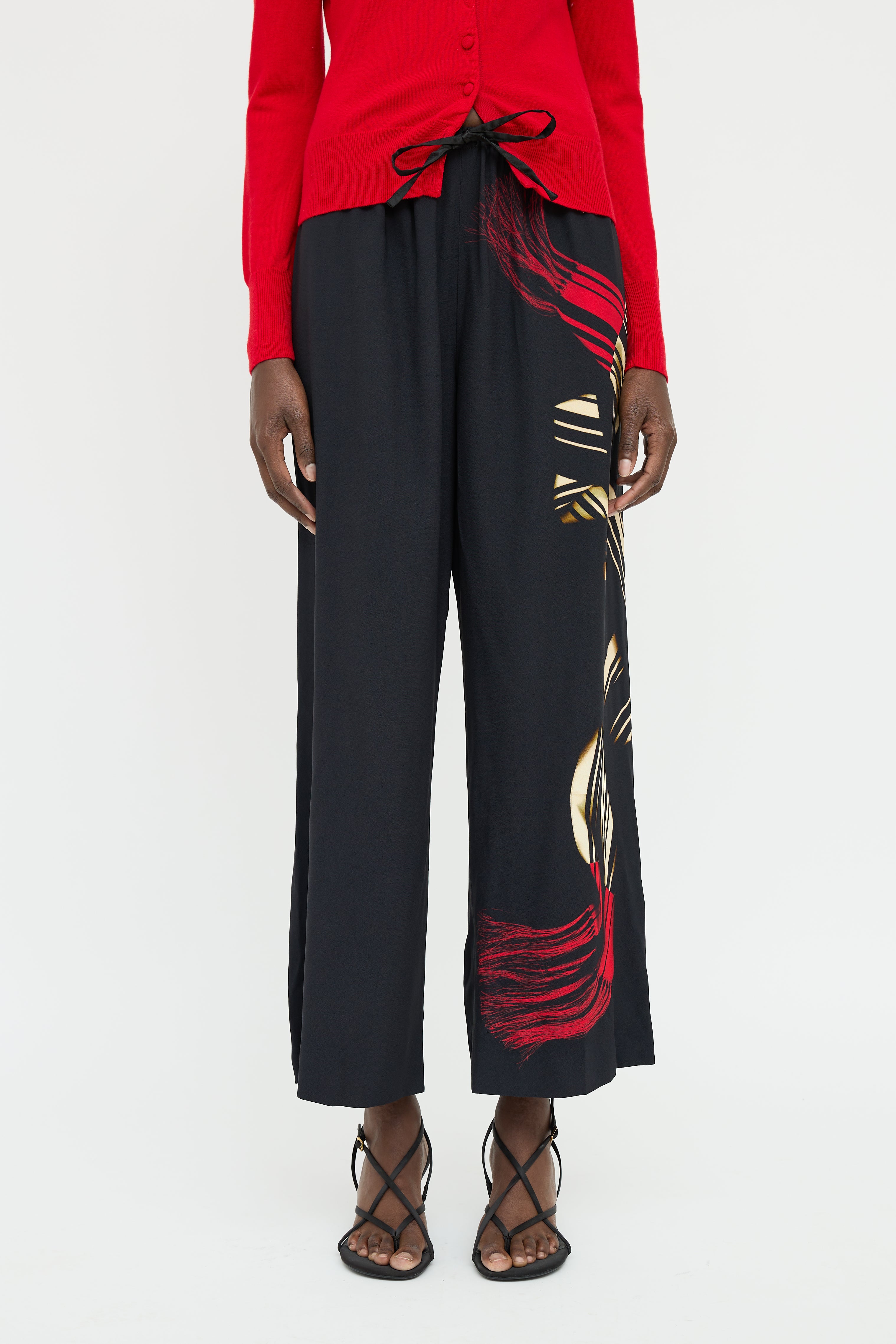 Pre-owned Dries Van Noten black pants featuring elastic waist with drawstring with beige and red graphic print along left leg.