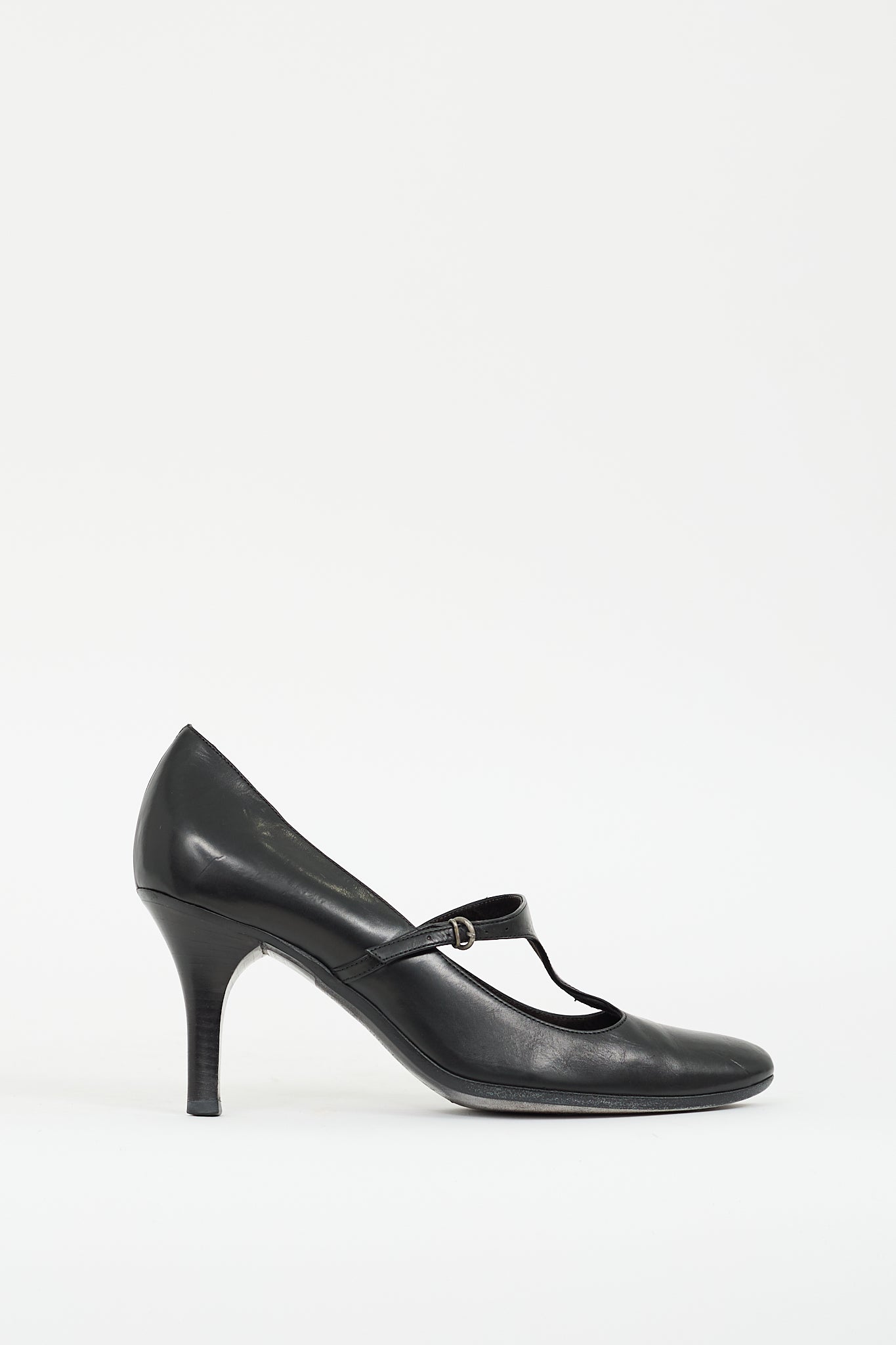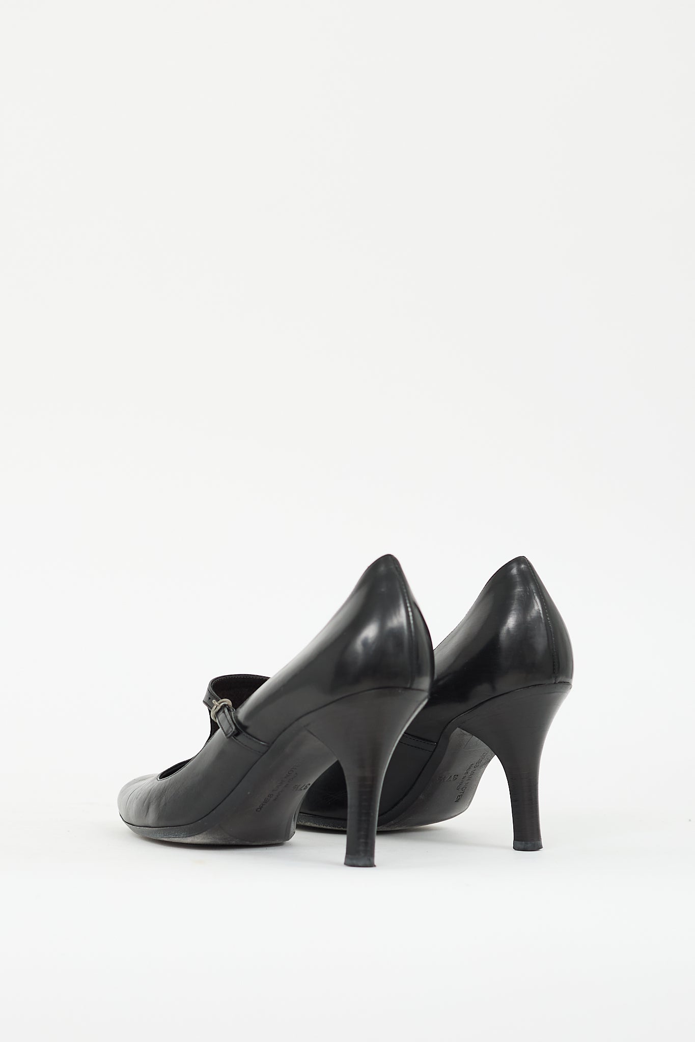 Pre-owned Dries Van Noten black leather Mary Jane pumps featuring almond toe, T-strap at front, adjustable buckle closure, and stacked heel. Comes with original dust bag.