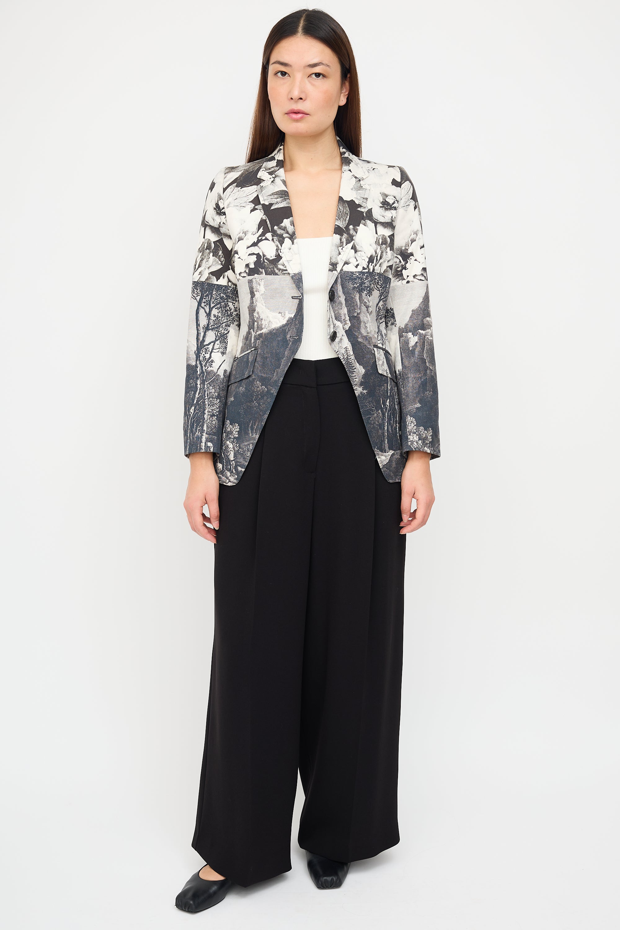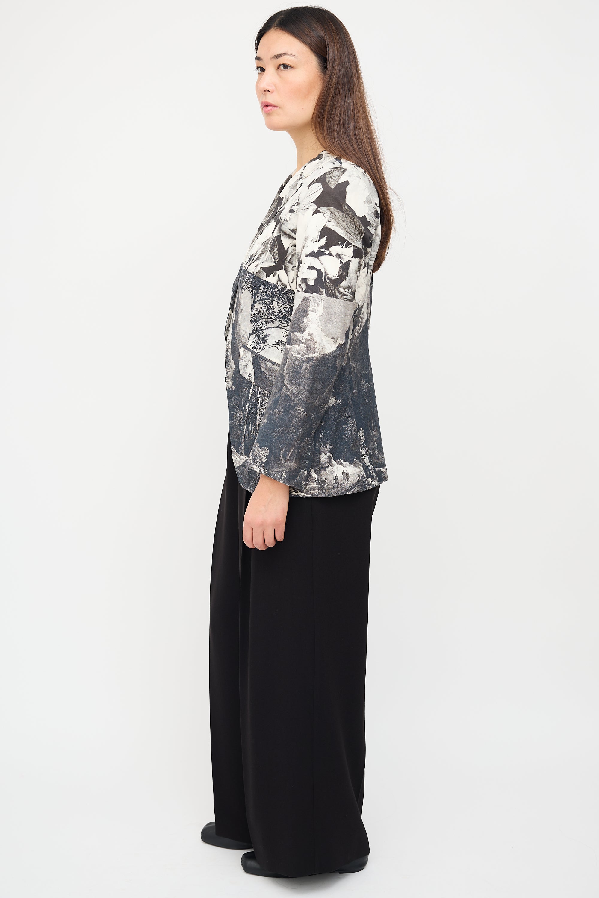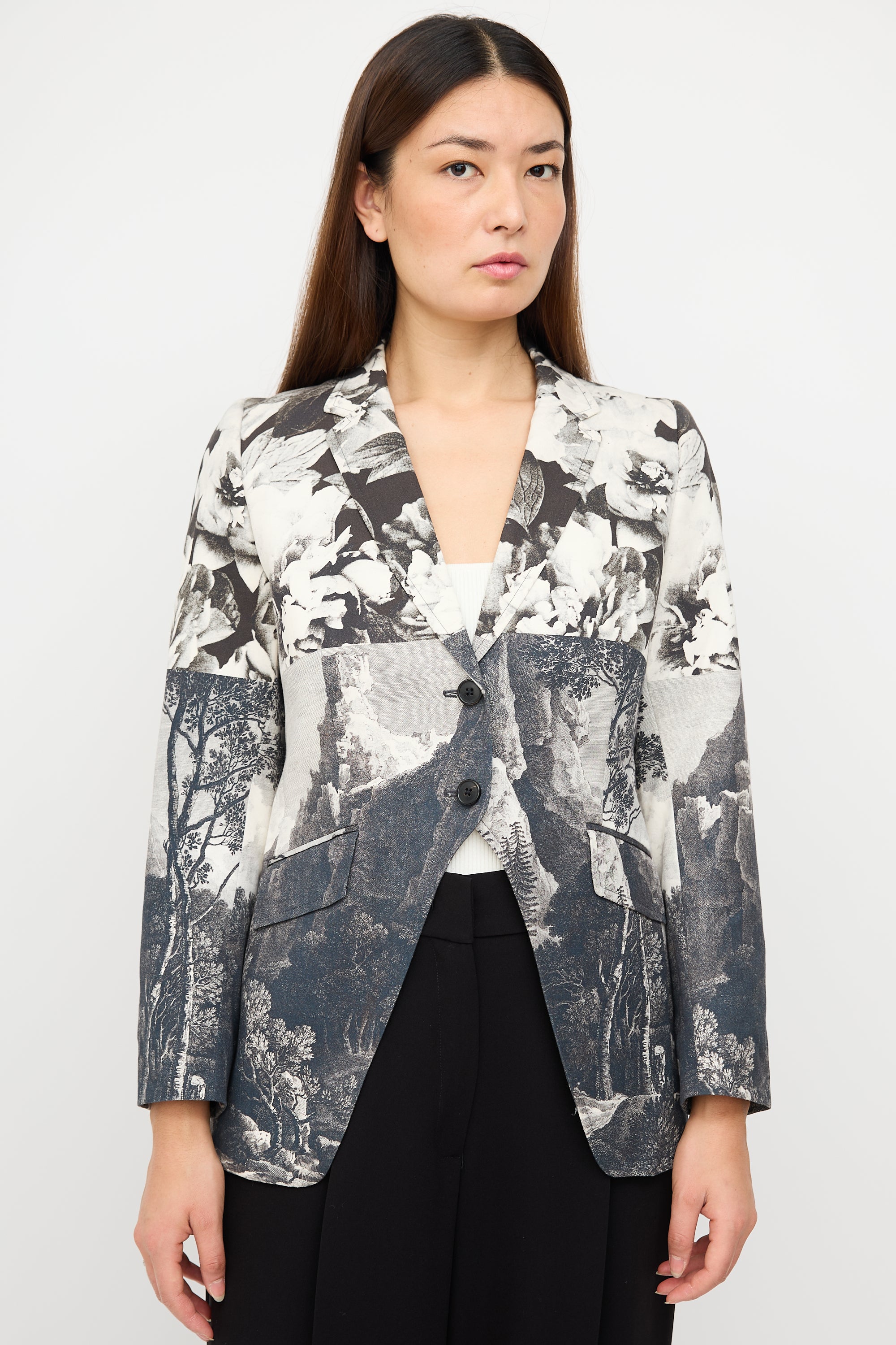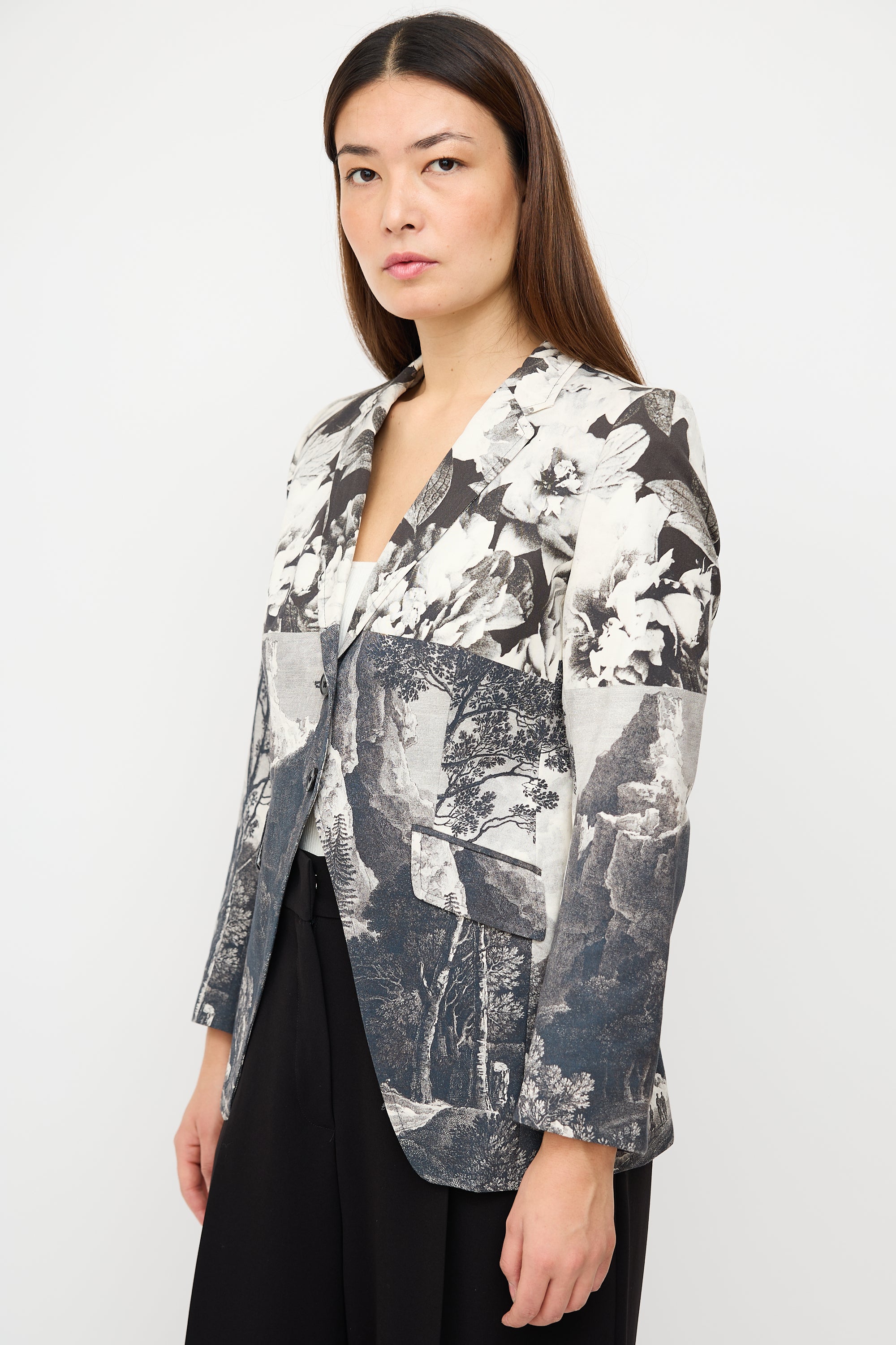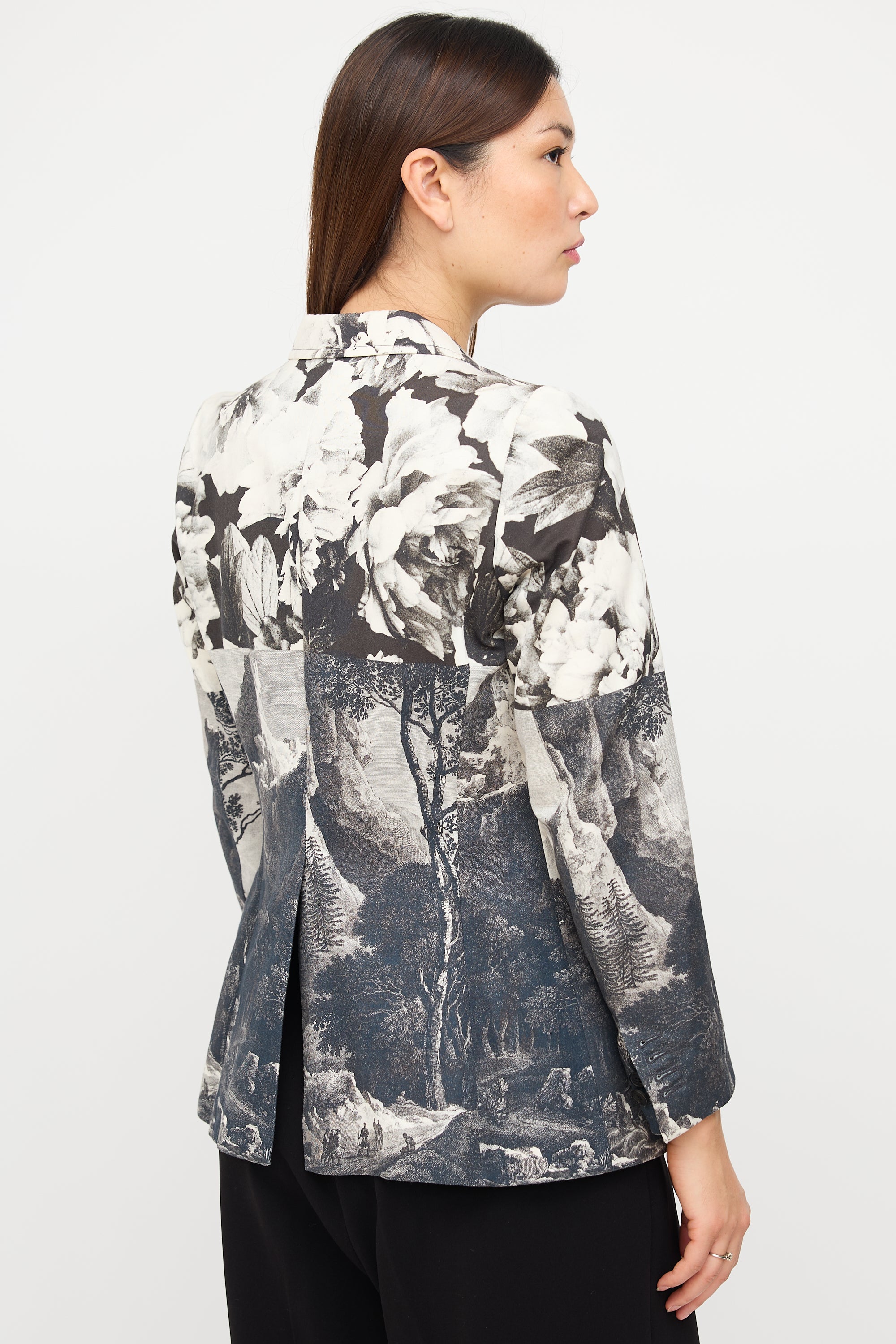 Pre-owned Dries Van Noten black, navy, grey, and white tailcoat blazer featuring mixed floral and landscape prints, notched collar, button front closure, two front pockets, back kick pleat, and buttoned cuffs. Lined.