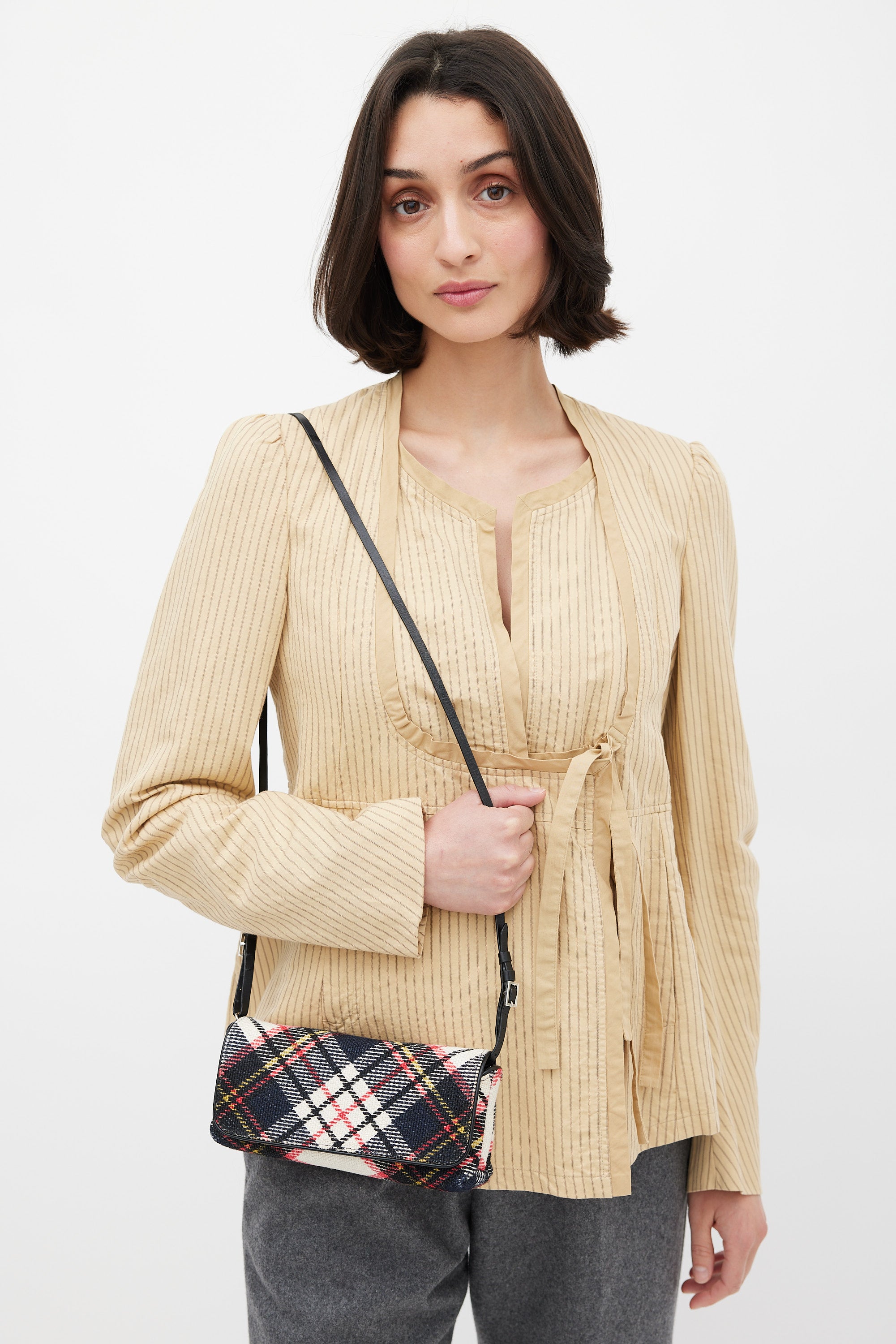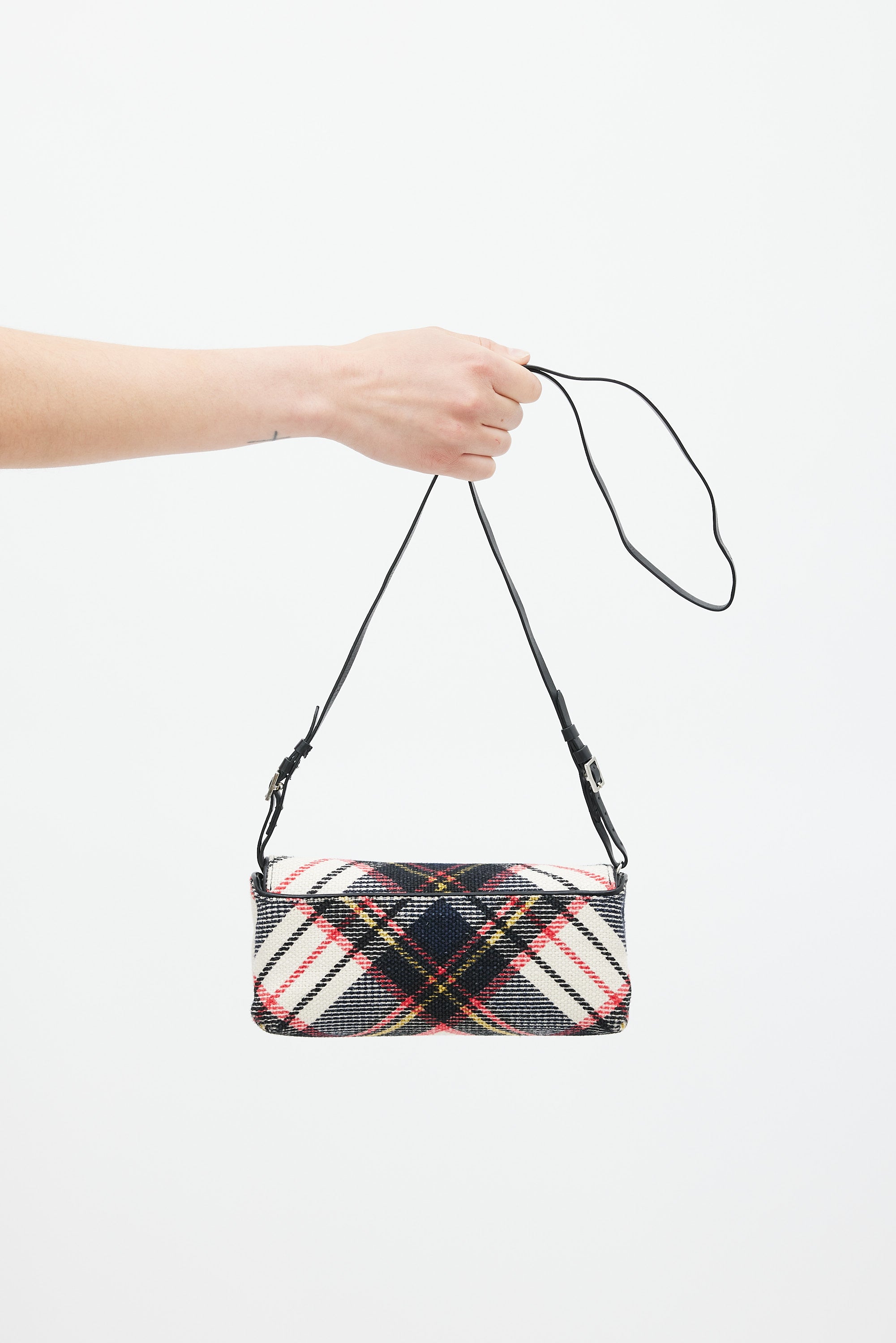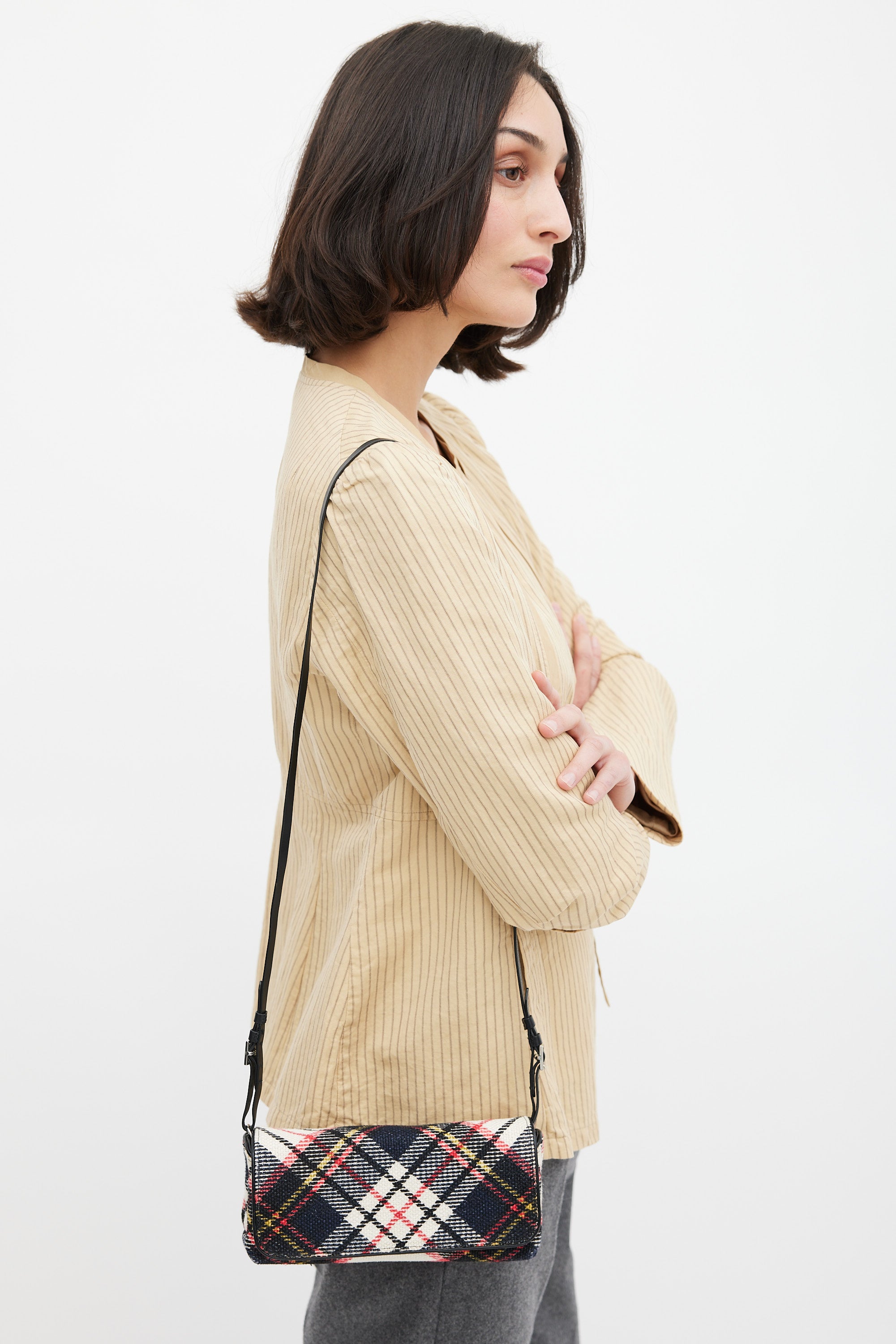 Pre-owned Dries Van Noten black and multicolour crossbody bag featuring single detachable and adjustable thin shoulder strap, plaid pattern throughout body, back slip pocket, front flap, magnetic closure, and one lined main compartment with single slip pocket and single zip pocket.