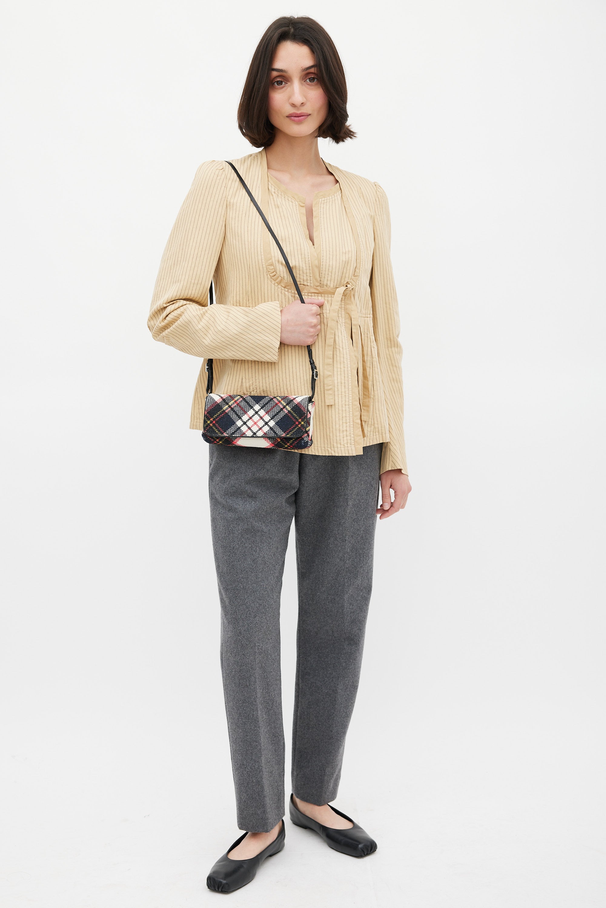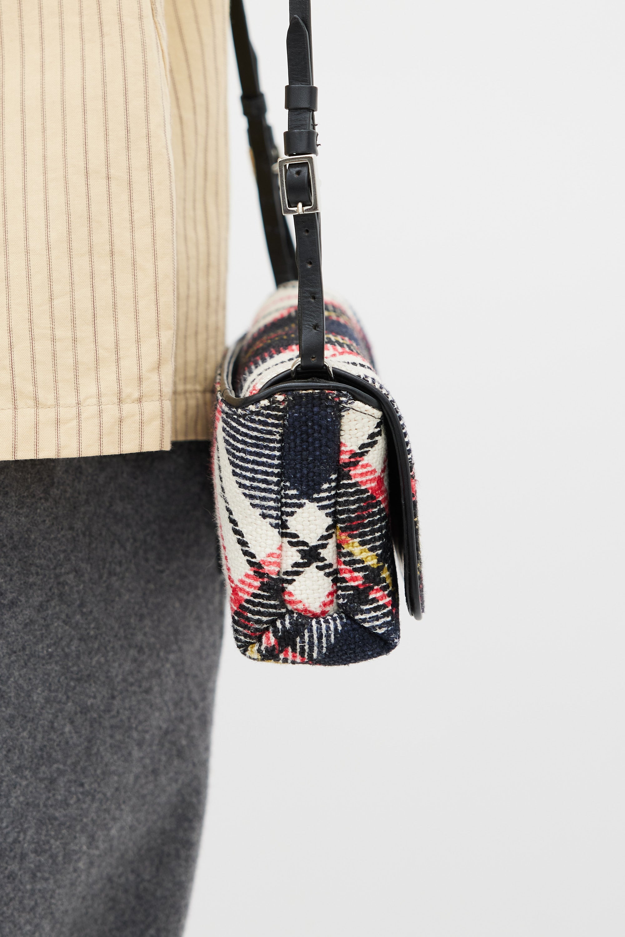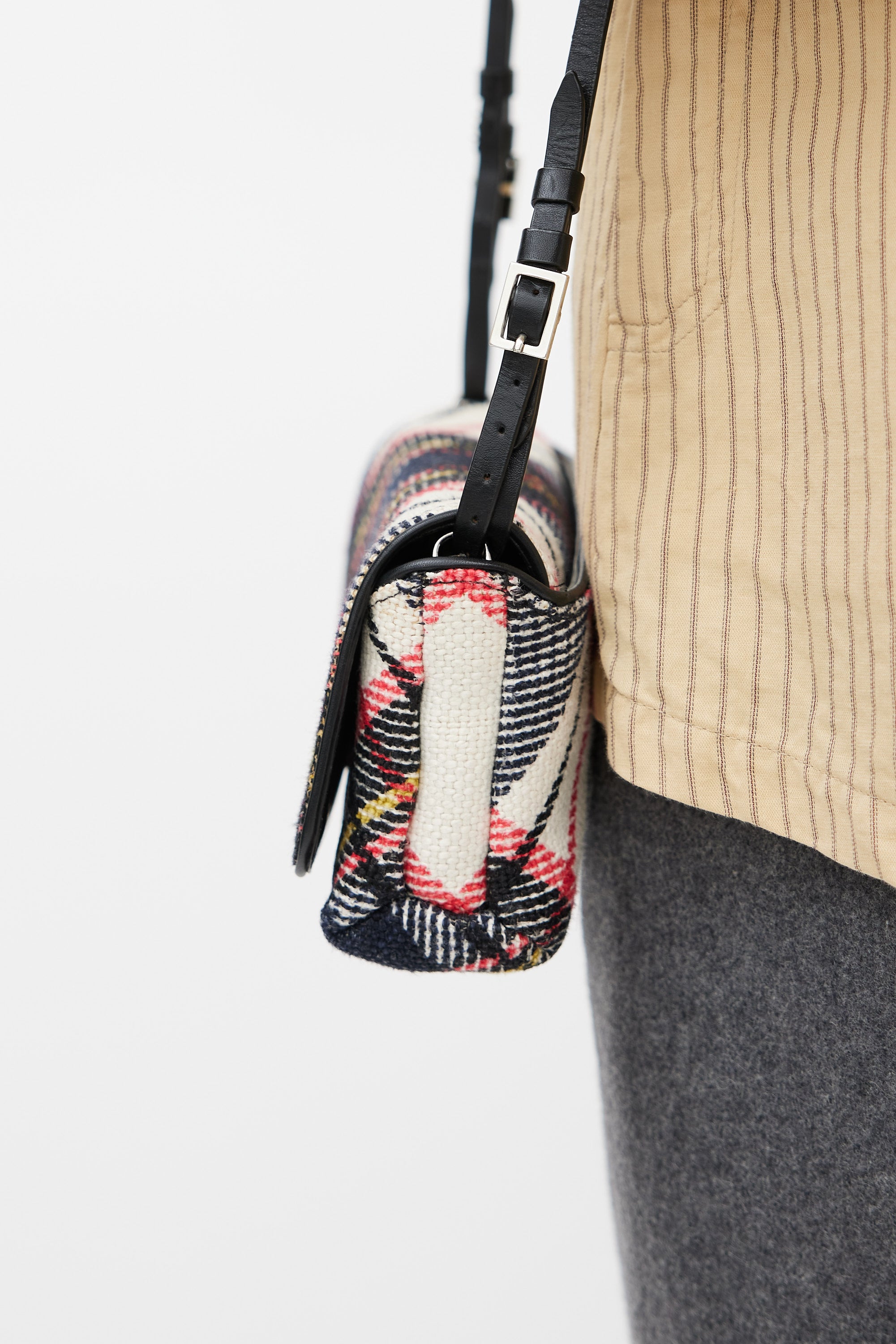 Pre-owned Dries Van Noten black and multicolour crossbody bag featuring single detachable and adjustable thin shoulder strap, plaid pattern throughout body, back slip pocket, front flap, magnetic closure, and one lined main compartment with single slip pocket and single zip pocket.