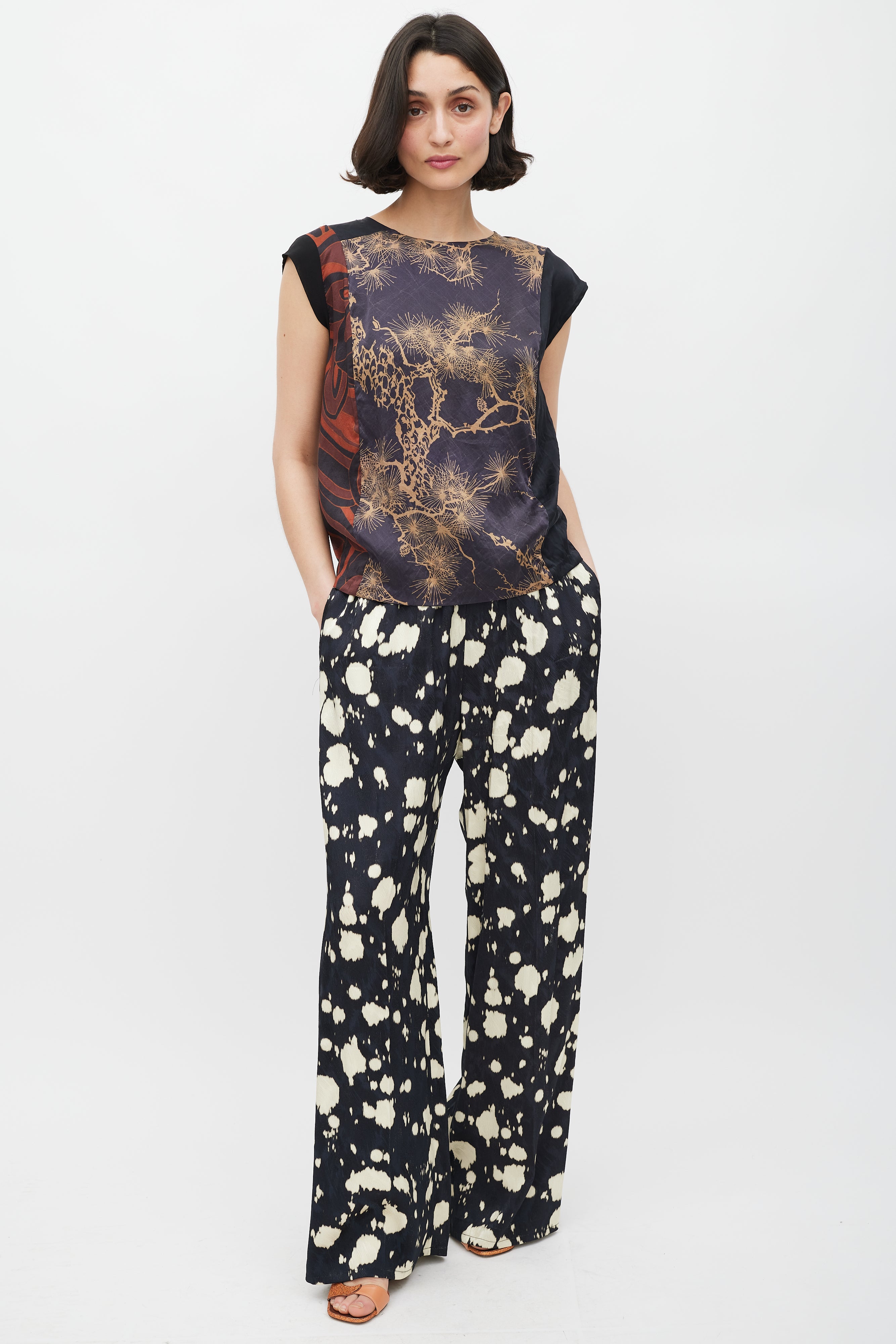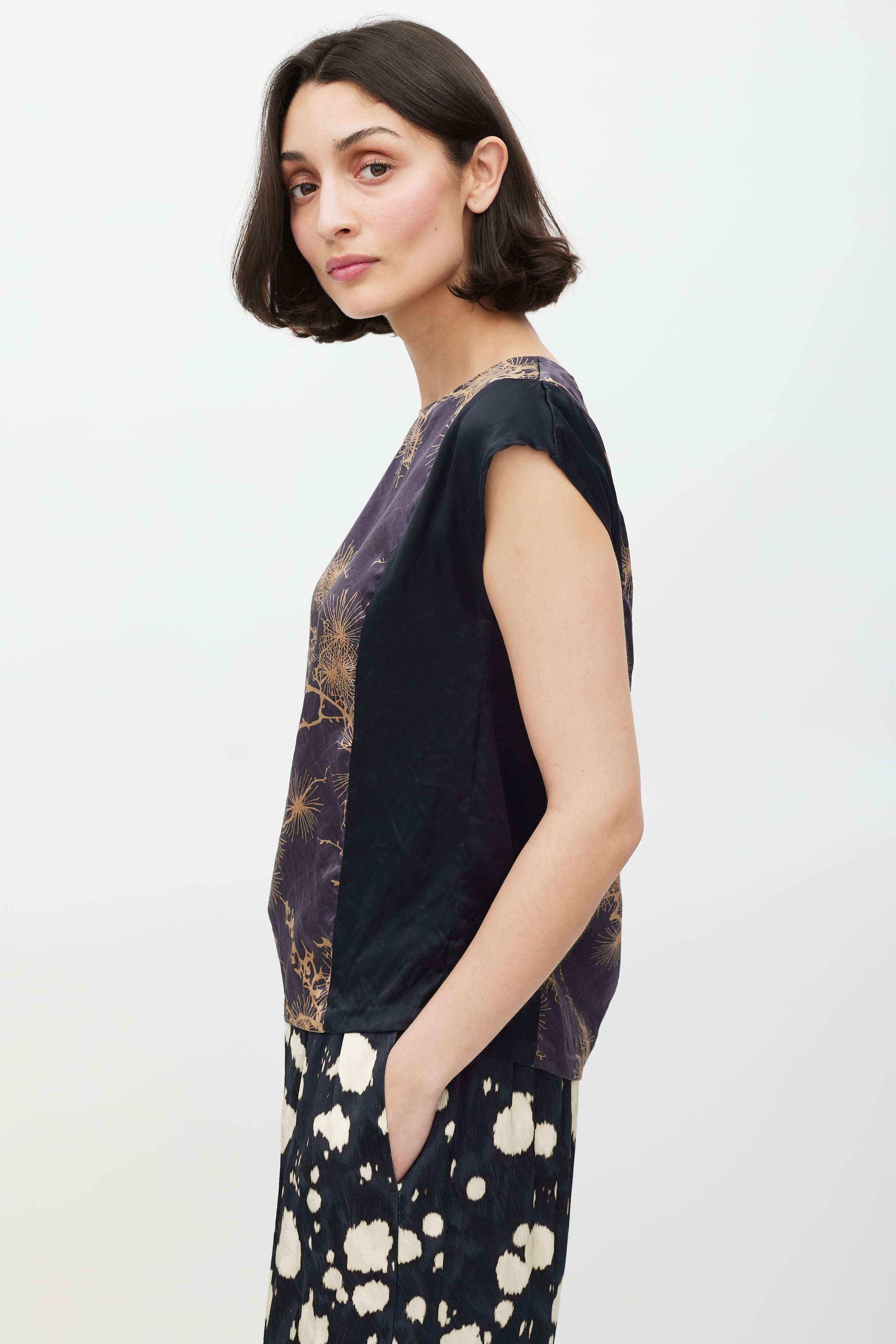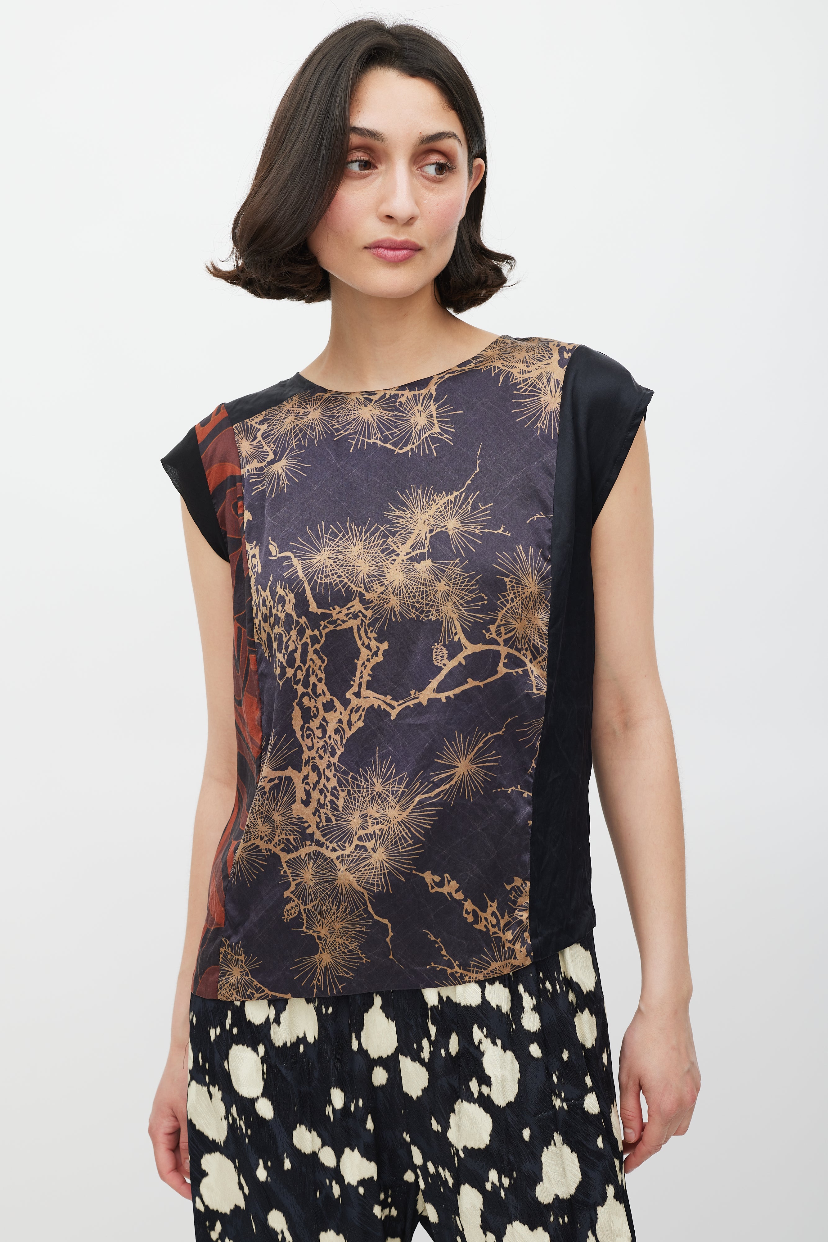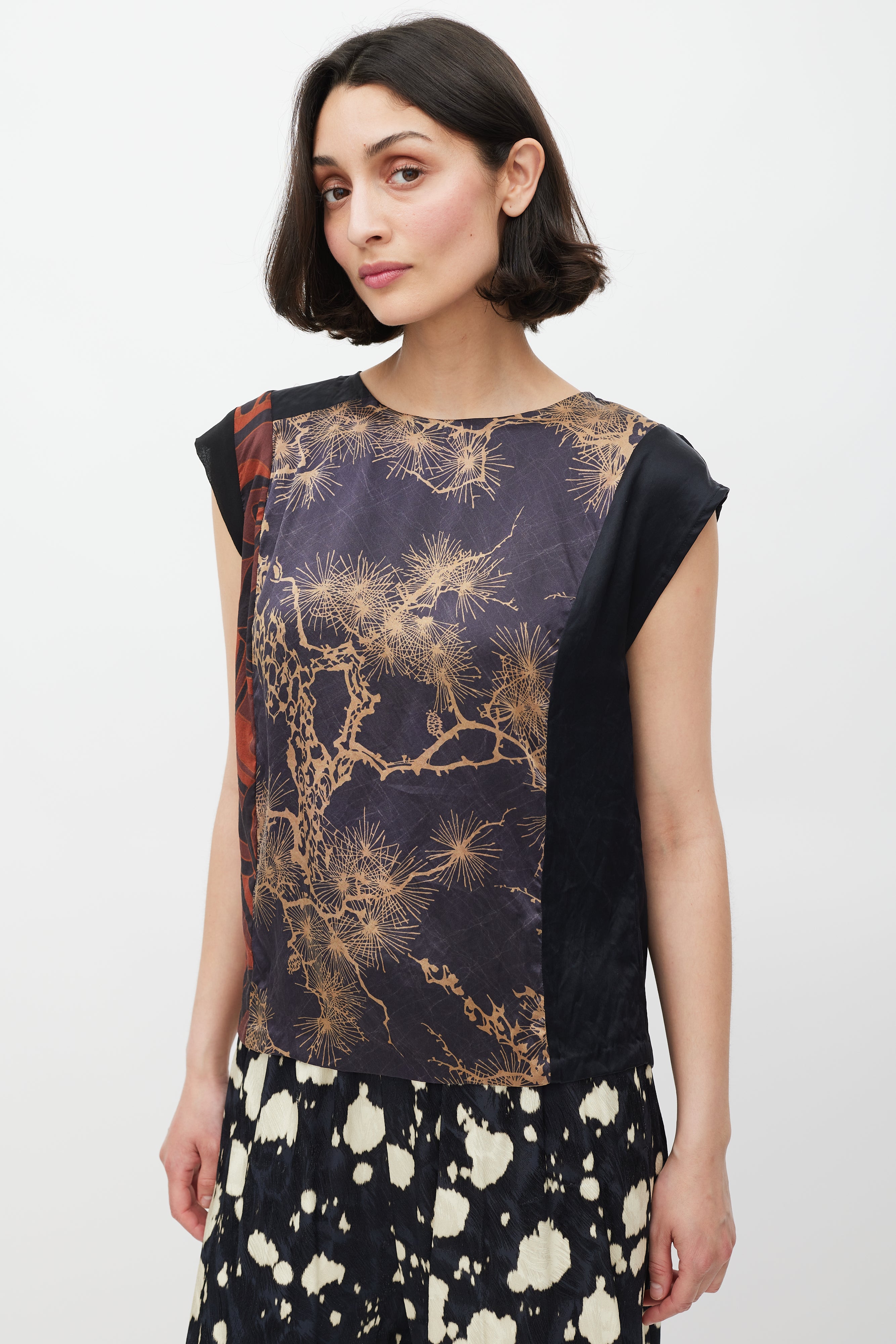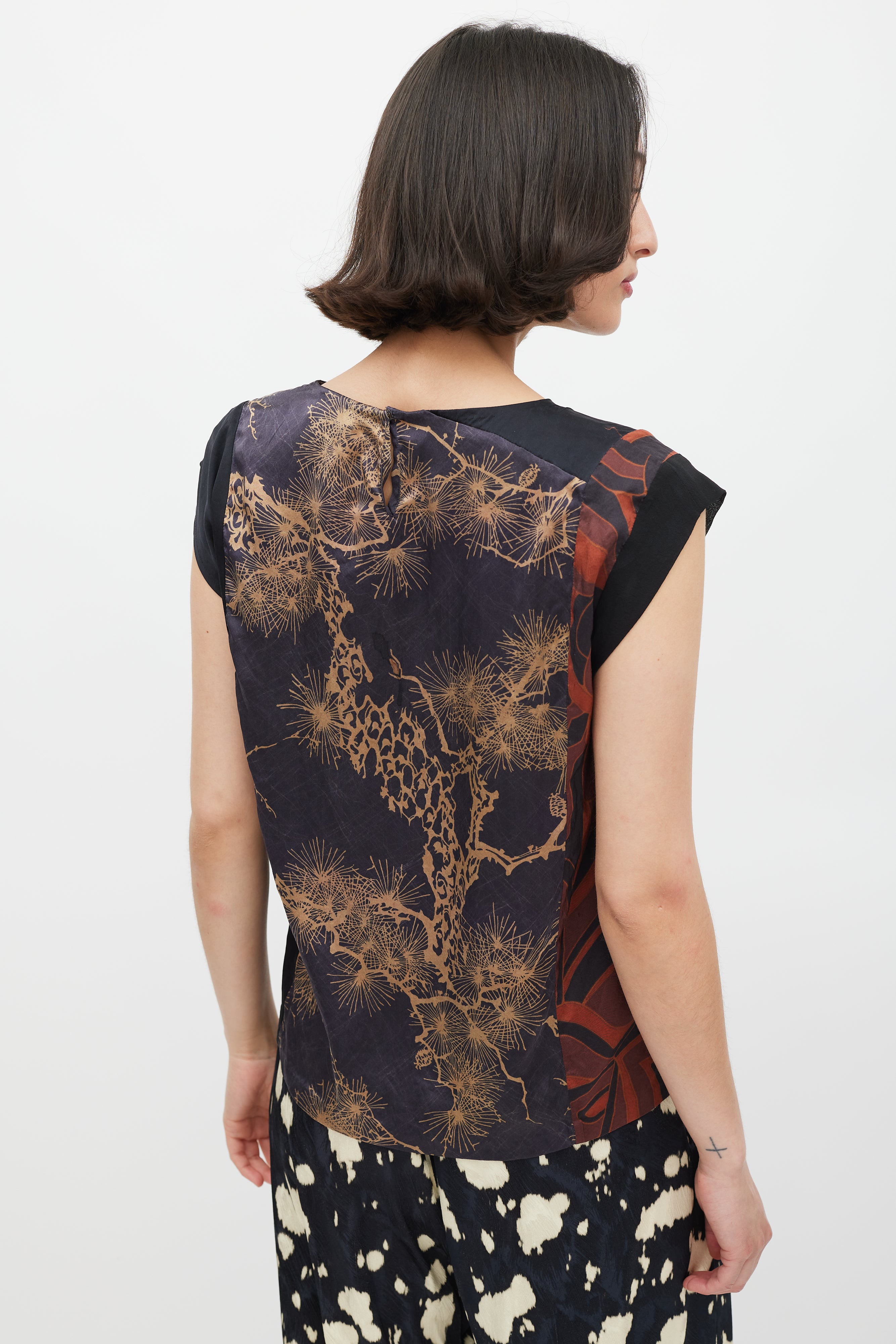 Pre-owned Dries Van Noten Fall Winter 2011 silk top featuring a round neck with back snap button fastening, black and multicolour printed panelled construction, and short sleeves.