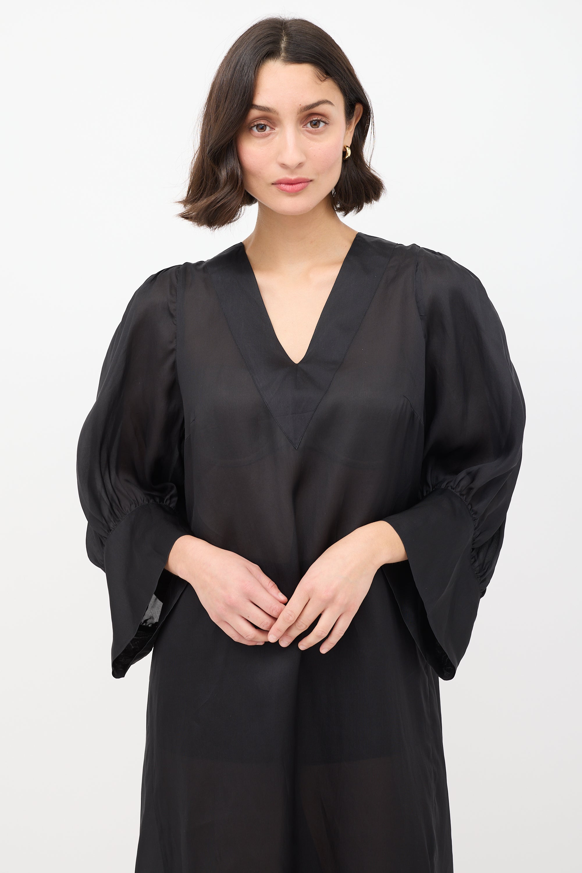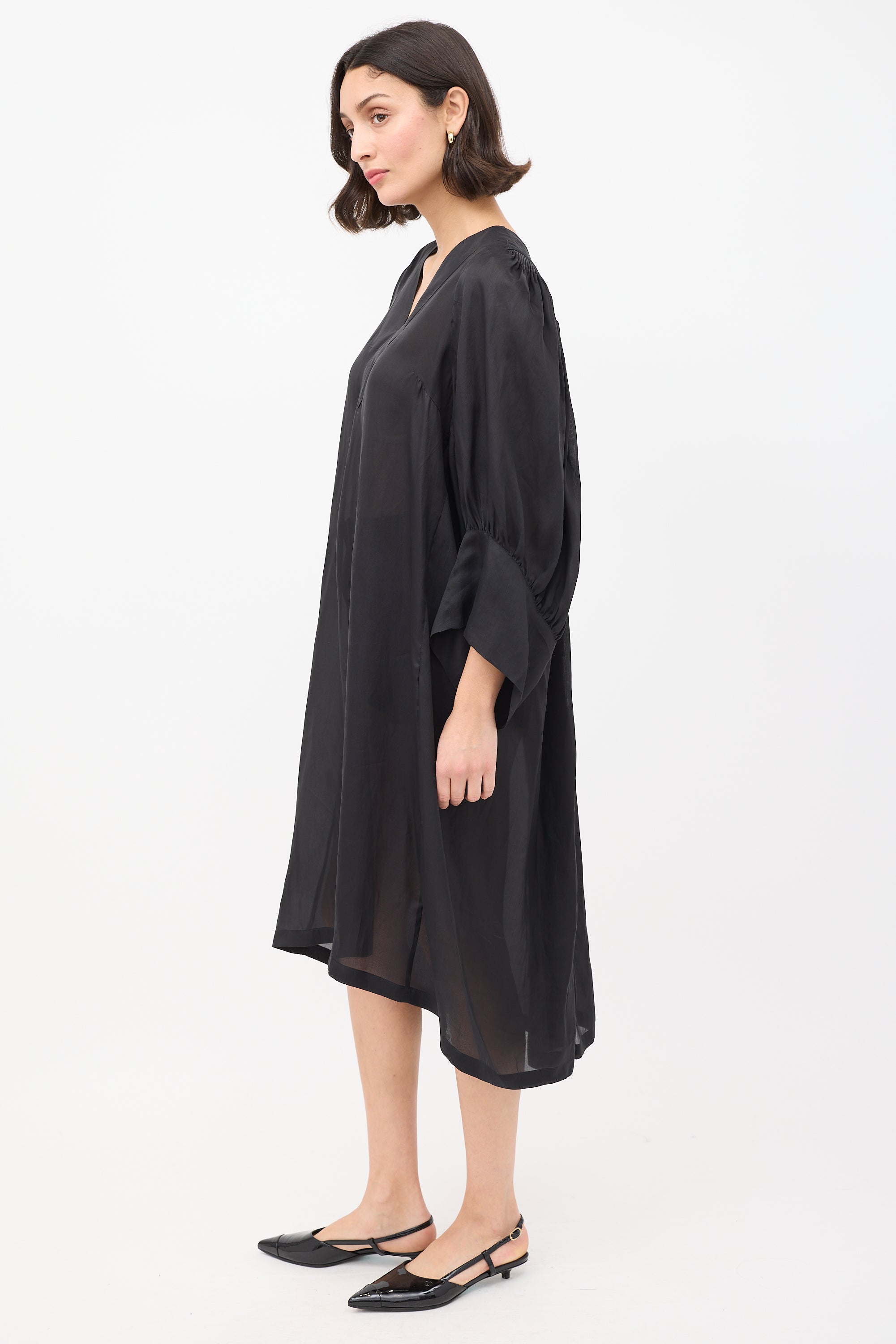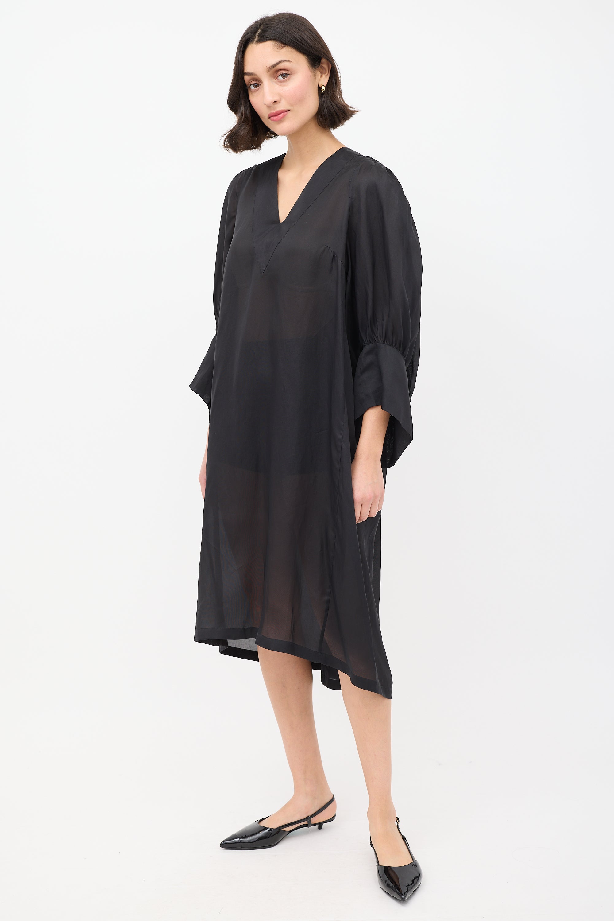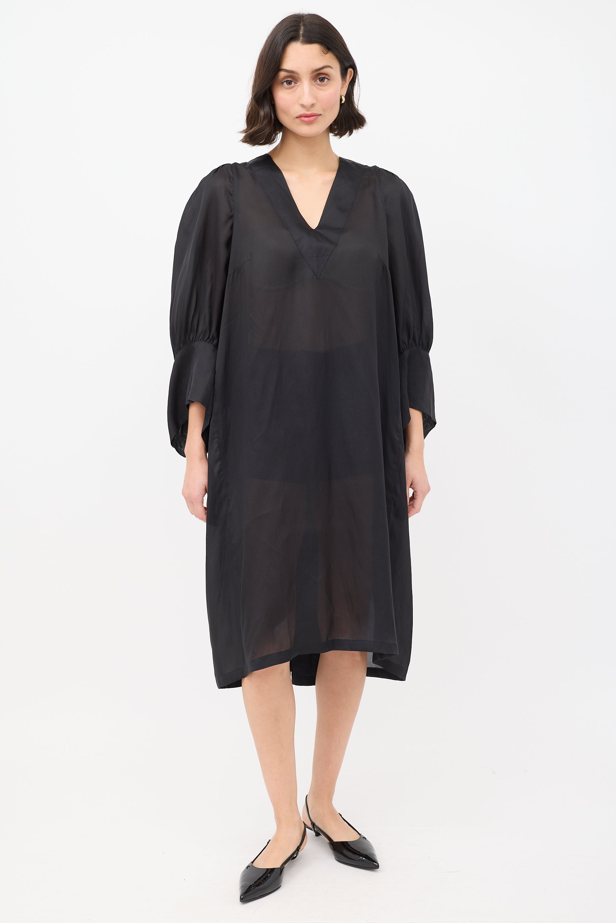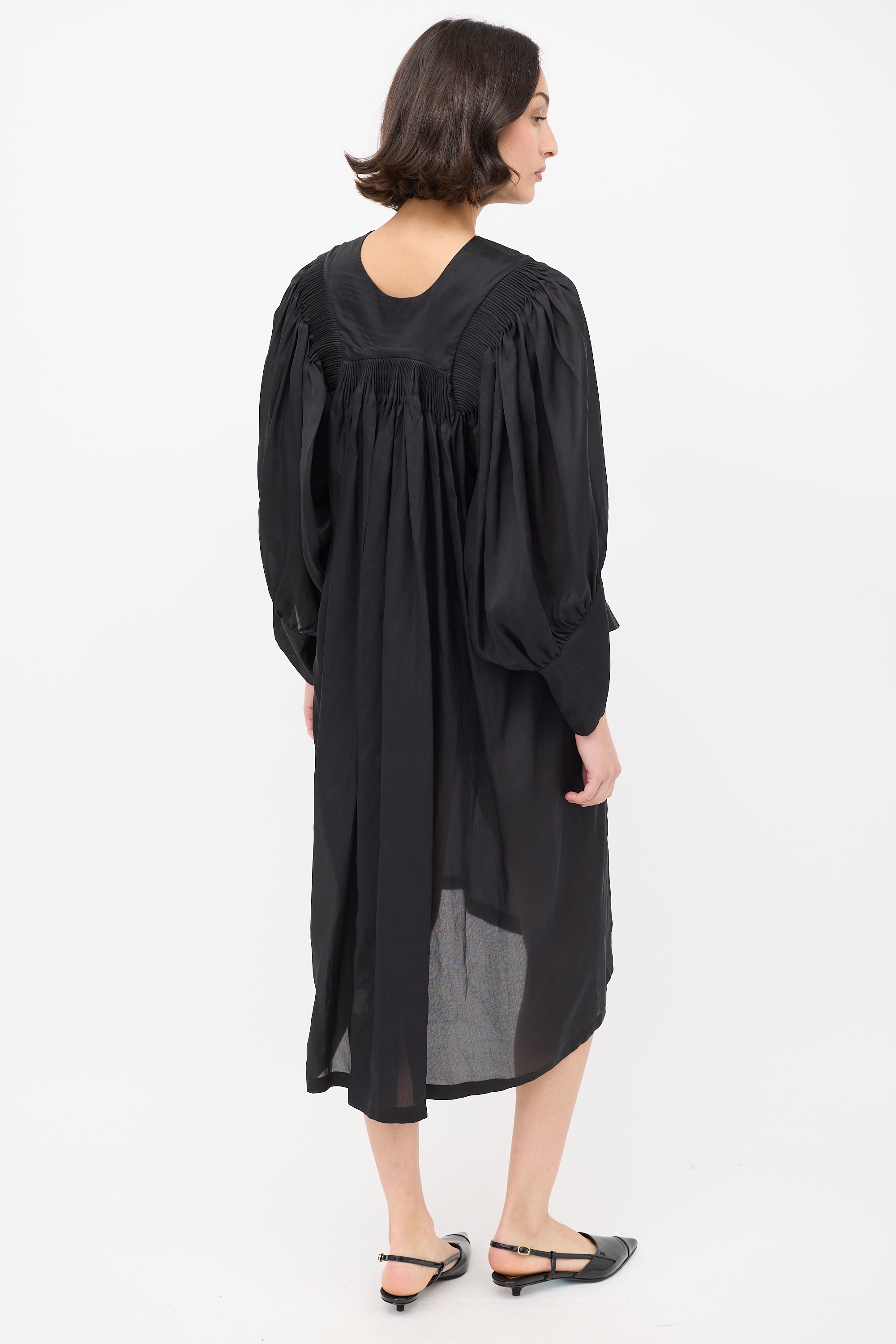 Pre-owned Dries Van Noten black silk midi shift dress featuring a V-neckline, accordion pleats at back yoke, half length puff sleeves, and high low hem.