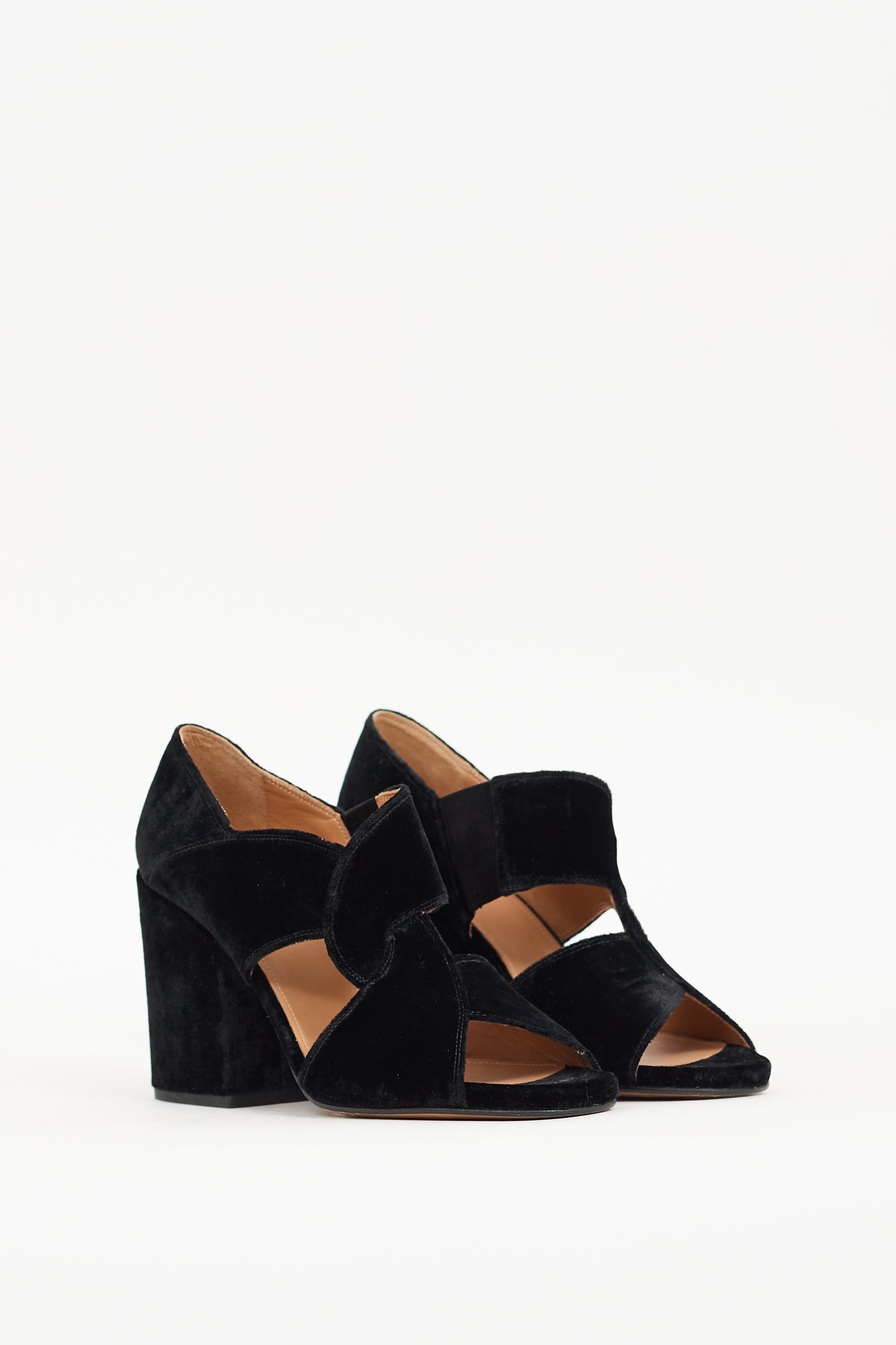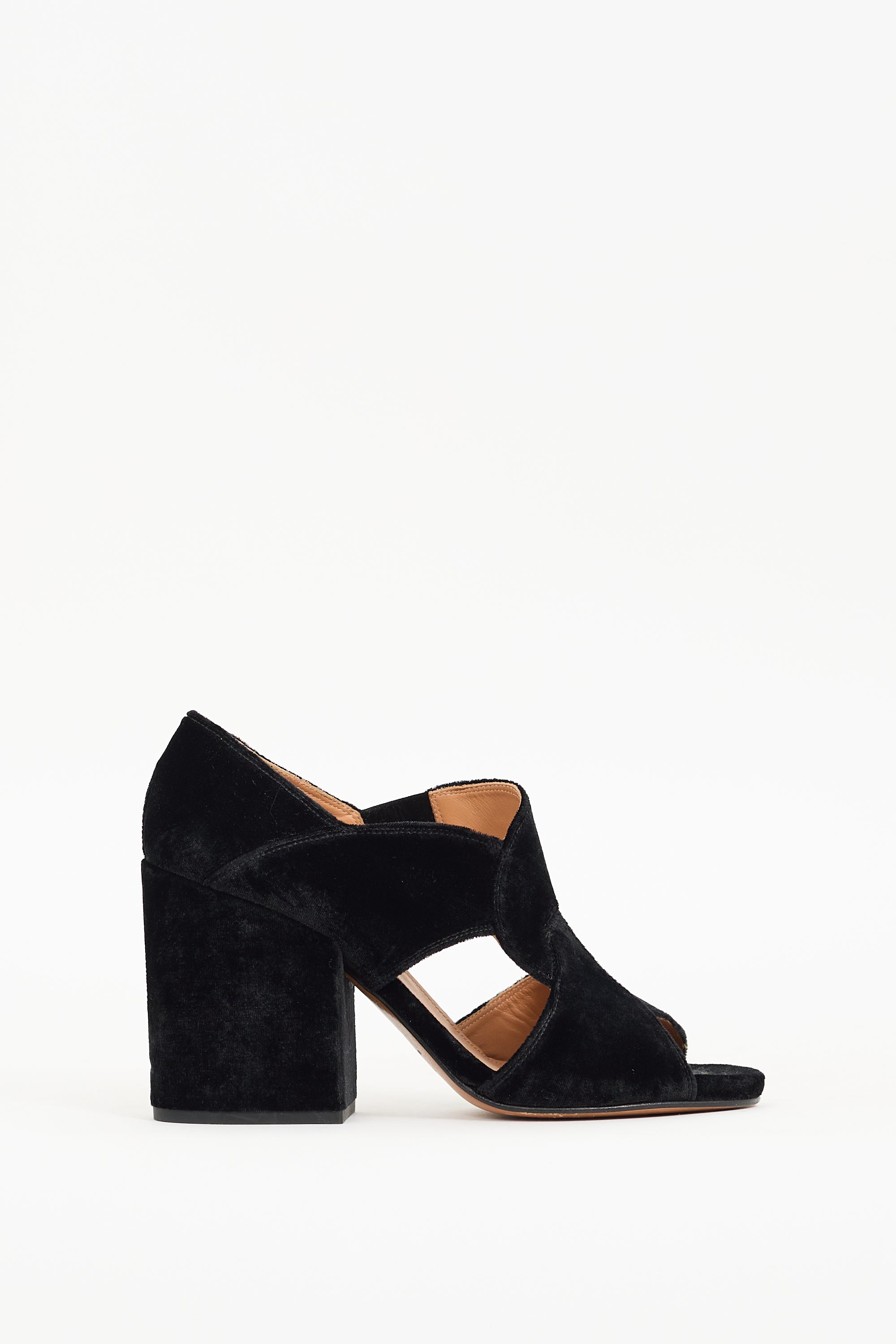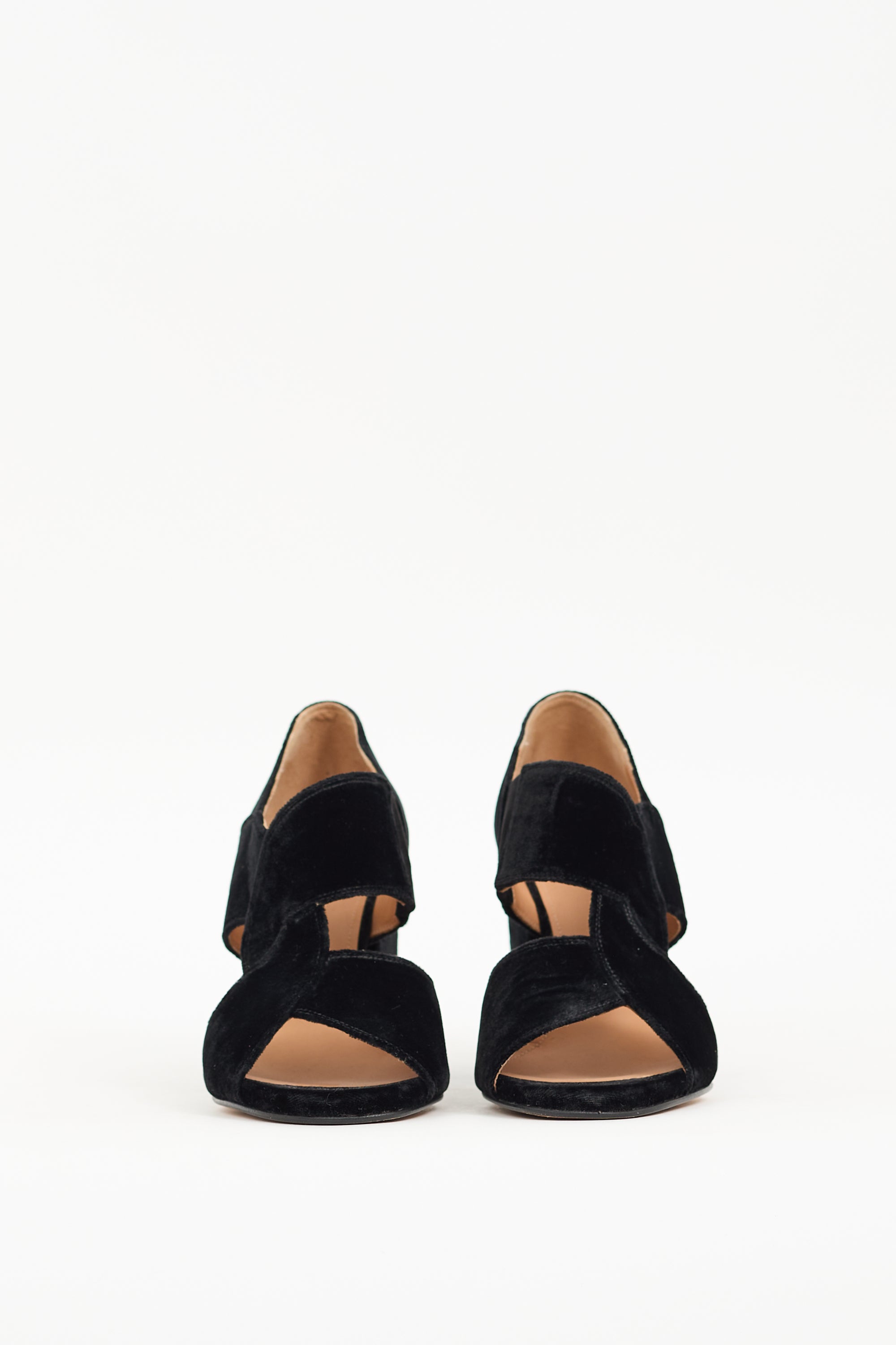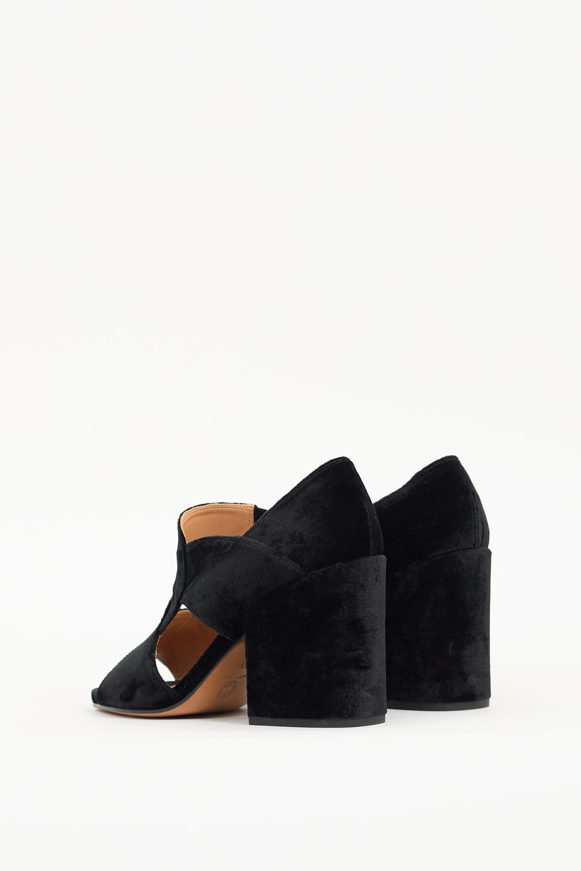 Pre-owned Dries Van Noten black velvet heels featuring open rounded toe, rounded caged upper, slip on entry, and covered block heel.