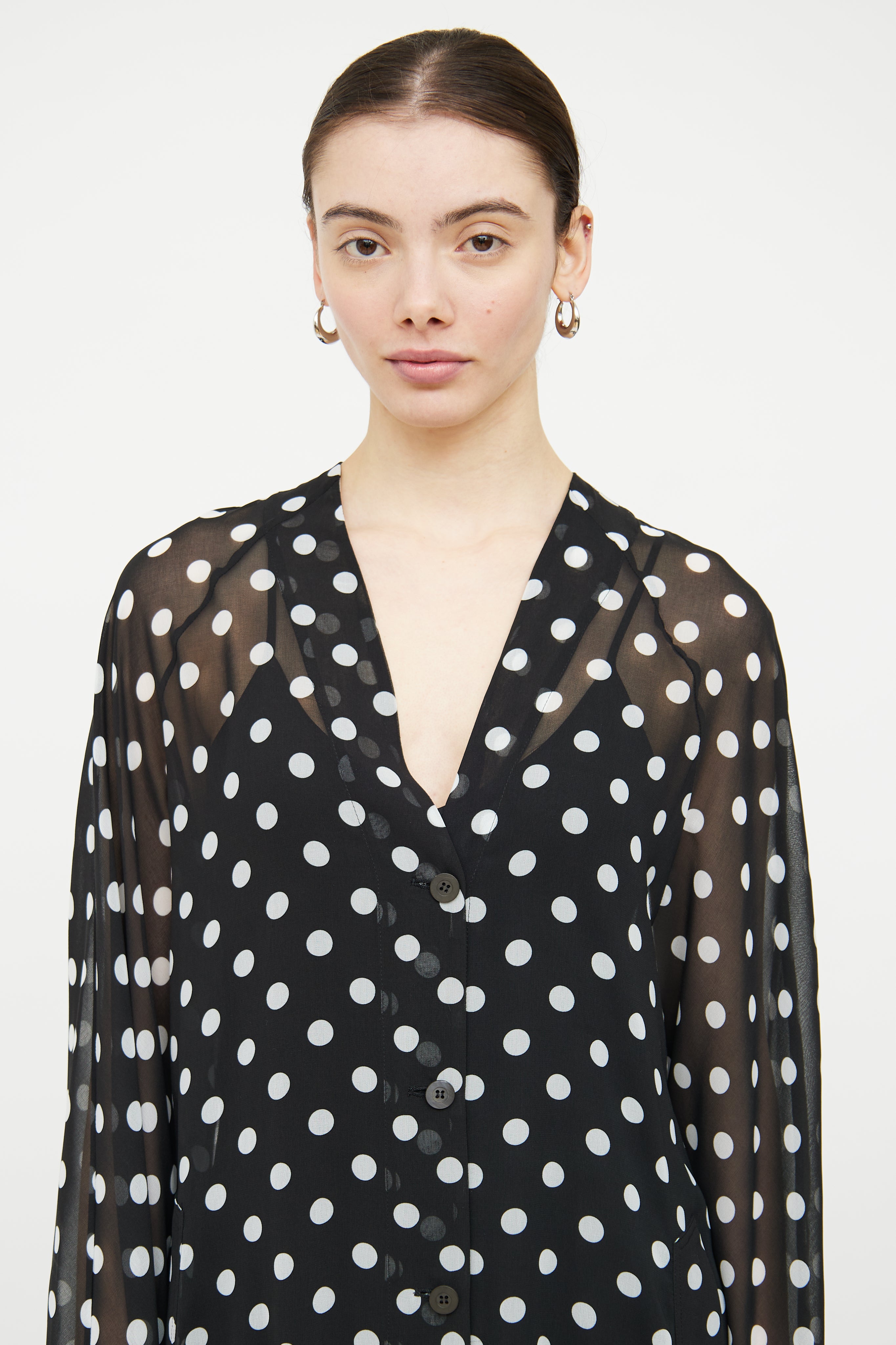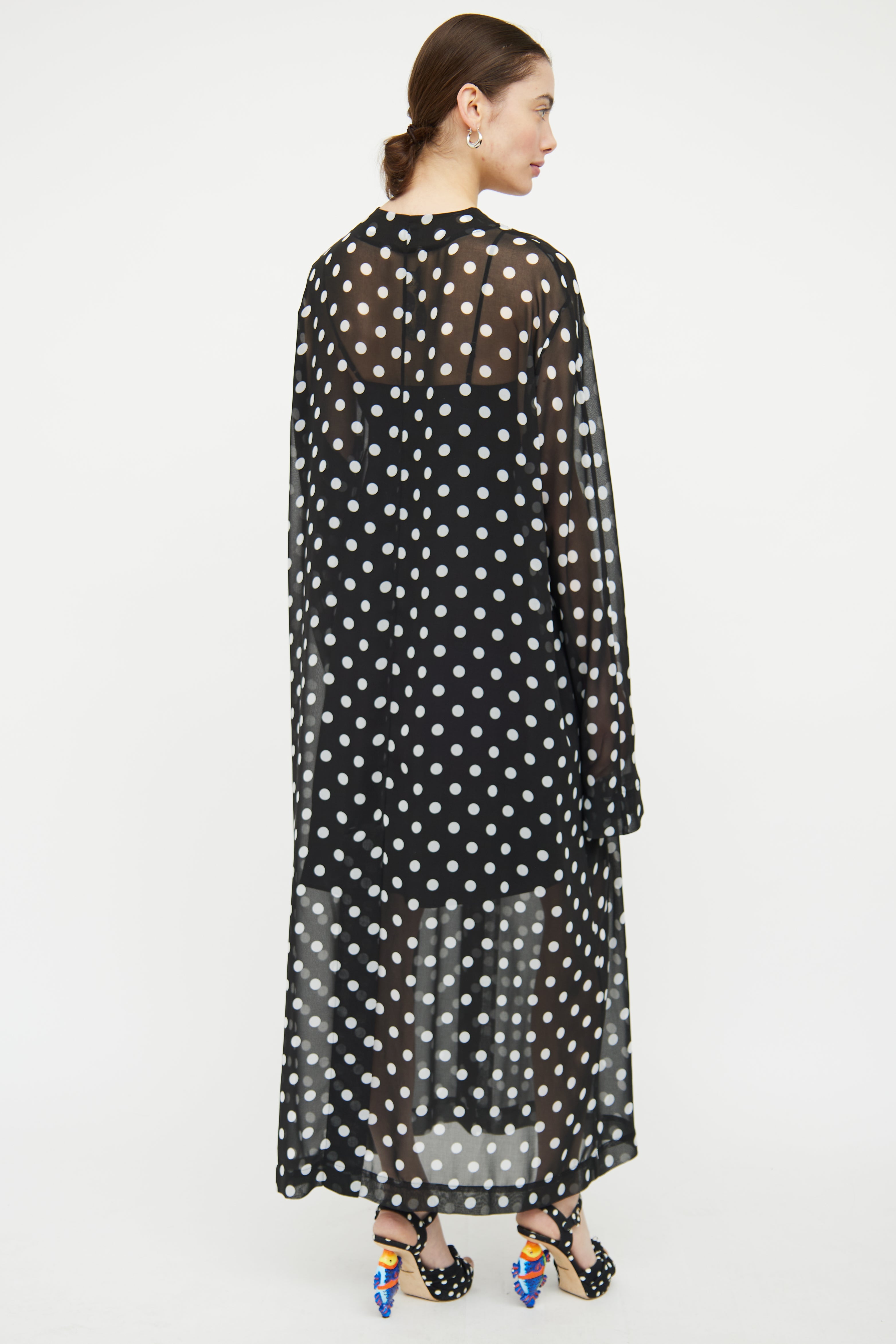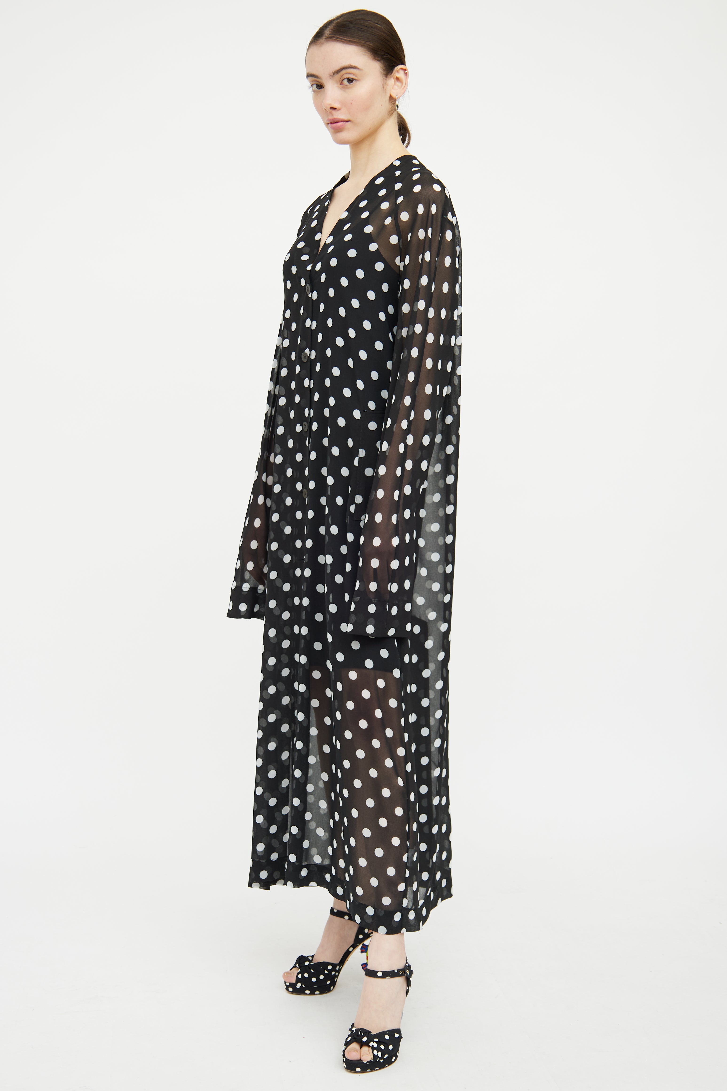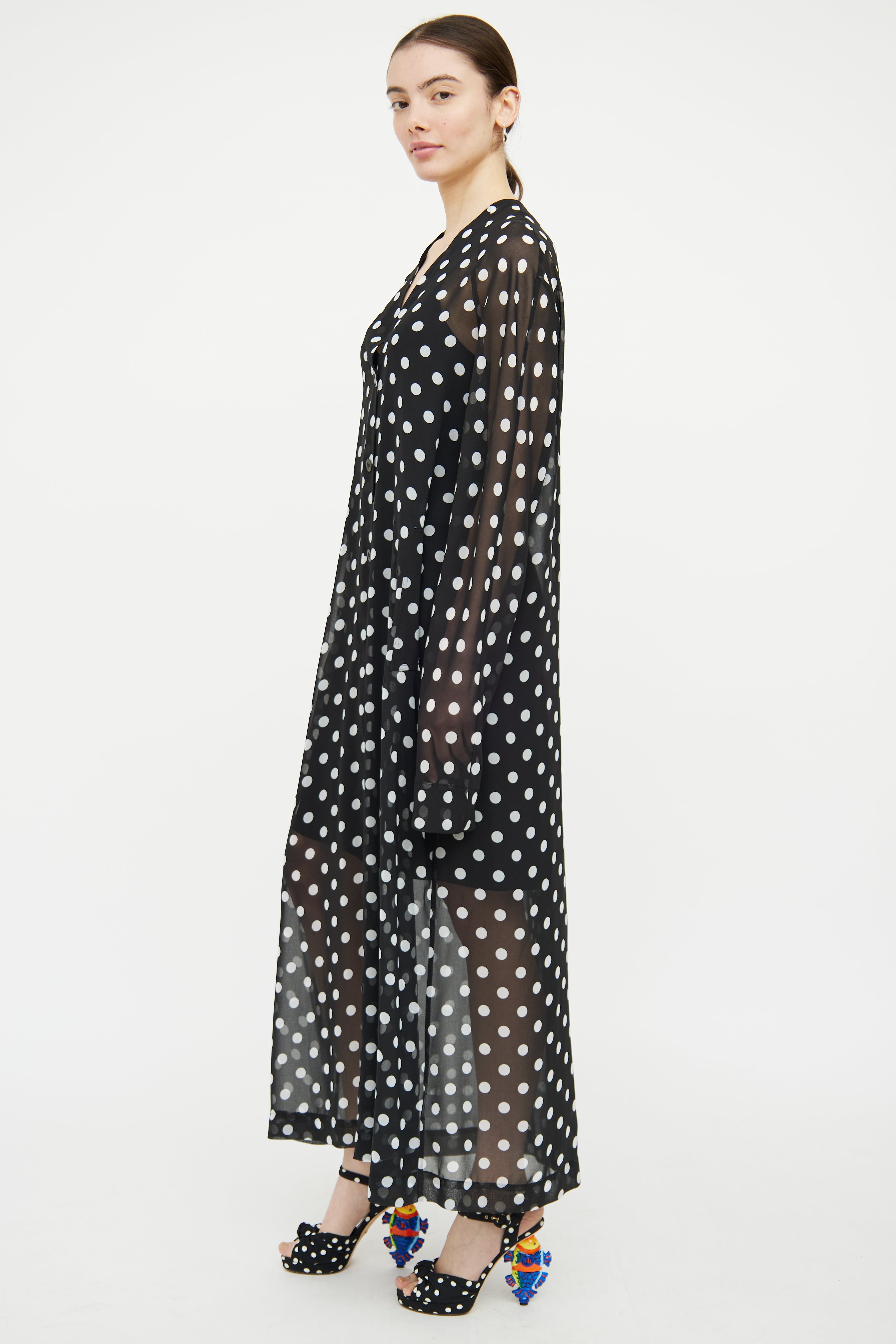 Pre-owned Dries Van Noten black sheer dress featuring a white polka dot pattern throughout, V neck, long sleeves, slit at hem, and button up closure.