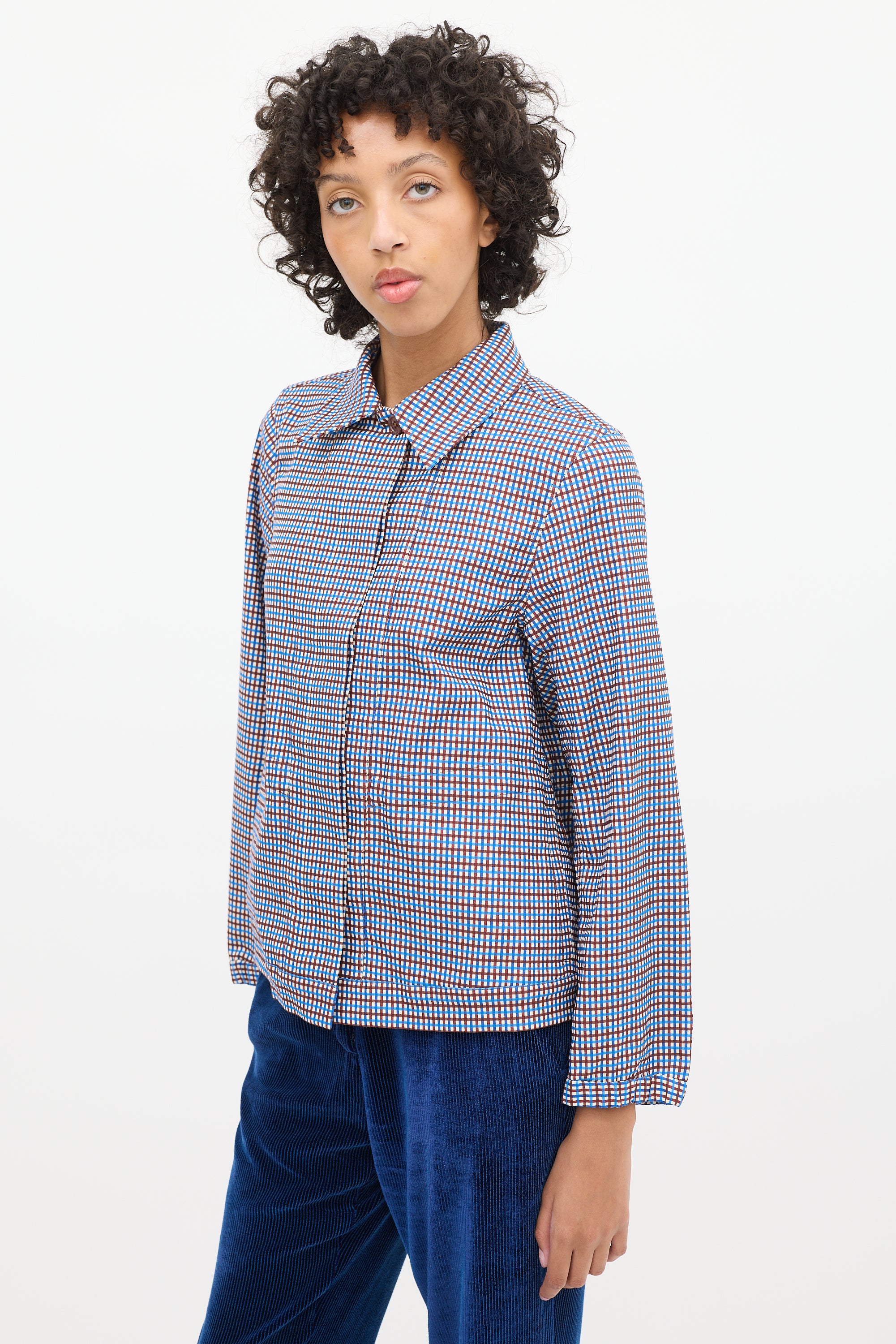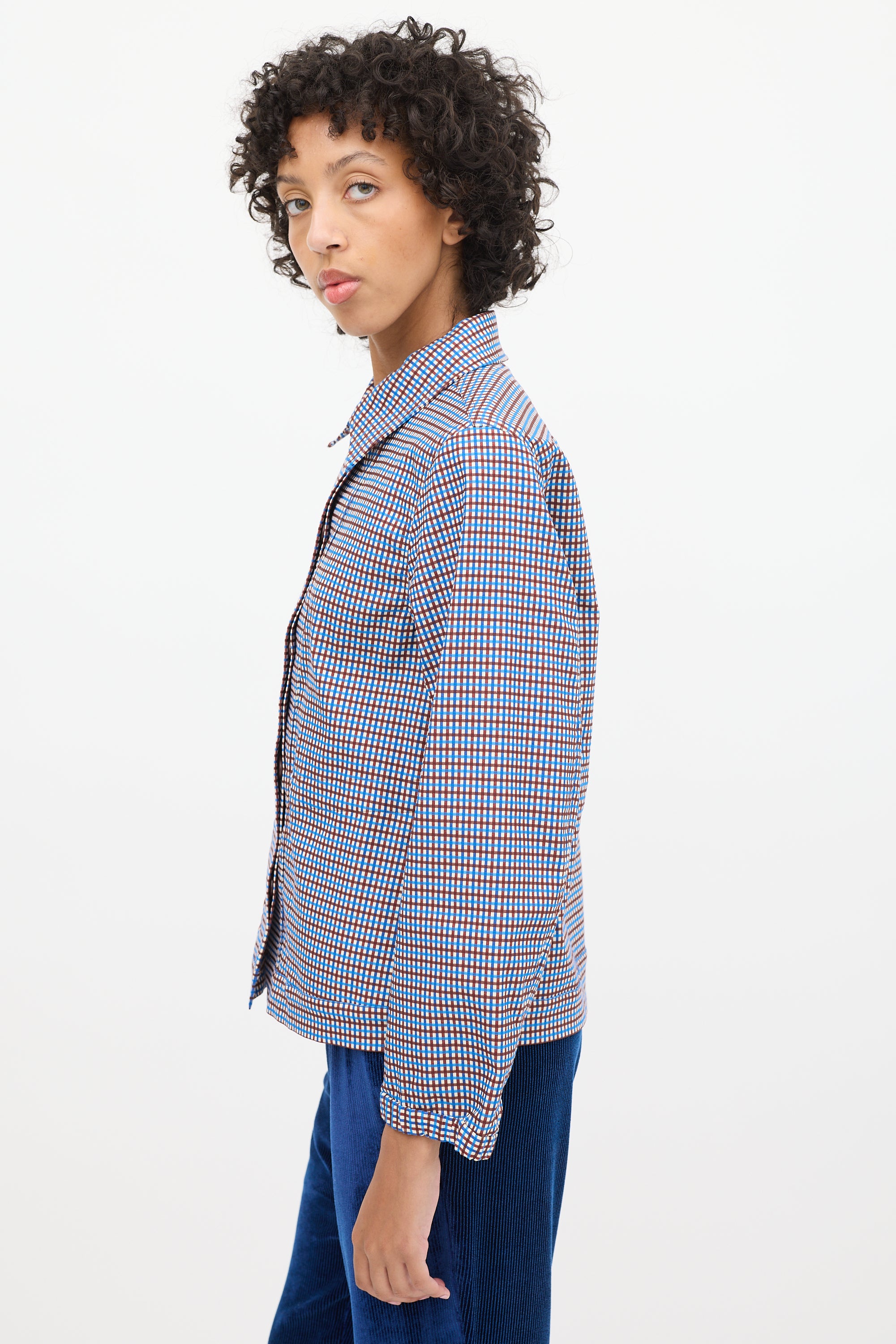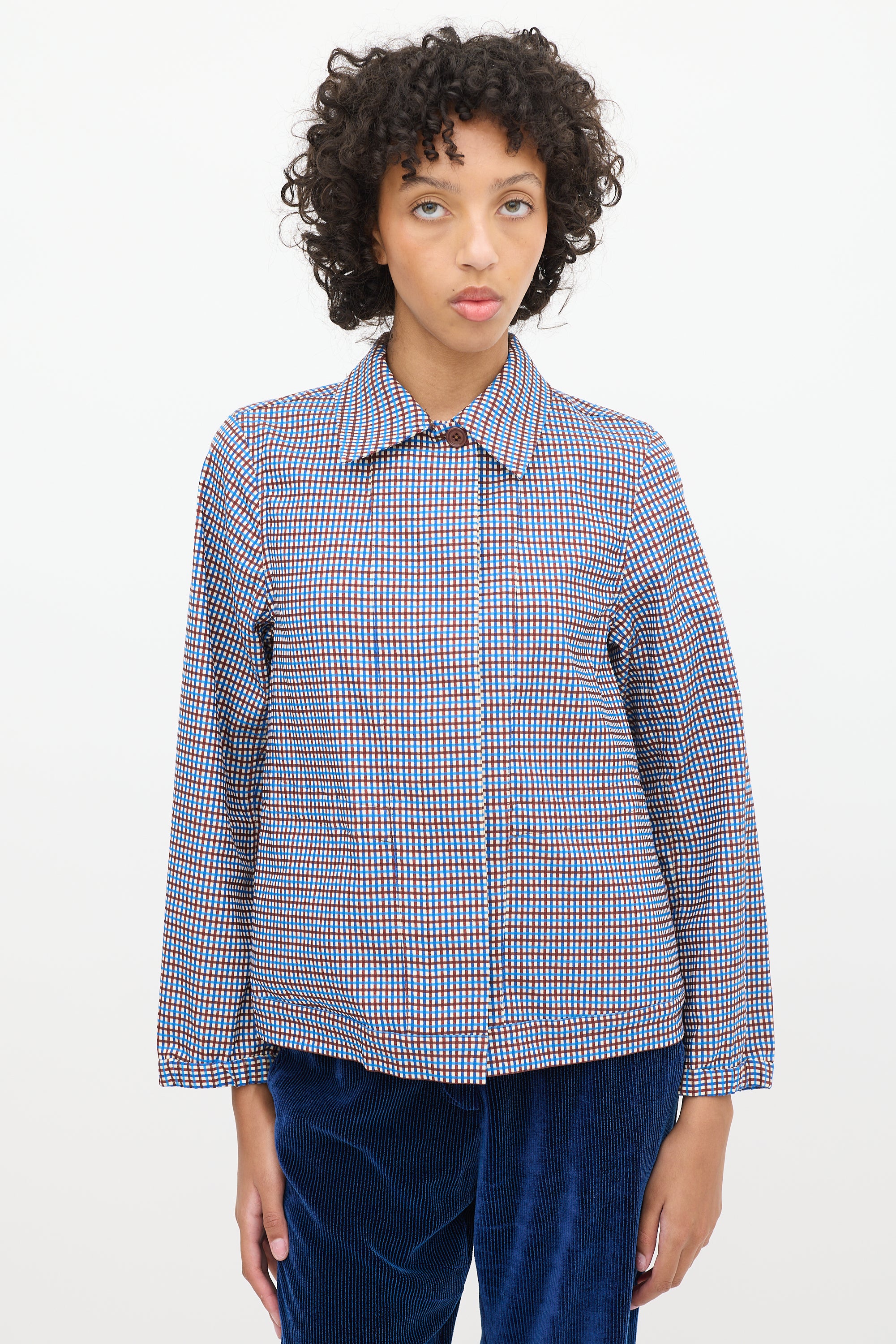 Pre-owned Dries Van Noten blue, brown, and white cotton blend jacket featuring a pointed collar, concealed button up front, check pattern throughout, in seam pockets, asnd long sleeves with elasticized cuffs.