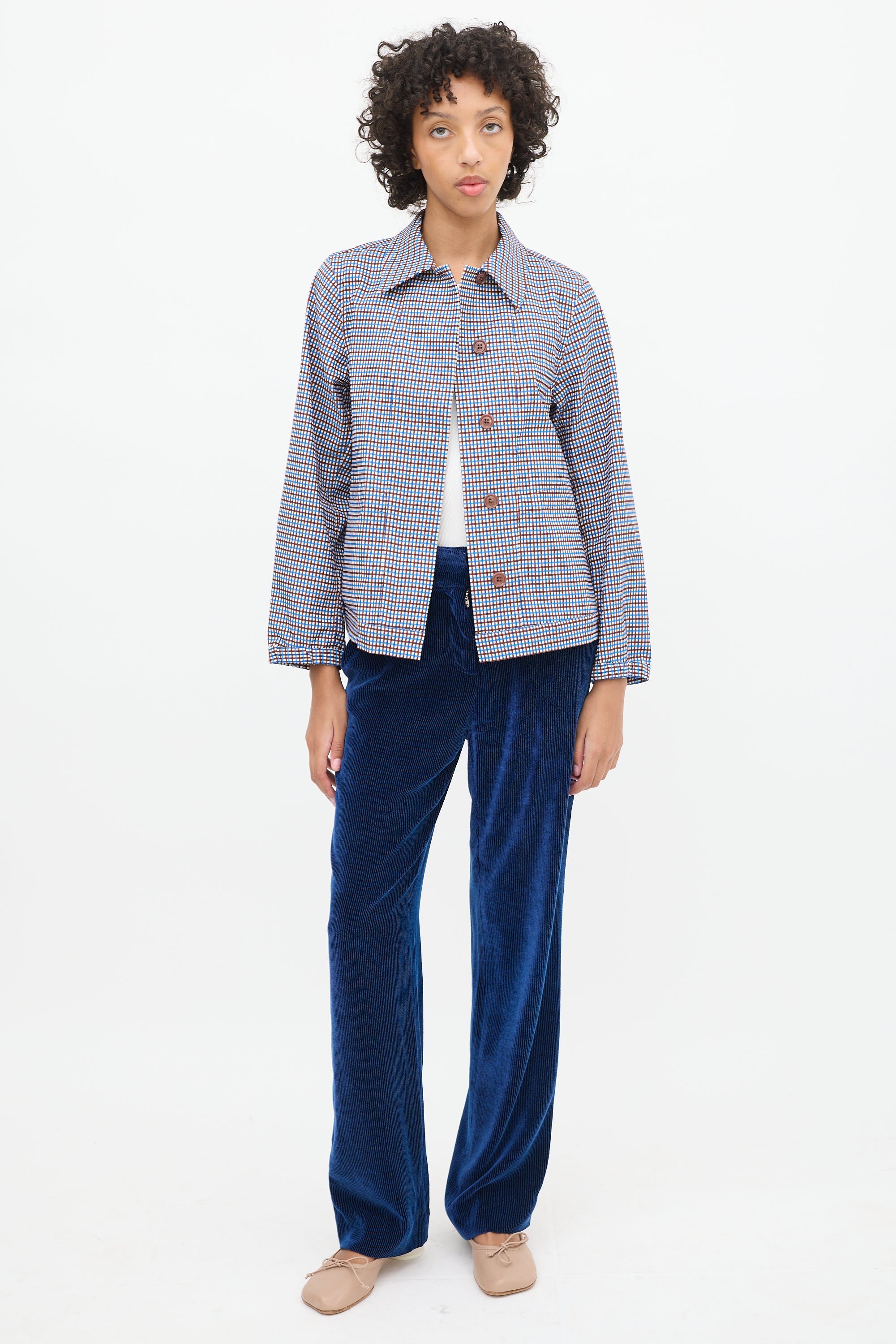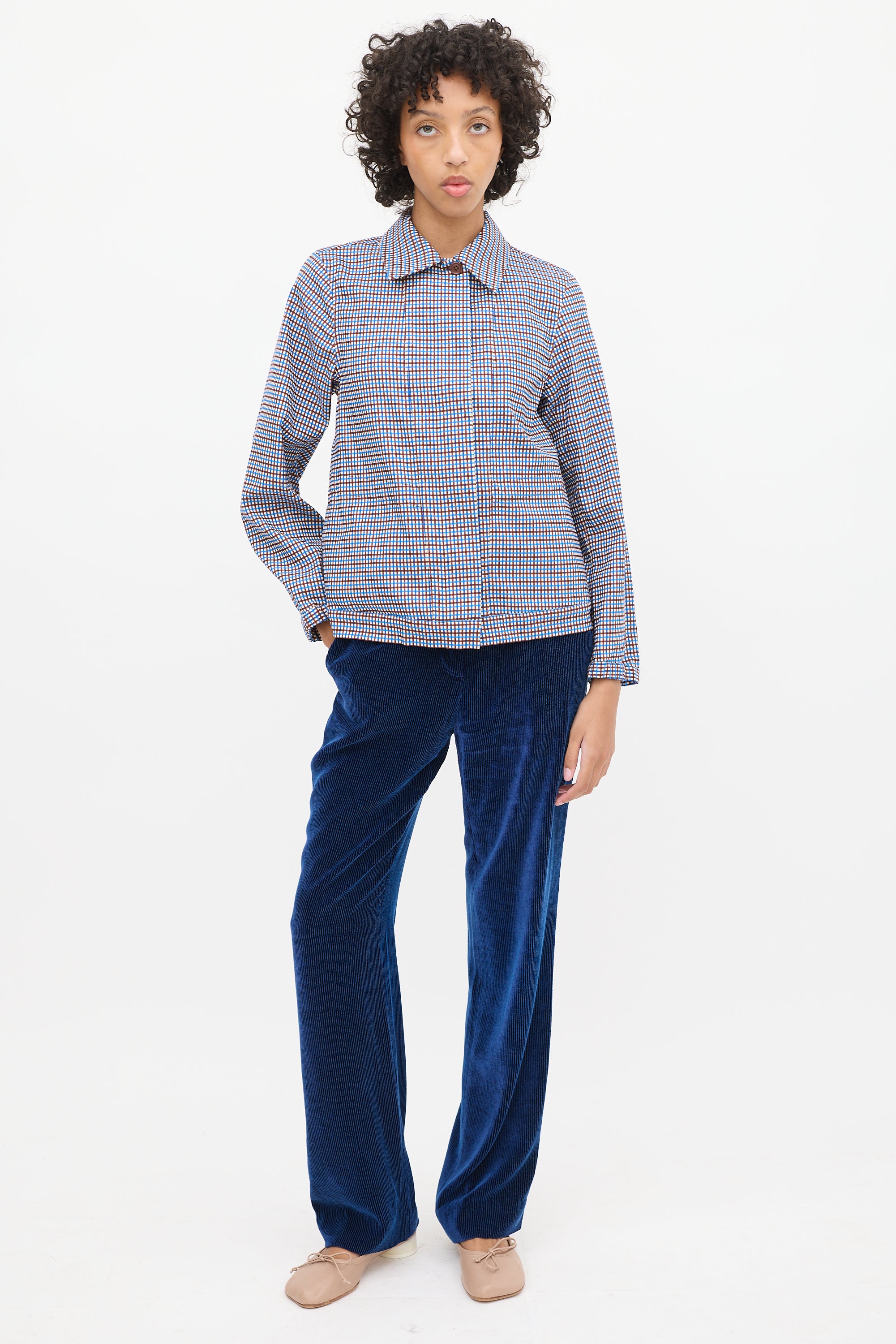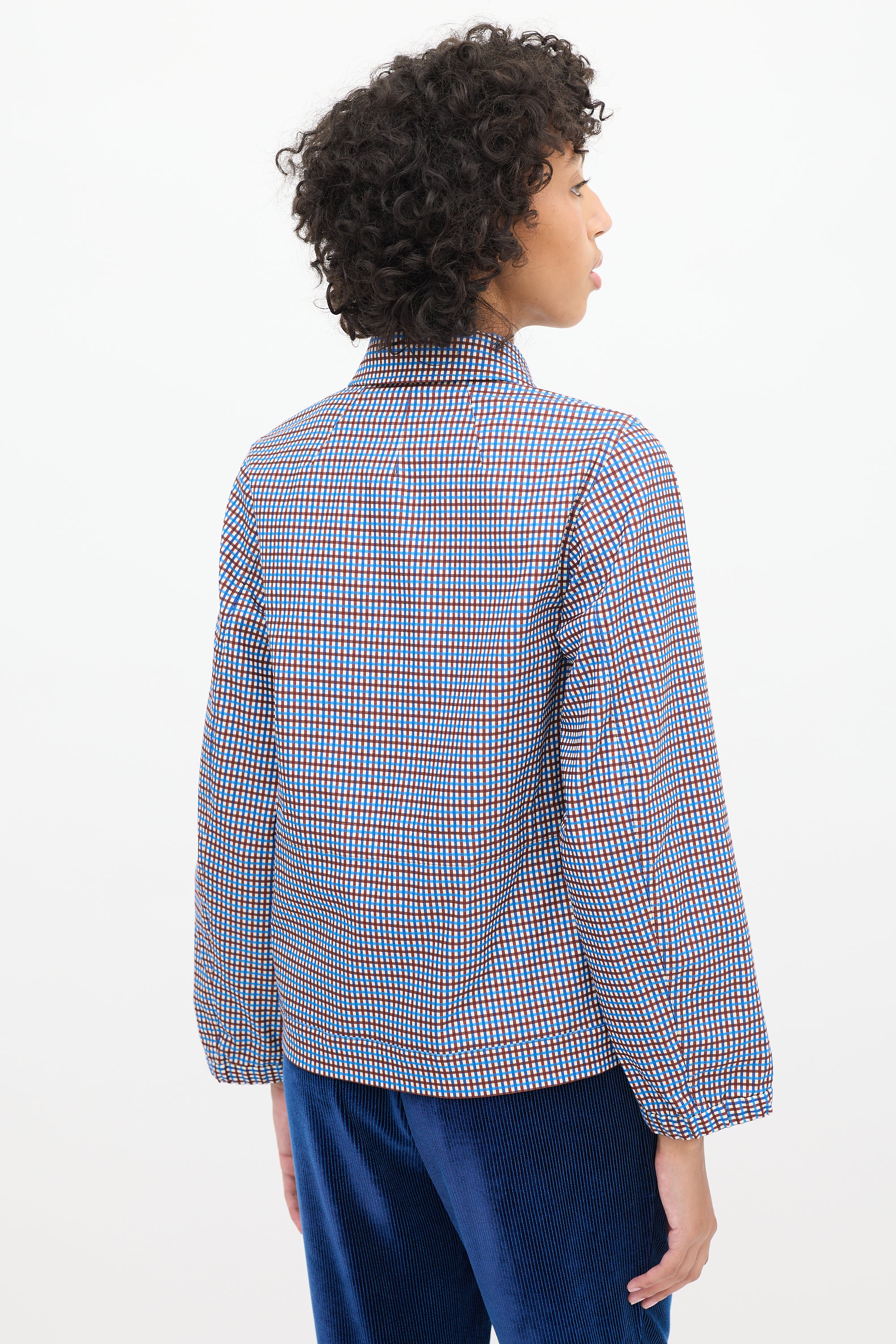 Pre-owned Dries Van Noten blue, brown, and white cotton blend jacket featuring a pointed collar, concealed button up front, check pattern throughout, in seam pockets, asnd long sleeves with elasticized cuffs.