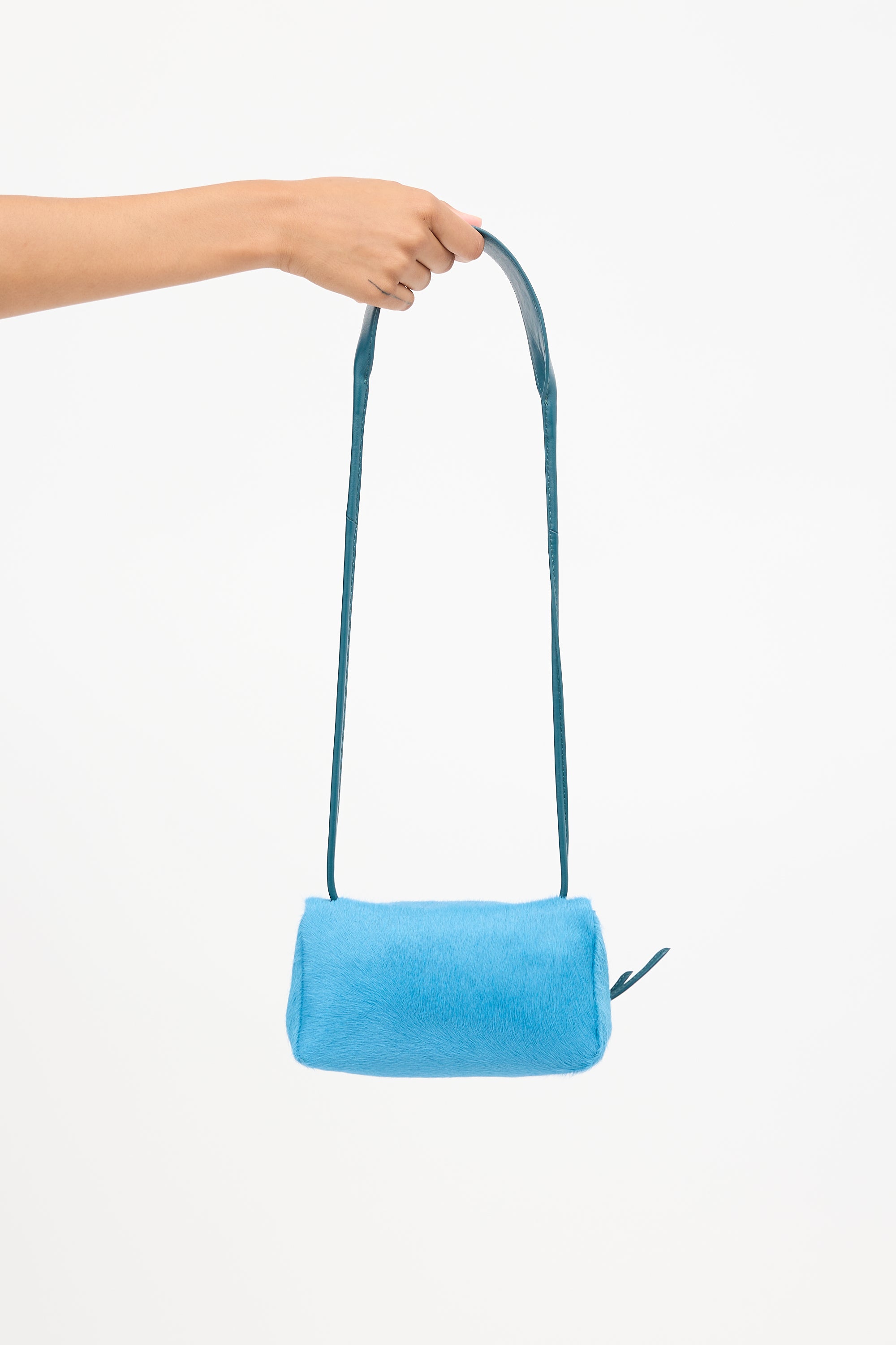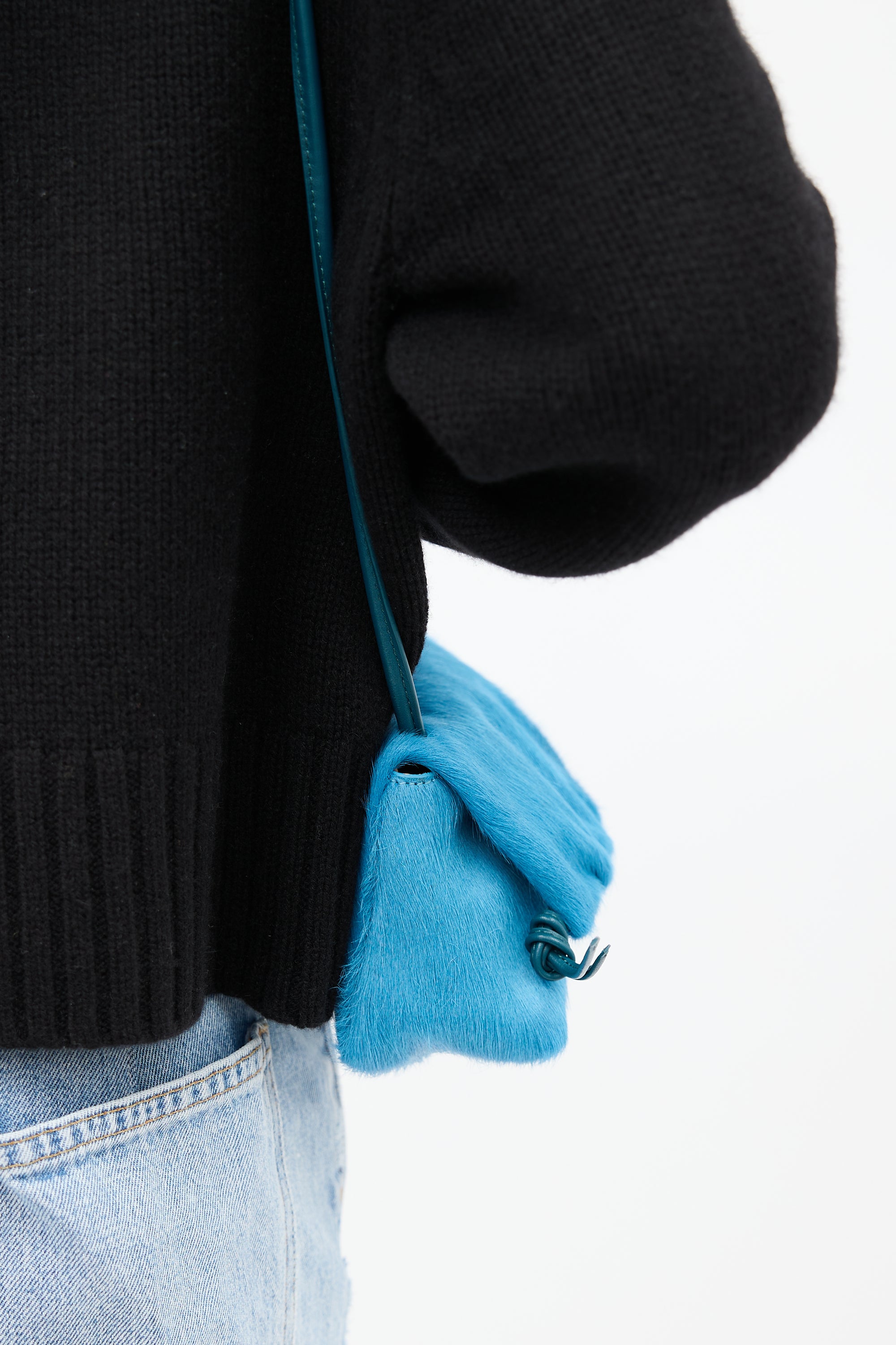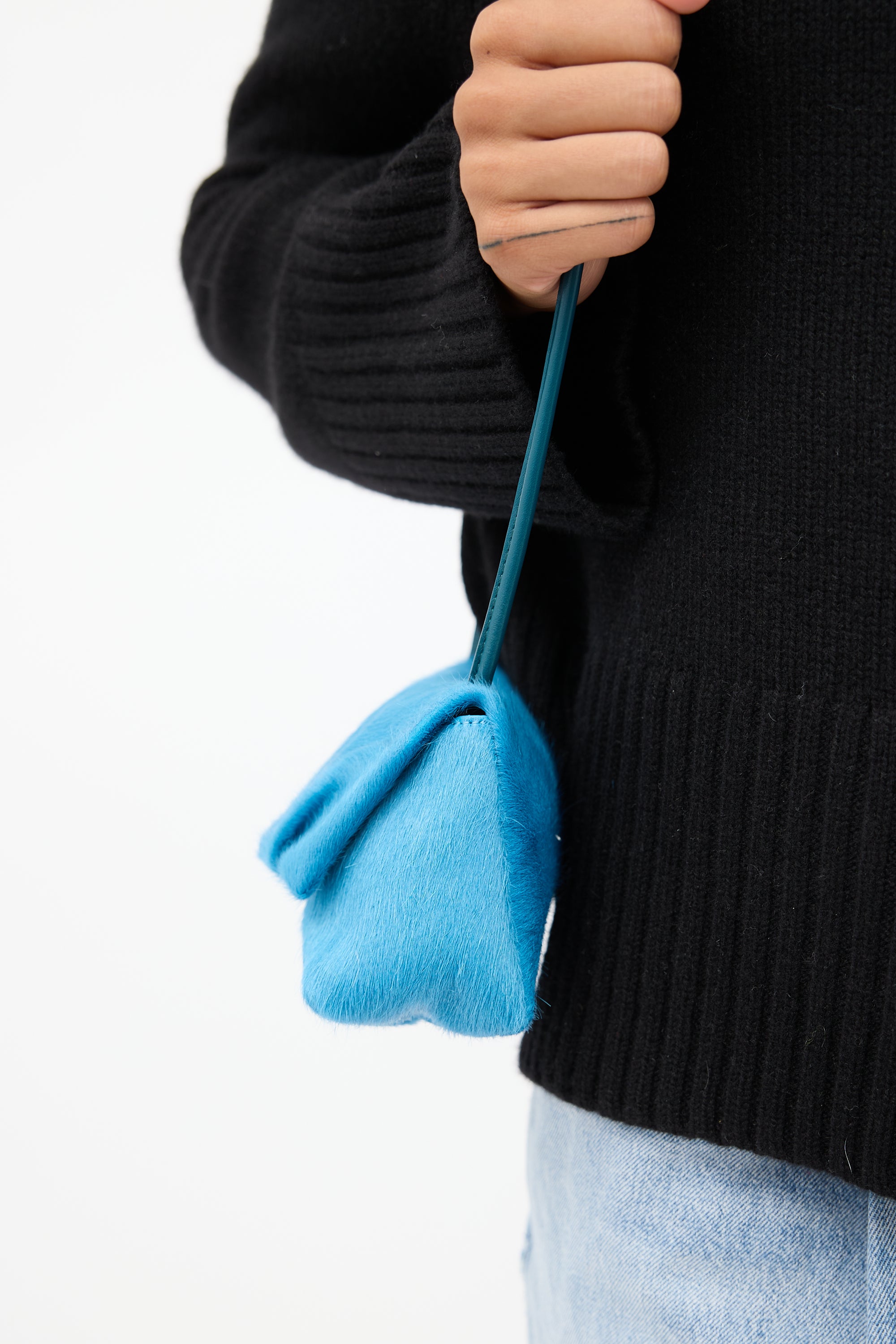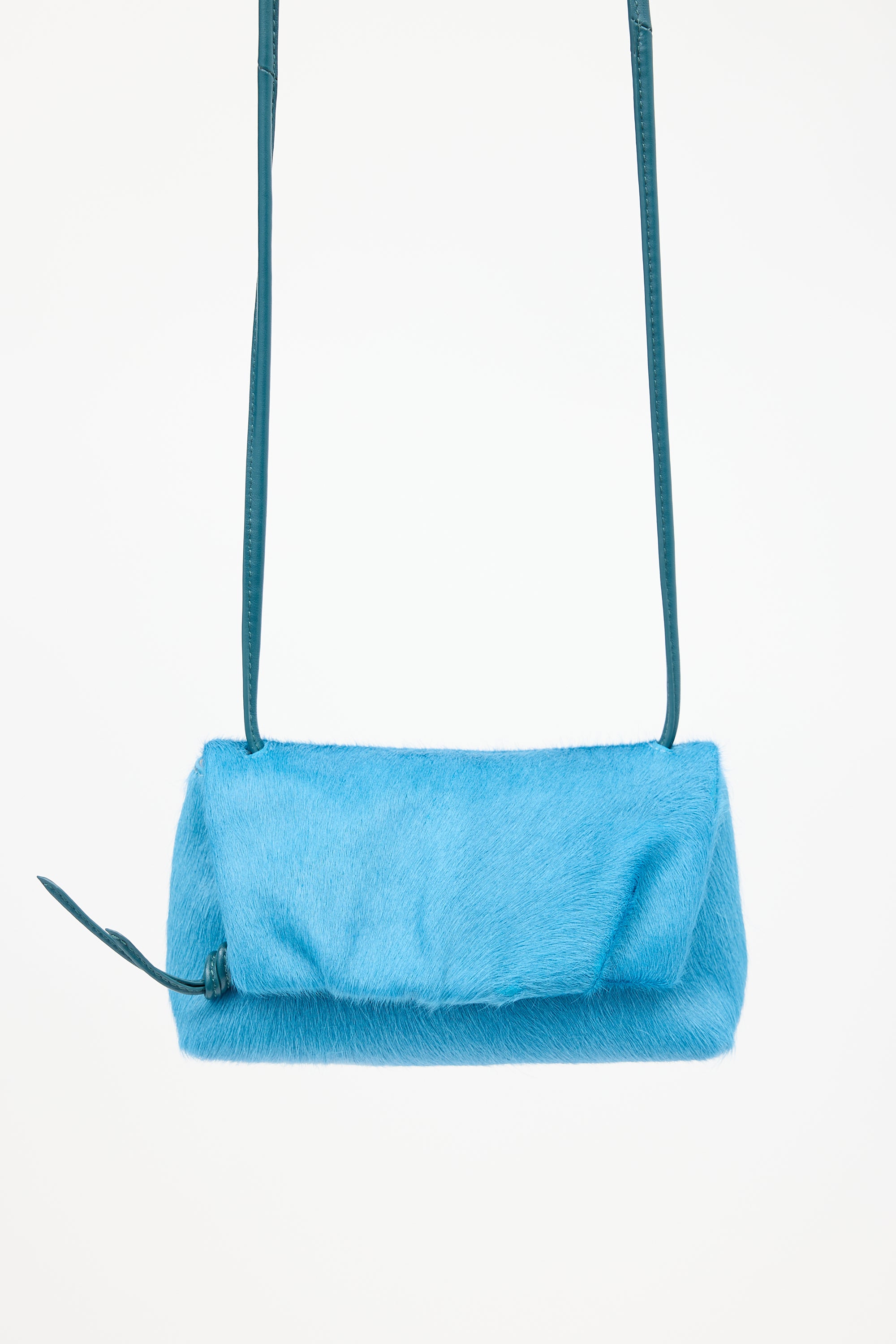 Pre-owned Dries Van Noten blue small Fold Over bag featuring pony hair exterior, fixed and attached shoulder strap, top flap with knotted leather strap detail at side, magnetic buttons closure, grey leather lining, and one zip pocket and one card slot inside.