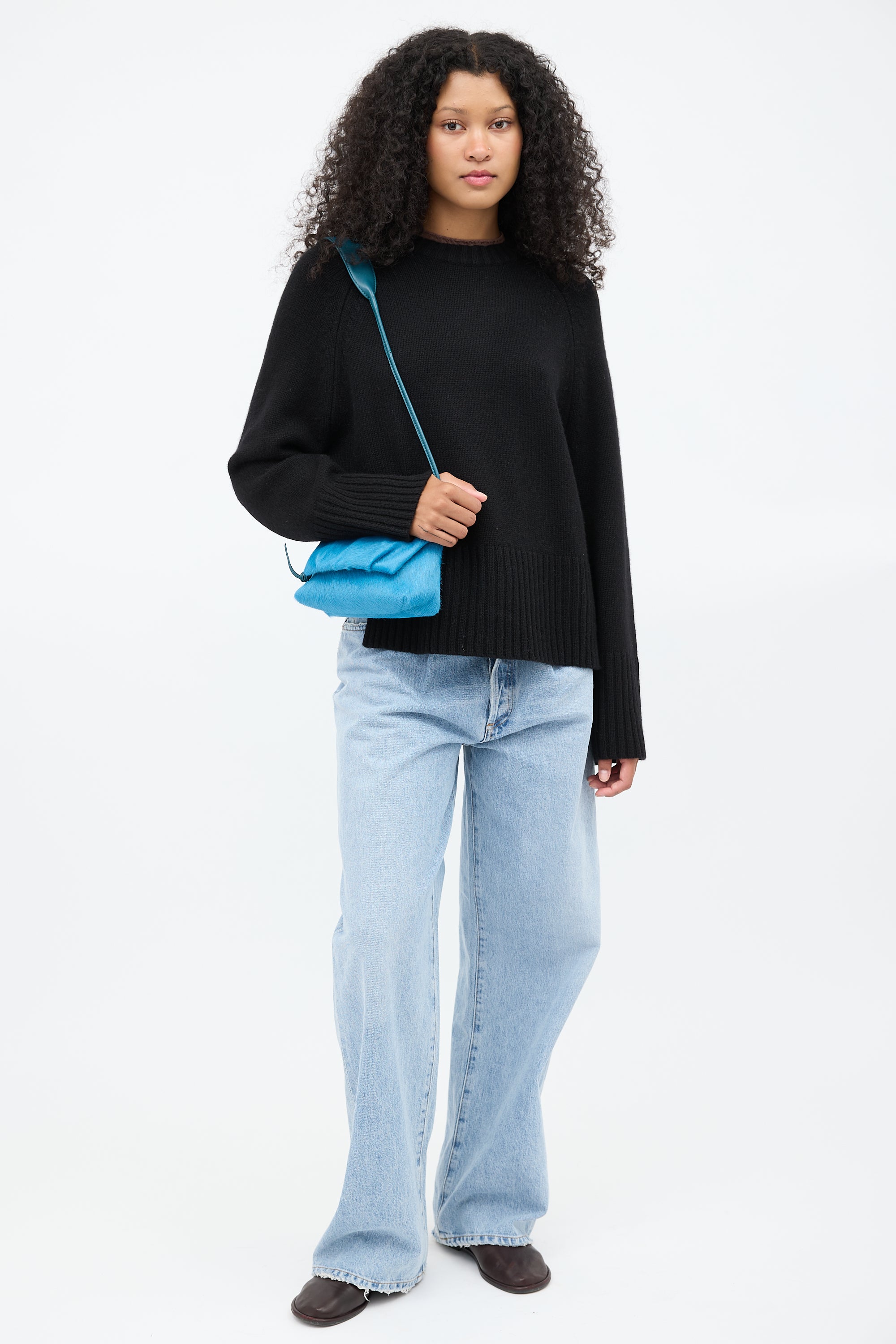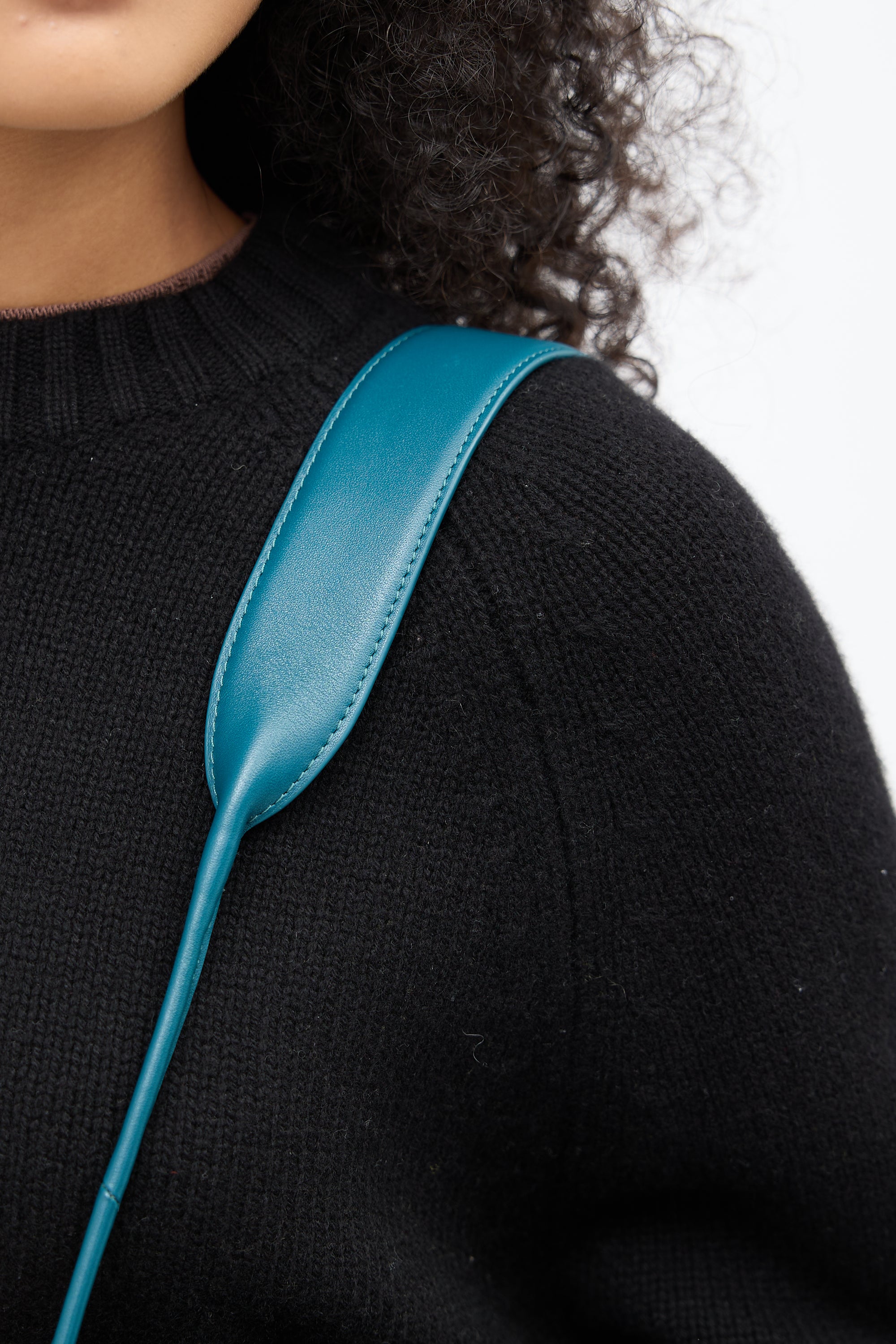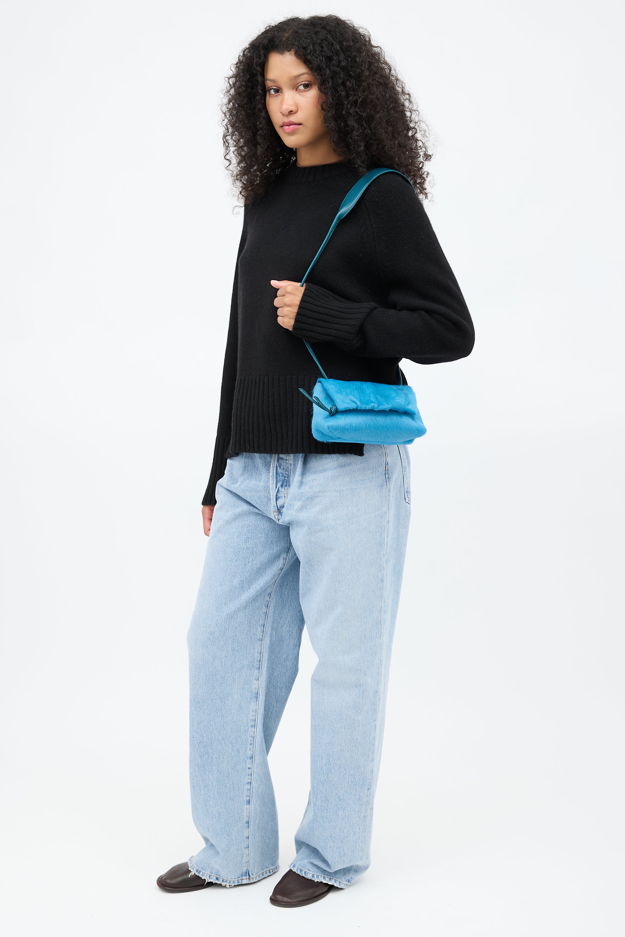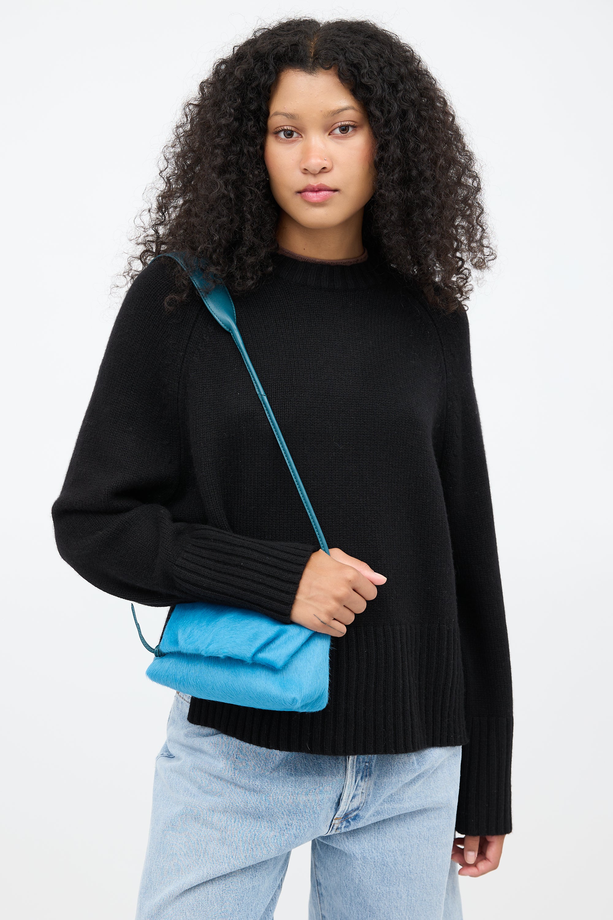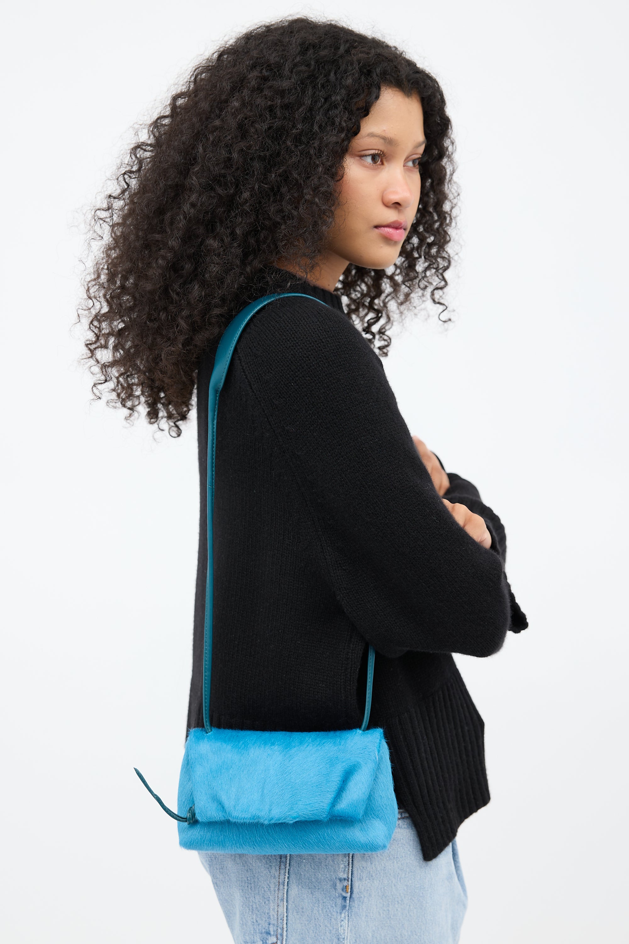 Pre-owned Dries Van Noten blue small Fold Over bag featuring pony hair exterior, fixed and attached shoulder strap, top flap with knotted leather strap detail at side, magnetic buttons closure, grey leather lining, and one zip pocket and one card slot inside.